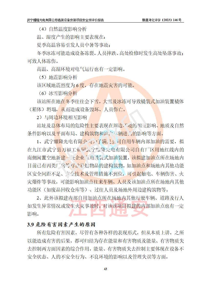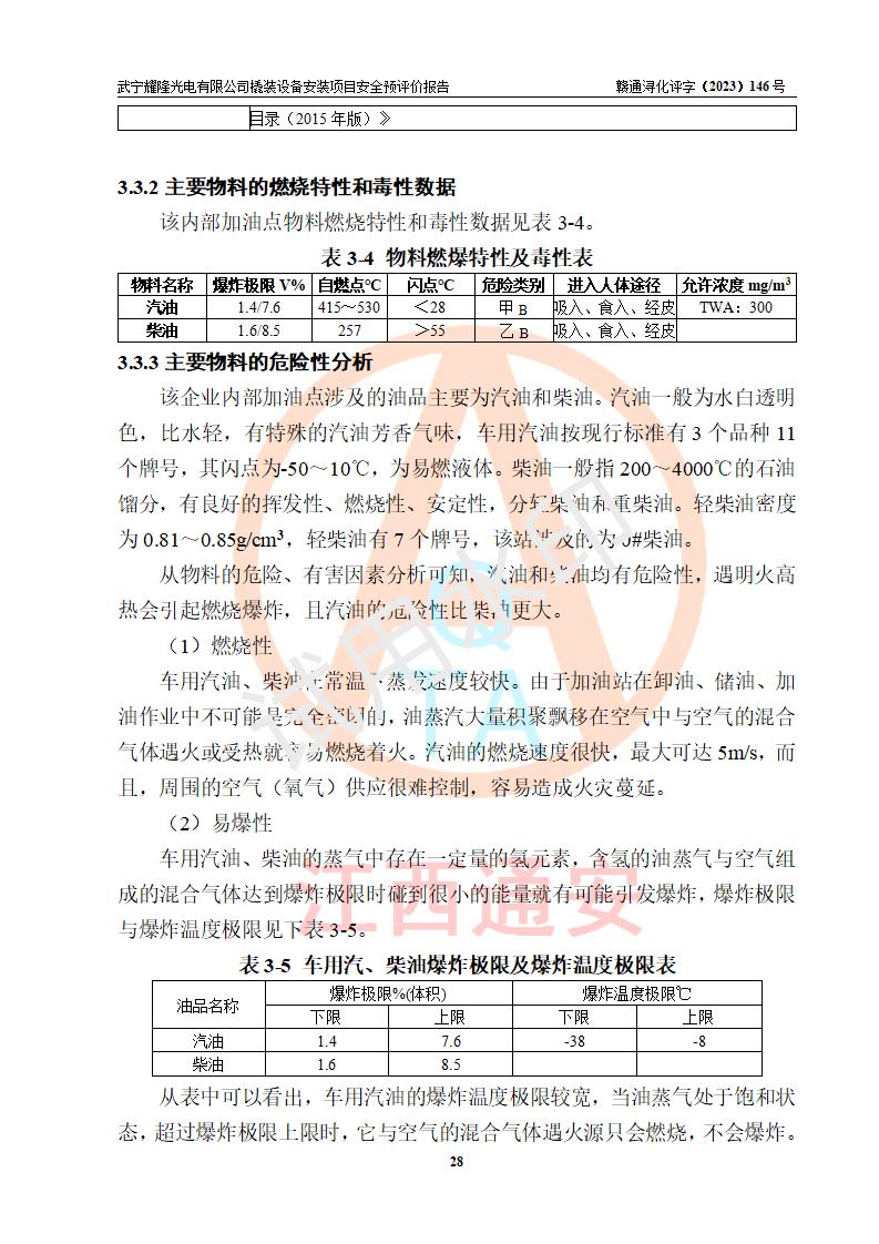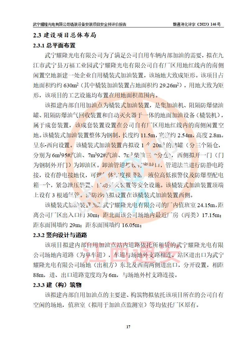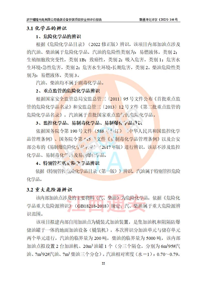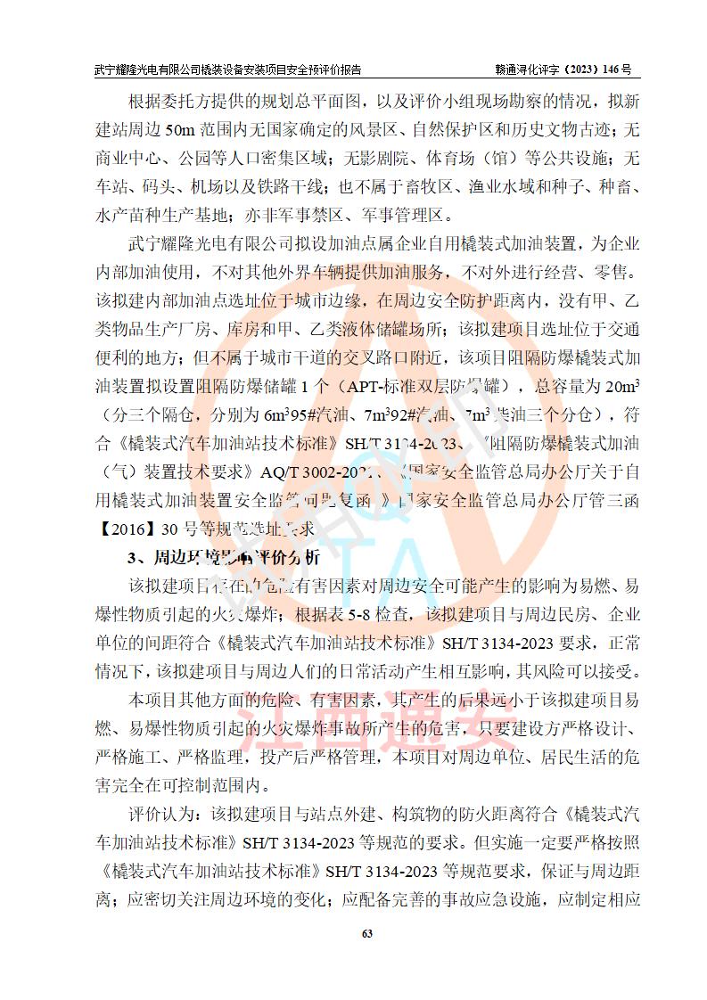 項(xiàng)目簡介 | 武寧耀隆光電有限公司,成立于2013年07月04日。公司地址位于江西省九江市武寧縣萬福工業(yè)園。經(jīng)營范圍:節(jié)能燈、照明電器、LED照明、燈具配件、銷售(以上項(xiàng)目**有專項(xiàng)規(guī)定的憑**許可證經(jīng)營)。 武寧耀隆光電有限公司為了滿足公司自用**內(nèi)部加油的需要,擬在九江市武寧縣萬福工業(yè)園武寧耀隆光電有限公司自有廠區(qū)用地紅線內(nèi)的南側(cè)閑置空地新建一處企業(yè)自用橇裝式加油裝置,該企業(yè)自用橇裝式加油裝置擬采用的加油裝置為阻隔防爆橇裝式加油裝置,是集加油機(jī)、阻隔防爆儲油罐、阻隔防爆油氣回收裝置和自動(dòng)滅火器于一體的地面加油設(shè)備(橇裝機(jī)),屬于成套裝置。該項(xiàng)目阻隔防爆橇裝式加油裝置擬設(shè)置阻隔防爆儲罐1個(gè)(APT-標(biāo)準(zhǔn)雙層防爆罐),總?cè)萘繛?/span>20m3 該項(xiàng)目擬建內(nèi)部自用加油點(diǎn)涉及的汽油、柴油為易燃液體,屬于《危險(xiǎn)化學(xué)品目錄》([2022]第8號公告修改)內(nèi)危險(xiǎn)化學(xué)品,汽油還屬于**重點(diǎn)監(jiān)管和特別管控的危險(xiǎn)化學(xué)品。 該項(xiàng)目擬建內(nèi)部加油點(diǎn)不涉及劇毒品、監(jiān)控化學(xué)品、易制毒化學(xué)品、易制爆化學(xué)品。 該加油站點(diǎn)涉及的汽油屬于《危險(xiǎn)化學(xué)品重大危險(xiǎn)源辨識》范圍內(nèi)物質(zhì),其加油單元與儲存單元均未*過規(guī)定的臨界量,未構(gòu)成危險(xiǎn)化學(xué)品重大危險(xiǎn)源。 | |||