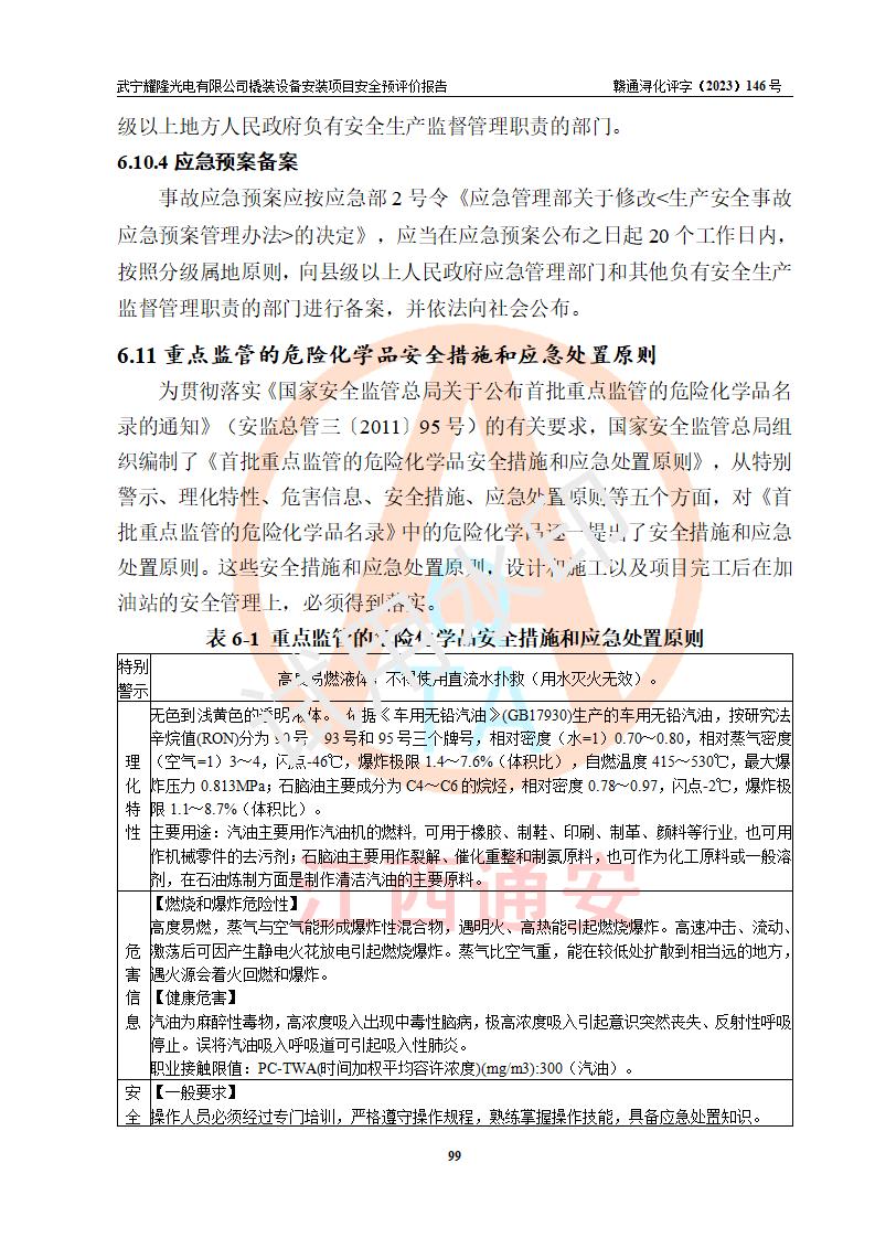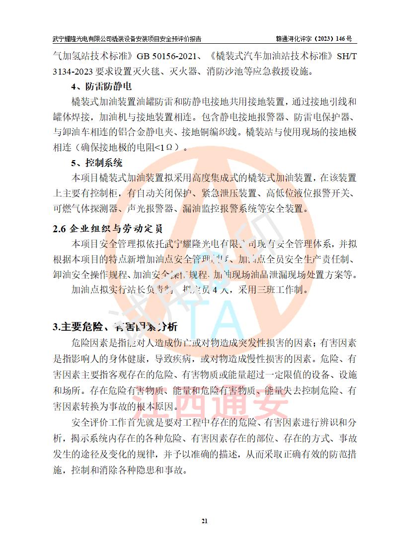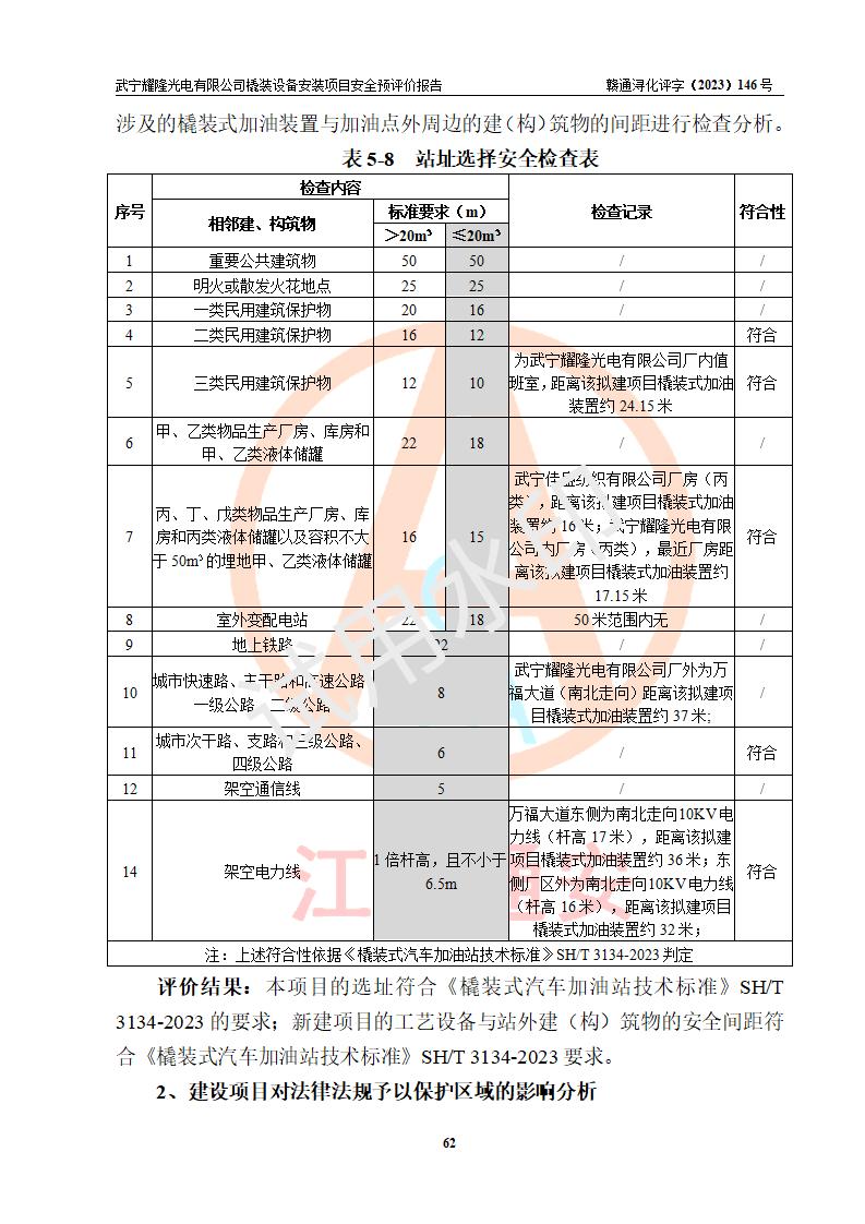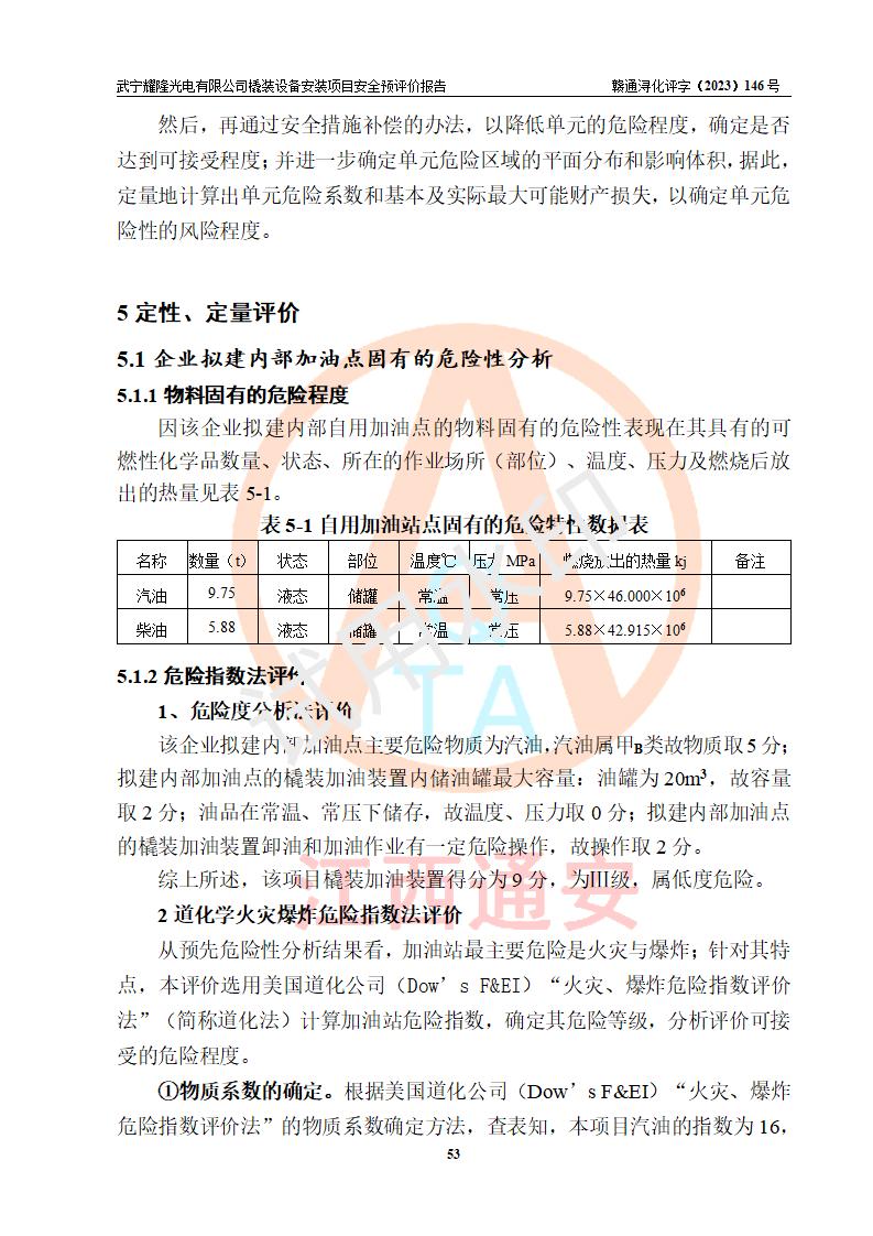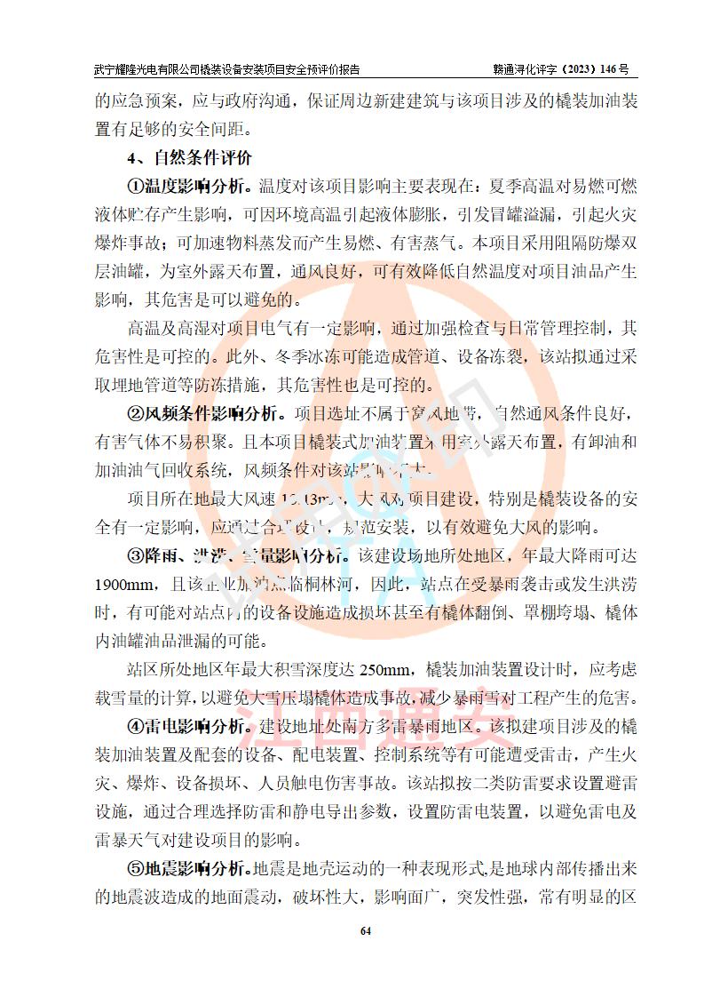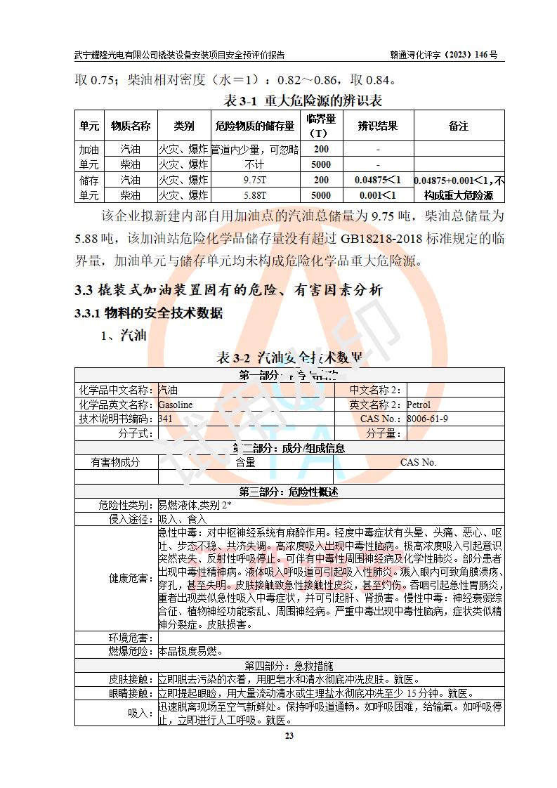 項(xiàng)目簡介 | 武寧耀隆光電有限公司,成立于2013年07月04日。公司地址位于江西省九江市武寧縣萬福工業(yè)園。經(jīng)營范圍:節(jié)能燈、照明電器、LED照明、燈具配件、銷售(以上項(xiàng)目**有專項(xiàng)規(guī)定的憑**許可證經(jīng)營)。 武寧耀隆光電有限公司為了滿足公司自用**內(nèi)部加油的需要,擬在九江市武寧縣萬福工業(yè)園武寧耀隆光電有限公司自有廠區(qū)用地紅線內(nèi)的南側(cè)閑置空地新建一處企業(yè)自用橇裝式加油裝置,該企業(yè)自用橇裝式加油裝置擬采用的加油裝置為阻隔防爆橇裝式加油裝置,是集加油機(jī)、阻隔防爆儲油罐、阻隔防爆油氣回收裝置和自動(dòng)滅火器于一體的地面加油設(shè)備(橇裝機(jī)),屬于成套裝置。該項(xiàng)目阻隔防爆橇裝式加油裝置擬設(shè)置阻隔防爆儲罐1個(gè)(APT-標(biāo)準(zhǔn)雙層防爆罐),總?cè)萘繛?/span>20m3 該項(xiàng)目擬建內(nèi)部自用加油點(diǎn)涉及的汽油、柴油為易燃液體,屬于《危險(xiǎn)化學(xué)品目錄》([2022]第8號公告修改)內(nèi)危險(xiǎn)化學(xué)品,汽油還屬于**重點(diǎn)監(jiān)管和特別管控的危險(xiǎn)化學(xué)品。 該項(xiàng)目擬建內(nèi)部加油點(diǎn)不涉及劇毒品、監(jiān)控化學(xué)品、易制毒化學(xué)品、易制爆化學(xué)品。 該加油站點(diǎn)涉及的汽油屬于《危險(xiǎn)化學(xué)品重大危險(xiǎn)源辨識》范圍內(nèi)物質(zhì),其加油單元與儲存單元均未*過規(guī)定的臨界量,未構(gòu)成危險(xiǎn)化學(xué)品重大危險(xiǎn)源。 | |||