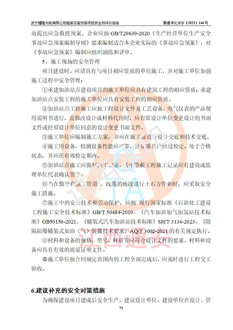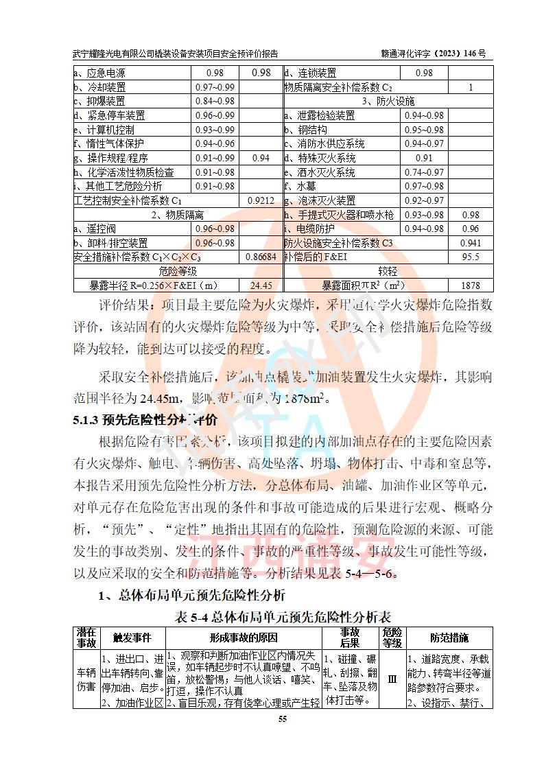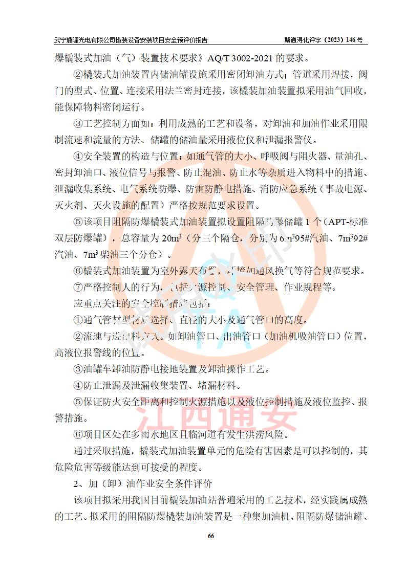 評價(jià)結(jié)論 | 武寧耀隆光電有限公司橇裝設(shè)備安裝項(xiàng)目新建項(xiàng)目的選址、自然條件適宜該項(xiàng)目工程的建設(shè);項(xiàng)目規(guī)劃設(shè)計(jì)中的總體布局方案可行,符合有關(guān)法規(guī)、標(biāo)準(zhǔn)要求;項(xiàng)目選擇的工藝過程及設(shè)備設(shè)施的安全可靠性能達(dá)到**法規(guī)、標(biāo)準(zhǔn)規(guī)定要求;項(xiàng)目存在的危險(xiǎn)有害因素可控,在落實(shí)項(xiàng)目建設(shè)方案及評價(jià)報(bào)告提出的有關(guān)安全對策措施后,其危險(xiǎn)有害程度能達(dá)到可以接受的程度,項(xiàng)目建設(shè)能夠?qū)崿F(xiàn)安全運(yùn)行的目標(biāo)。 | |||