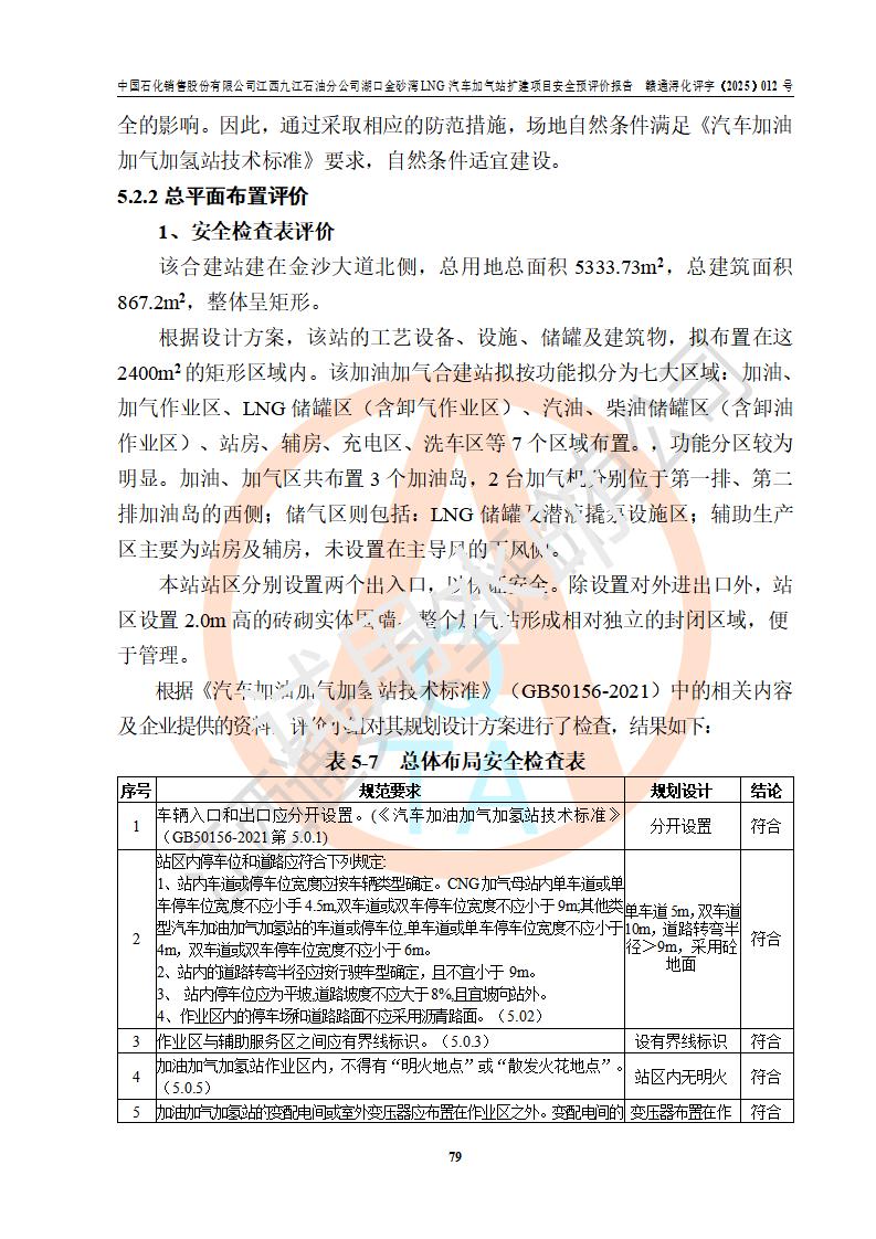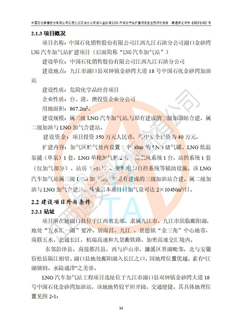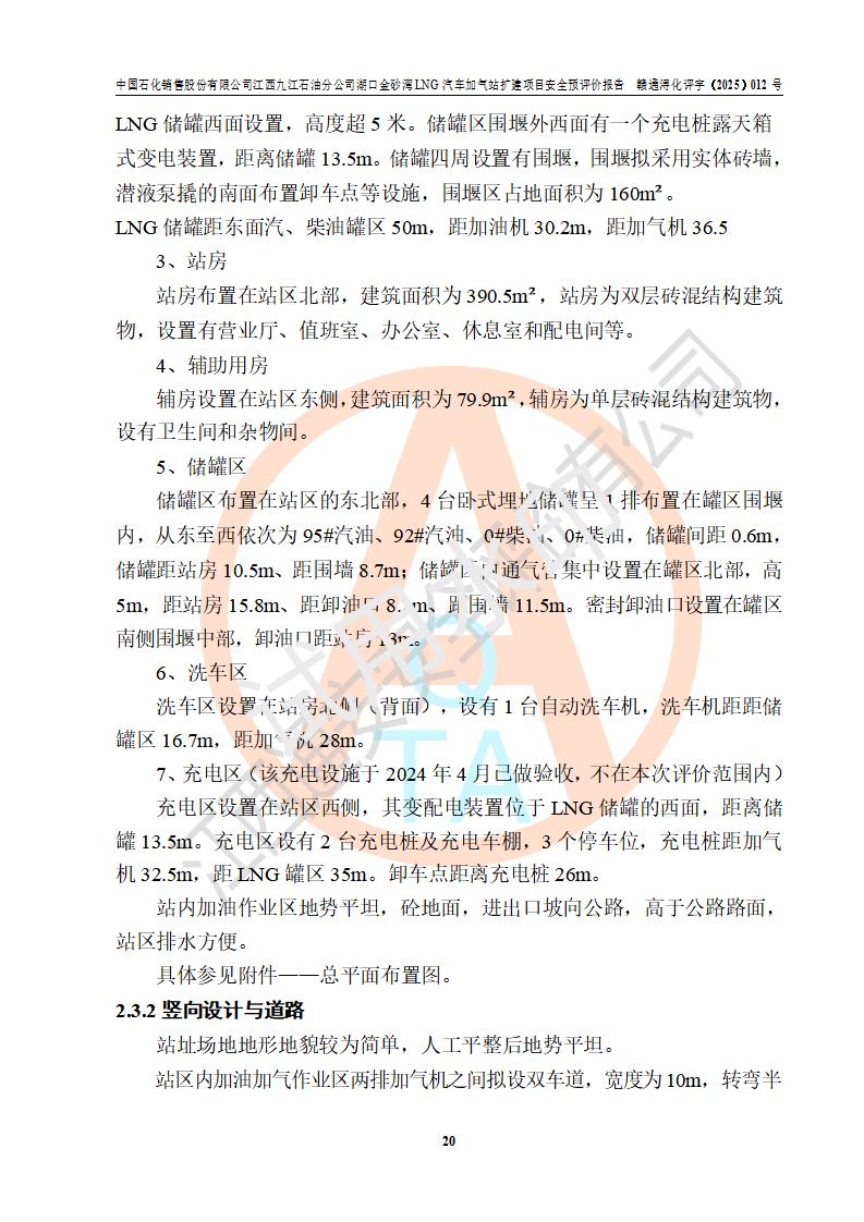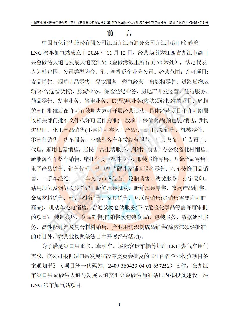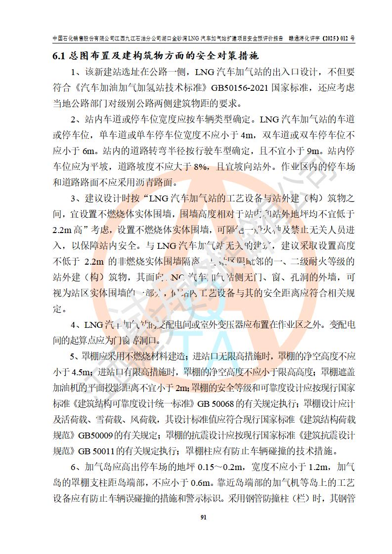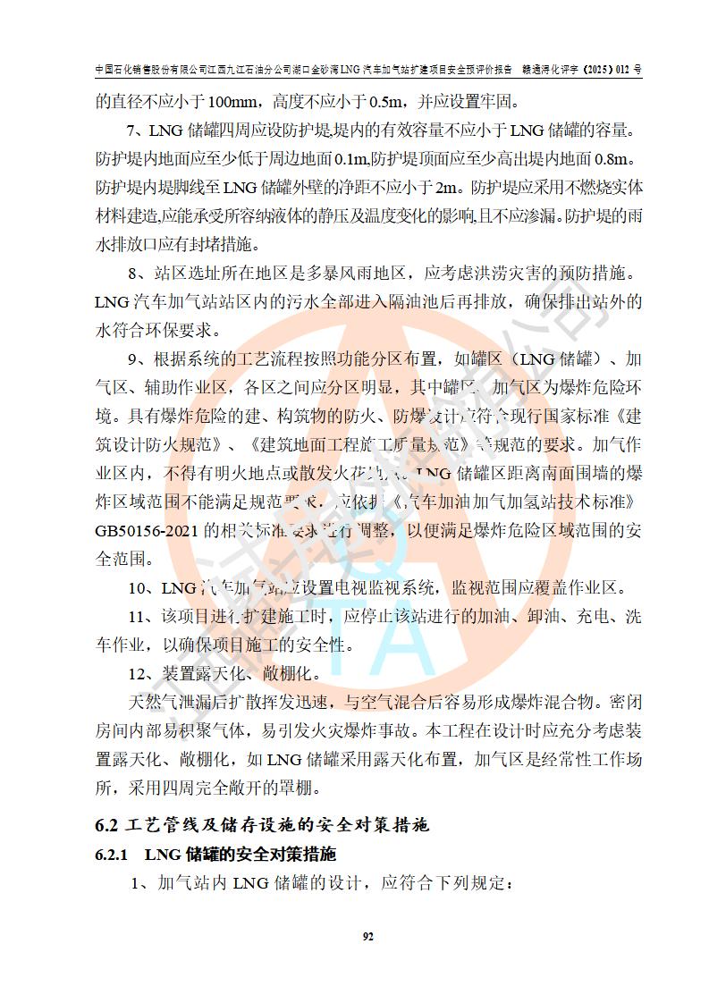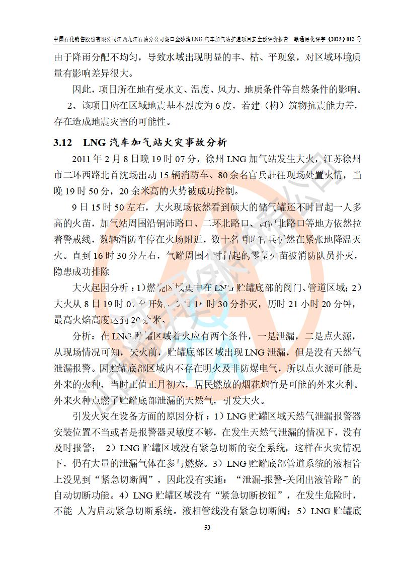 項(xiàng)目簡介 | 中國石化銷售股份有限公司江西九江石油分公司九江市湖口金砂灣LNG汽車加氣站成立于2024年11月12日,經(jīng)營場所為江西省九江市湖口縣金砂灣大道與發(fā)展大道交匯處(金砂灣派出所右側(cè)50米處),法定**人為杜建國,公司類型為臺(tái)、港、澳投資企業(yè)分公司。經(jīng)營范圍:許可項(xiàng)目:食品銷售,煙草制品零售,餐飲服務(wù),燃?xì)饨?jīng)營,出版物零售,道路貨物運(yùn)輸(不含危險(xiǎn)貨物),旅游業(yè)務(wù),**經(jīng)紀(jì)業(yè)務(wù),房地產(chǎn)開發(fā)經(jīng)營,住宿服務(wù),藥品零售,發(fā)電業(yè)務(wù)、輸電業(yè)務(wù)、供(配)電業(yè)務(wù)(依法須經(jīng)批準(zhǔn)的項(xiàng)目,經(jīng)相關(guān)部門批準(zhǔn)后在許可**期內(nèi)方可開展經(jīng)營活動(dòng),具體經(jīng)營項(xiàng)目和許可期限以相關(guān)部門批準(zhǔn)文件或許可證件為準(zhǔn))一般項(xiàng)日:保健食品(預(yù)包裝)銷售,貨物進(jìn)出口,化工產(chǎn)品銷售(不含許可類化工產(chǎn)品),日用百貨銷售,機(jī)械零件、零部件銷售,洗車服務(wù),小微型客車租賃經(jīng)營服務(wù),廣告發(fā)布,廣告設(shè)計(jì)、代理,家用電器銷售,居民日常生活服務(wù),潤滑油銷售,辦公設(shè)備耗材銷售,新能源汽車整車銷售,摩托車及零配件零售,服裝服飾零售,五金產(chǎn)品零售,電子產(chǎn)品銷售,銷售代理,計(jì)算機(jī)軟硬件及鋪助設(shè)備零售,汽車裝飾用品銷售,二手車經(jīng)紀(jì),二手車交易市場經(jīng)營,輪胎銷售,洗燙服務(wù),打字復(fù)印,站用加氫及儲(chǔ)氫設(shè)施銷售,新鮮水果批發(fā),新鮮水果零售,農(nóng)副產(chǎn)品銷售,金屬材料銷售,建筑材料銷售,家具銷售,互聯(lián)網(wǎng)銷售(除銷售需要許可的商品),機(jī)動(dòng)車充電銷售,普通貨物倉儲(chǔ)服務(wù)(不含危險(xiǎn)化學(xué)品等需許可審批的項(xiàng)日),裝卸搬運(yùn),食品銷售(僅銷售預(yù)包裝食品),包裝服務(wù),數(shù)據(jù)處理服務(wù),***纖維及復(fù)合材料銷售,產(chǎn)業(yè)用紡織制成品銷售(除依法須經(jīng)批準(zhǔn)的項(xiàng)目外,憑營業(yè)執(zhí)照依法自主開展經(jīng)營活動(dòng))。 為了滿足湖口縣重卡、牽引車、城際客運(yùn)**等加注LNG燃?xì)廛囉脷庑枨?,該公司根?jù)湖口縣發(fā)展和改革委員會(huì)批復(fù)的《江西省企業(yè)投資項(xiàng)目備案通知書》(項(xiàng)目統(tǒng)一代碼為:2409-360429-04-01-657252)文件,在九江市湖口縣金砂灣大道與發(fā)展大道交匯處金砂灣加油站區(qū)內(nèi)擬投資建設(shè)一座LNG汽車加氣站項(xiàng)目。 湖口金砂灣加油站的建設(shè)用地已取得湖口縣不動(dòng)產(chǎn)登記局頒發(fā)的不動(dòng)產(chǎn)權(quán)證書:贛(2023)湖口縣不動(dòng)產(chǎn)權(quán)第0002564號。 擬擴(kuò)建LNG汽車加氣站總用地面積為5333.73m2,總建筑面積為867.2m2,站區(qū)內(nèi)加氣機(jī)擬設(shè)置為2機(jī)2槍。LNG貯氣區(qū)內(nèi)設(shè)置1個(gè)60m3的LNG儲(chǔ)氣罐、LNG低溫泵撬1套(含雙泵、BOG空溫式加熱器),加氣能力為2×104Nm3/d。按現(xiàn)行《汽車加油加氣加氫站技術(shù)標(biāo)準(zhǔn)》對LNG加氣站的等級劃分,該LNG汽車加氣站屬三級站,與原有建成的三級加油站合建,屬二級加油與LNG加氣合建站。建成后本項(xiàng)目日加氣量可達(dá)2×104Nm3/日。 該二級加油與LNG加氣合建站內(nèi)加氣設(shè)施已于2017年建設(shè)完成,但一直未投入使用?,F(xiàn)因公司市場發(fā)展需要,擬重新啟動(dòng)投入使用。依據(jù)《中華人民共和國安全生產(chǎn)法》、《燃?xì)饨?jīng)營許可管理辦法》、《城鎮(zhèn)燃?xì)夤芾項(xiàng)l例》等法律和規(guī)定的要求,新建、改建、擴(kuò)建危險(xiǎn)化學(xué)品儲(chǔ)存裝置和設(shè)施的建設(shè)項(xiàng)目安全條件審查(審批、核準(zhǔn)、備案)前,建設(shè)單位應(yīng)當(dāng)選擇有資質(zhì)的安全評價(jià)機(jī)構(gòu)對建設(shè)項(xiàng)目進(jìn)行安全條件評價(jià),以**工程項(xiàng)目的安全設(shè)施與主體工程同時(shí)設(shè)計(jì)、同時(shí)施工、同時(shí)投入使用,為**工程項(xiàng)目在安全生產(chǎn)及安全管理方面符合**及行業(yè)有關(guān)法律法規(guī)及標(biāo)準(zhǔn),中國石化銷售股份有限公司江西江西九江石油分公司湖口金砂灣LNG汽車加氣站擴(kuò)建項(xiàng)目委托江西通安安全評價(jià)有限公司承擔(dān)中國石化銷售股份有限公司江西九江石油分公司湖口金砂灣LNG汽車加氣站擴(kuò)建項(xiàng)目的安全預(yù)評價(jià)。該企業(yè)應(yīng)辦理燃?xì)饨?jīng)營許可證。 江西通安安全評價(jià)有限公司接受委托后,成立了評價(jià)組,于2025年2月踏勘了建設(shè)地址。根據(jù)相關(guān)法律、法規(guī)和標(biāo)準(zhǔn)的規(guī)定,按照《安全評價(jià)通則》(AQ8001-2007)、《安全預(yù)評價(jià)導(dǎo)則》(AQ8002-2007)的要求,在資料收集、現(xiàn)場勘探和類比調(diào)查的基礎(chǔ)上,對項(xiàng)目的工程技術(shù)資料進(jìn)行了認(rèn)真分析。建設(shè)項(xiàng)目內(nèi)在的危險(xiǎn)、有害因素對建設(shè)項(xiàng)目周邊單位生產(chǎn)、經(jīng)營活動(dòng)或者居民生活的影響以及建設(shè)項(xiàng)目周邊單位生產(chǎn)、經(jīng)營活動(dòng)或者居民生活對建設(shè)項(xiàng)目
