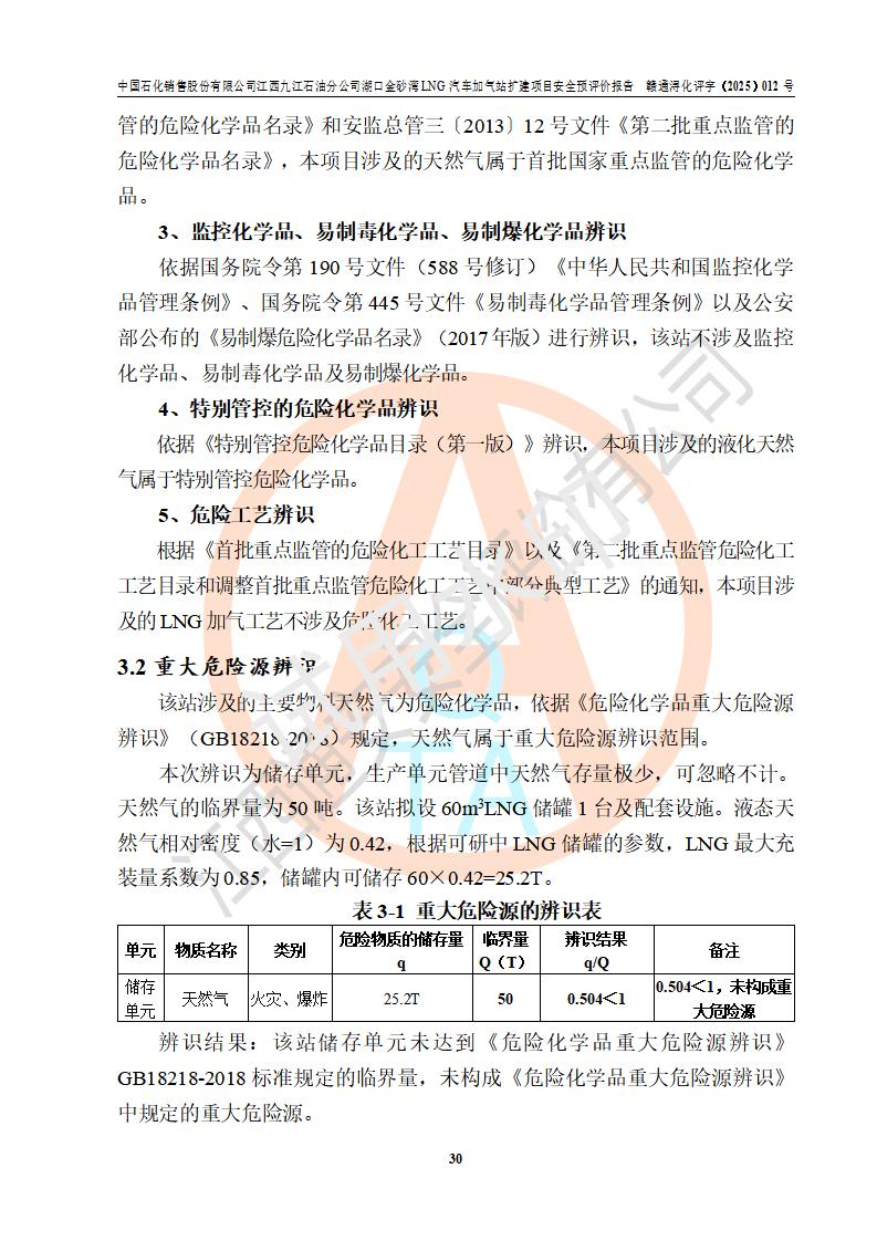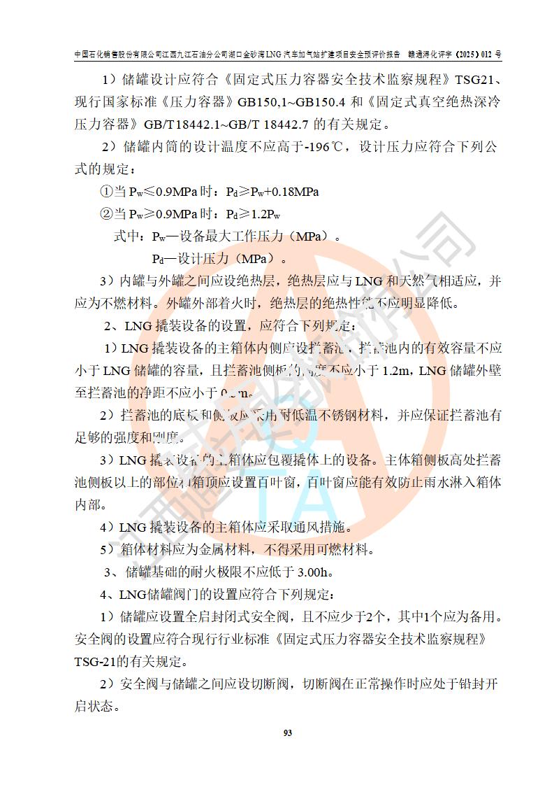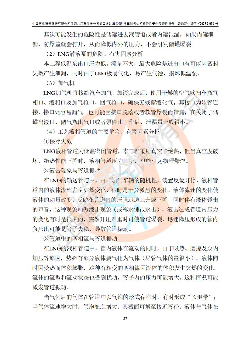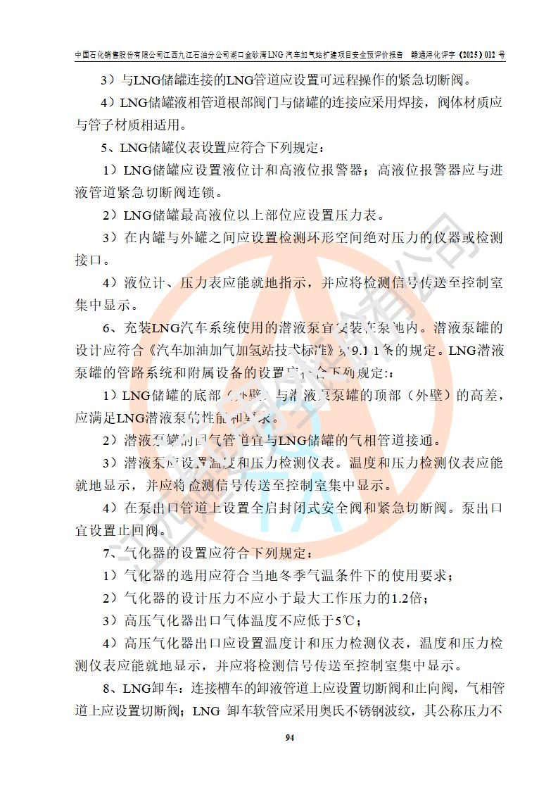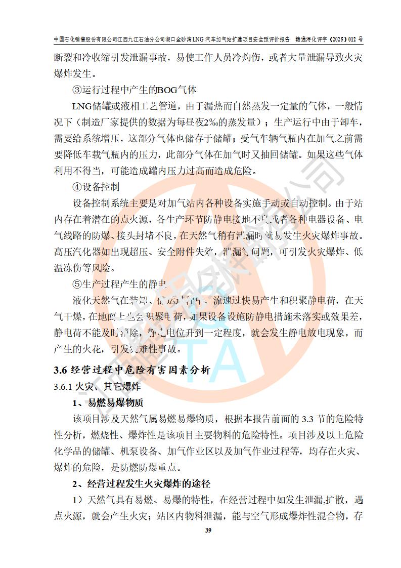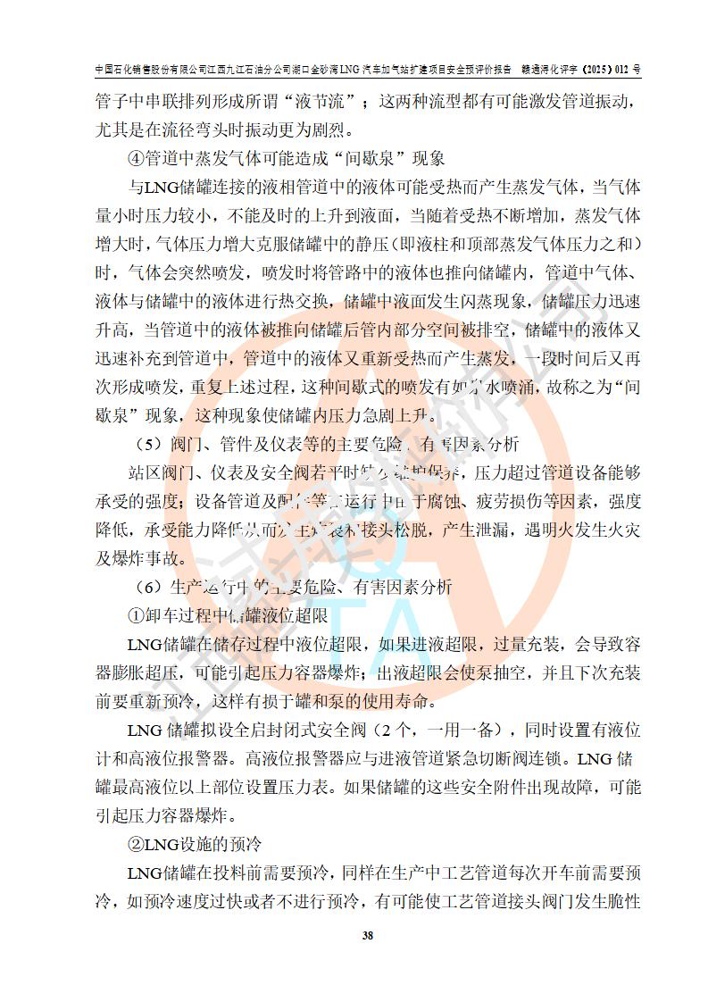 項(xiàng)目簡介 | 中國石化銷售股份有限公司江西九江石油分公司九江市湖口金砂灣LNG汽車加氣站成立于2024年11月12日,經(jīng)營場所為江西省九江市湖口縣金砂灣大道與發(fā)展大道交匯處(金砂灣派出所右側(cè)50米處),法定**人為杜建國,公司類型為臺(tái)、港、澳投資企業(yè)分公司。經(jīng)營范圍:許可項(xiàng)目:食品銷售,煙草制品零售,餐飲服務(wù),燃?xì)饨?jīng)營,出版物零售,道路貨物運(yùn)輸(不含危險(xiǎn)貨物),旅游業(yè)務(wù),**經(jīng)紀(jì)業(yè)務(wù),房地產(chǎn)開發(fā)經(jīng)營,住宿服務(wù),藥品零售,發(fā)電業(yè)務(wù)、輸電業(yè)務(wù)、供(配)電業(yè)務(wù)(依法須經(jīng)批準(zhǔn)的項(xiàng)目,經(jīng)相關(guān)部門批準(zhǔn)后在許可**期內(nèi)方可開展經(jīng)營活動(dòng),具體經(jīng)營項(xiàng)目和許可期限以相關(guān)部門批準(zhǔn)文件或許可證件為準(zhǔn))一般項(xiàng)日:保健食品(預(yù)包裝)銷售,貨物進(jìn)出口,化工產(chǎn)品銷售(不含許可類化工產(chǎn)品),日用百貨銷售,機(jī)械零件、零部件銷售,洗車服務(wù),小微型客車租賃經(jīng)營服務(wù),廣告發(fā)布,廣告設(shè)計(jì)、代理,家用電器銷售,居民日常生活服務(wù),潤滑油銷售,辦公設(shè)備耗材銷售,新能源汽車整車銷售,摩托車及零配件零售,服裝服飾零售,五金產(chǎn)品零售,電子產(chǎn)品銷售,銷售代理,計(jì)算機(jī)軟硬件及鋪助設(shè)備零售,汽車裝飾用品銷售,二手車經(jīng)紀(jì),二手車交易市場經(jīng)營,輪胎銷售,洗燙服務(wù),打字復(fù)印,站用加氫及儲(chǔ)氫設(shè)施銷售,新鮮水果批發(fā),新鮮水果零售,農(nóng)副產(chǎn)品銷售,金屬材料銷售,建筑材料銷售,家具銷售,互聯(lián)網(wǎng)銷售(除銷售需要許可的商品),機(jī)動(dòng)車充電銷售,普通貨物倉儲(chǔ)服務(wù)(不含危險(xiǎn)化學(xué)品等需許可審批的項(xiàng)日),裝卸搬運(yùn),食品銷售(僅銷售預(yù)包裝食品),包裝服務(wù),數(shù)據(jù)處理服務(wù),***纖維及復(fù)合材料銷售,產(chǎn)業(yè)用紡織制成品銷售(除依法須經(jīng)批準(zhǔn)的項(xiàng)目外,憑營業(yè)執(zhí)照依法自主開展經(jīng)營活動(dòng))。 為了滿足湖口縣重卡、牽引車、城際客運(yùn)**等加注LNG燃?xì)廛囉脷庑枨?,該公司根?jù)湖口縣發(fā)展和改革委員會(huì)批復(fù)的《江西省企業(yè)投資項(xiàng)目備案通知書》(項(xiàng)目統(tǒng)一代碼為:2409-360429-04-01-657252)文件,在九江市湖口縣金砂灣大道與發(fā)展大道交匯處金砂灣加油站區(qū)內(nèi)擬投資建設(shè)一座LNG汽車加氣站項(xiàng)目。 湖口金砂灣加油站的建設(shè)用地已取得湖口縣不動(dòng)產(chǎn)登記局頒發(fā)的不動(dòng)產(chǎn)權(quán)證書:贛(2023)湖口縣不動(dòng)產(chǎn)權(quán)第0002564號。 擬擴(kuò)建LNG汽車加氣站總用地面積為5333.73m2,總建筑面積為867.2m2,站區(qū)內(nèi)加氣機(jī)擬設(shè)置為2機(jī)2槍。LNG貯氣區(qū)內(nèi)設(shè)置1個(gè)60m3的LNG儲(chǔ)氣罐、LNG低溫泵撬1套(含雙泵、BOG空溫式加熱器),加氣能力為2×104Nm3/d。按現(xiàn)行《汽車加油加氣加氫站技術(shù)標(biāo)準(zhǔn)》對LNG加氣站的等級劃分,該LNG汽車加氣站屬三級站,與原有建成的三級加油站合建,屬二級加油與LNG加氣合建站。建成后本項(xiàng)目日加氣量可達(dá)2×104Nm3/日。 該二級加油與LNG加氣合建站內(nèi)加氣設(shè)施已于2017年建設(shè)完成,但一直未投入使用?,F(xiàn)因公司市場發(fā)展需要,擬重新啟動(dòng)投入使用。依據(jù)《中華人民共和國安全生產(chǎn)法》、《燃?xì)饨?jīng)營許可管理辦法》、《城鎮(zhèn)燃?xì)夤芾項(xiàng)l例》等法律和規(guī)定的要求,新建、改建、擴(kuò)建危險(xiǎn)化學(xué)品儲(chǔ)存裝置和設(shè)施的建設(shè)項(xiàng)目安全條件審查(審批、核準(zhǔn)、備案)前,建設(shè)單位應(yīng)當(dāng)選擇有資質(zhì)的安全評價(jià)機(jī)構(gòu)對建設(shè)項(xiàng)目進(jìn)行安全條件評價(jià),以**工程項(xiàng)目的安全設(shè)施與主體工程同時(shí)設(shè)計(jì)、同時(shí)施工、同時(shí)投入使用,為**工程項(xiàng)目在安全生產(chǎn)及安全管理方面符合**及行業(yè)有關(guān)法律法規(guī)及標(biāo)準(zhǔn),中國石化銷售股份有限公司江西江西九江石油分公司湖口金砂灣LNG汽車加氣站擴(kuò)建項(xiàng)目委托江西通安安全評價(jià)有限公司承擔(dān)中國石化銷售股份有限公司江西九江石油分公司湖口金砂灣LNG汽車加氣站擴(kuò)建項(xiàng)目的安全預(yù)評價(jià)。該企業(yè)應(yīng)辦理燃?xì)饨?jīng)營許可證。 江西通安安全評價(jià)有限公司接受委托后,成立了評價(jià)組,于2025年2月踏勘了建設(shè)地址。根據(jù)相關(guān)法律、法規(guī)和標(biāo)準(zhǔn)的規(guī)定,按照《安全評價(jià)通則》(AQ8001-2007)、《安全預(yù)評價(jià)導(dǎo)則》(AQ8002-2007)的要求,在資料收集、現(xiàn)場勘探和類比調(diào)查的基礎(chǔ)上,對項(xiàng)目的工程技術(shù)資料進(jìn)行了認(rèn)真分析。建設(shè)項(xiàng)目內(nèi)在的危險(xiǎn)、有害因素對建設(shè)項(xiàng)目周邊單位生產(chǎn)、經(jīng)營活動(dòng)或者居民生活的影響以及建設(shè)項(xiàng)目周邊單位生產(chǎn)、經(jīng)營活動(dòng)或者居民生活對建設(shè)項(xiàng)目