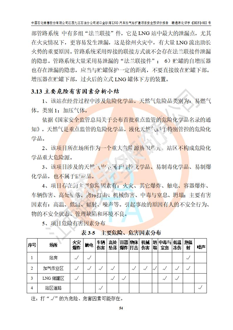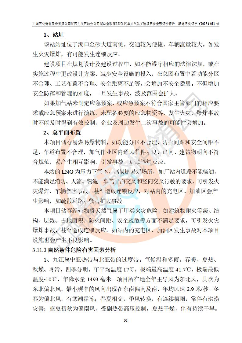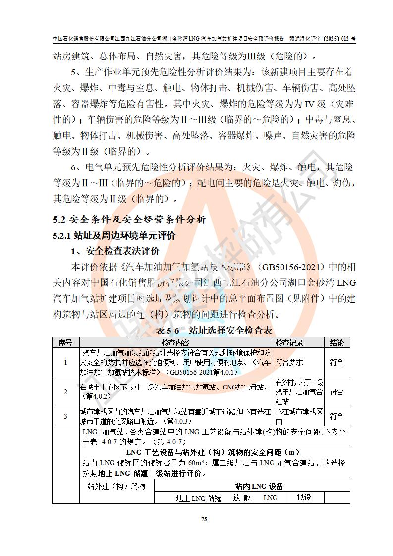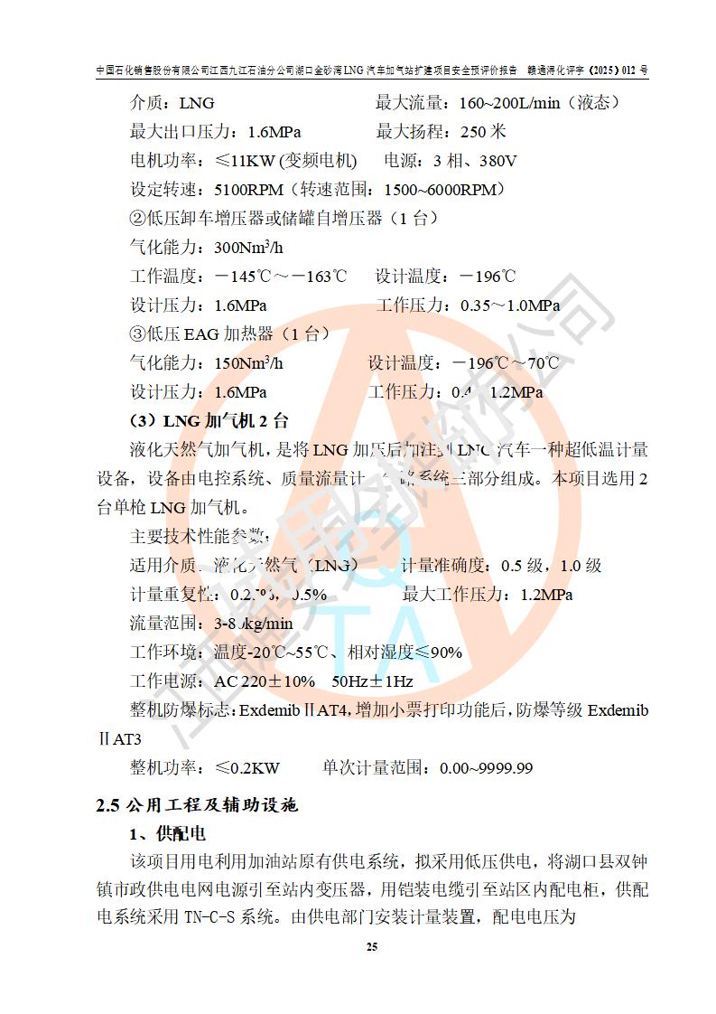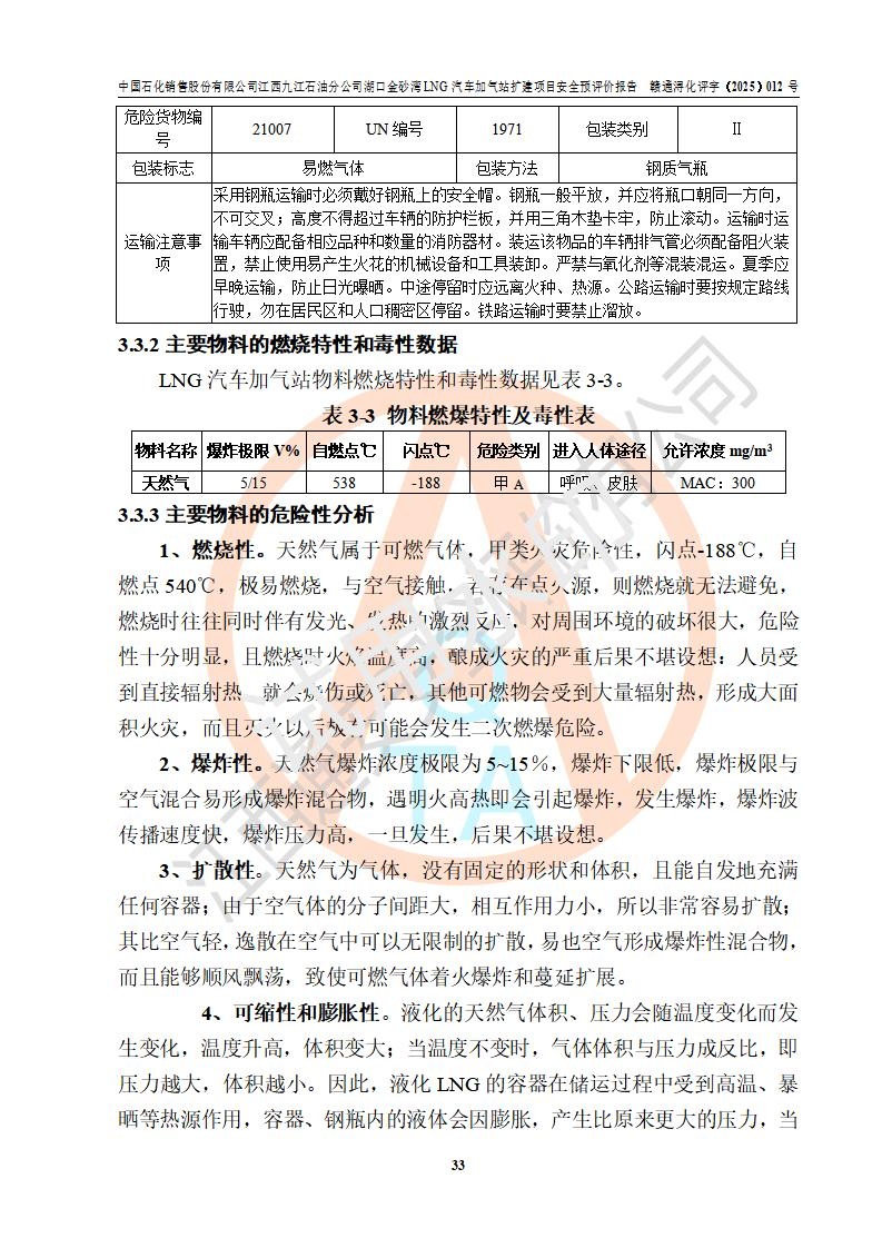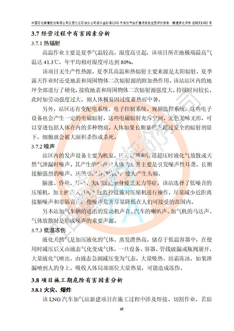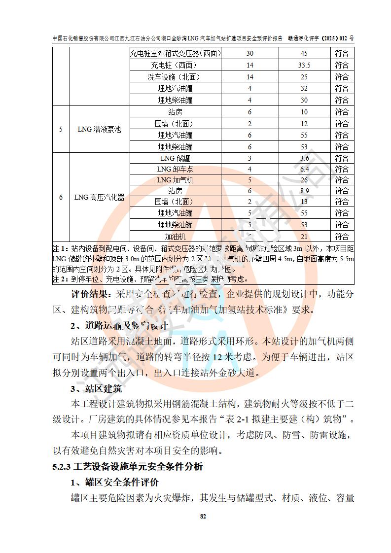 項(xiàng)目簡介 | 中國石化銷售股份有限公司江西九江石油分公司九江市湖口金砂灣LNG汽車加氣站成立于2024年11月12日,經(jīng)營場所為江西省九江市湖口縣金砂灣大道與發(fā)展大道交匯處(金砂灣派出所右側(cè)50米處),法定**人為杜建國,公司類型為臺(tái)、港、澳投資企業(yè)分公司。經(jīng)營范圍:許可項(xiàng)目:食品銷售,煙草制品零售,餐飲服務(wù),燃?xì)饨?jīng)營,出版物零售,道路貨物運(yùn)輸(不含危險(xiǎn)貨物),旅游業(yè)務(wù),**經(jīng)紀(jì)業(yè)務(wù),房地產(chǎn)開發(fā)經(jīng)營,住宿服務(wù),藥品零售,發(fā)電業(yè)務(wù)、輸電業(yè)務(wù)、供(配)電業(yè)務(wù)(依法須經(jīng)批準(zhǔn)的項(xiàng)目,經(jīng)相關(guān)部門批準(zhǔn)后在許可**期內(nèi)方可開展經(jīng)營活動(dòng),具體經(jīng)營項(xiàng)目和許可期限以相關(guān)部門批準(zhǔn)文件或許可證件為準(zhǔn))一般項(xiàng)日:保健食品(預(yù)包裝)銷售,貨物進(jìn)出口,化工產(chǎn)品銷售(不含許可類化工產(chǎn)品),日用百貨銷售,機(jī)械零件、零部件銷售,洗車服務(wù),小微型客車租賃經(jīng)營服務(wù),廣告發(fā)布,廣告設(shè)計(jì)、代理,家用電器銷售,居民日常生活服務(wù),潤滑油銷售,辦公設(shè)備耗材銷售,新能源汽車整車銷售,摩托車及零配件零售,服裝服飾零售,五金產(chǎn)品零售,電子產(chǎn)品銷售,銷售代理,計(jì)算機(jī)軟硬件及鋪助設(shè)備零售,汽車裝飾用品銷售,二手車經(jīng)紀(jì),二手車交易市場經(jīng)營,輪胎銷售,洗燙服務(wù),打字復(fù)印,站用加氫及儲(chǔ)氫設(shè)施銷售,新鮮水果批發(fā),新鮮水果零售,農(nóng)副產(chǎn)品銷售,金屬材料銷售,建筑材料銷售,家具銷售,互聯(lián)網(wǎng)銷售(除銷售需要許可的商品),機(jī)動(dòng)車充電銷售,普通貨物倉儲(chǔ)服務(wù)(不含危險(xiǎn)化學(xué)品等需許可審批的項(xiàng)日),裝卸搬運(yùn),食品銷售(僅銷售預(yù)包裝食品),包裝服務(wù),數(shù)據(jù)處理服務(wù),***纖維及復(fù)合材料銷售,產(chǎn)業(yè)用紡織制成品銷售(除依法須經(jīng)批準(zhǔn)的項(xiàng)目外,憑營業(yè)執(zhí)照依法自主開展經(jīng)營活動(dòng))。 為了滿足湖口縣重卡、牽引車、城際客運(yùn)**等加注LNG燃?xì)廛囉脷庑枨?,該公司根?jù)湖口縣發(fā)展和改革委員會(huì)批復(fù)的《江西省企業(yè)投資項(xiàng)目備案通知書》(項(xiàng)目統(tǒng)一代碼為:2409-360429-04-01-657252)文件,在九江市湖口縣金砂灣大道與發(fā)展大道交匯處金砂灣加油站區(qū)內(nèi)擬投資建設(shè)一座LNG汽車加氣站項(xiàng)目。 湖口金砂灣加油站的建設(shè)用地已取得湖口縣不動(dòng)產(chǎn)登記局頒發(fā)的不動(dòng)產(chǎn)權(quán)證書:贛(2023)湖口縣不動(dòng)產(chǎn)權(quán)第0002564號。 擬擴(kuò)建LNG汽車加氣站總用地面積為5333.73m2,總建筑面積為867.2m2,站區(qū)內(nèi)加氣機(jī)擬設(shè)置為2機(jī)2槍。LNG貯氣區(qū)內(nèi)設(shè)置1個(gè)60m3的LNG儲(chǔ)氣罐、LNG低溫泵撬1套(含雙泵、BOG空溫式加熱器),加氣能力為2×104Nm3/d。按現(xiàn)行《汽車加油加氣加氫站技術(shù)標(biāo)準(zhǔn)》對LNG加氣站的等級劃分,該LNG汽車加氣站屬三級站,與原有建成的三級加油站合建,屬二級加油與LNG加氣合建站。建成后本項(xiàng)目日加氣量可達(dá)2×104Nm3/日。 該二級加油與LNG加氣合建站內(nèi)加氣設(shè)施已于2017年建設(shè)完成,但一直未投入使用?,F(xiàn)因公司市場發(fā)展需要,擬重新啟動(dòng)投入使用。依據(jù)《中華人民共和國安全生產(chǎn)法》、《燃?xì)饨?jīng)營許可管理辦法》、《城鎮(zhèn)燃?xì)夤芾項(xiàng)l例》等法律和規(guī)定的要求,新建、改建、擴(kuò)建危險(xiǎn)化學(xué)品儲(chǔ)存裝置和設(shè)施的建設(shè)項(xiàng)目安全條件審查(審批、核準(zhǔn)、備案)前,建設(shè)單位應(yīng)當(dāng)選擇有資質(zhì)的安全評價(jià)機(jī)構(gòu)對建設(shè)項(xiàng)目進(jìn)行安全條件評價(jià),以**工程項(xiàng)目的安全設(shè)施與主體工程同時(shí)設(shè)計(jì)、同時(shí)施工、同時(shí)投入使用,為**工程項(xiàng)目在安全生產(chǎn)及安全管理方面符合**及行業(yè)有關(guān)法律法規(guī)及標(biāo)準(zhǔn),中國石化銷售股份有限公司江西江西九江石油分公司湖口金砂灣LNG汽車加氣站擴(kuò)建項(xiàng)目委托江西通安安全評價(jià)有限公司承擔(dān)中國石化銷售股份有限公司江西九江石油分公司湖口金砂灣LNG汽車加氣站擴(kuò)建項(xiàng)目的安全預(yù)評價(jià)。該企業(yè)應(yīng)辦理燃?xì)饨?jīng)營許可證。 江西通安安全評價(jià)有限公司接受委托后,成立了評價(jià)組,于2025年2月踏勘了建設(shè)地址。根據(jù)相關(guān)法律、法規(guī)和標(biāo)準(zhǔn)的規(guī)定,按照《安全評價(jià)通則》(AQ8001-2007)、《安全預(yù)評價(jià)導(dǎo)則》(AQ8002-2007)的要求,在資料收集、現(xiàn)場勘探和類比調(diào)查的基礎(chǔ)上,對項(xiàng)目的工程技術(shù)資料進(jìn)行了認(rèn)真分析。建設(shè)項(xiàng)目內(nèi)在的危險(xiǎn)、有害因素對建設(shè)項(xiàng)目周邊單位生產(chǎn)、經(jīng)營活動(dòng)或者居民生活的影響以及建設(shè)項(xiàng)目周邊單位生產(chǎn)、經(jīng)營活動(dòng)或者居民生活對建設(shè)項(xiàng)目