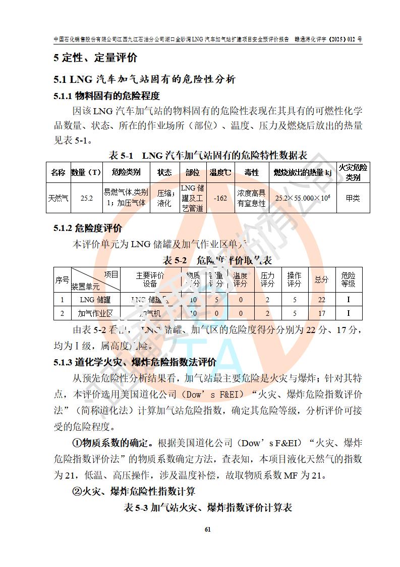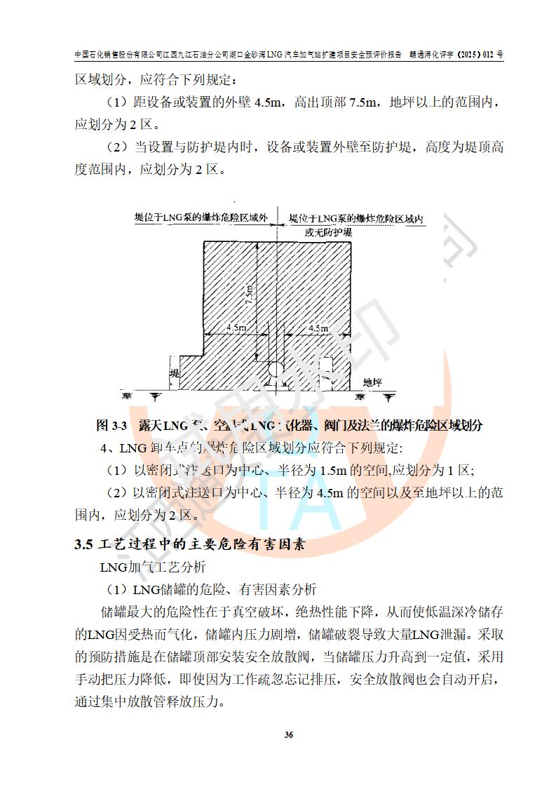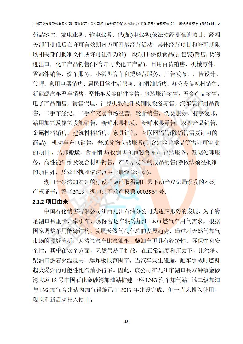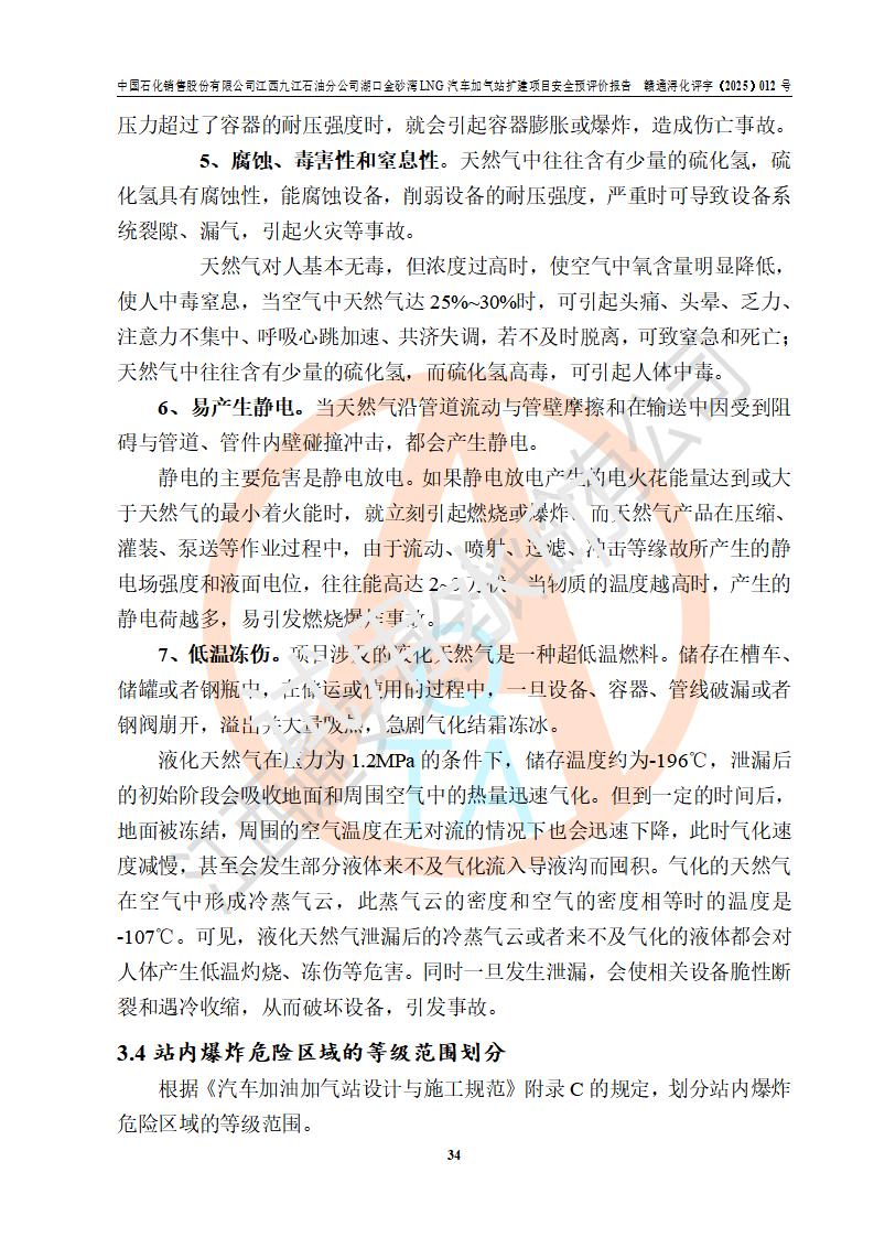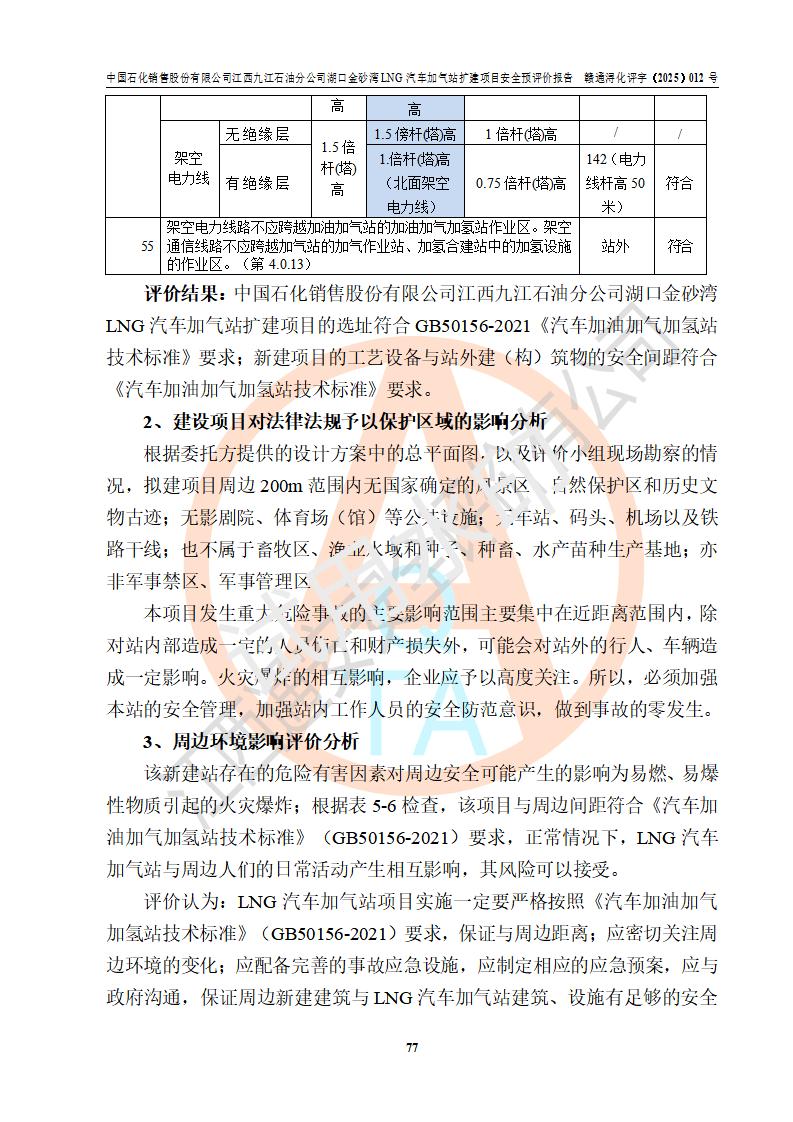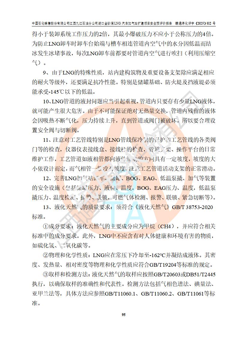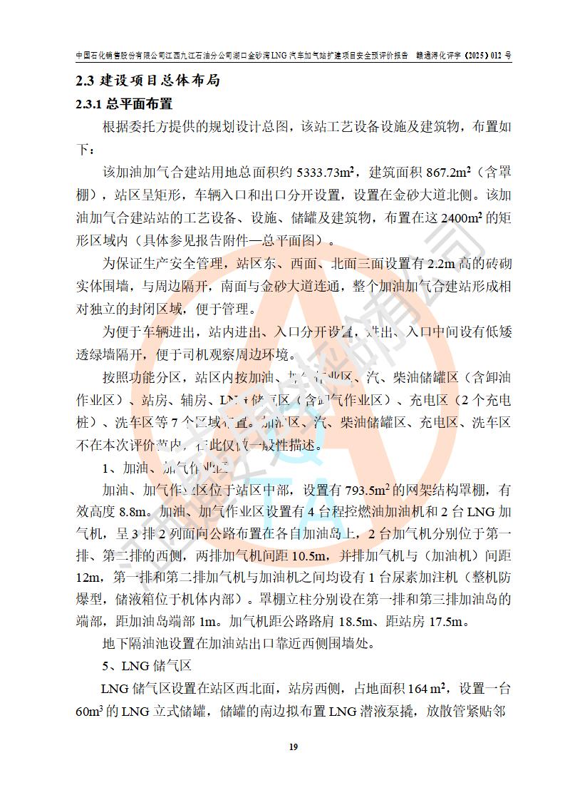 項(xiàng)目簡介 | 中國石化銷售股份有限公司江西九江石油分公司九江市湖口金砂灣LNG汽車加氣站成立于2024年11月12日,經(jīng)營場所為江西省九江市湖口縣金砂灣大道與發(fā)展大道交匯處(金砂灣派出所右側(cè)50米處),法定**人為杜建國,公司類型為臺(tái)、港、澳投資企業(yè)分公司。經(jīng)營范圍:許可項(xiàng)目:食品銷售,煙草制品零售,餐飲服務(wù),燃?xì)饨?jīng)營,出版物零售,道路貨物運(yùn)輸(不含危險(xiǎn)貨物),旅游業(yè)務(wù),**經(jīng)紀(jì)業(yè)務(wù),房地產(chǎn)開發(fā)經(jīng)營,住宿服務(wù),藥品零售,發(fā)電業(yè)務(wù)、輸電業(yè)務(wù)、供(配)電業(yè)務(wù)(依法須經(jīng)批準(zhǔn)的項(xiàng)目,經(jīng)相關(guān)部門批準(zhǔn)后在許可**期內(nèi)方可開展經(jīng)營活動(dòng),具體經(jīng)營項(xiàng)目和許可期限以相關(guān)部門批準(zhǔn)文件或許可證件為準(zhǔn))一般項(xiàng)日:保健食品(預(yù)包裝)銷售,貨物進(jìn)出口,化工產(chǎn)品銷售(不含許可類化工產(chǎn)品),日用百貨銷售,機(jī)械零件、零部件銷售,洗車服務(wù),小微型客車租賃經(jīng)營服務(wù),廣告發(fā)布,廣告設(shè)計(jì)、代理,家用電器銷售,居民日常生活服務(wù),潤滑油銷售,辦公設(shè)備耗材銷售,新能源汽車整車銷售,摩托車及零配件零售,服裝服飾零售,五金產(chǎn)品零售,電子產(chǎn)品銷售,銷售代理,計(jì)算機(jī)軟硬件及鋪助設(shè)備零售,汽車裝飾用品銷售,二手車經(jīng)紀(jì),二手車交易市場經(jīng)營,輪胎銷售,洗燙服務(wù),打字復(fù)印,站用加氫及儲(chǔ)氫設(shè)施銷售,新鮮水果批發(fā),新鮮水果零售,農(nóng)副產(chǎn)品銷售,金屬材料銷售,建筑材料銷售,家具銷售,互聯(lián)網(wǎng)銷售(除銷售需要許可的商品),機(jī)動(dòng)車充電銷售,普通貨物倉儲(chǔ)服務(wù)(不含危險(xiǎn)化學(xué)品等需許可審批的項(xiàng)日),裝卸搬運(yùn),食品銷售(僅銷售預(yù)包裝食品),包裝服務(wù),數(shù)據(jù)處理服務(wù),***纖維及復(fù)合材料銷售,產(chǎn)業(yè)用紡織制成品銷售(除依法須經(jīng)批準(zhǔn)的項(xiàng)目外,憑營業(yè)執(zhí)照依法自主開展經(jīng)營活動(dòng))。 為了滿足湖口縣重卡、牽引車、城際客運(yùn)**等加注LNG燃?xì)廛囉脷庑枨?,該公司根?jù)湖口縣發(fā)展和改革委員會(huì)批復(fù)的《江西省企業(yè)投資項(xiàng)目備案通知書》(項(xiàng)目統(tǒng)一代碼為:2409-360429-04-01-657252)文件,在九江市湖口縣金砂灣大道與發(fā)展大道交匯處金砂灣加油站區(qū)內(nèi)擬投資建設(shè)一座LNG汽車加氣站項(xiàng)目。 湖口金砂灣加油站的建設(shè)用地已取得湖口縣不動(dòng)產(chǎn)登記局頒發(fā)的不動(dòng)產(chǎn)權(quán)證書:贛(2023)湖口縣不動(dòng)產(chǎn)權(quán)第0002564號。 擬擴(kuò)建LNG汽車加氣站總用地面積為5333.73m2,總建筑面積為867.2m2,站區(qū)內(nèi)加氣機(jī)擬設(shè)置為2機(jī)2槍。LNG貯氣區(qū)內(nèi)設(shè)置1個(gè)60m3的LNG儲(chǔ)氣罐、LNG低溫泵撬1套(含雙泵、BOG空溫式加熱器),加氣能力為2×104Nm3/d。按現(xiàn)行《汽車加油加氣加氫站技術(shù)標(biāo)準(zhǔn)》對LNG加氣站的等級劃分,該LNG汽車加氣站屬三級站,與原有建成的三級加油站合建,屬二級加油與LNG加氣合建站。建成后本項(xiàng)目日加氣量可達(dá)2×104Nm3/日。 該二級加油與LNG加氣合建站內(nèi)加氣設(shè)施已于2017年建設(shè)完成,但一直未投入使用?,F(xiàn)因公司市場發(fā)展需要,擬重新啟動(dòng)投入使用。依據(jù)《中華人民共和國安全生產(chǎn)法》、《燃?xì)饨?jīng)營許可管理辦法》、《城鎮(zhèn)燃?xì)夤芾項(xiàng)l例》等法律和規(guī)定的要求,新建、改建、擴(kuò)建危險(xiǎn)化學(xué)品儲(chǔ)存裝置和設(shè)施的建設(shè)項(xiàng)目安全條件審查(審批、核準(zhǔn)、備案)前,建設(shè)單位應(yīng)當(dāng)選擇有資質(zhì)的安全評價(jià)機(jī)構(gòu)對建設(shè)項(xiàng)目進(jìn)行安全條件評價(jià),以**工程項(xiàng)目的安全設(shè)施與主體工程同時(shí)設(shè)計(jì)、同時(shí)施工、同時(shí)投入使用,為**工程項(xiàng)目在安全生產(chǎn)及安全管理方面符合**及行業(yè)有關(guān)法律法規(guī)及標(biāo)準(zhǔn),中國石化銷售股份有限公司江西江西九江石油分公司湖口金砂灣LNG汽車加氣站擴(kuò)建項(xiàng)目委托江西通安安全評價(jià)有限公司承擔(dān)中國石化銷售股份有限公司江西九江石油分公司湖口金砂灣LNG汽車加氣站擴(kuò)建項(xiàng)目的安全預(yù)評價(jià)。該企業(yè)應(yīng)辦理燃?xì)饨?jīng)營許可證。 江西通安安全評價(jià)有限公司接受委托后,成立了評價(jià)組,于2025年2月踏勘了建設(shè)地址。根據(jù)相關(guān)法律、法規(guī)和標(biāo)準(zhǔn)的規(guī)定,按照《安全評價(jià)通則》(AQ8001-2007)、《安全預(yù)評價(jià)導(dǎo)則》(AQ8002-2007)的要求,在資料收集、現(xiàn)場勘探和類比調(diào)查的基礎(chǔ)上,對項(xiàng)目的工程技術(shù)資料進(jìn)行了認(rèn)真分析。建設(shè)項(xiàng)目內(nèi)在的危險(xiǎn)、有害因素對建設(shè)項(xiàng)目周邊單位生產(chǎn)、經(jīng)營活動(dòng)或者居民生活的影響以及建設(shè)項(xiàng)目周邊單位生產(chǎn)、經(jīng)營活動(dòng)或者居民生活對建設(shè)項(xiàng)目