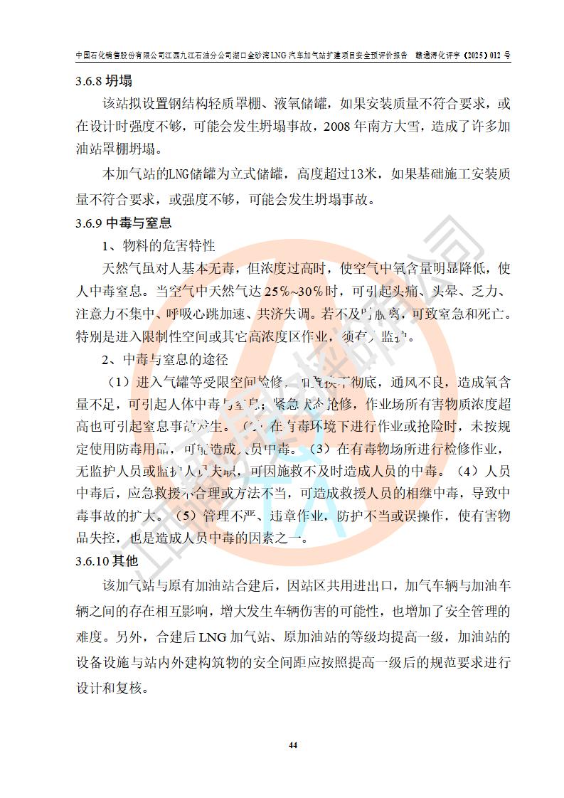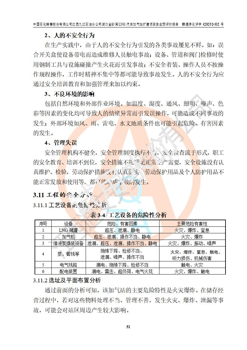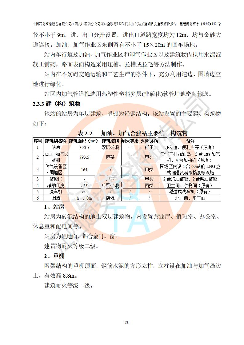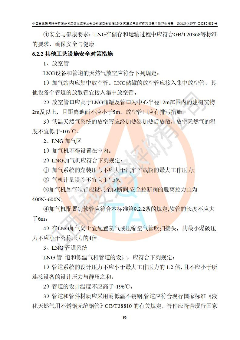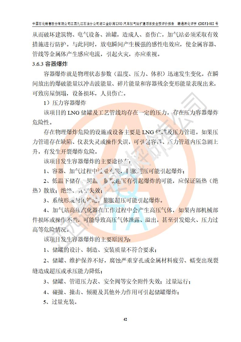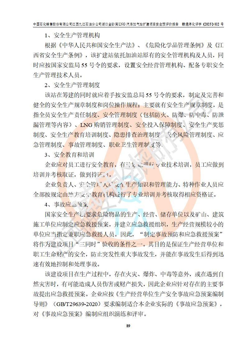 項(xiàng)目簡介 | 中國石化銷售股份有限公司江西九江石油分公司九江市湖口金砂灣LNG汽車加氣站成立于2024年11月12日,經(jīng)營場所為江西省九江市湖口縣金砂灣大道與發(fā)展大道交匯處(金砂灣派出所右側(cè)50米處),法定**人為杜建國,公司類型為臺(tái)、港、澳投資企業(yè)分公司。經(jīng)營范圍:許可項(xiàng)目:食品銷售,煙草制品零售,餐飲服務(wù),燃?xì)饨?jīng)營,出版物零售,道路貨物運(yùn)輸(不含危險(xiǎn)貨物),旅游業(yè)務(wù),**經(jīng)紀(jì)業(yè)務(wù),房地產(chǎn)開發(fā)經(jīng)營,住宿服務(wù),藥品零售,發(fā)電業(yè)務(wù)、輸電業(yè)務(wù)、供(配)電業(yè)務(wù)(依法須經(jīng)批準(zhǔn)的項(xiàng)目,經(jīng)相關(guān)部門批準(zhǔn)后在許可**期內(nèi)方可開展經(jīng)營活動(dòng),具體經(jīng)營項(xiàng)目和許可期限以相關(guān)部門批準(zhǔn)文件或許可證件為準(zhǔn))一般項(xiàng)日:保健食品(預(yù)包裝)銷售,貨物進(jìn)出口,化工產(chǎn)品銷售(不含許可類化工產(chǎn)品),日用百貨銷售,機(jī)械零件、零部件銷售,洗車服務(wù),小微型客車租賃經(jīng)營服務(wù),廣告發(fā)布,廣告設(shè)計(jì)、代理,家用電器銷售,居民日常生活服務(wù),潤滑油銷售,辦公設(shè)備耗材銷售,新能源汽車整車銷售,摩托車及零配件零售,服裝服飾零售,五金產(chǎn)品零售,電子產(chǎn)品銷售,銷售代理,計(jì)算機(jī)軟硬件及鋪助設(shè)備零售,汽車裝飾用品銷售,二手車經(jīng)紀(jì),二手車交易市場經(jīng)營,輪胎銷售,洗燙服務(wù),打字復(fù)印,站用加氫及儲(chǔ)氫設(shè)施銷售,新鮮水果批發(fā),新鮮水果零售,農(nóng)副產(chǎn)品銷售,金屬材料銷售,建筑材料銷售,家具銷售,互聯(lián)網(wǎng)銷售(除銷售需要許可的商品),機(jī)動(dòng)車充電銷售,普通貨物倉儲(chǔ)服務(wù)(不含危險(xiǎn)化學(xué)品等需許可審批的項(xiàng)日),裝卸搬運(yùn),食品銷售(僅銷售預(yù)包裝食品),包裝服務(wù),數(shù)據(jù)處理服務(wù),***纖維及復(fù)合材料銷售,產(chǎn)業(yè)用紡織制成品銷售(除依法須經(jīng)批準(zhǔn)的項(xiàng)目外,憑營業(yè)執(zhí)照依法自主開展經(jīng)營活動(dòng))。 為了滿足湖口縣重卡、牽引車、城際客運(yùn)**等加注LNG燃?xì)廛囉脷庑枨?,該公司根?jù)湖口縣發(fā)展和改革委員會(huì)批復(fù)的《江西省企業(yè)投資項(xiàng)目備案通知書》(項(xiàng)目統(tǒng)一代碼為:2409-360429-04-01-657252)文件,在九江市湖口縣金砂灣大道與發(fā)展大道交匯處金砂灣加油站區(qū)內(nèi)擬投資建設(shè)一座LNG汽車加氣站項(xiàng)目。 湖口金砂灣加油站的建設(shè)用地已取得湖口縣不動(dòng)產(chǎn)登記局頒發(fā)的不動(dòng)產(chǎn)權(quán)證書:贛(2023)湖口縣不動(dòng)產(chǎn)權(quán)第0002564號。 擬擴(kuò)建LNG汽車加氣站總用地面積為5333.73m2,總建筑面積為867.2m2,站區(qū)內(nèi)加氣機(jī)擬設(shè)置為2機(jī)2槍。LNG貯氣區(qū)內(nèi)設(shè)置1個(gè)60m3的LNG儲(chǔ)氣罐、LNG低溫泵撬1套(含雙泵、BOG空溫式加熱器),加氣能力為2×104Nm3/d。按現(xiàn)行《汽車加油加氣加氫站技術(shù)標(biāo)準(zhǔn)》對LNG加氣站的等級劃分,該LNG汽車加氣站屬三級站,與原有建成的三級加油站合建,屬二級加油與LNG加氣合建站。建成后本項(xiàng)目日加氣量可達(dá)2×104Nm3/日。 該二級加油與LNG加氣合建站內(nèi)加氣設(shè)施已于2017年建設(shè)完成,但一直未投入使用?,F(xiàn)因公司市場發(fā)展需要,擬重新啟動(dòng)投入使用。依據(jù)《中華人民共和國安全生產(chǎn)法》、《燃?xì)饨?jīng)營許可管理辦法》、《城鎮(zhèn)燃?xì)夤芾項(xiàng)l例》等法律和規(guī)定的要求,新建、改建、擴(kuò)建危險(xiǎn)化學(xué)品儲(chǔ)存裝置和設(shè)施的建設(shè)項(xiàng)目安全條件審查(審批、核準(zhǔn)、備案)前,建設(shè)單位應(yīng)當(dāng)選擇有資質(zhì)的安全評價(jià)機(jī)構(gòu)對建設(shè)項(xiàng)目進(jìn)行安全條件評價(jià),以**工程項(xiàng)目的安全設(shè)施與主體工程同時(shí)設(shè)計(jì)、同時(shí)施工、同時(shí)投入使用,為**工程項(xiàng)目在安全生產(chǎn)及安全管理方面符合**及行業(yè)有關(guān)法律法規(guī)及標(biāo)準(zhǔn),中國石化銷售股份有限公司江西江西九江石油分公司湖口金砂灣LNG汽車加氣站擴(kuò)建項(xiàng)目委托江西通安安全評價(jià)有限公司承擔(dān)中國石化銷售股份有限公司江西九江石油分公司湖口金砂灣LNG汽車加氣站擴(kuò)建項(xiàng)目的安全預(yù)評價(jià)。該企業(yè)應(yīng)辦理燃?xì)饨?jīng)營許可證。 江西通安安全評價(jià)有限公司接受委托后,成立了評價(jià)組,于2025年2月踏勘了建設(shè)地址。根據(jù)相關(guān)法律、法規(guī)和標(biāo)準(zhǔn)的規(guī)定,按照《安全評價(jià)通則》(AQ8001-2007)、《安全預(yù)評價(jià)導(dǎo)則》(AQ8002-2007)的要求,在資料收集、現(xiàn)場勘探和類比調(diào)查的基礎(chǔ)上,對項(xiàng)目的工程技術(shù)資料進(jìn)行了認(rèn)真分析。建設(shè)項(xiàng)目內(nèi)在的危險(xiǎn)、有害因素對建設(shè)項(xiàng)目周邊單位生產(chǎn)、經(jīng)營活動(dòng)或者居民生活的影響以及建設(shè)項(xiàng)目周邊單位生產(chǎn)、經(jīng)營活動(dòng)或者居民生活對建設(shè)項(xiàng)目