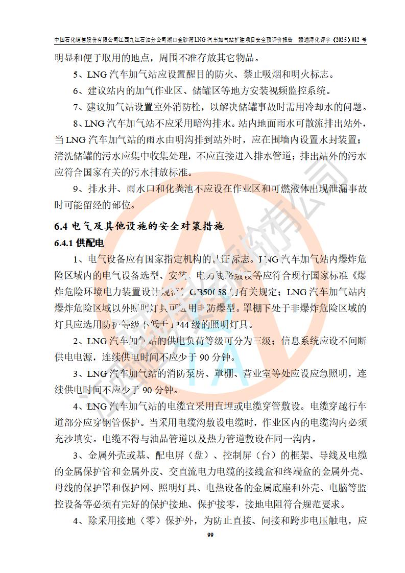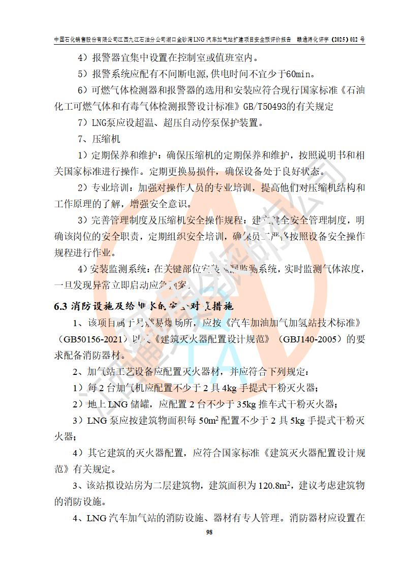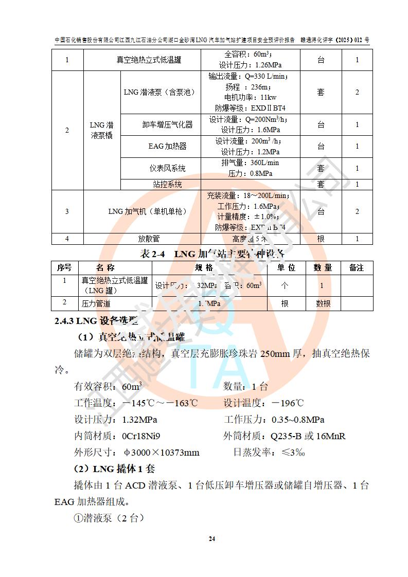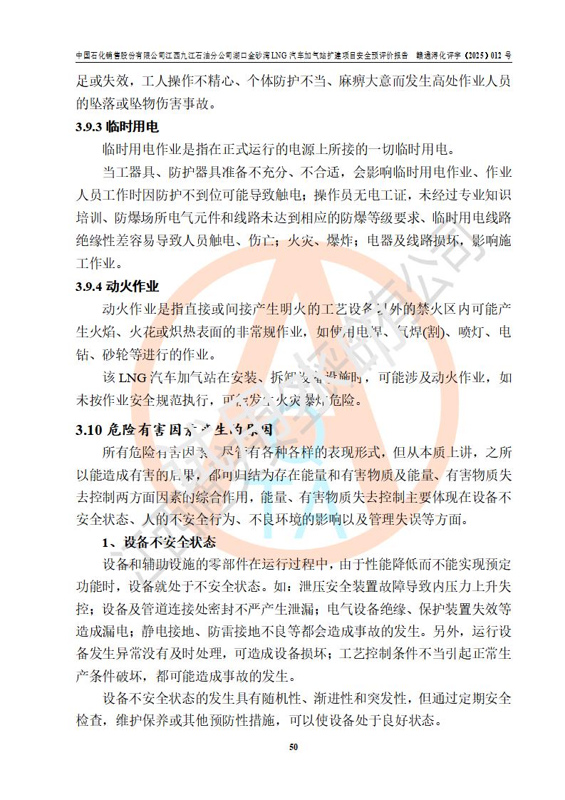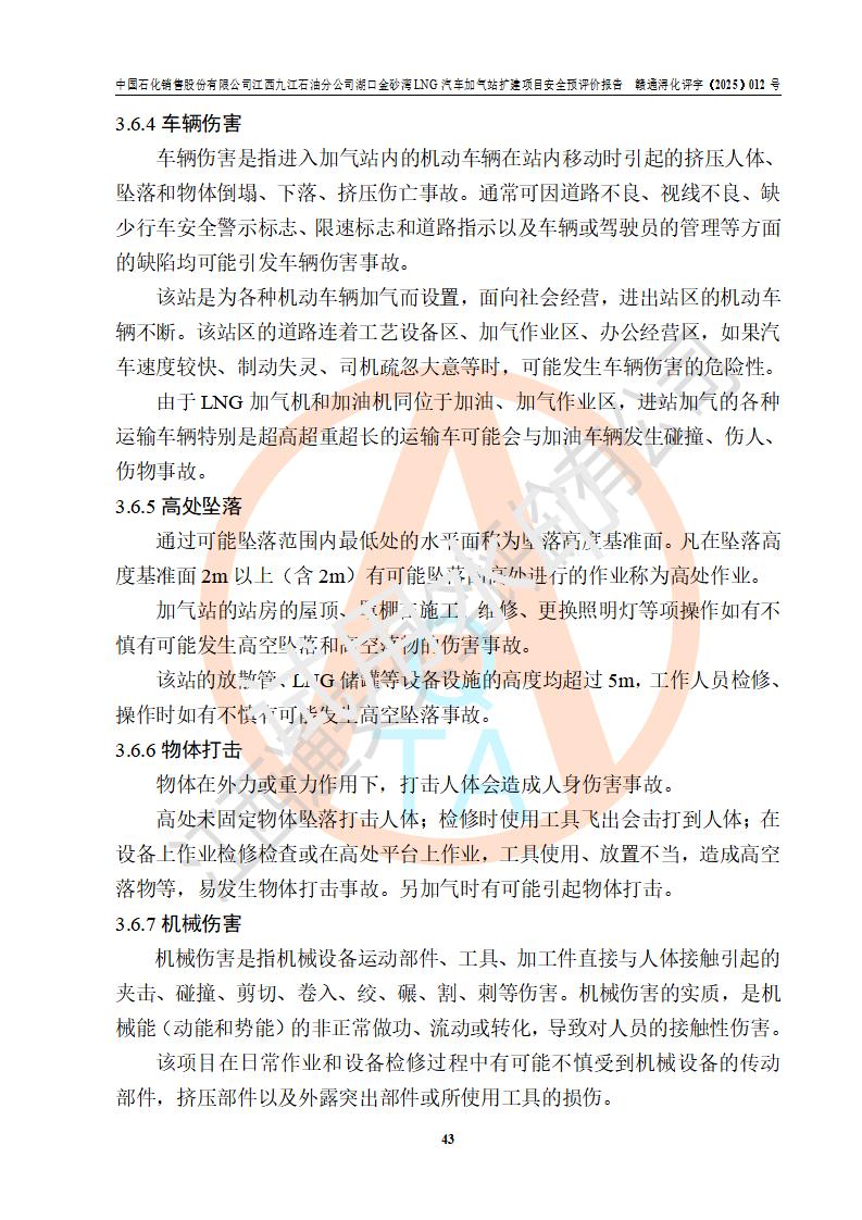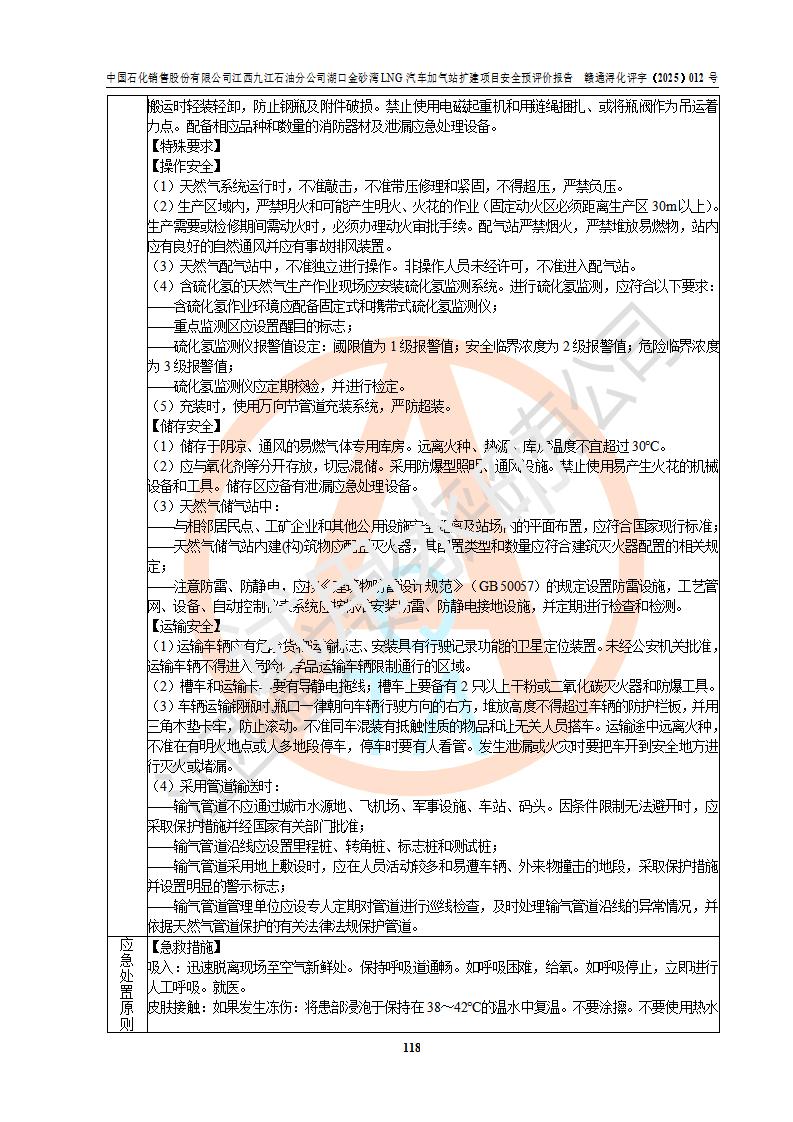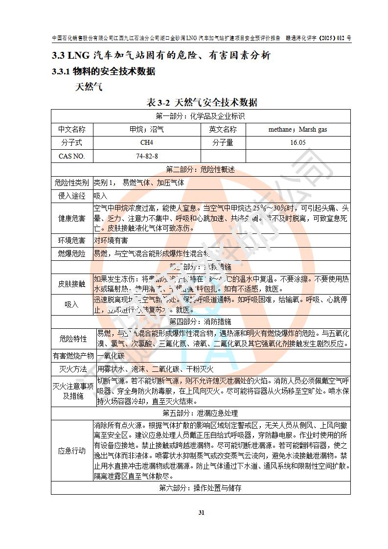項(xiàng)目簡介 | 中國石化銷售股份有限公司江西九江石油分公司九江市湖口金砂灣LNG汽車加氣站成立于2024年11月12日,經(jīng)營場所為江西省九江市湖口縣金砂灣大道與發(fā)展大道交匯處(金砂灣派出所右側(cè)50米處),法定**人為杜建國,公司類型為臺(tái)、港、澳投資企業(yè)分公司。經(jīng)營范圍:許可項(xiàng)目:食品銷售,煙草制品零售,餐飲服務(wù),燃?xì)饨?jīng)營,出版物零售,道路貨物運(yùn)輸(不含危險(xiǎn)貨物),旅游業(yè)務(wù),**經(jīng)紀(jì)業(yè)務(wù),房地產(chǎn)開發(fā)經(jīng)營,住宿服務(wù),藥品零售,發(fā)電業(yè)務(wù)、輸電業(yè)務(wù)、供(配)電業(yè)務(wù)(依法須經(jīng)批準(zhǔn)的項(xiàng)目,經(jīng)相關(guān)部門批準(zhǔn)后在許可**期內(nèi)方可開展經(jīng)營活動(dòng),具體經(jīng)營項(xiàng)目和許可期限以相關(guān)部門批準(zhǔn)文件或許可證件為準(zhǔn))一般項(xiàng)日:保健食品(預(yù)包裝)銷售,貨物進(jìn)出口,化工產(chǎn)品銷售(不含許可類化工產(chǎn)品),日用百貨銷售,機(jī)械零件、零部件銷售,洗車服務(wù),小微型客車租賃經(jīng)營服務(wù),廣告發(fā)布,廣告設(shè)計(jì)、代理,家用電器銷售,居民日常生活服務(wù),潤滑油銷售,辦公設(shè)備耗材銷售,新能源汽車整車銷售,摩托車及零配件零售,服裝服飾零售,五金產(chǎn)品零售,電子產(chǎn)品銷售,銷售代理,計(jì)算機(jī)軟硬件及鋪助設(shè)備零售,汽車裝飾用品銷售,二手車經(jīng)紀(jì),二手車交易市場經(jīng)營,輪胎銷售,洗燙服務(wù),打字復(fù)印,站用加氫及儲(chǔ)氫設(shè)施銷售,新鮮水果批發(fā),新鮮水果零售,農(nóng)副產(chǎn)品銷售,金屬材料銷售,建筑材料銷售,家具銷售,互聯(lián)網(wǎng)銷售(除銷售需要許可的商品),機(jī)動(dòng)車充電銷售,普通貨物倉儲(chǔ)服務(wù)(不含危險(xiǎn)化學(xué)品等需許可審批的項(xiàng)日),裝卸搬運(yùn),食品銷售(僅銷售預(yù)包裝食品),包裝服務(wù),數(shù)據(jù)處理服務(wù),***纖維及復(fù)合材料銷售,產(chǎn)業(yè)用紡織制成品銷售(除依法須經(jīng)批準(zhǔn)的項(xiàng)目外,憑營業(yè)執(zhí)照依法自主開展經(jīng)營活動(dòng))。 為了滿足湖口縣重卡、牽引車、城際客運(yùn)**等加注LNG燃?xì)廛囉脷庑枨?,該公司根?jù)湖口縣發(fā)展和改革委員會(huì)批復(fù)的《江西省企業(yè)投資項(xiàng)目備案通知書》(項(xiàng)目統(tǒng)一代碼為:2409-360429-04-01-657252)文件,在九江市湖口縣金砂灣大道與發(fā)展大道交匯處金砂灣加油站區(qū)內(nèi)擬投資建設(shè)一座LNG汽車加氣站項(xiàng)目。 湖口金砂灣加油站的建設(shè)用地已取得湖口縣不動(dòng)產(chǎn)登記局頒發(fā)的不動(dòng)產(chǎn)權(quán)證書:贛(2023)湖口縣不動(dòng)產(chǎn)權(quán)第0002564號。 擬擴(kuò)建LNG汽車加氣站總用地面積為5333.73m2,總建筑面積為867.2m2,站區(qū)內(nèi)加氣機(jī)擬設(shè)置為2機(jī)2槍。LNG貯氣區(qū)內(nèi)設(shè)置1個(gè)60m3的LNG儲(chǔ)氣罐、LNG低溫泵撬1套(含雙泵、BOG空溫式加熱器),加氣能力為2×104Nm3/d。按現(xiàn)行《汽車加油加氣加氫站技術(shù)標(biāo)準(zhǔn)》對LNG加氣站的等級劃分,該LNG汽車加氣站屬三級站,與原有建成的三級加油站合建,屬二級加油與LNG加氣合建站。建成后本項(xiàng)目日加氣量可達(dá)2×104Nm3/日。 該二級加油與LNG加氣合建站內(nèi)加氣設(shè)施已于2017年建設(shè)完成,但一直未投入使用?,F(xiàn)因公司市場發(fā)展需要,擬重新啟動(dòng)投入使用。依據(jù)《中華人民共和國安全生產(chǎn)法》、《燃?xì)饨?jīng)營許可管理辦法》、《城鎮(zhèn)燃?xì)夤芾項(xiàng)l例》等法律和規(guī)定的要求,新建、改建、擴(kuò)建危險(xiǎn)化學(xué)品儲(chǔ)存裝置和設(shè)施的建設(shè)項(xiàng)目安全條件審查(審批、核準(zhǔn)、備案)前,建設(shè)單位應(yīng)當(dāng)選擇有資質(zhì)的安全評價(jià)機(jī)構(gòu)對建設(shè)項(xiàng)目進(jìn)行安全條件評價(jià),以**工程項(xiàng)目的安全設(shè)施與主體工程同時(shí)設(shè)計(jì)、同時(shí)施工、同時(shí)投入使用,為**工程項(xiàng)目在安全生產(chǎn)及安全管理方面符合**及行業(yè)有關(guān)法律法規(guī)及標(biāo)準(zhǔn),中國石化銷售股份有限公司江西江西九江石油分公司湖口金砂灣LNG汽車加氣站擴(kuò)建項(xiàng)目委托江西通安安全評價(jià)有限公司承擔(dān)中國石化銷售股份有限公司江西九江石油分公司湖口金砂灣LNG汽車加氣站擴(kuò)建項(xiàng)目的安全預(yù)評價(jià)。該企業(yè)應(yīng)辦理燃?xì)饨?jīng)營許可證。 江西通安安全評價(jià)有限公司接受委托后,成立了評價(jià)組,于2025年2月踏勘了建設(shè)地址。根據(jù)相關(guān)法律、法規(guī)和標(biāo)準(zhǔn)的規(guī)定,按照《安全評價(jià)通則》(AQ8001-2007)、《安全預(yù)評價(jià)導(dǎo)則》(AQ8002-2007)的要求,在資料收集、現(xiàn)場勘探和類比調(diào)查的基礎(chǔ)上,對項(xiàng)目的工程技術(shù)資料進(jìn)行了認(rèn)真分析。建設(shè)項(xiàng)目內(nèi)在的危險(xiǎn)、有害因素對建設(shè)項(xiàng)目周邊單位生產(chǎn)、經(jīng)營活動(dòng)或者居民生活的影響以及建設(shè)項(xiàng)目周邊單位生產(chǎn)、經(jīng)營活動(dòng)或者居民生活對建設(shè)項(xiàng)目