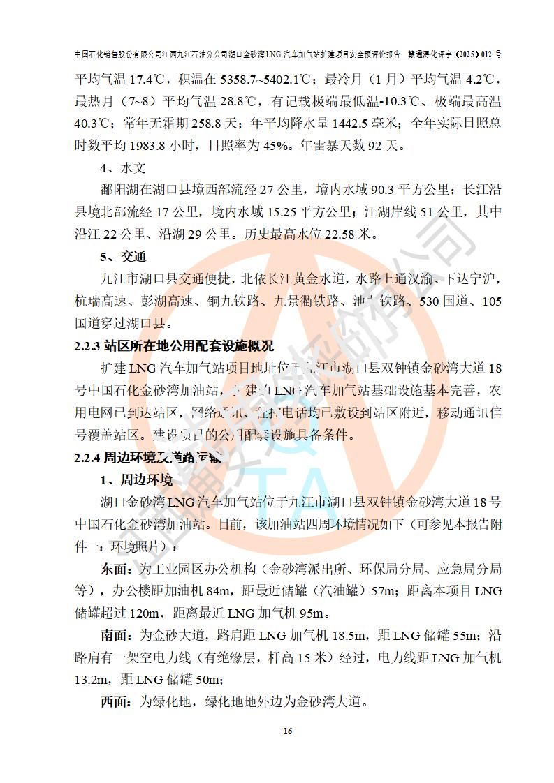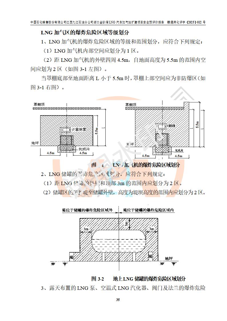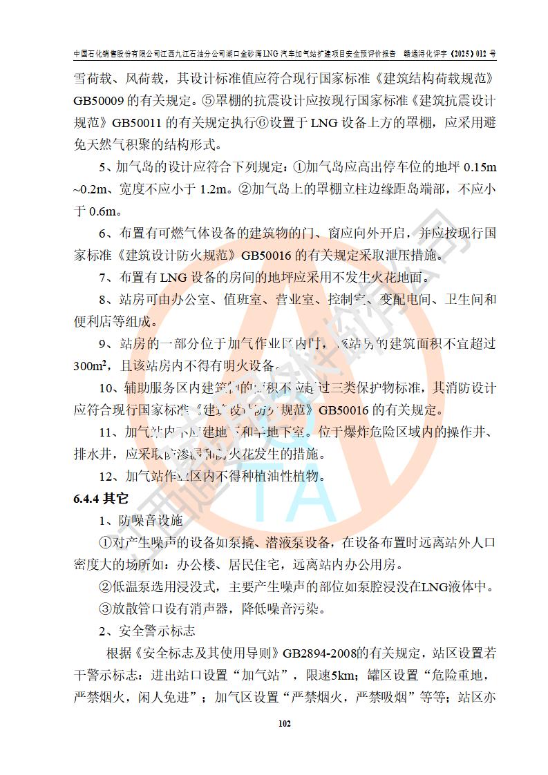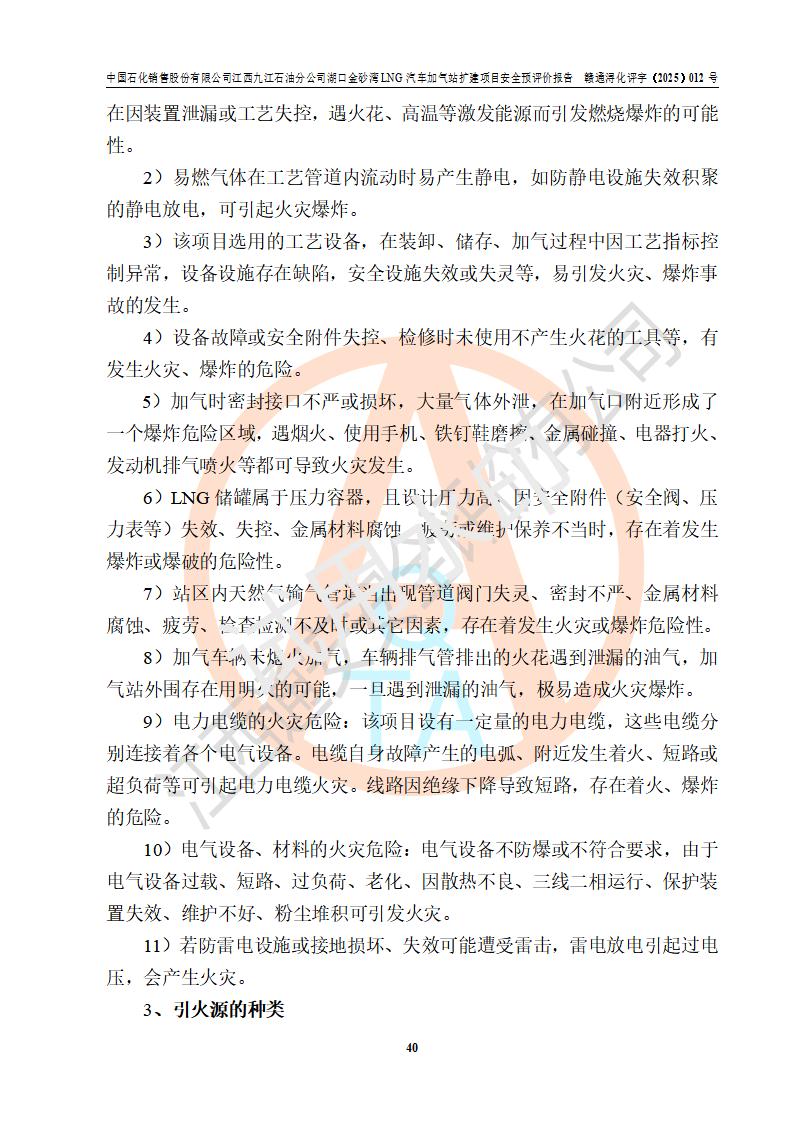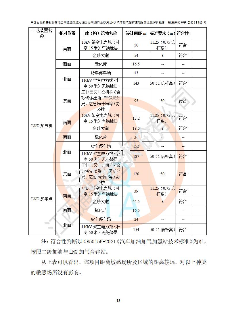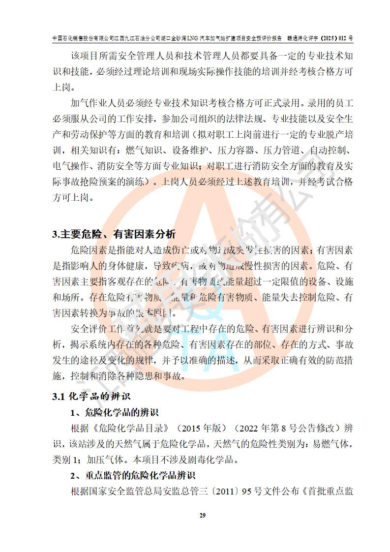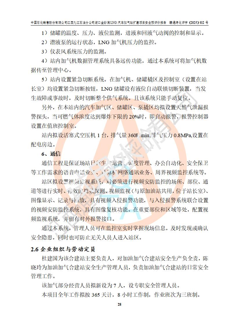 項(xiàng)目簡介 | 中國石化銷售股份有限公司江西九江石油分公司九江市湖口金砂灣LNG汽車加氣站成立于2024年11月12日,經(jīng)營場所為江西省九江市湖口縣金砂灣大道與發(fā)展大道交匯處(金砂灣派出所右側(cè)50米處),法定**人為杜建國,公司類型為臺(tái)、港、澳投資企業(yè)分公司。經(jīng)營范圍:許可項(xiàng)目:食品銷售,煙草制品零售,餐飲服務(wù),燃?xì)饨?jīng)營,出版物零售,道路貨物運(yùn)輸(不含危險(xiǎn)貨物),旅游業(yè)務(wù),**經(jīng)紀(jì)業(yè)務(wù),房地產(chǎn)開發(fā)經(jīng)營,住宿服務(wù),藥品零售,發(fā)電業(yè)務(wù)、輸電業(yè)務(wù)、供(配)電業(yè)務(wù)(依法須經(jīng)批準(zhǔn)的項(xiàng)目,經(jīng)相關(guān)部門批準(zhǔn)后在許可**期內(nèi)方可開展經(jīng)營活動(dòng),具體經(jīng)營項(xiàng)目和許可期限以相關(guān)部門批準(zhǔn)文件或許可證件為準(zhǔn))一般項(xiàng)日:保健食品(預(yù)包裝)銷售,貨物進(jìn)出口,化工產(chǎn)品銷售(不含許可類化工產(chǎn)品),日用百貨銷售,機(jī)械零件、零部件銷售,洗車服務(wù),小微型客車租賃經(jīng)營服務(wù),廣告發(fā)布,廣告設(shè)計(jì)、代理,家用電器銷售,居民日常生活服務(wù),潤滑油銷售,辦公設(shè)備耗材銷售,新能源汽車整車銷售,摩托車及零配件零售,服裝服飾零售,五金產(chǎn)品零售,電子產(chǎn)品銷售,銷售代理,計(jì)算機(jī)軟硬件及鋪助設(shè)備零售,汽車裝飾用品銷售,二手車經(jīng)紀(jì),二手車交易市場經(jīng)營,輪胎銷售,洗燙服務(wù),打字復(fù)印,站用加氫及儲(chǔ)氫設(shè)施銷售,新鮮水果批發(fā),新鮮水果零售,農(nóng)副產(chǎn)品銷售,金屬材料銷售,建筑材料銷售,家具銷售,互聯(lián)網(wǎng)銷售(除銷售需要許可的商品),機(jī)動(dòng)車充電銷售,普通貨物倉儲(chǔ)服務(wù)(不含危險(xiǎn)化學(xué)品等需許可審批的項(xiàng)日),裝卸搬運(yùn),食品銷售(僅銷售預(yù)包裝食品),包裝服務(wù),數(shù)據(jù)處理服務(wù),***纖維及復(fù)合材料銷售,產(chǎn)業(yè)用紡織制成品銷售(除依法須經(jīng)批準(zhǔn)的項(xiàng)目外,憑營業(yè)執(zhí)照依法自主開展經(jīng)營活動(dòng))。 為了滿足湖口縣重卡、牽引車、城際客運(yùn)**等加注LNG燃?xì)廛囉脷庑枨?,該公司根?jù)湖口縣發(fā)展和改革委員會(huì)批復(fù)的《江西省企業(yè)投資項(xiàng)目備案通知書》(項(xiàng)目統(tǒng)一代碼為:2409-360429-04-01-657252)文件,在九江市湖口縣金砂灣大道與發(fā)展大道交匯處金砂灣加油站區(qū)內(nèi)擬投資建設(shè)一座LNG汽車加氣站項(xiàng)目。 湖口金砂灣加油站的建設(shè)用地已取得湖口縣不動(dòng)產(chǎn)登記局頒發(fā)的不動(dòng)產(chǎn)權(quán)證書:贛(2023)湖口縣不動(dòng)產(chǎn)權(quán)第0002564號。 擬擴(kuò)建LNG汽車加氣站總用地面積為5333.73m2,總建筑面積為867.2m2,站區(qū)內(nèi)加氣機(jī)擬設(shè)置為2機(jī)2槍。LNG貯氣區(qū)內(nèi)設(shè)置1個(gè)60m3的LNG儲(chǔ)氣罐、LNG低溫泵撬1套(含雙泵、BOG空溫式加熱器),加氣能力為2×104Nm3/d。按現(xiàn)行《汽車加油加氣加氫站技術(shù)標(biāo)準(zhǔn)》對LNG加氣站的等級劃分,該LNG汽車加氣站屬三級站,與原有建成的三級加油站合建,屬二級加油與LNG加氣合建站。建成后本項(xiàng)目日加氣量可達(dá)2×104Nm3/日。 該二級加油與LNG加氣合建站內(nèi)加氣設(shè)施已于2017年建設(shè)完成,但一直未投入使用?,F(xiàn)因公司市場發(fā)展需要,擬重新啟動(dòng)投入使用。依據(jù)《中華人民共和國安全生產(chǎn)法》、《燃?xì)饨?jīng)營許可管理辦法》、《城鎮(zhèn)燃?xì)夤芾項(xiàng)l例》等法律和規(guī)定的要求,新建、改建、擴(kuò)建危險(xiǎn)化學(xué)品儲(chǔ)存裝置和設(shè)施的建設(shè)項(xiàng)目安全條件審查(審批、核準(zhǔn)、備案)前,建設(shè)單位應(yīng)當(dāng)選擇有資質(zhì)的安全評價(jià)機(jī)構(gòu)對建設(shè)項(xiàng)目進(jìn)行安全條件評價(jià),以**工程項(xiàng)目的安全設(shè)施與主體工程同時(shí)設(shè)計(jì)、同時(shí)施工、同時(shí)投入使用,為**工程項(xiàng)目在安全生產(chǎn)及安全管理方面符合**及行業(yè)有關(guān)法律法規(guī)及標(biāo)準(zhǔn),中國石化銷售股份有限公司江西江西九江石油分公司湖口金砂灣LNG汽車加氣站擴(kuò)建項(xiàng)目委托江西通安安全評價(jià)有限公司承擔(dān)中國石化銷售股份有限公司江西九江石油分公司湖口金砂灣LNG汽車加氣站擴(kuò)建項(xiàng)目的安全預(yù)評價(jià)。該企業(yè)應(yīng)辦理燃?xì)饨?jīng)營許可證。 江西通安安全評價(jià)有限公司接受委托后,成立了評價(jià)組,于2025年2月踏勘了建設(shè)地址。根據(jù)相關(guān)法律、法規(guī)和標(biāo)準(zhǔn)的規(guī)定,按照《安全評價(jià)通則》(AQ8001-2007)、《安全預(yù)評價(jià)導(dǎo)則》(AQ8002-2007)的要求,在資料收集、現(xiàn)場勘探和類比調(diào)查的基礎(chǔ)上,對項(xiàng)目的工程技術(shù)資料進(jìn)行了認(rèn)真分析。建設(shè)項(xiàng)目內(nèi)在的危險(xiǎn)、有害因素對建設(shè)項(xiàng)目周邊單位生產(chǎn)、經(jīng)營活動(dòng)或者居民生活的影響以及建設(shè)項(xiàng)目周邊單位生產(chǎn)、經(jīng)營活動(dòng)或者居民生活對建設(shè)項(xiàng)目