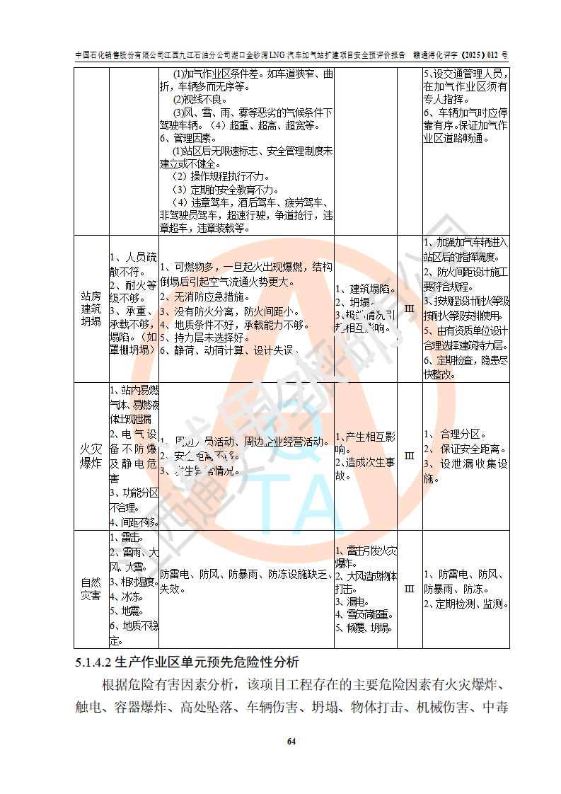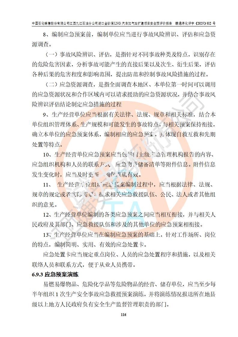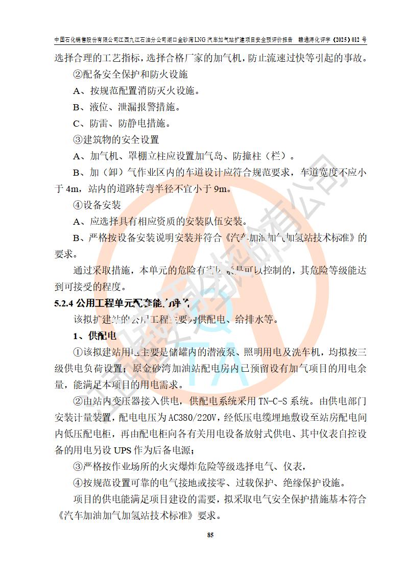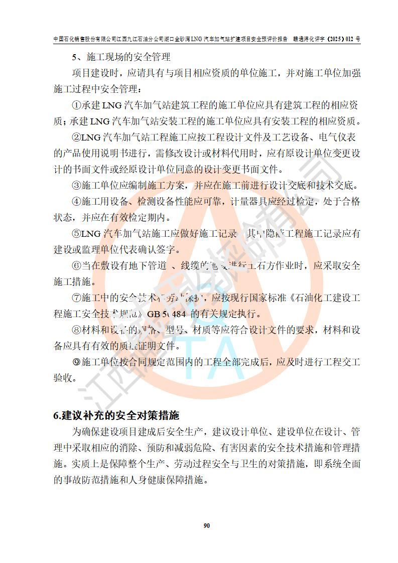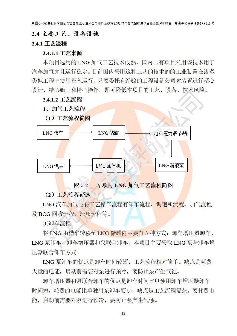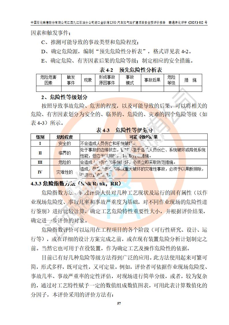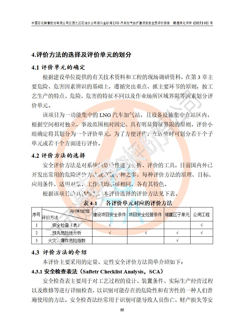 項(xiàng)目簡介 | 中國石化銷售股份有限公司江西九江石油分公司九江市湖口金砂灣LNG汽車加氣站成立于2024年11月12日,經(jīng)營場所為江西省九江市湖口縣金砂灣大道與發(fā)展大道交匯處(金砂灣派出所右側(cè)50米處),法定**人為杜建國,公司類型為臺(tái)、港、澳投資企業(yè)分公司。經(jīng)營范圍:許可項(xiàng)目:食品銷售,煙草制品零售,餐飲服務(wù),燃?xì)饨?jīng)營,出版物零售,道路貨物運(yùn)輸(不含危險(xiǎn)貨物),旅游業(yè)務(wù),**經(jīng)紀(jì)業(yè)務(wù),房地產(chǎn)開發(fā)經(jīng)營,住宿服務(wù),藥品零售,發(fā)電業(yè)務(wù)、輸電業(yè)務(wù)、供(配)電業(yè)務(wù)(依法須經(jīng)批準(zhǔn)的項(xiàng)目,經(jīng)相關(guān)部門批準(zhǔn)后在許可**期內(nèi)方可開展經(jīng)營活動(dòng),具體經(jīng)營項(xiàng)目和許可期限以相關(guān)部門批準(zhǔn)文件或許可證件為準(zhǔn))一般項(xiàng)日:保健食品(預(yù)包裝)銷售,貨物進(jìn)出口,化工產(chǎn)品銷售(不含許可類化工產(chǎn)品),日用百貨銷售,機(jī)械零件、零部件銷售,洗車服務(wù),小微型客車租賃經(jīng)營服務(wù),廣告發(fā)布,廣告設(shè)計(jì)、代理,家用電器銷售,居民日常生活服務(wù),潤滑油銷售,辦公設(shè)備耗材銷售,新能源汽車整車銷售,摩托車及零配件零售,服裝服飾零售,五金產(chǎn)品零售,電子產(chǎn)品銷售,銷售代理,計(jì)算機(jī)軟硬件及鋪助設(shè)備零售,汽車裝飾用品銷售,二手車經(jīng)紀(jì),二手車交易市場經(jīng)營,輪胎銷售,洗燙服務(wù),打字復(fù)印,站用加氫及儲(chǔ)氫設(shè)施銷售,新鮮水果批發(fā),新鮮水果零售,農(nóng)副產(chǎn)品銷售,金屬材料銷售,建筑材料銷售,家具銷售,互聯(lián)網(wǎng)銷售(除銷售需要許可的商品),機(jī)動(dòng)車充電銷售,普通貨物倉儲(chǔ)服務(wù)(不含危險(xiǎn)化學(xué)品等需許可審批的項(xiàng)日),裝卸搬運(yùn),食品銷售(僅銷售預(yù)包裝食品),包裝服務(wù),數(shù)據(jù)處理服務(wù),***纖維及復(fù)合材料銷售,產(chǎn)業(yè)用紡織制成品銷售(除依法須經(jīng)批準(zhǔn)的項(xiàng)目外,憑營業(yè)執(zhí)照依法自主開展經(jīng)營活動(dòng))。 為了滿足湖口縣重卡、牽引車、城際客運(yùn)**等加注LNG燃?xì)廛囉脷庑枨?,該公司根?jù)湖口縣發(fā)展和改革委員會(huì)批復(fù)的《江西省企業(yè)投資項(xiàng)目備案通知書》(項(xiàng)目統(tǒng)一代碼為:2409-360429-04-01-657252)文件,在九江市湖口縣金砂灣大道與發(fā)展大道交匯處金砂灣加油站區(qū)內(nèi)擬投資建設(shè)一座LNG汽車加氣站項(xiàng)目。 湖口金砂灣加油站的建設(shè)用地已取得湖口縣不動(dòng)產(chǎn)登記局頒發(fā)的不動(dòng)產(chǎn)權(quán)證書:贛(2023)湖口縣不動(dòng)產(chǎn)權(quán)第0002564號。 擬擴(kuò)建LNG汽車加氣站總用地面積為5333.73m2,總建筑面積為867.2m2,站區(qū)內(nèi)加氣機(jī)擬設(shè)置為2機(jī)2槍。LNG貯氣區(qū)內(nèi)設(shè)置1個(gè)60m3的LNG儲(chǔ)氣罐、LNG低溫泵撬1套(含雙泵、BOG空溫式加熱器),加氣能力為2×104Nm3/d。按現(xiàn)行《汽車加油加氣加氫站技術(shù)標(biāo)準(zhǔn)》對LNG加氣站的等級劃分,該LNG汽車加氣站屬三級站,與原有建成的三級加油站合建,屬二級加油與LNG加氣合建站。建成后本項(xiàng)目日加氣量可達(dá)2×104Nm3/日。 該二級加油與LNG加氣合建站內(nèi)加氣設(shè)施已于2017年建設(shè)完成,但一直未投入使用?,F(xiàn)因公司市場發(fā)展需要,擬重新啟動(dòng)投入使用。依據(jù)《中華人民共和國安全生產(chǎn)法》、《燃?xì)饨?jīng)營許可管理辦法》、《城鎮(zhèn)燃?xì)夤芾項(xiàng)l例》等法律和規(guī)定的要求,新建、改建、擴(kuò)建危險(xiǎn)化學(xué)品儲(chǔ)存裝置和設(shè)施的建設(shè)項(xiàng)目安全條件審查(審批、核準(zhǔn)、備案)前,建設(shè)單位應(yīng)當(dāng)選擇有資質(zhì)的安全評價(jià)機(jī)構(gòu)對建設(shè)項(xiàng)目進(jìn)行安全條件評價(jià),以**工程項(xiàng)目的安全設(shè)施與主體工程同時(shí)設(shè)計(jì)、同時(shí)施工、同時(shí)投入使用,為**工程項(xiàng)目在安全生產(chǎn)及安全管理方面符合**及行業(yè)有關(guān)法律法規(guī)及標(biāo)準(zhǔn),中國石化銷售股份有限公司江西江西九江石油分公司湖口金砂灣LNG汽車加氣站擴(kuò)建項(xiàng)目委托江西通安安全評價(jià)有限公司承擔(dān)中國石化銷售股份有限公司江西九江石油分公司湖口金砂灣LNG汽車加氣站擴(kuò)建項(xiàng)目的安全預(yù)評價(jià)。該企業(yè)應(yīng)辦理燃?xì)饨?jīng)營許可證。 江西通安安全評價(jià)有限公司接受委托后,成立了評價(jià)組,于2025年2月踏勘了建設(shè)地址。根據(jù)相關(guān)法律、法規(guī)和標(biāo)準(zhǔn)的規(guī)定,按照《安全評價(jià)通則》(AQ8001-2007)、《安全預(yù)評價(jià)導(dǎo)則》(AQ8002-2007)的要求,在資料收集、現(xiàn)場勘探和類比調(diào)查的基礎(chǔ)上,對項(xiàng)目的工程技術(shù)資料進(jìn)行了認(rèn)真分析。建設(shè)項(xiàng)目內(nèi)在的危險(xiǎn)、有害因素對建設(shè)項(xiàng)目周邊單位生產(chǎn)、經(jīng)營活動(dòng)或者居民生活的影響以及建設(shè)項(xiàng)目周邊單位生產(chǎn)、經(jīng)營活動(dòng)或者居民生活對建設(shè)項(xiàng)目