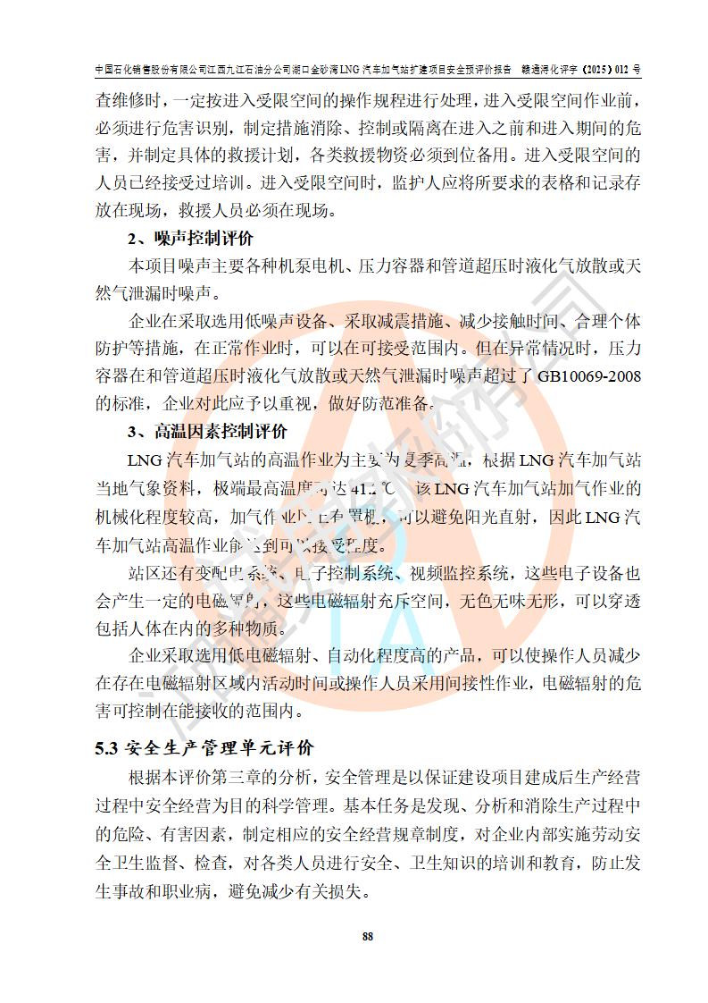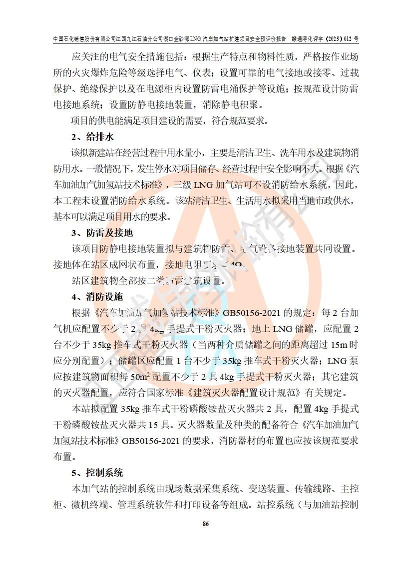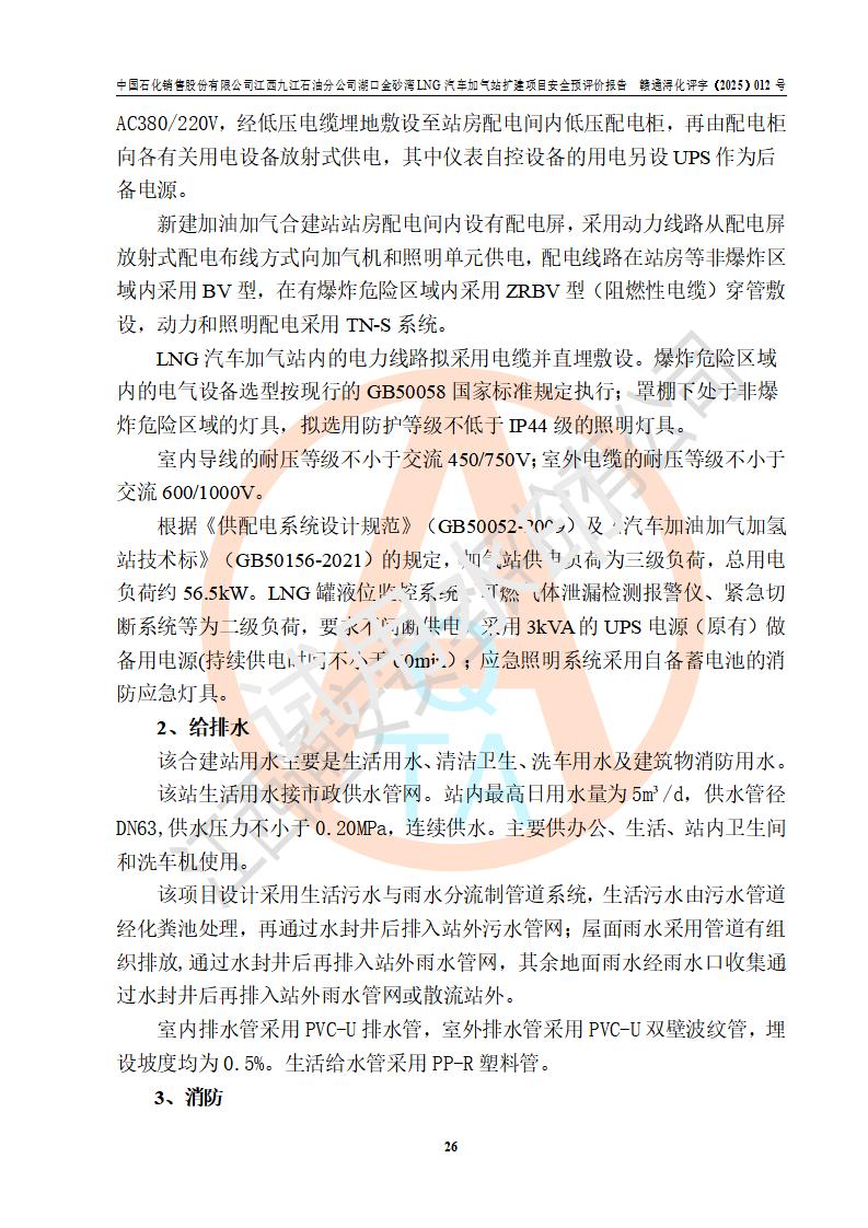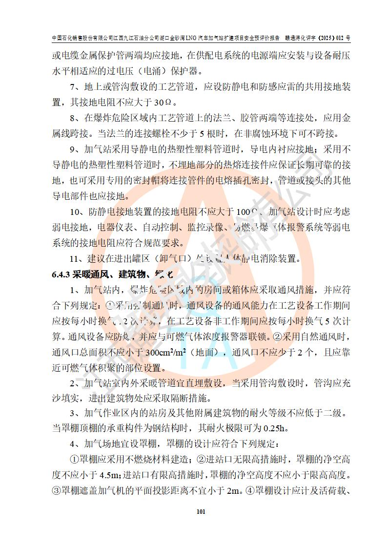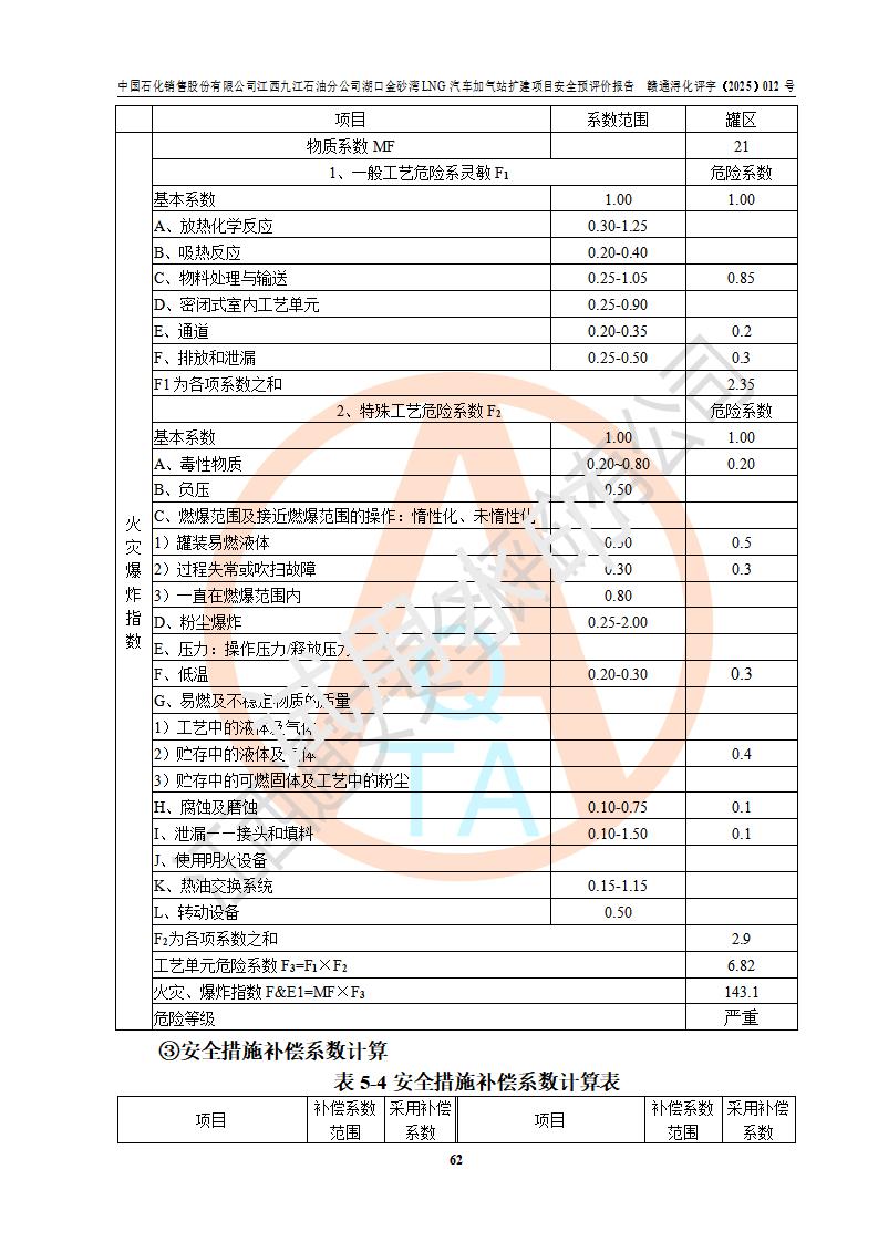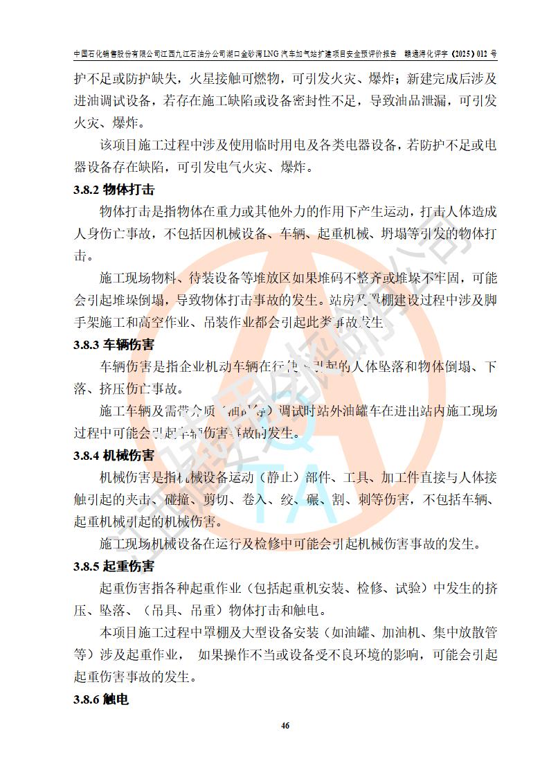 項(xiàng)目簡介 | 中國石化銷售股份有限公司江西九江石油分公司九江市湖口金砂灣LNG汽車加氣站成立于2024年11月12日,經(jīng)營場所為江西省九江市湖口縣金砂灣大道與發(fā)展大道交匯處(金砂灣派出所右側(cè)50米處),法定**人為杜建國,公司類型為臺(tái)、港、澳投資企業(yè)分公司。經(jīng)營范圍:許可項(xiàng)目:食品銷售,煙草制品零售,餐飲服務(wù),燃?xì)饨?jīng)營,出版物零售,道路貨物運(yùn)輸(不含危險(xiǎn)貨物),旅游業(yè)務(wù),**經(jīng)紀(jì)業(yè)務(wù),房地產(chǎn)開發(fā)經(jīng)營,住宿服務(wù),藥品零售,發(fā)電業(yè)務(wù)、輸電業(yè)務(wù)、供(配)電業(yè)務(wù)(依法須經(jīng)批準(zhǔn)的項(xiàng)目,經(jīng)相關(guān)部門批準(zhǔn)后在許可**期內(nèi)方可開展經(jīng)營活動(dòng),具體經(jīng)營項(xiàng)目和許可期限以相關(guān)部門批準(zhǔn)文件或許可證件為準(zhǔn))一般項(xiàng)日:保健食品(預(yù)包裝)銷售,貨物進(jìn)出口,化工產(chǎn)品銷售(不含許可類化工產(chǎn)品),日用百貨銷售,機(jī)械零件、零部件銷售,洗車服務(wù),小微型客車租賃經(jīng)營服務(wù),廣告發(fā)布,廣告設(shè)計(jì)、代理,家用電器銷售,居民日常生活服務(wù),潤滑油銷售,辦公設(shè)備耗材銷售,新能源汽車整車銷售,摩托車及零配件零售,服裝服飾零售,五金產(chǎn)品零售,電子產(chǎn)品銷售,銷售代理,計(jì)算機(jī)軟硬件及鋪助設(shè)備零售,汽車裝飾用品銷售,二手車經(jīng)紀(jì),二手車交易市場經(jīng)營,輪胎銷售,洗燙服務(wù),打字復(fù)印,站用加氫及儲(chǔ)氫設(shè)施銷售,新鮮水果批發(fā),新鮮水果零售,農(nóng)副產(chǎn)品銷售,金屬材料銷售,建筑材料銷售,家具銷售,互聯(lián)網(wǎng)銷售(除銷售需要許可的商品),機(jī)動(dòng)車充電銷售,普通貨物倉儲(chǔ)服務(wù)(不含危險(xiǎn)化學(xué)品等需許可審批的項(xiàng)日),裝卸搬運(yùn),食品銷售(僅銷售預(yù)包裝食品),包裝服務(wù),數(shù)據(jù)處理服務(wù),***纖維及復(fù)合材料銷售,產(chǎn)業(yè)用紡織制成品銷售(除依法須經(jīng)批準(zhǔn)的項(xiàng)目外,憑營業(yè)執(zhí)照依法自主開展經(jīng)營活動(dòng))。 為了滿足湖口縣重卡、牽引車、城際客運(yùn)**等加注LNG燃?xì)廛囉脷庑枨?,該公司根?jù)湖口縣發(fā)展和改革委員會(huì)批復(fù)的《江西省企業(yè)投資項(xiàng)目備案通知書》(項(xiàng)目統(tǒng)一代碼為:2409-360429-04-01-657252)文件,在九江市湖口縣金砂灣大道與發(fā)展大道交匯處金砂灣加油站區(qū)內(nèi)擬投資建設(shè)一座LNG汽車加氣站項(xiàng)目。 湖口金砂灣加油站的建設(shè)用地已取得湖口縣不動(dòng)產(chǎn)登記局頒發(fā)的不動(dòng)產(chǎn)權(quán)證書:贛(2023)湖口縣不動(dòng)產(chǎn)權(quán)第0002564號。 擬擴(kuò)建LNG汽車加氣站總用地面積為5333.73m2,總建筑面積為867.2m2,站區(qū)內(nèi)加氣機(jī)擬設(shè)置為2機(jī)2槍。LNG貯氣區(qū)內(nèi)設(shè)置1個(gè)60m3的LNG儲(chǔ)氣罐、LNG低溫泵撬1套(含雙泵、BOG空溫式加熱器),加氣能力為2×104Nm3/d。按現(xiàn)行《汽車加油加氣加氫站技術(shù)標(biāo)準(zhǔn)》對LNG加氣站的等級劃分,該LNG汽車加氣站屬三級站,與原有建成的三級加油站合建,屬二級加油與LNG加氣合建站。建成后本項(xiàng)目日加氣量可達(dá)2×104Nm3/日。 該二級加油與LNG加氣合建站內(nèi)加氣設(shè)施已于2017年建設(shè)完成,但一直未投入使用?,F(xiàn)因公司市場發(fā)展需要,擬重新啟動(dòng)投入使用。依據(jù)《中華人民共和國安全生產(chǎn)法》、《燃?xì)饨?jīng)營許可管理辦法》、《城鎮(zhèn)燃?xì)夤芾項(xiàng)l例》等法律和規(guī)定的要求,新建、改建、擴(kuò)建危險(xiǎn)化學(xué)品儲(chǔ)存裝置和設(shè)施的建設(shè)項(xiàng)目安全條件審查(審批、核準(zhǔn)、備案)前,建設(shè)單位應(yīng)當(dāng)選擇有資質(zhì)的安全評價(jià)機(jī)構(gòu)對建設(shè)項(xiàng)目進(jìn)行安全條件評價(jià),以**工程項(xiàng)目的安全設(shè)施與主體工程同時(shí)設(shè)計(jì)、同時(shí)施工、同時(shí)投入使用,為**工程項(xiàng)目在安全生產(chǎn)及安全管理方面符合**及行業(yè)有關(guān)法律法規(guī)及標(biāo)準(zhǔn),中國石化銷售股份有限公司江西江西九江石油分公司湖口金砂灣LNG汽車加氣站擴(kuò)建項(xiàng)目委托江西通安安全評價(jià)有限公司承擔(dān)中國石化銷售股份有限公司江西九江石油分公司湖口金砂灣LNG汽車加氣站擴(kuò)建項(xiàng)目的安全預(yù)評價(jià)。該企業(yè)應(yīng)辦理燃?xì)饨?jīng)營許可證。 江西通安安全評價(jià)有限公司接受委托后,成立了評價(jià)組,于2025年2月踏勘了建設(shè)地址。根據(jù)相關(guān)法律、法規(guī)和標(biāo)準(zhǔn)的規(guī)定,按照《安全評價(jià)通則》(AQ8001-2007)、《安全預(yù)評價(jià)導(dǎo)則》(AQ8002-2007)的要求,在資料收集、現(xiàn)場勘探和類比調(diào)查的基礎(chǔ)上,對項(xiàng)目的工程技術(shù)資料進(jìn)行了認(rèn)真分析。建設(shè)項(xiàng)目內(nèi)在的危險(xiǎn)、有害因素對建設(shè)項(xiàng)目周邊單位生產(chǎn)、經(jīng)營活動(dòng)或者居民生活的影響以及建設(shè)項(xiàng)目周邊單位生產(chǎn)、經(jīng)營活動(dòng)或者居民生活對建設(shè)項(xiàng)目