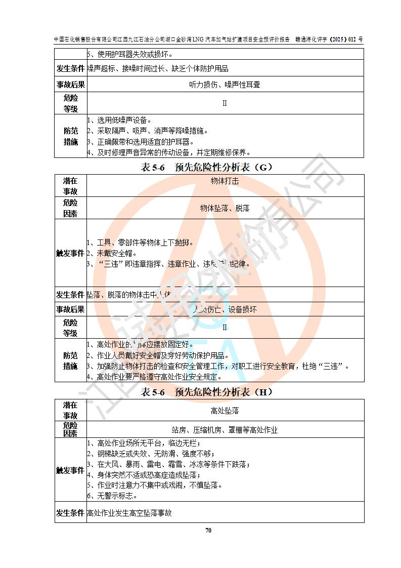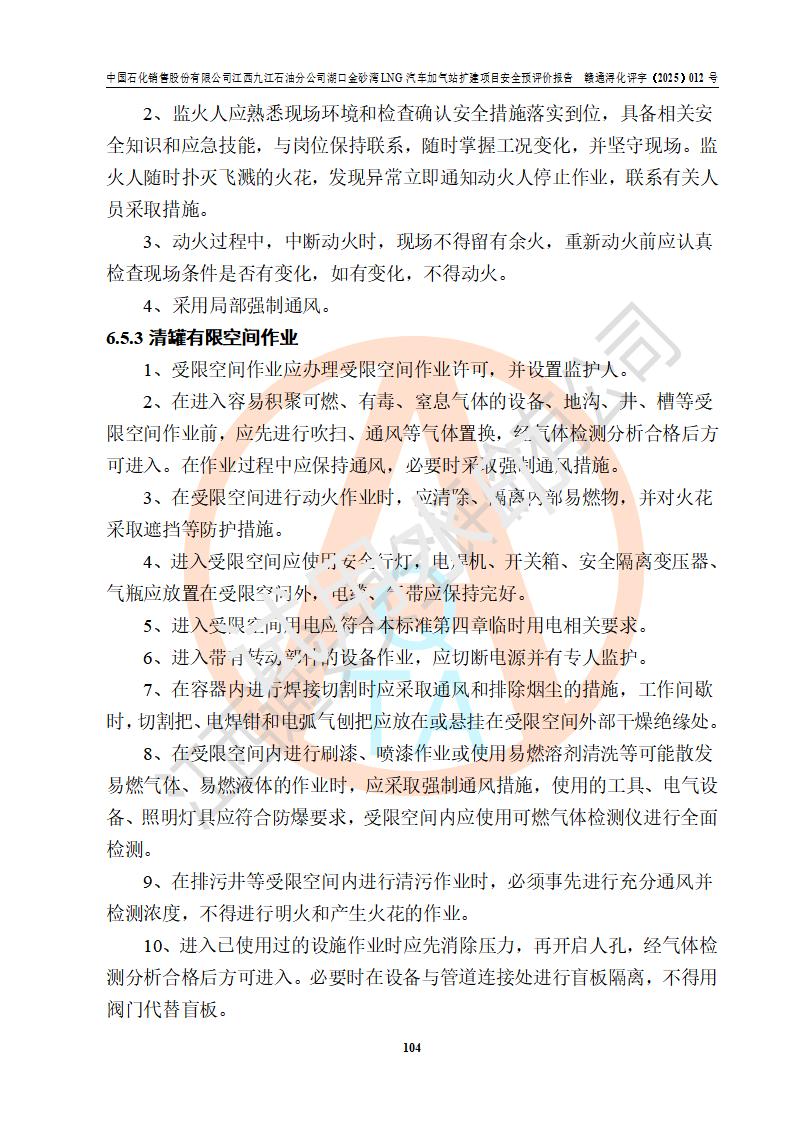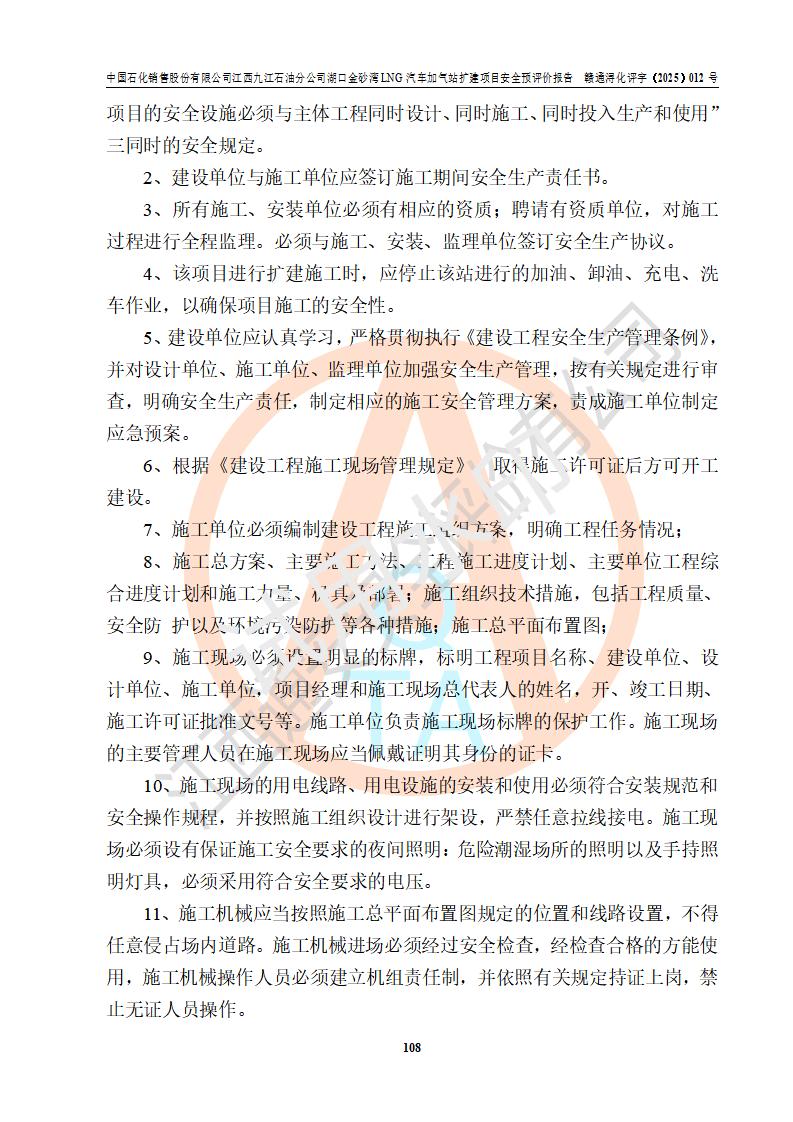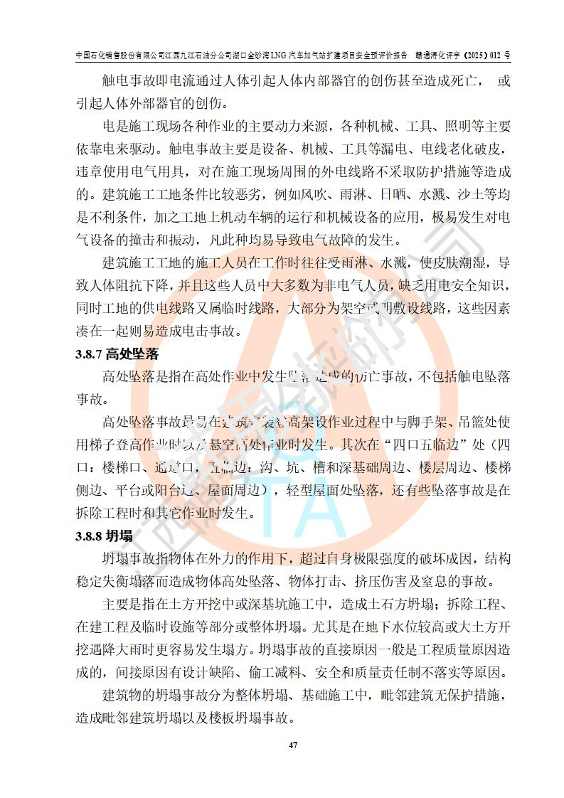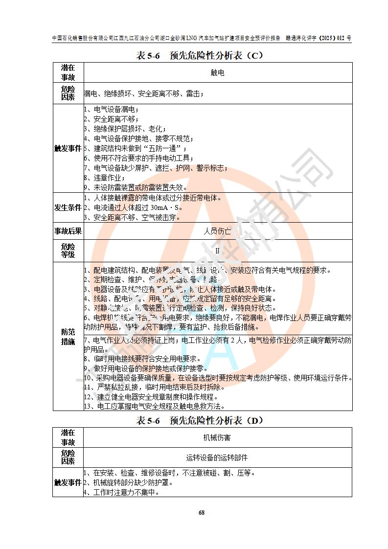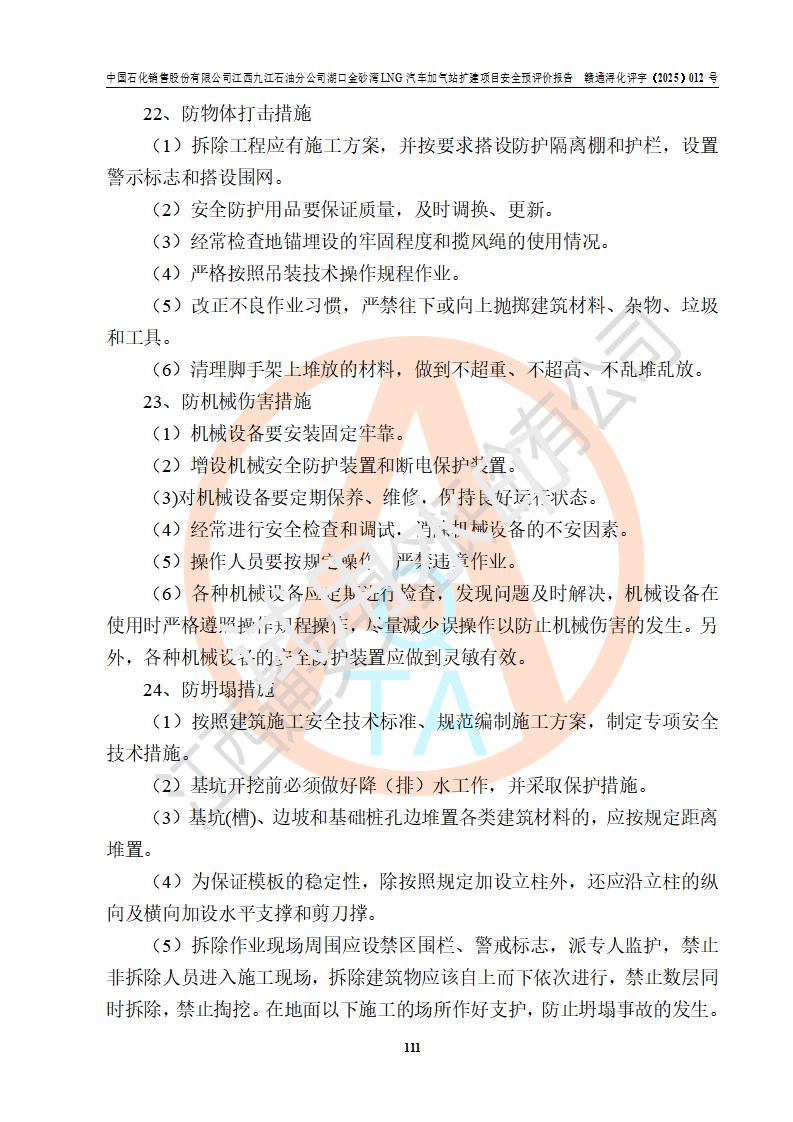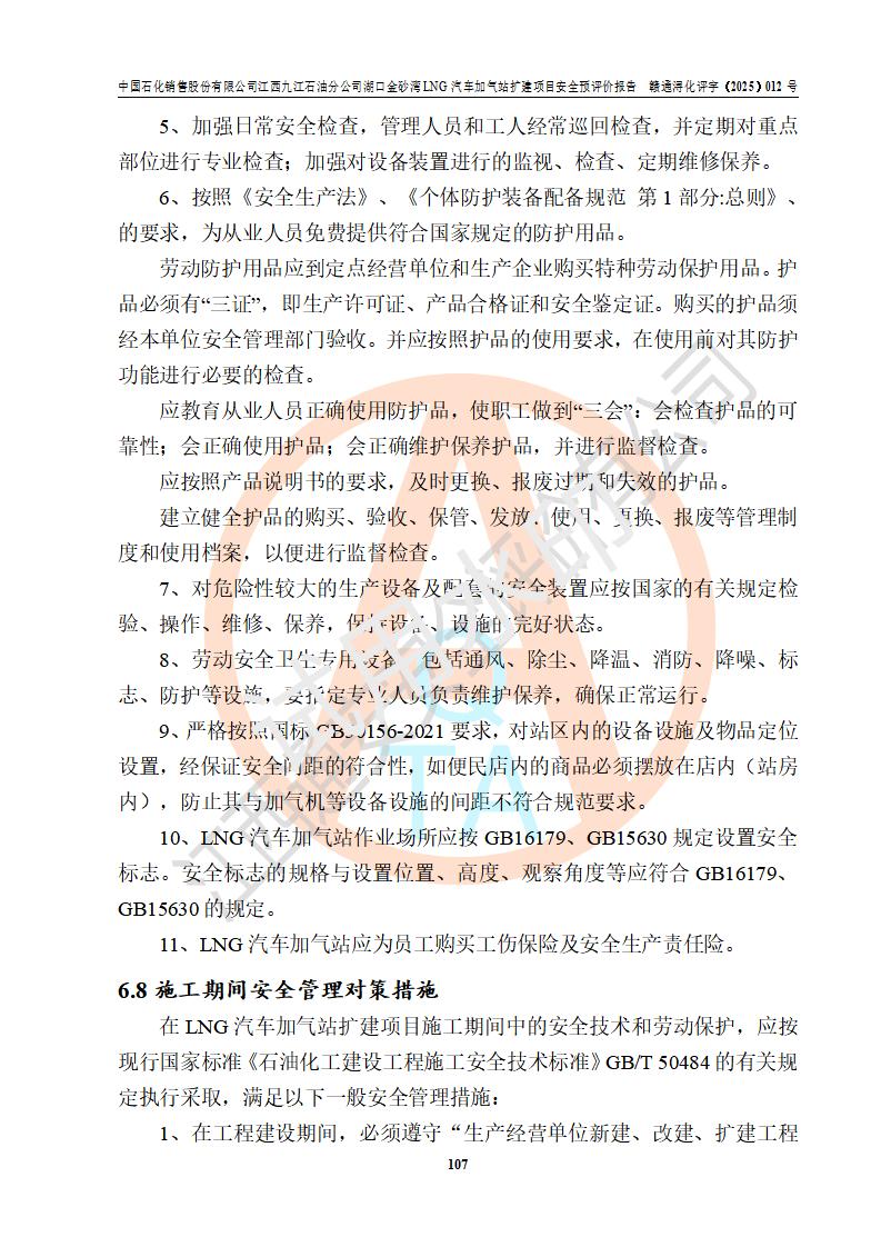 項(xiàng)目簡介 | 中國石化銷售股份有限公司江西九江石油分公司九江市湖口金砂灣LNG汽車加氣站成立于2024年11月12日,經(jīng)營場所為江西省九江市湖口縣金砂灣大道與發(fā)展大道交匯處(金砂灣派出所右側(cè)50米處),法定**人為杜建國,公司類型為臺(tái)、港、澳投資企業(yè)分公司。經(jīng)營范圍:許可項(xiàng)目:食品銷售,煙草制品零售,餐飲服務(wù),燃?xì)饨?jīng)營,出版物零售,道路貨物運(yùn)輸(不含危險(xiǎn)貨物),旅游業(yè)務(wù),**經(jīng)紀(jì)業(yè)務(wù),房地產(chǎn)開發(fā)經(jīng)營,住宿服務(wù),藥品零售,發(fā)電業(yè)務(wù)、輸電業(yè)務(wù)、供(配)電業(yè)務(wù)(依法須經(jīng)批準(zhǔn)的項(xiàng)目,經(jīng)相關(guān)部門批準(zhǔn)后在許可**期內(nèi)方可開展經(jīng)營活動(dòng),具體經(jīng)營項(xiàng)目和許可期限以相關(guān)部門批準(zhǔn)文件或許可證件為準(zhǔn))一般項(xiàng)日:保健食品(預(yù)包裝)銷售,貨物進(jìn)出口,化工產(chǎn)品銷售(不含許可類化工產(chǎn)品),日用百貨銷售,機(jī)械零件、零部件銷售,洗車服務(wù),小微型客車租賃經(jīng)營服務(wù),廣告發(fā)布,廣告設(shè)計(jì)、代理,家用電器銷售,居民日常生活服務(wù),潤滑油銷售,辦公設(shè)備耗材銷售,新能源汽車整車銷售,摩托車及零配件零售,服裝服飾零售,五金產(chǎn)品零售,電子產(chǎn)品銷售,銷售代理,計(jì)算機(jī)軟硬件及鋪助設(shè)備零售,汽車裝飾用品銷售,二手車經(jīng)紀(jì),二手車交易市場經(jīng)營,輪胎銷售,洗燙服務(wù),打字復(fù)印,站用加氫及儲(chǔ)氫設(shè)施銷售,新鮮水果批發(fā),新鮮水果零售,農(nóng)副產(chǎn)品銷售,金屬材料銷售,建筑材料銷售,家具銷售,互聯(lián)網(wǎng)銷售(除銷售需要許可的商品),機(jī)動(dòng)車充電銷售,普通貨物倉儲(chǔ)服務(wù)(不含危險(xiǎn)化學(xué)品等需許可審批的項(xiàng)日),裝卸搬運(yùn),食品銷售(僅銷售預(yù)包裝食品),包裝服務(wù),數(shù)據(jù)處理服務(wù),***纖維及復(fù)合材料銷售,產(chǎn)業(yè)用紡織制成品銷售(除依法須經(jīng)批準(zhǔn)的項(xiàng)目外,憑營業(yè)執(zhí)照依法自主開展經(jīng)營活動(dòng))。 為了滿足湖口縣重卡、牽引車、城際客運(yùn)**等加注LNG燃?xì)廛囉脷庑枨?,該公司根?jù)湖口縣發(fā)展和改革委員會(huì)批復(fù)的《江西省企業(yè)投資項(xiàng)目備案通知書》(項(xiàng)目統(tǒng)一代碼為:2409-360429-04-01-657252)文件,在九江市湖口縣金砂灣大道與發(fā)展大道交匯處金砂灣加油站區(qū)內(nèi)擬投資建設(shè)一座LNG汽車加氣站項(xiàng)目。 湖口金砂灣加油站的建設(shè)用地已取得湖口縣不動(dòng)產(chǎn)登記局頒發(fā)的不動(dòng)產(chǎn)權(quán)證書:贛(2023)湖口縣不動(dòng)產(chǎn)權(quán)第0002564號。 擬擴(kuò)建LNG汽車加氣站總用地面積為5333.73m2,總建筑面積為867.2m2,站區(qū)內(nèi)加氣機(jī)擬設(shè)置為2機(jī)2槍。LNG貯氣區(qū)內(nèi)設(shè)置1個(gè)60m3的LNG儲(chǔ)氣罐、LNG低溫泵撬1套(含雙泵、BOG空溫式加熱器),加氣能力為2×104Nm3/d。按現(xiàn)行《汽車加油加氣加氫站技術(shù)標(biāo)準(zhǔn)》對LNG加氣站的等級劃分,該LNG汽車加氣站屬三級站,與原有建成的三級加油站合建,屬二級加油與LNG加氣合建站。建成后本項(xiàng)目日加氣量可達(dá)2×104Nm3/日。 該二級加油與LNG加氣合建站內(nèi)加氣設(shè)施已于2017年建設(shè)完成,但一直未投入使用?,F(xiàn)因公司市場發(fā)展需要,擬重新啟動(dòng)投入使用。依據(jù)《中華人民共和國安全生產(chǎn)法》、《燃?xì)饨?jīng)營許可管理辦法》、《城鎮(zhèn)燃?xì)夤芾項(xiàng)l例》等法律和規(guī)定的要求,新建、改建、擴(kuò)建危險(xiǎn)化學(xué)品儲(chǔ)存裝置和設(shè)施的建設(shè)項(xiàng)目安全條件審查(審批、核準(zhǔn)、備案)前,建設(shè)單位應(yīng)當(dāng)選擇有資質(zhì)的安全評價(jià)機(jī)構(gòu)對建設(shè)項(xiàng)目進(jìn)行安全條件評價(jià),以**工程項(xiàng)目的安全設(shè)施與主體工程同時(shí)設(shè)計(jì)、同時(shí)施工、同時(shí)投入使用,為**工程項(xiàng)目在安全生產(chǎn)及安全管理方面符合**及行業(yè)有關(guān)法律法規(guī)及標(biāo)準(zhǔn),中國石化銷售股份有限公司江西江西九江石油分公司湖口金砂灣LNG汽車加氣站擴(kuò)建項(xiàng)目委托江西通安安全評價(jià)有限公司承擔(dān)中國石化銷售股份有限公司江西九江石油分公司湖口金砂灣LNG汽車加氣站擴(kuò)建項(xiàng)目的安全預(yù)評價(jià)。該企業(yè)應(yīng)辦理燃?xì)饨?jīng)營許可證。 江西通安安全評價(jià)有限公司接受委托后,成立了評價(jià)組,于2025年2月踏勘了建設(shè)地址。根據(jù)相關(guān)法律、法規(guī)和標(biāo)準(zhǔn)的規(guī)定,按照《安全評價(jià)通則》(AQ8001-2007)、《安全預(yù)評價(jià)導(dǎo)則》(AQ8002-2007)的要求,在資料收集、現(xiàn)場勘探和類比調(diào)查的基礎(chǔ)上,對項(xiàng)目的工程技術(shù)資料進(jìn)行了認(rèn)真分析。建設(shè)項(xiàng)目內(nèi)在的危險(xiǎn)、有害因素對建設(shè)項(xiàng)目周邊單位生產(chǎn)、經(jīng)營活動(dòng)或者居民生活的影響以及建設(shè)項(xiàng)目周邊單位生產(chǎn)、經(jīng)營活動(dòng)或者居民生活對建設(shè)項(xiàng)目