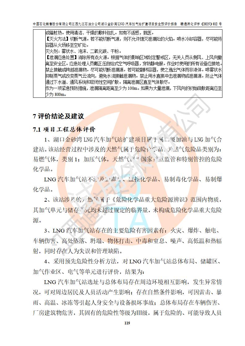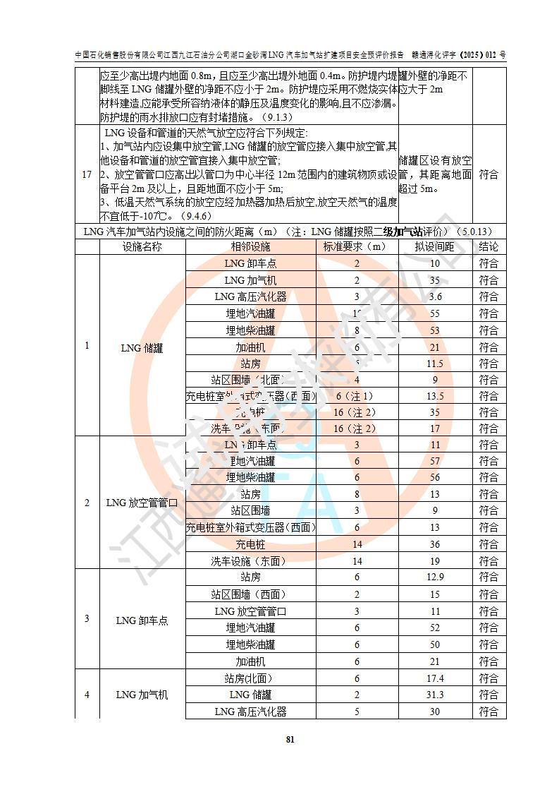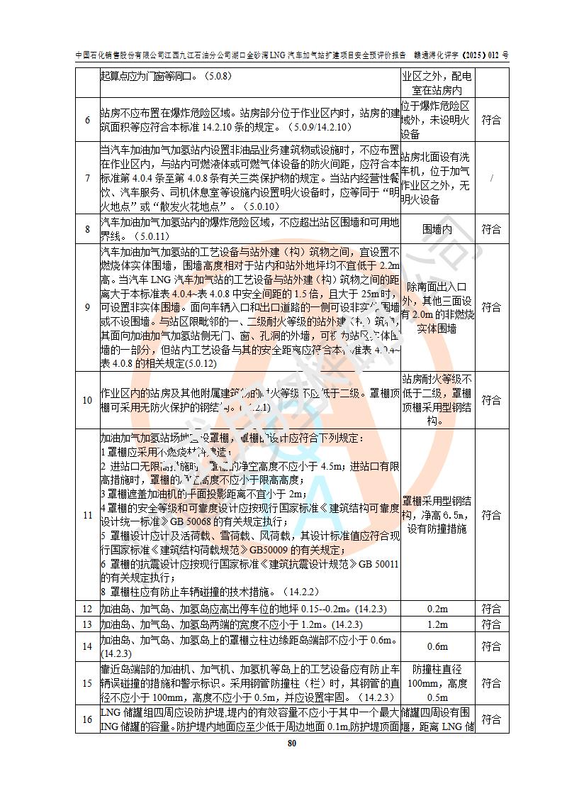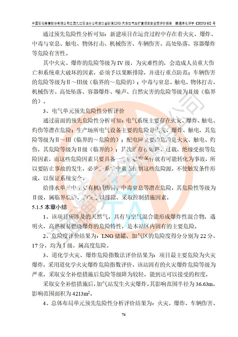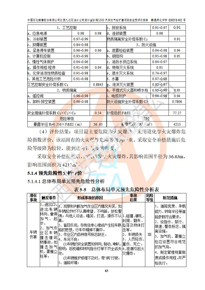 評價(jià)結(jié)論 | 綜上所述:中國石化銷售股份有限公司江西九江石油分公司湖口金砂灣LNG汽車加氣站擴(kuò)建項(xiàng)目的選址、自然條件適宜該項(xiàng)目工程的建設(shè);項(xiàng)目規(guī)劃設(shè)計(jì)中的總體布局方案可行,符合有關(guān)法規(guī)、標(biāo)準(zhǔn)要求;項(xiàng)目選擇的工藝過程及設(shè)備設(shè)施的安全可靠性能達(dá)到**法規(guī)、標(biāo)準(zhǔn)規(guī)定要求;項(xiàng)目存在的危險(xiǎn)有害因素可控,在落實(shí)項(xiàng)目建設(shè)方案及評價(jià)報(bào)告提出的有關(guān)安全對策措施后,其危險(xiǎn)有害程度能達(dá)到可以接受的程度,項(xiàng)目建設(shè)能夠?qū)崿F(xiàn)安全運(yùn)行的目標(biāo)。 | ||||||