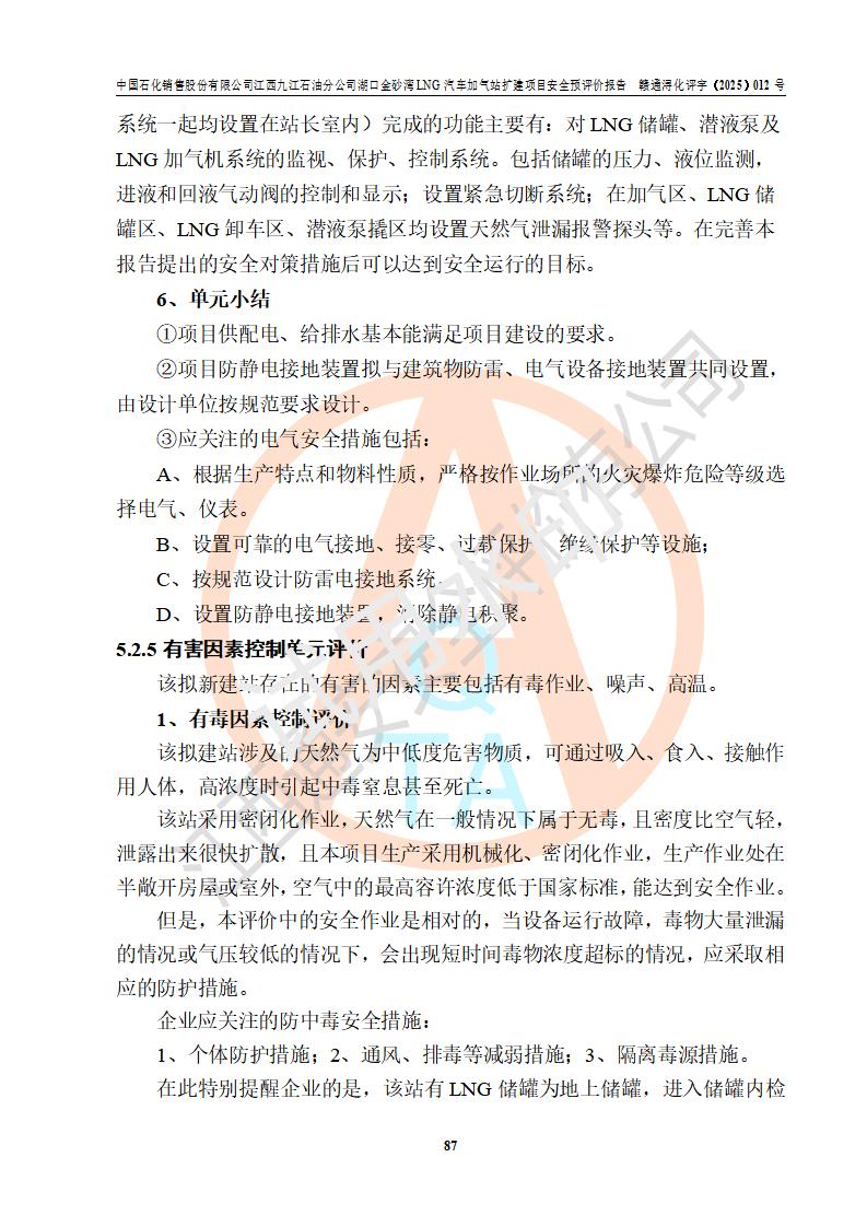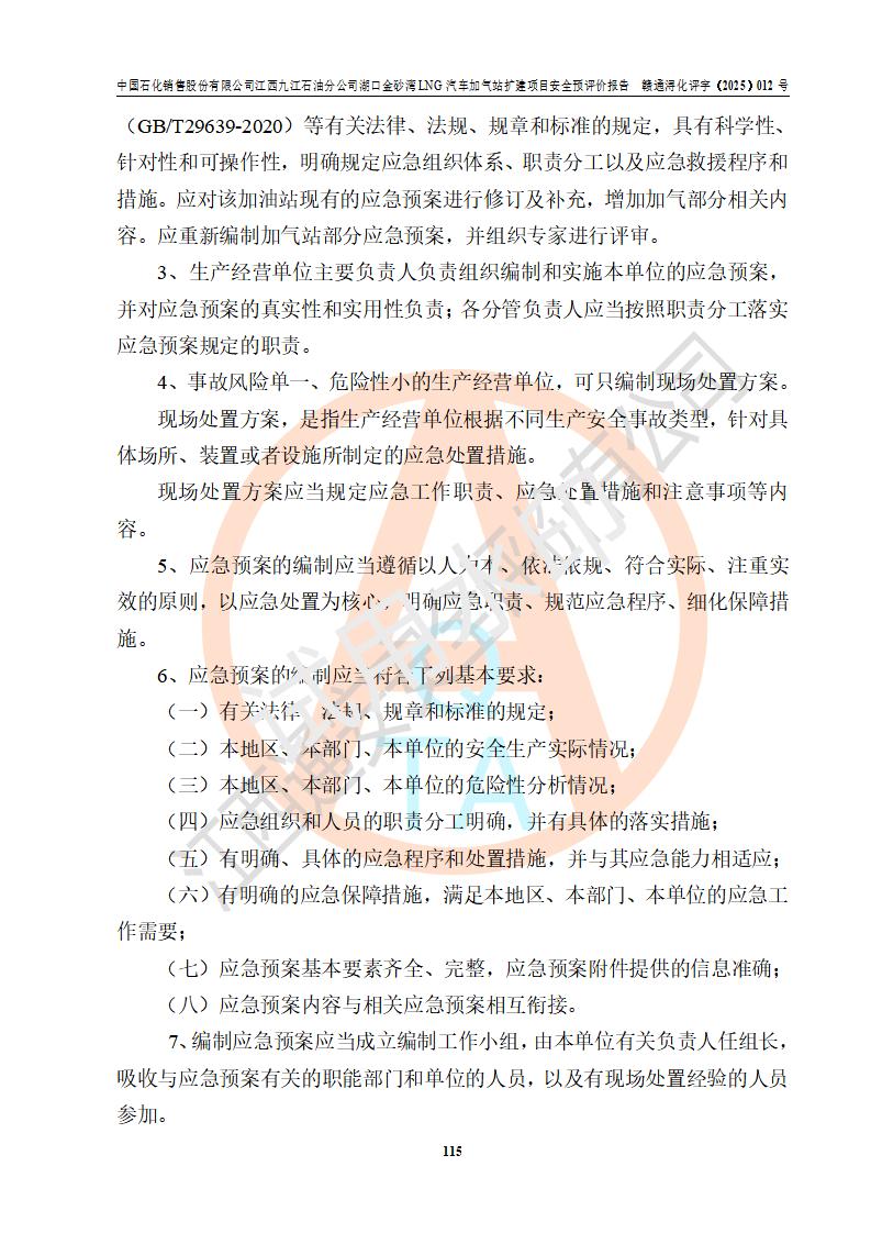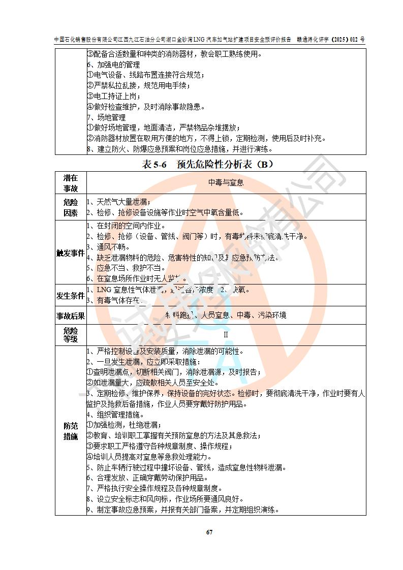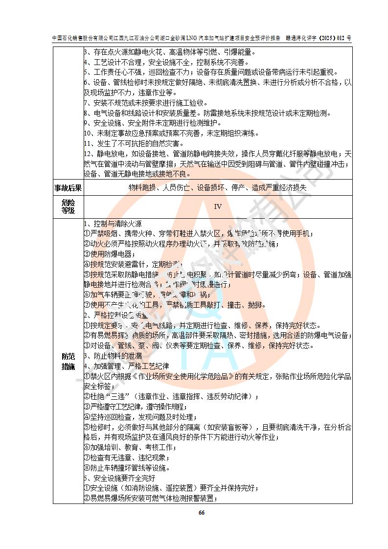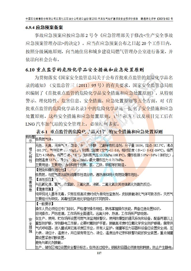 評價(jià)結(jié)論 | 綜上所述:中國石化銷售股份有限公司江西九江石油分公司湖口金砂灣LNG汽車加氣站擴(kuò)建項(xiàng)目的選址、自然條件適宜該項(xiàng)目工程的建設(shè);項(xiàng)目規(guī)劃設(shè)計(jì)中的總體布局方案可行,符合有關(guān)法規(guī)、標(biāo)準(zhǔn)要求;項(xiàng)目選擇的工藝過程及設(shè)備設(shè)施的安全可靠性能達(dá)到**法規(guī)、標(biāo)準(zhǔn)規(guī)定要求;項(xiàng)目存在的危險(xiǎn)有害因素可控,在落實(shí)項(xiàng)目建設(shè)方案及評價(jià)報(bào)告提出的有關(guān)安全對策措施后,其危險(xiǎn)有害程度能達(dá)到可以接受的程度,項(xiàng)目建設(shè)能夠?qū)崿F(xiàn)安全運(yùn)行的目標(biāo)。 | ||||||
