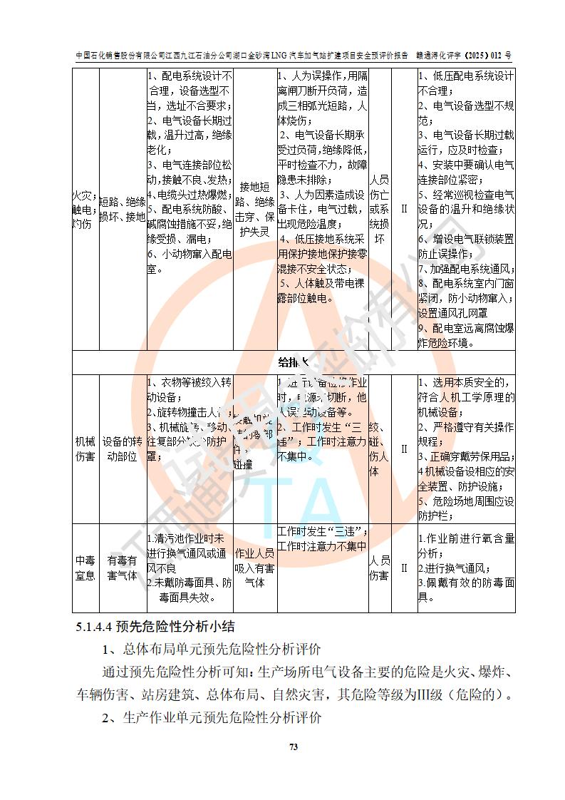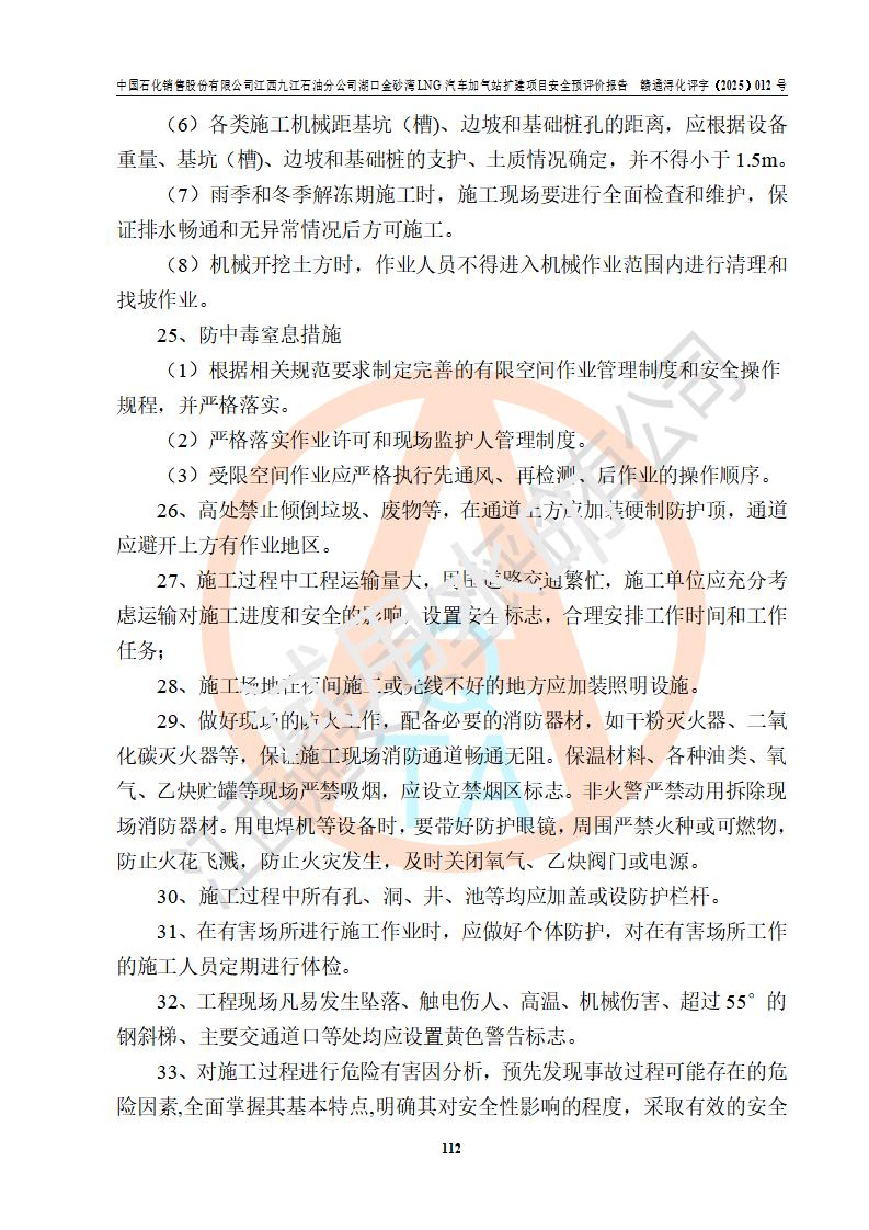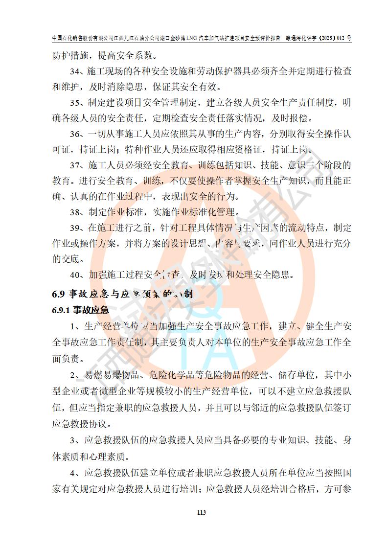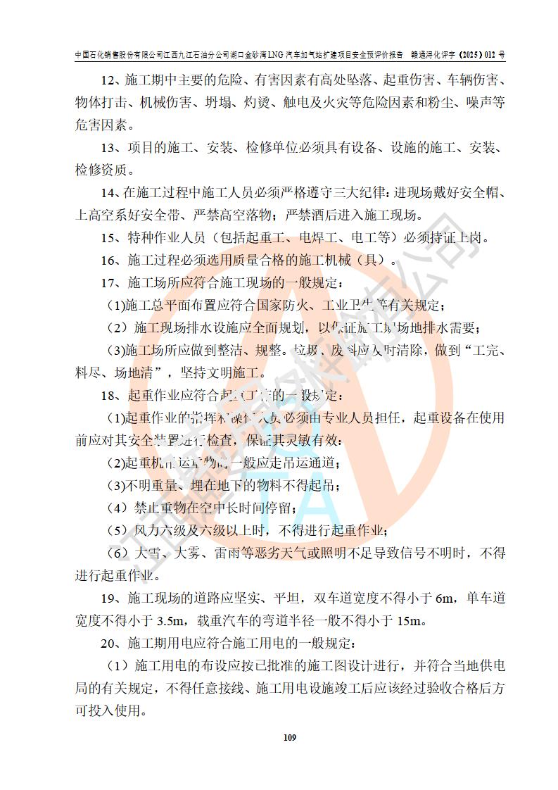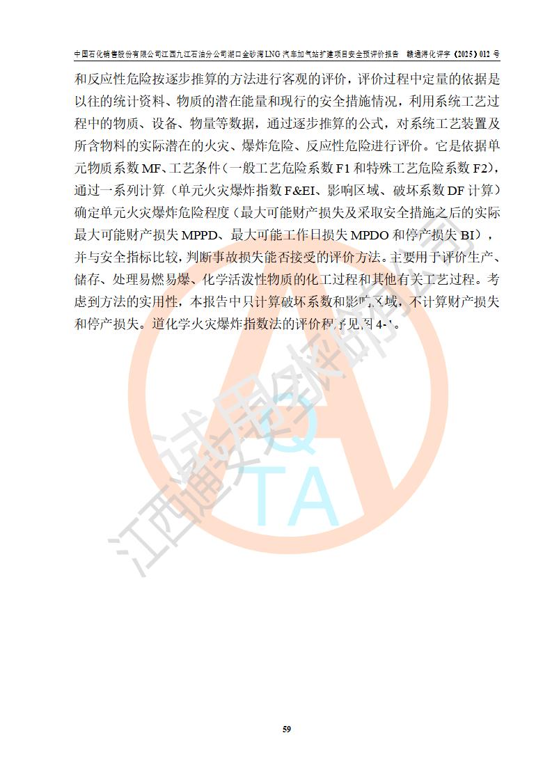 評價(jià)結(jié)論 | 綜上所述:中國石化銷售股份有限公司江西九江石油分公司湖口金砂灣LNG汽車加氣站擴(kuò)建項(xiàng)目的選址、自然條件適宜該項(xiàng)目工程的建設(shè);項(xiàng)目規(guī)劃設(shè)計(jì)中的總體布局方案可行,符合有關(guān)法規(guī)、標(biāo)準(zhǔn)要求;項(xiàng)目選擇的工藝過程及設(shè)備設(shè)施的安全可靠性能達(dá)到**法規(guī)、標(biāo)準(zhǔn)規(guī)定要求;項(xiàng)目存在的危險(xiǎn)有害因素可控,在落實(shí)項(xiàng)目建設(shè)方案及評價(jià)報(bào)告提出的有關(guān)安全對策措施后,其危險(xiǎn)有害程度能達(dá)到可以接受的程度,項(xiàng)目建設(shè)能夠?qū)崿F(xiàn)安全運(yùn)行的目標(biāo)。 | ||||||