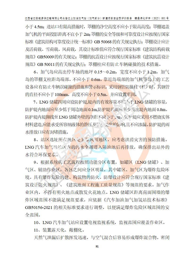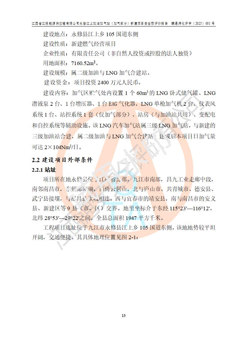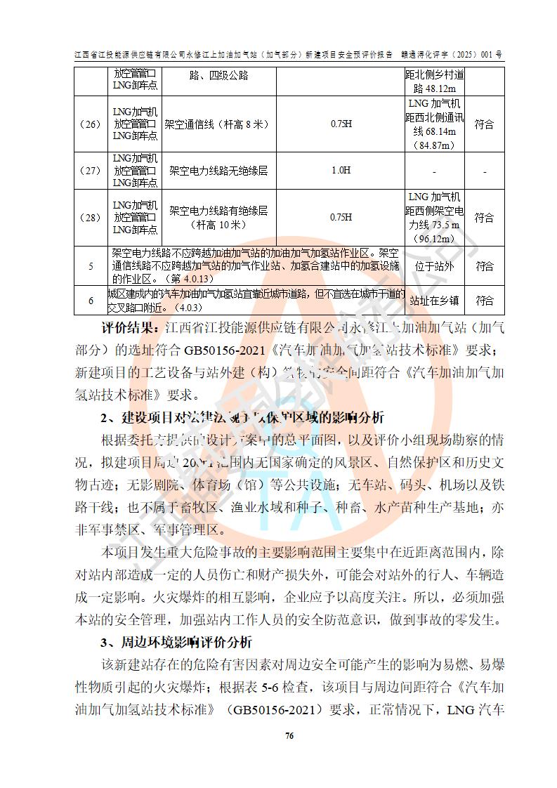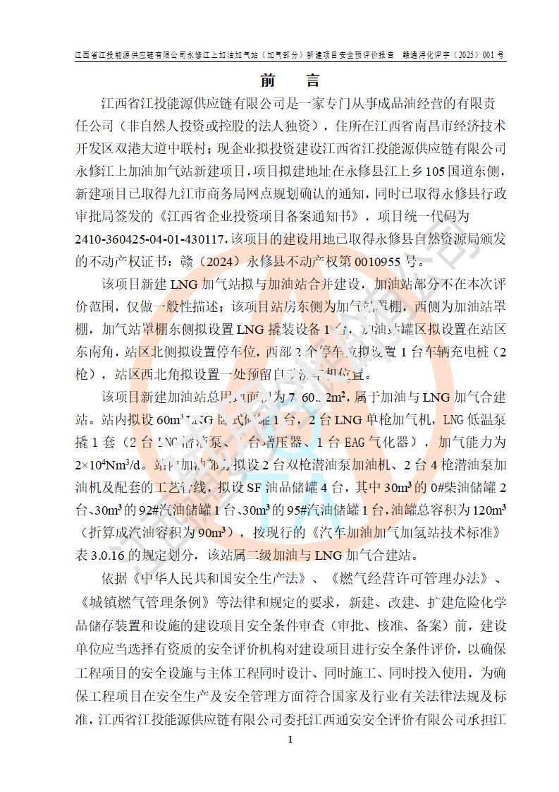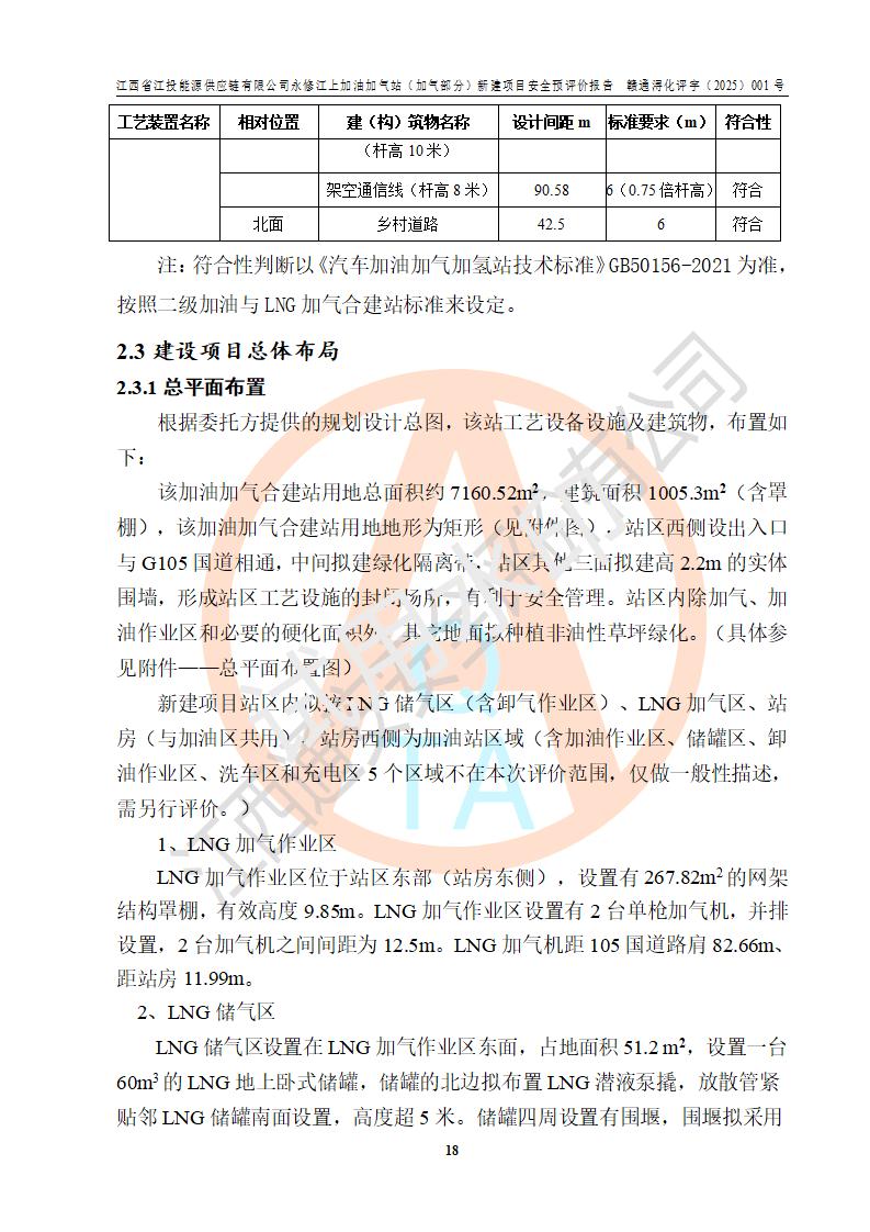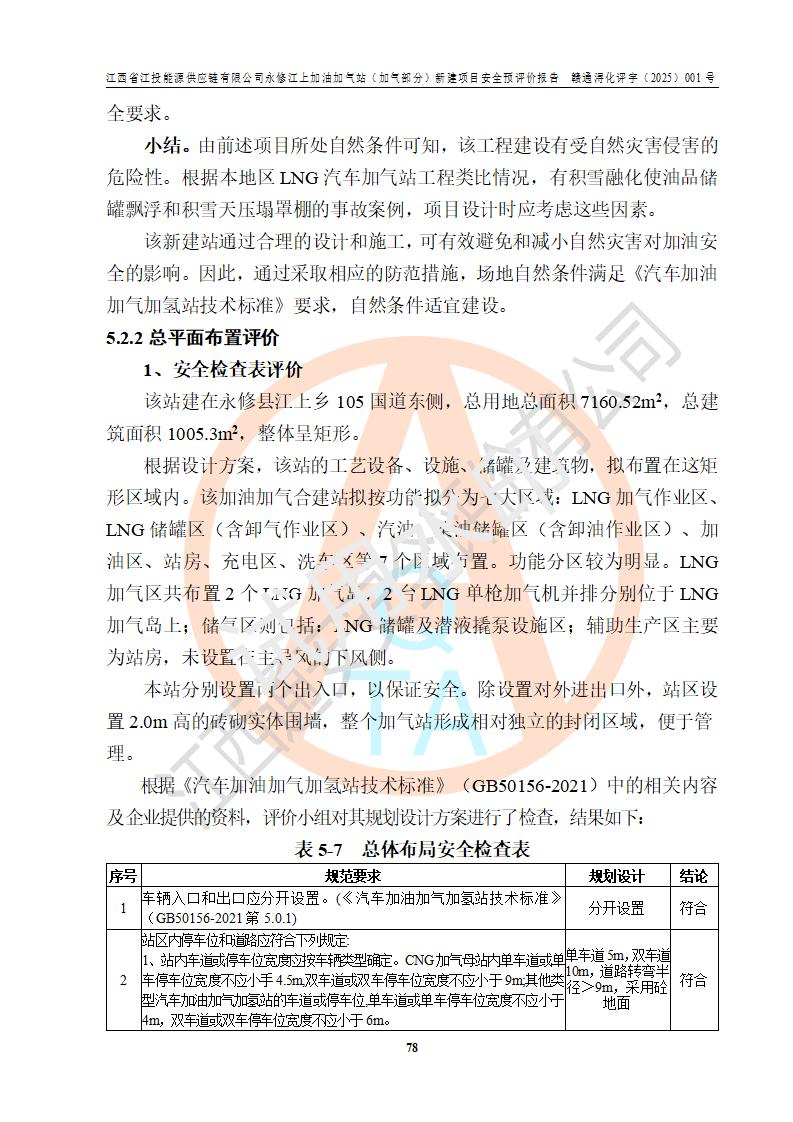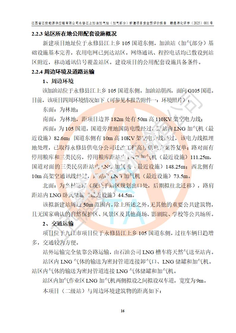 項(xiàng)目簡介 | 江西省江投能源供應(yīng)鏈有限公司是一家專門從事成品油經(jīng)營的有限責(zé)任公司(非自然人投資或控股的法人獨(dú)資),住所在江西省南昌市經(jīng)濟(jì)技術(shù)開發(fā)區(qū)雙港大道中聯(lián)村;現(xiàn)企業(yè)擬投資建設(shè)江西省江投能源供應(yīng)鏈有限公司永修江上加油加氣站新建項(xiàng)目,項(xiàng)目擬建地址在永修縣江上鄉(xiāng)105國道東側(cè),新建項(xiàng)目已取得九江市商務(wù)局網(wǎng)點(diǎn)規(guī)劃確認(rèn)的通知,同時(shí)已取得永修縣行政審批局簽發(fā)的《江西省企業(yè)投資項(xiàng)目備案通知書》,項(xiàng)目統(tǒng)一代碼為2410-360425-04-01-430117,該項(xiàng)目的建設(shè)用地已取得永修縣自然資源局頒發(fā)的不動(dòng)產(chǎn)權(quán)證書:贛(2024)永修縣不動(dòng)產(chǎn)權(quán)第0010955號(hào)。 該項(xiàng)目新建LNG加氣站擬與加油站合并建設(shè),加油站部分不在本次評價(jià)范圍,僅做一般性描述;該項(xiàng)目站房東側(cè)為加氣站罩棚,西側(cè)為加油站罩棚,加氣站罩棚東側(cè)擬設(shè)置LNG撬裝設(shè)備1臺(tái),加油站罐區(qū)擬設(shè)置在站區(qū)東南角,站區(qū)北側(cè)擬設(shè)置停車位,西部2個(gè)停車位擬設(shè)置1臺(tái)**充電樁(2槍),站區(qū)西北角擬設(shè)置一處預(yù)留自動(dòng)洗車機(jī)位置。 該項(xiàng)目新建加油站總用地面積為7160.52m2,屬于加油與LNG加氣合建站。站內(nèi)擬設(shè)60m3LNG臥式儲(chǔ)罐1臺(tái),2臺(tái)LNG單槍加氣機(jī),LNG低溫泵撬1套(2臺(tái)LNG潛液泵、1臺(tái)增壓器、1臺(tái)EAG氣化器),加氣能力為2×104Nm3/d。站內(nèi)加油部分?jǐn)M設(shè)2臺(tái)雙槍潛油泵加油機(jī)、2臺(tái)4槍潛油泵加油機(jī)及配套的工藝管線,擬設(shè)SF油品儲(chǔ)罐4臺(tái),其中30m3的0#柴油儲(chǔ)罐2臺(tái)、30m3的92#汽油儲(chǔ)罐1臺(tái)、30m3的95#汽油儲(chǔ)罐1臺(tái),油罐總?cè)莘e為120m3(折算成汽油容積為90m3),按現(xiàn)行的《汽車加油加氣加氫站技術(shù)標(biāo)準(zhǔn)》表3.0.16的規(guī)定劃分,該站屬二級(jí)加油與LNG加氣合建站。 依據(jù)《中華人民共和國安全生產(chǎn)法》、《燃?xì)饨?jīng)營許可管理辦法》、《城鎮(zhèn)燃?xì)夤芾項(xiàng)l例》等法律和規(guī)定的要求,新建、改建、擴(kuò)建危險(xiǎn)化學(xué)品儲(chǔ)存裝置和設(shè)施的建設(shè)項(xiàng)目安全條件審查(審批、核準(zhǔn)、備案)前,建設(shè)單位應(yīng)當(dāng)選擇有資質(zhì)的安全評價(jià)機(jī)構(gòu)對建設(shè)項(xiàng)目進(jìn)行安全條件評價(jià),以**工程項(xiàng)目的安全設(shè)施與主體工程同時(shí)設(shè)計(jì)、同時(shí)施工、同時(shí)投入使用,為**工程項(xiàng)目在安全生產(chǎn)及安全管理方面符合**及行業(yè)有關(guān)法律法規(guī)及標(biāo)準(zhǔn),江西省江投能源供應(yīng)鏈有限公司委托江西通安安全評價(jià)有限公司承擔(dān)江西省江投能源供應(yīng)鏈有限公司永修江上加油加氣站(加氣部分)新建項(xiàng)目的安全預(yù)評價(jià)。依據(jù)**的相關(guān)法律、法規(guī)及標(biāo)準(zhǔn),該企業(yè)應(yīng)辦理燃?xì)饨?jīng)營許可證。 江西通安安全評價(jià)有限公司接受委托后,成立了評價(jià)組,于2025年2月踏勘了建設(shè)地址。根據(jù)相關(guān)法律、法規(guī)和標(biāo)準(zhǔn)的規(guī)定,按照《安全評價(jià)通則》(AQ8001-2007)、《安全預(yù)評價(jià)導(dǎo)則》(AQ8002-2007)的要求,在資料收集、現(xiàn)場勘探和類比調(diào)查的基礎(chǔ)上,對項(xiàng)目的工程技術(shù)資料進(jìn)行了認(rèn)真分析。建設(shè)項(xiàng)目內(nèi)在的危險(xiǎn)、有害因素對建設(shè)項(xiàng)目周邊單位生產(chǎn)、經(jīng)營活動(dòng)或者居民生活的影響以及建設(shè)項(xiàng)目周邊單位生產(chǎn)、經(jīng)營活動(dòng)或者居民生活對建設(shè)項(xiàng)目的影響等,經(jīng)過定性分析與定量計(jì)算,編制完成了本建設(shè)項(xiàng)目安全預(yù)評價(jià)報(bào)告,為相關(guān)部門實(shí)行安全監(jiān)察、為**相關(guān)部門建設(shè)項(xiàng)目設(shè)立安全審查以及為企業(yè)建設(shè)項(xiàng)目實(shí)施“三同時(shí)”提供安全技術(shù)依據(jù)。 本次安全評價(jià)范圍:江西省江投能源供應(yīng)鏈有限公司永修江上加油加氣站(加氣部分)新建項(xiàng)目的選址、總平面布置、主體裝置和輔助設(shè)施的安全條件,包括經(jīng)營過程中的危險(xiǎn)和危害因素、建設(shè)項(xiàng)目的安全條件以及規(guī)劃設(shè)計(jì)中提出的工藝、設(shè)備設(shè)施的安全可靠性和勞動(dòng)安全管理方面的組織、機(jī)構(gòu)、人員、防護(hù)設(shè)施、作業(yè)環(huán)境及管理制度等。 該項(xiàng)目新建LNG加氣站擬與加油站合并建設(shè),加油站油罐區(qū)、加油區(qū)、充電樁、洗車機(jī)部分不在本次評價(jià)范圍,僅進(jìn)行加油站對LNG加氣站的影響進(jìn)行評價(jià),僅作一般性描述。該新建項(xiàng)目的公用工程、自控系統(tǒng)共用,涉及工程的環(huán)境、消防及職業(yè)衛(wèi)生等問題則應(yīng)執(zhí)行**的有關(guān)規(guī)定及相關(guān)標(biāo)準(zhǔn)。 | ||||||
