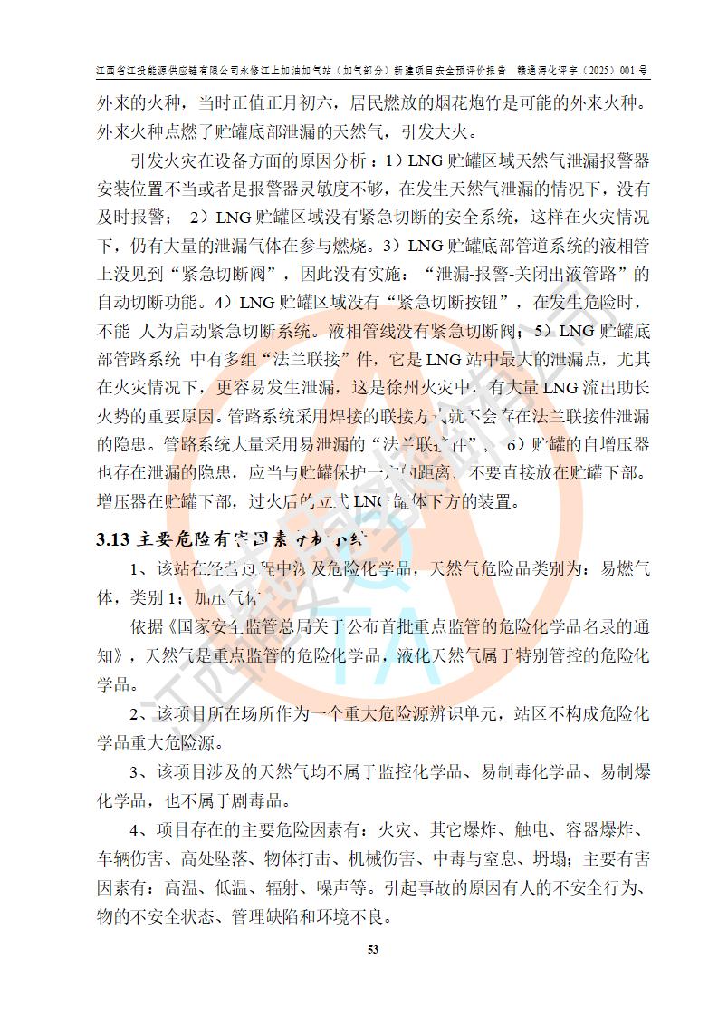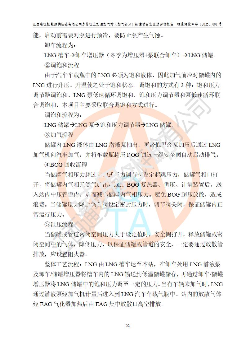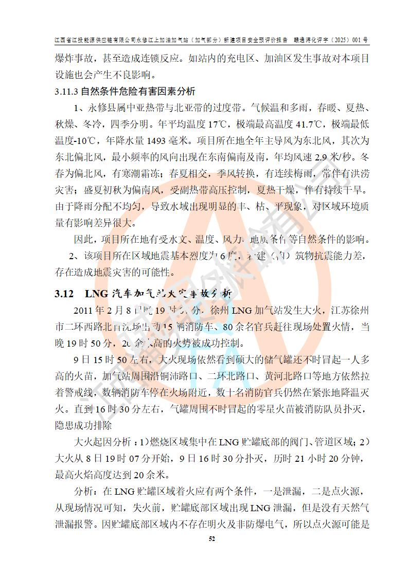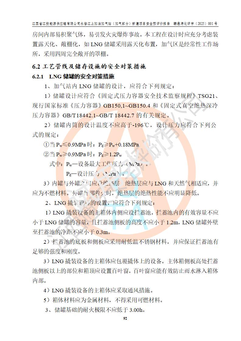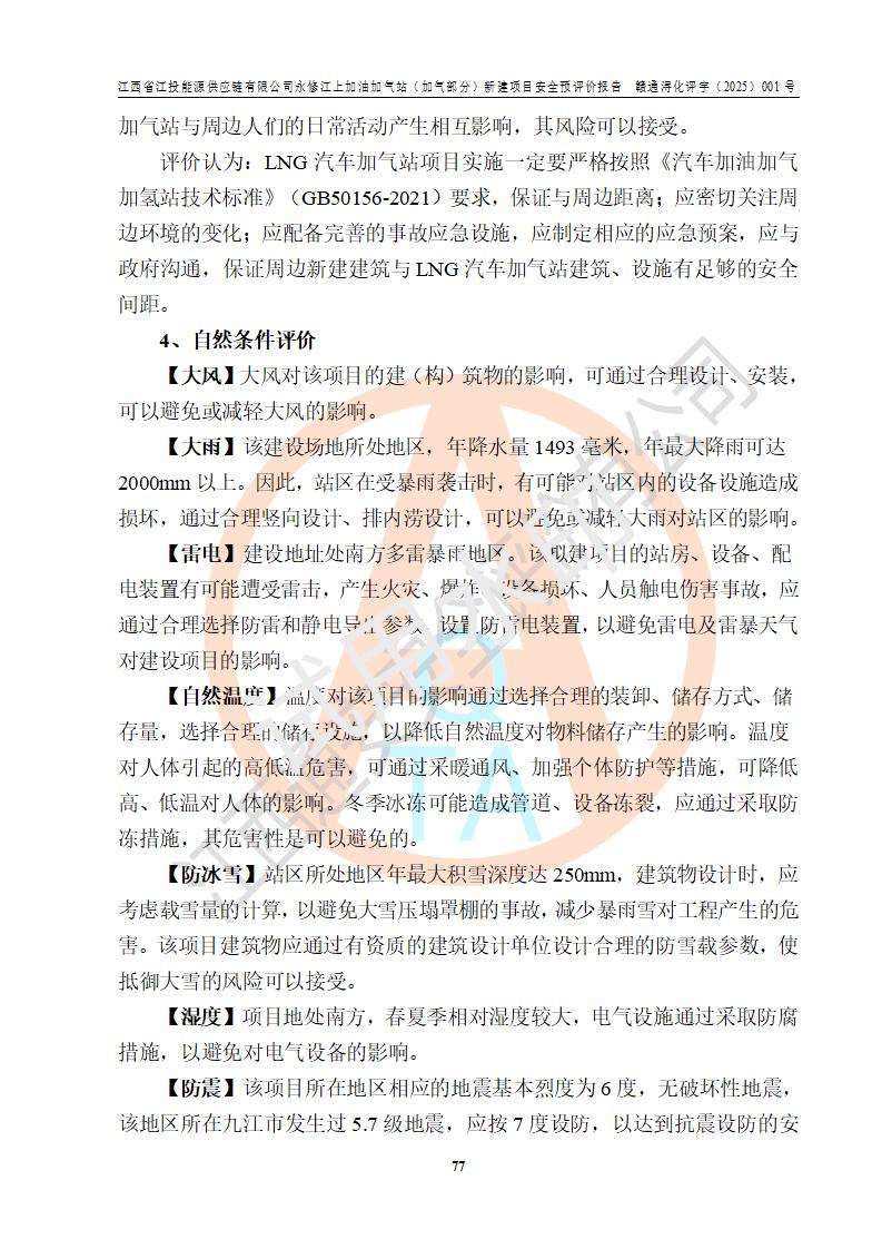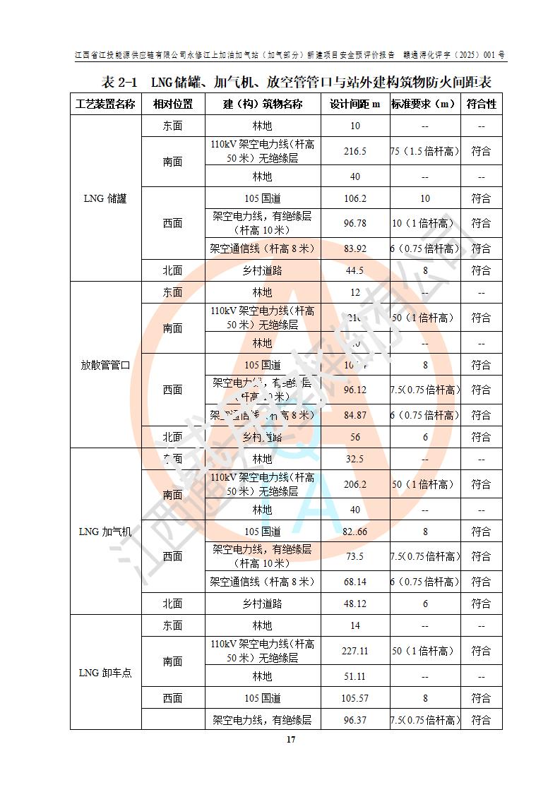 項(xiàng)目簡介 | 江西省江投能源供應(yīng)鏈有限公司是一家專門從事成品油經(jīng)營的有限責(zé)任公司(非自然人投資或控股的法人獨(dú)資),住所在江西省南昌市經(jīng)濟(jì)技術(shù)開發(fā)區(qū)雙港大道中聯(lián)村;現(xiàn)企業(yè)擬投資建設(shè)江西省江投能源供應(yīng)鏈有限公司永修江上加油加氣站新建項(xiàng)目,項(xiàng)目擬建地址在永修縣江上鄉(xiāng)105國道東側(cè),新建項(xiàng)目已取得九江市商務(wù)局網(wǎng)點(diǎn)規(guī)劃確認(rèn)的通知,同時(shí)已取得永修縣行政審批局簽發(fā)的《江西省企業(yè)投資項(xiàng)目備案通知書》,項(xiàng)目統(tǒng)一代碼為2410-360425-04-01-430117,該項(xiàng)目的建設(shè)用地已取得永修縣自然資源局頒發(fā)的不動(dòng)產(chǎn)權(quán)證書:贛(2024)永修縣不動(dòng)產(chǎn)權(quán)第0010955號(hào)。 該項(xiàng)目新建LNG加氣站擬與加油站合并建設(shè),加油站部分不在本次評價(jià)范圍,僅做一般性描述;該項(xiàng)目站房東側(cè)為加氣站罩棚,西側(cè)為加油站罩棚,加氣站罩棚東側(cè)擬設(shè)置LNG撬裝設(shè)備1臺(tái),加油站罐區(qū)擬設(shè)置在站區(qū)東南角,站區(qū)北側(cè)擬設(shè)置停車位,西部2個(gè)停車位擬設(shè)置1臺(tái)**充電樁(2槍),站區(qū)西北角擬設(shè)置一處預(yù)留自動(dòng)洗車機(jī)位置。 該項(xiàng)目新建加油站總用地面積為7160.52m2,屬于加油與LNG加氣合建站。站內(nèi)擬設(shè)60m3LNG臥式儲(chǔ)罐1臺(tái),2臺(tái)LNG單槍加氣機(jī),LNG低溫泵撬1套(2臺(tái)LNG潛液泵、1臺(tái)增壓器、1臺(tái)EAG氣化器),加氣能力為2×104Nm3/d。站內(nèi)加油部分?jǐn)M設(shè)2臺(tái)雙槍潛油泵加油機(jī)、2臺(tái)4槍潛油泵加油機(jī)及配套的工藝管線,擬設(shè)SF油品儲(chǔ)罐4臺(tái),其中30m3的0#柴油儲(chǔ)罐2臺(tái)、30m3的92#汽油儲(chǔ)罐1臺(tái)、30m3的95#汽油儲(chǔ)罐1臺(tái),油罐總?cè)莘e為120m3(折算成汽油容積為90m3),按現(xiàn)行的《汽車加油加氣加氫站技術(shù)標(biāo)準(zhǔn)》表3.0.16的規(guī)定劃分,該站屬二級(jí)加油與LNG加氣合建站。 依據(jù)《中華人民共和國安全生產(chǎn)法》、《燃?xì)饨?jīng)營許可管理辦法》、《城鎮(zhèn)燃?xì)夤芾項(xiàng)l例》等法律和規(guī)定的要求,新建、改建、擴(kuò)建危險(xiǎn)化學(xué)品儲(chǔ)存裝置和設(shè)施的建設(shè)項(xiàng)目安全條件審查(審批、核準(zhǔn)、備案)前,建設(shè)單位應(yīng)當(dāng)選擇有資質(zhì)的安全評價(jià)機(jī)構(gòu)對建設(shè)項(xiàng)目進(jìn)行安全條件評價(jià),以**工程項(xiàng)目的安全設(shè)施與主體工程同時(shí)設(shè)計(jì)、同時(shí)施工、同時(shí)投入使用,為**工程項(xiàng)目在安全生產(chǎn)及安全管理方面符合**及行業(yè)有關(guān)法律法規(guī)及標(biāo)準(zhǔn),江西省江投能源供應(yīng)鏈有限公司委托江西通安安全評價(jià)有限公司承擔(dān)江西省江投能源供應(yīng)鏈有限公司永修江上加油加氣站(加氣部分)新建項(xiàng)目的安全預(yù)評價(jià)。依據(jù)**的相關(guān)法律、法規(guī)及標(biāo)準(zhǔn),該企業(yè)應(yīng)辦理燃?xì)饨?jīng)營許可證。 江西通安安全評價(jià)有限公司接受委托后,成立了評價(jià)組,于2025年2月踏勘了建設(shè)地址。根據(jù)相關(guān)法律、法規(guī)和標(biāo)準(zhǔn)的規(guī)定,按照《安全評價(jià)通則》(AQ8001-2007)、《安全預(yù)評價(jià)導(dǎo)則》(AQ8002-2007)的要求,在資料收集、現(xiàn)場勘探和類比調(diào)查的基礎(chǔ)上,對項(xiàng)目的工程技術(shù)資料進(jìn)行了認(rèn)真分析。建設(shè)項(xiàng)目內(nèi)在的危險(xiǎn)、有害因素對建設(shè)項(xiàng)目周邊單位生產(chǎn)、經(jīng)營活動(dòng)或者居民生活的影響以及建設(shè)項(xiàng)目周邊單位生產(chǎn)、經(jīng)營活動(dòng)或者居民生活對建設(shè)項(xiàng)目的影響等,經(jīng)過定性分析與定量計(jì)算,編制完成了本建設(shè)項(xiàng)目安全預(yù)評價(jià)報(bào)告,為相關(guān)部門實(shí)行安全監(jiān)察、為**相關(guān)部門建設(shè)項(xiàng)目設(shè)立安全審查以及為企業(yè)建設(shè)項(xiàng)目實(shí)施“三同時(shí)”提供安全技術(shù)依據(jù)。 本次安全評價(jià)范圍:江西省江投能源供應(yīng)鏈有限公司永修江上加油加氣站(加氣部分)新建項(xiàng)目的選址、總平面布置、主體裝置和輔助設(shè)施的安全條件,包括經(jīng)營過程中的危險(xiǎn)和危害因素、建設(shè)項(xiàng)目的安全條件以及規(guī)劃設(shè)計(jì)中提出的工藝、設(shè)備設(shè)施的安全可靠性和勞動(dòng)安全管理方面的組織、機(jī)構(gòu)、人員、防護(hù)設(shè)施、作業(yè)環(huán)境及管理制度等。 該項(xiàng)目新建LNG加氣站擬與加油站合并建設(shè),加油站油罐區(qū)、加油區(qū)、充電樁、洗車機(jī)部分不在本次評價(jià)范圍,僅進(jìn)行加油站對LNG加氣站的影響進(jìn)行評價(jià),僅作一般性描述。該新建項(xiàng)目的公用工程、自控系統(tǒng)共用,涉及工程的環(huán)境、消防及職業(yè)衛(wèi)生等問題則應(yīng)執(zhí)行**的有關(guān)規(guī)定及相關(guān)標(biāo)準(zhǔn)。 | ||||||