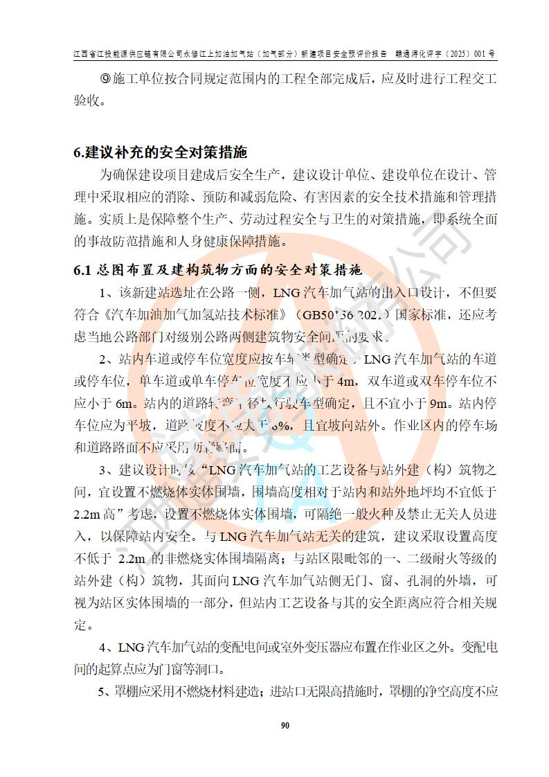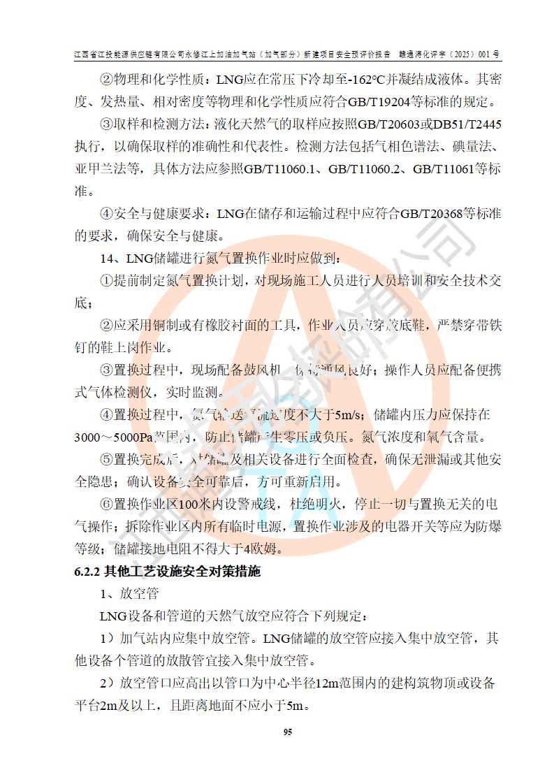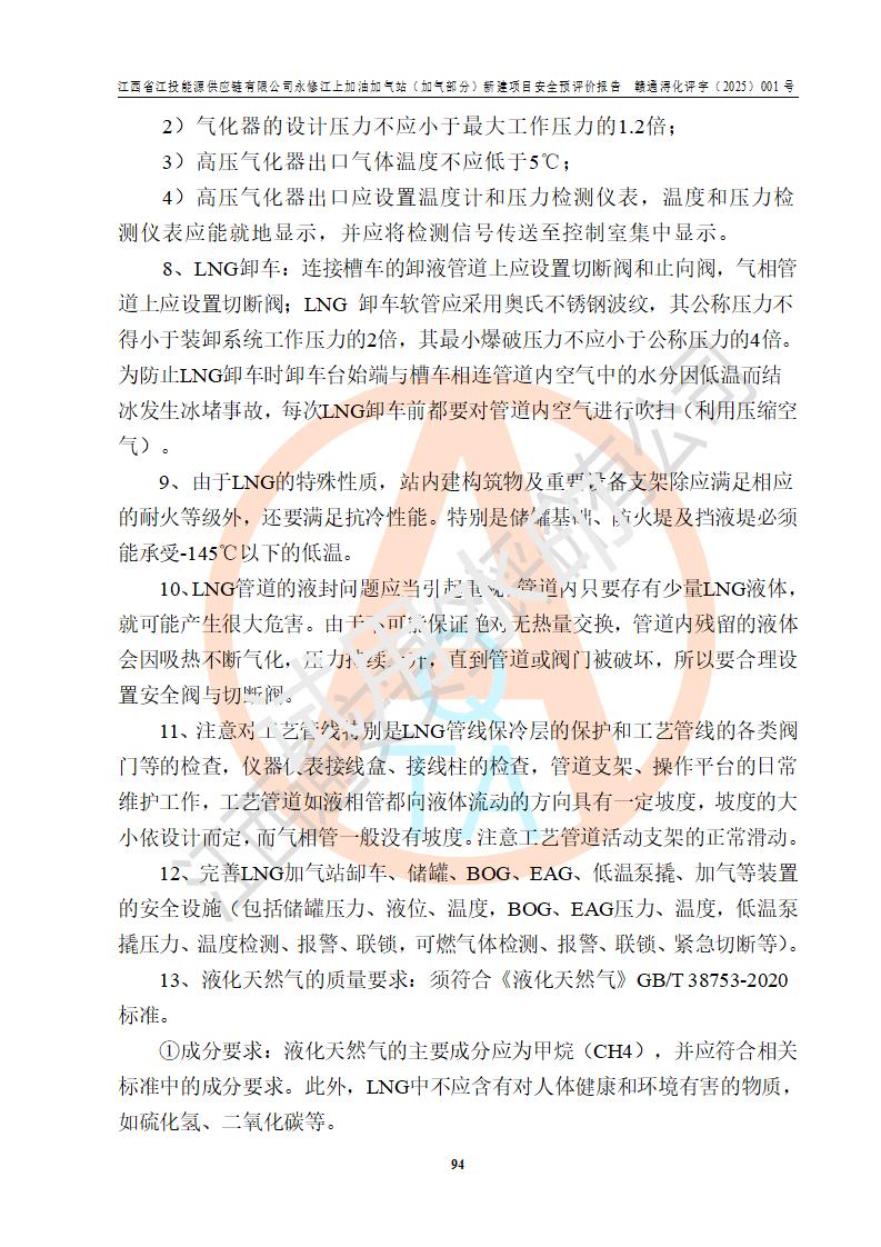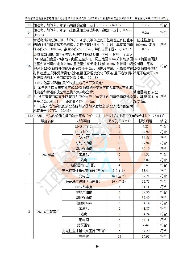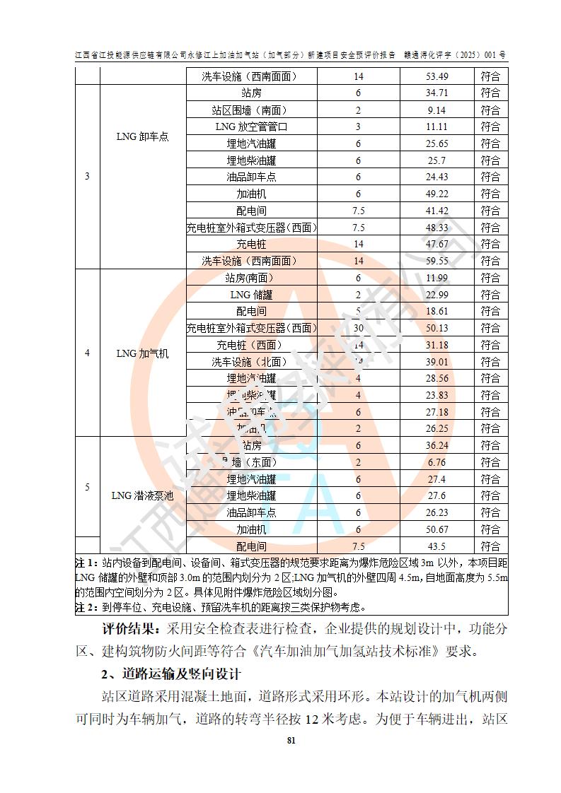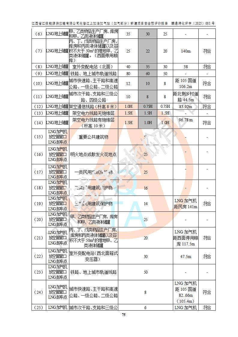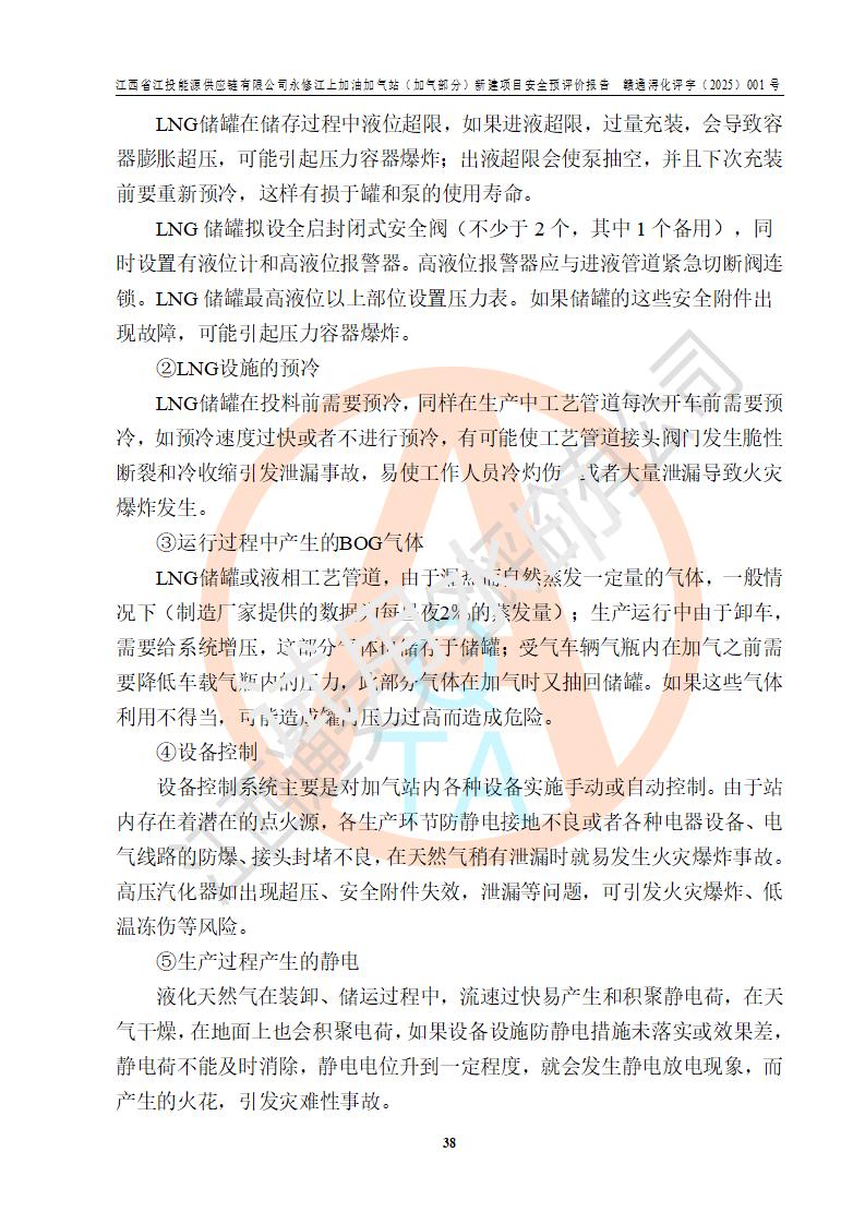 項(xiàng)目簡介 | 江西省江投能源供應(yīng)鏈有限公司是一家專門從事成品油經(jīng)營的有限責(zé)任公司(非自然人投資或控股的法人獨(dú)資),住所在江西省南昌市經(jīng)濟(jì)技術(shù)開發(fā)區(qū)雙港大道中聯(lián)村;現(xiàn)企業(yè)擬投資建設(shè)江西省江投能源供應(yīng)鏈有限公司永修江上加油加氣站新建項(xiàng)目,項(xiàng)目擬建地址在永修縣江上鄉(xiāng)105國道東側(cè),新建項(xiàng)目已取得九江市商務(wù)局網(wǎng)點(diǎn)規(guī)劃確認(rèn)的通知,同時(shí)已取得永修縣行政審批局簽發(fā)的《江西省企業(yè)投資項(xiàng)目備案通知書》,項(xiàng)目統(tǒng)一代碼為2410-360425-04-01-430117,該項(xiàng)目的建設(shè)用地已取得永修縣自然資源局頒發(fā)的不動(dòng)產(chǎn)權(quán)證書:贛(2024)永修縣不動(dòng)產(chǎn)權(quán)第0010955號(hào)。 該項(xiàng)目新建LNG加氣站擬與加油站合并建設(shè),加油站部分不在本次評價(jià)范圍,僅做一般性描述;該項(xiàng)目站房東側(cè)為加氣站罩棚,西側(cè)為加油站罩棚,加氣站罩棚東側(cè)擬設(shè)置LNG撬裝設(shè)備1臺(tái),加油站罐區(qū)擬設(shè)置在站區(qū)東南角,站區(qū)北側(cè)擬設(shè)置停車位,西部2個(gè)停車位擬設(shè)置1臺(tái)**充電樁(2槍),站區(qū)西北角擬設(shè)置一處預(yù)留自動(dòng)洗車機(jī)位置。 該項(xiàng)目新建加油站總用地面積為7160.52m2,屬于加油與LNG加氣合建站。站內(nèi)擬設(shè)60m3LNG臥式儲(chǔ)罐1臺(tái),2臺(tái)LNG單槍加氣機(jī),LNG低溫泵撬1套(2臺(tái)LNG潛液泵、1臺(tái)增壓器、1臺(tái)EAG氣化器),加氣能力為2×104Nm3/d。站內(nèi)加油部分?jǐn)M設(shè)2臺(tái)雙槍潛油泵加油機(jī)、2臺(tái)4槍潛油泵加油機(jī)及配套的工藝管線,擬設(shè)SF油品儲(chǔ)罐4臺(tái),其中30m3的0#柴油儲(chǔ)罐2臺(tái)、30m3的92#汽油儲(chǔ)罐1臺(tái)、30m3的95#汽油儲(chǔ)罐1臺(tái),油罐總?cè)莘e為120m3(折算成汽油容積為90m3),按現(xiàn)行的《汽車加油加氣加氫站技術(shù)標(biāo)準(zhǔn)》表3.0.16的規(guī)定劃分,該站屬二級(jí)加油與LNG加氣合建站。 依據(jù)《中華人民共和國安全生產(chǎn)法》、《燃?xì)饨?jīng)營許可管理辦法》、《城鎮(zhèn)燃?xì)夤芾項(xiàng)l例》等法律和規(guī)定的要求,新建、改建、擴(kuò)建危險(xiǎn)化學(xué)品儲(chǔ)存裝置和設(shè)施的建設(shè)項(xiàng)目安全條件審查(審批、核準(zhǔn)、備案)前,建設(shè)單位應(yīng)當(dāng)選擇有資質(zhì)的安全評價(jià)機(jī)構(gòu)對建設(shè)項(xiàng)目進(jìn)行安全條件評價(jià),以**工程項(xiàng)目的安全設(shè)施與主體工程同時(shí)設(shè)計(jì)、同時(shí)施工、同時(shí)投入使用,為**工程項(xiàng)目在安全生產(chǎn)及安全管理方面符合**及行業(yè)有關(guān)法律法規(guī)及標(biāo)準(zhǔn),江西省江投能源供應(yīng)鏈有限公司委托江西通安安全評價(jià)有限公司承擔(dān)江西省江投能源供應(yīng)鏈有限公司永修江上加油加氣站(加氣部分)新建項(xiàng)目的安全預(yù)評價(jià)。依據(jù)**的相關(guān)法律、法規(guī)及標(biāo)準(zhǔn),該企業(yè)應(yīng)辦理燃?xì)饨?jīng)營許可證。 江西通安安全評價(jià)有限公司接受委托后,成立了評價(jià)組,于2025年2月踏勘了建設(shè)地址。根據(jù)相關(guān)法律、法規(guī)和標(biāo)準(zhǔn)的規(guī)定,按照《安全評價(jià)通則》(AQ8001-2007)、《安全預(yù)評價(jià)導(dǎo)則》(AQ8002-2007)的要求,在資料收集、現(xiàn)場勘探和類比調(diào)查的基礎(chǔ)上,對項(xiàng)目的工程技術(shù)資料進(jìn)行了認(rèn)真分析。建設(shè)項(xiàng)目內(nèi)在的危險(xiǎn)、有害因素對建設(shè)項(xiàng)目周邊單位生產(chǎn)、經(jīng)營活動(dòng)或者居民生活的影響以及建設(shè)項(xiàng)目周邊單位生產(chǎn)、經(jīng)營活動(dòng)或者居民生活對建設(shè)項(xiàng)目的影響等,經(jīng)過定性分析與定量計(jì)算,編制完成了本建設(shè)項(xiàng)目安全預(yù)評價(jià)報(bào)告,為相關(guān)部門實(shí)行安全監(jiān)察、為**相關(guān)部門建設(shè)項(xiàng)目設(shè)立安全審查以及為企業(yè)建設(shè)項(xiàng)目實(shí)施“三同時(shí)”提供安全技術(shù)依據(jù)。 本次安全評價(jià)范圍:江西省江投能源供應(yīng)鏈有限公司永修江上加油加氣站(加氣部分)新建項(xiàng)目的選址、總平面布置、主體裝置和輔助設(shè)施的安全條件,包括經(jīng)營過程中的危險(xiǎn)和危害因素、建設(shè)項(xiàng)目的安全條件以及規(guī)劃設(shè)計(jì)中提出的工藝、設(shè)備設(shè)施的安全可靠性和勞動(dòng)安全管理方面的組織、機(jī)構(gòu)、人員、防護(hù)設(shè)施、作業(yè)環(huán)境及管理制度等。 該項(xiàng)目新建LNG加氣站擬與加油站合并建設(shè),加油站油罐區(qū)、加油區(qū)、充電樁、洗車機(jī)部分不在本次評價(jià)范圍,僅進(jìn)行加油站對LNG加氣站的影響進(jìn)行評價(jià),僅作一般性描述。該新建項(xiàng)目的公用工程、自控系統(tǒng)共用,涉及工程的環(huán)境、消防及職業(yè)衛(wèi)生等問題則應(yīng)執(zhí)行**的有關(guān)規(guī)定及相關(guān)標(biāo)準(zhǔn)。 | ||||||