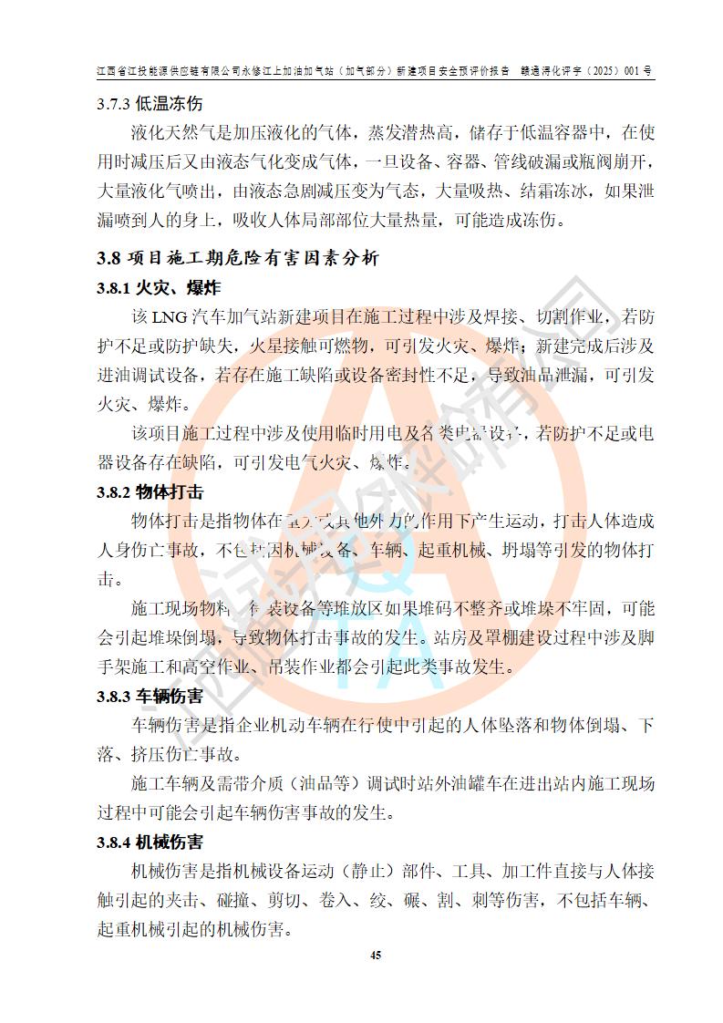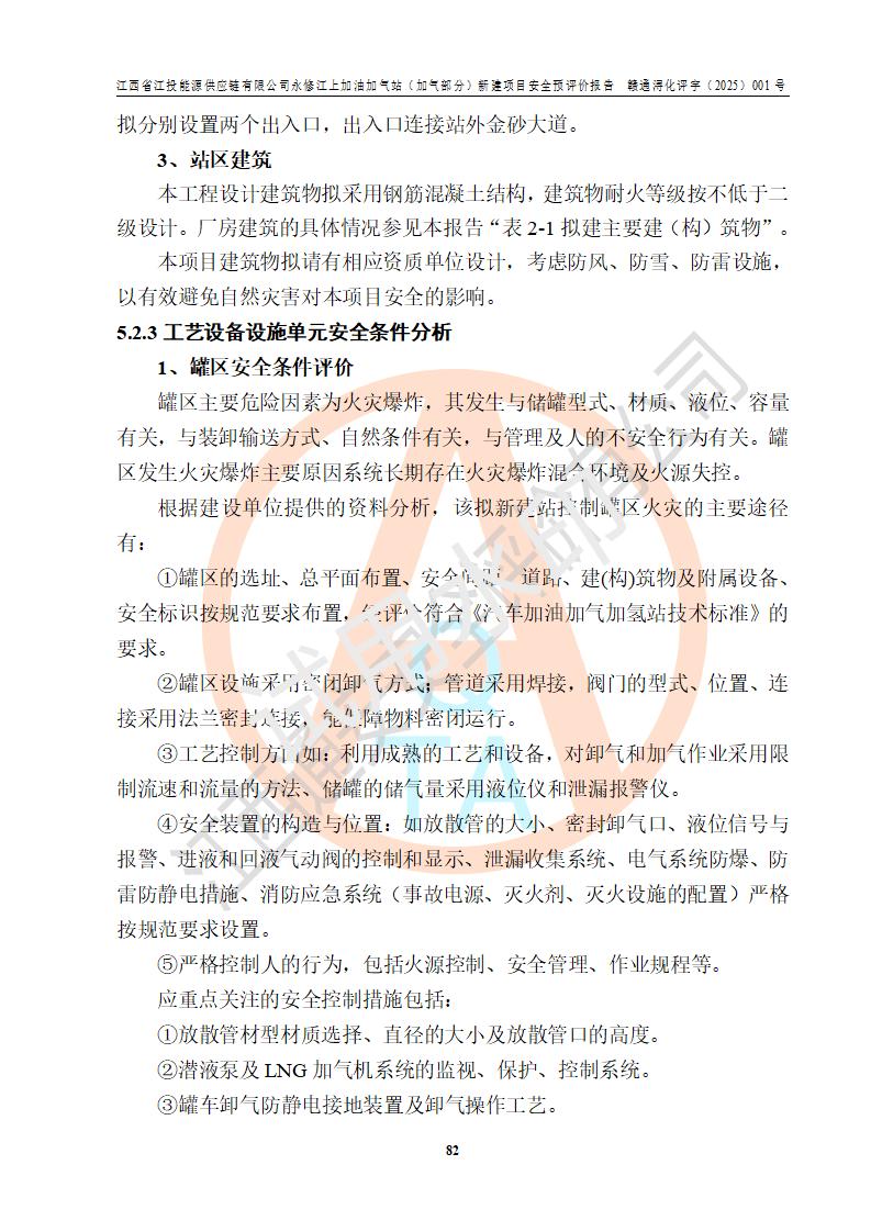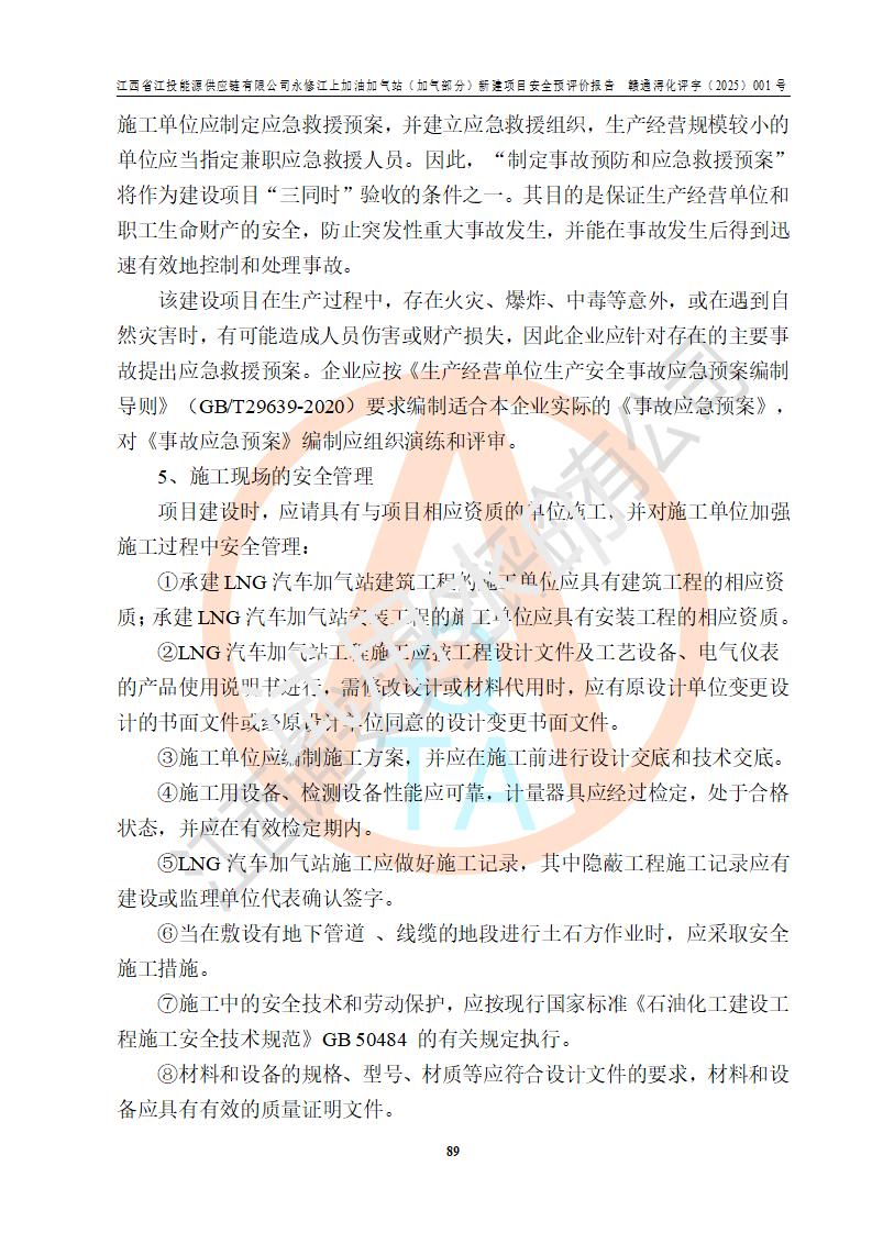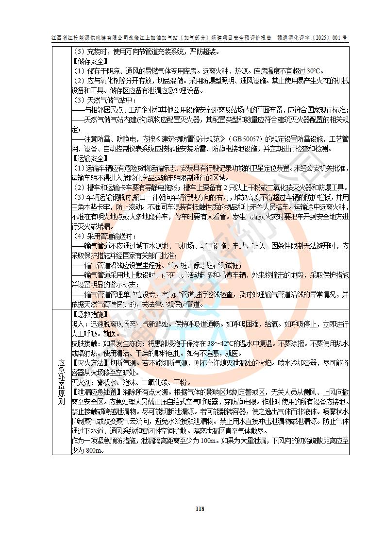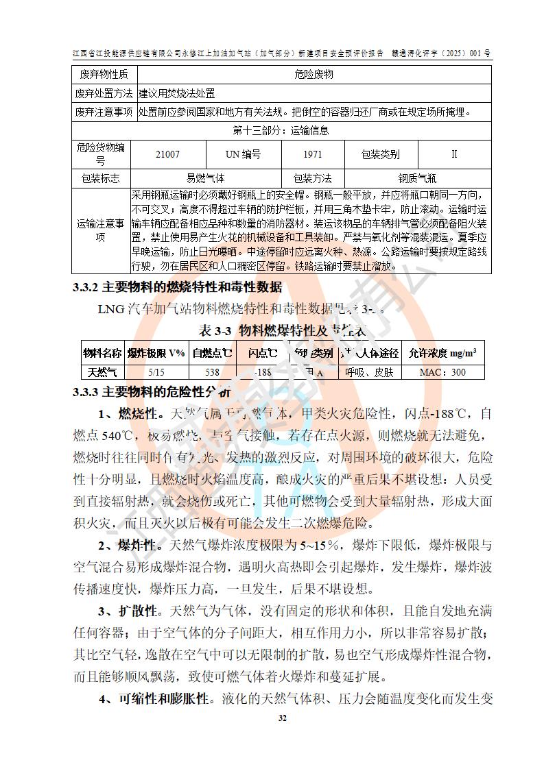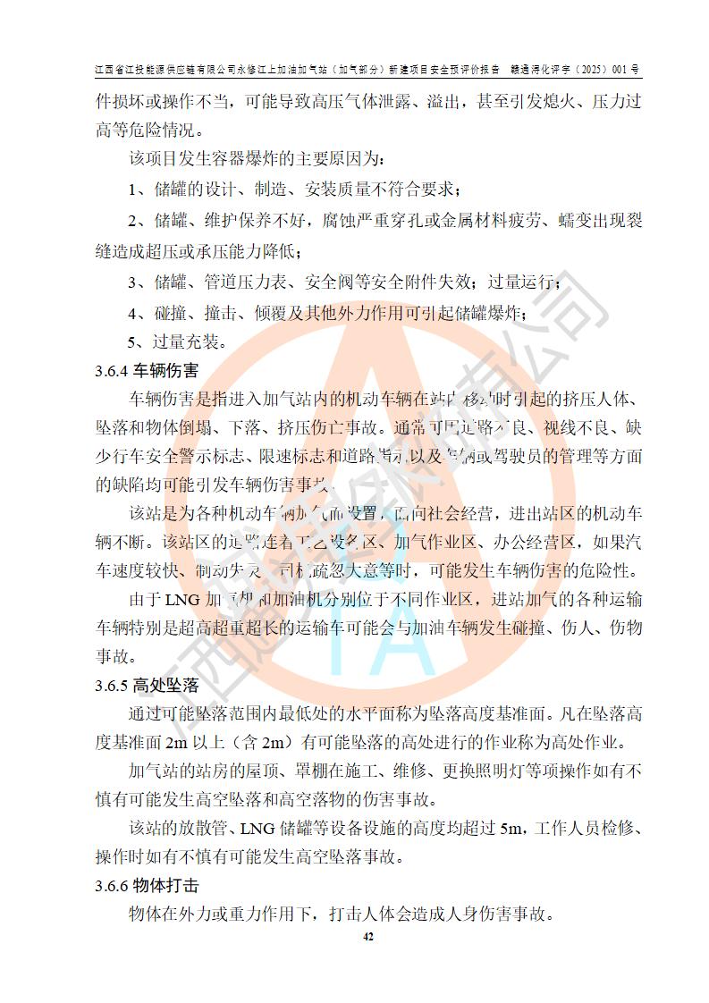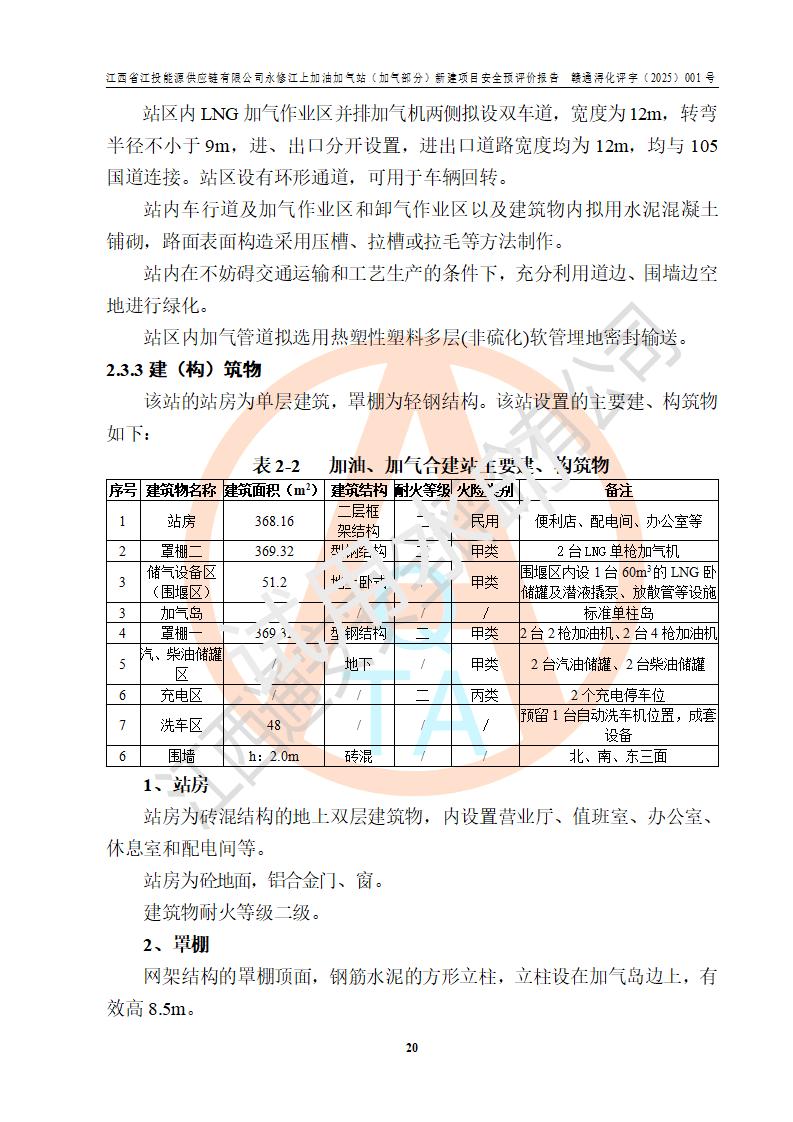 項(xiàng)目簡介 | 江西省江投能源供應(yīng)鏈有限公司是一家專門從事成品油經(jīng)營的有限責(zé)任公司(非自然人投資或控股的法人獨(dú)資),住所在江西省南昌市經(jīng)濟(jì)技術(shù)開發(fā)區(qū)雙港大道中聯(lián)村;現(xiàn)企業(yè)擬投資建設(shè)江西省江投能源供應(yīng)鏈有限公司永修江上加油加氣站新建項(xiàng)目,項(xiàng)目擬建地址在永修縣江上鄉(xiāng)105國道東側(cè),新建項(xiàng)目已取得九江市商務(wù)局網(wǎng)點(diǎn)規(guī)劃確認(rèn)的通知,同時(shí)已取得永修縣行政審批局簽發(fā)的《江西省企業(yè)投資項(xiàng)目備案通知書》,項(xiàng)目統(tǒng)一代碼為2410-360425-04-01-430117,該項(xiàng)目的建設(shè)用地已取得永修縣自然資源局頒發(fā)的不動(dòng)產(chǎn)權(quán)證書:贛(2024)永修縣不動(dòng)產(chǎn)權(quán)第0010955號(hào)。 該項(xiàng)目新建LNG加氣站擬與加油站合并建設(shè),加油站部分不在本次評價(jià)范圍,僅做一般性描述;該項(xiàng)目站房東側(cè)為加氣站罩棚,西側(cè)為加油站罩棚,加氣站罩棚東側(cè)擬設(shè)置LNG撬裝設(shè)備1臺(tái),加油站罐區(qū)擬設(shè)置在站區(qū)東南角,站區(qū)北側(cè)擬設(shè)置停車位,西部2個(gè)停車位擬設(shè)置1臺(tái)**充電樁(2槍),站區(qū)西北角擬設(shè)置一處預(yù)留自動(dòng)洗車機(jī)位置。 該項(xiàng)目新建加油站總用地面積為7160.52m2,屬于加油與LNG加氣合建站。站內(nèi)擬設(shè)60m3LNG臥式儲(chǔ)罐1臺(tái),2臺(tái)LNG單槍加氣機(jī),LNG低溫泵撬1套(2臺(tái)LNG潛液泵、1臺(tái)增壓器、1臺(tái)EAG氣化器),加氣能力為2×104Nm3/d。站內(nèi)加油部分?jǐn)M設(shè)2臺(tái)雙槍潛油泵加油機(jī)、2臺(tái)4槍潛油泵加油機(jī)及配套的工藝管線,擬設(shè)SF油品儲(chǔ)罐4臺(tái),其中30m3的0#柴油儲(chǔ)罐2臺(tái)、30m3的92#汽油儲(chǔ)罐1臺(tái)、30m3的95#汽油儲(chǔ)罐1臺(tái),油罐總?cè)莘e為120m3(折算成汽油容積為90m3),按現(xiàn)行的《汽車加油加氣加氫站技術(shù)標(biāo)準(zhǔn)》表3.0.16的規(guī)定劃分,該站屬二級(jí)加油與LNG加氣合建站。 依據(jù)《中華人民共和國安全生產(chǎn)法》、《燃?xì)饨?jīng)營許可管理辦法》、《城鎮(zhèn)燃?xì)夤芾項(xiàng)l例》等法律和規(guī)定的要求,新建、改建、擴(kuò)建危險(xiǎn)化學(xué)品儲(chǔ)存裝置和設(shè)施的建設(shè)項(xiàng)目安全條件審查(審批、核準(zhǔn)、備案)前,建設(shè)單位應(yīng)當(dāng)選擇有資質(zhì)的安全評價(jià)機(jī)構(gòu)對建設(shè)項(xiàng)目進(jìn)行安全條件評價(jià),以**工程項(xiàng)目的安全設(shè)施與主體工程同時(shí)設(shè)計(jì)、同時(shí)施工、同時(shí)投入使用,為**工程項(xiàng)目在安全生產(chǎn)及安全管理方面符合**及行業(yè)有關(guān)法律法規(guī)及標(biāo)準(zhǔn),江西省江投能源供應(yīng)鏈有限公司委托江西通安安全評價(jià)有限公司承擔(dān)江西省江投能源供應(yīng)鏈有限公司永修江上加油加氣站(加氣部分)新建項(xiàng)目的安全預(yù)評價(jià)。依據(jù)**的相關(guān)法律、法規(guī)及標(biāo)準(zhǔn),該企業(yè)應(yīng)辦理燃?xì)饨?jīng)營許可證。 江西通安安全評價(jià)有限公司接受委托后,成立了評價(jià)組,于2025年2月踏勘了建設(shè)地址。根據(jù)相關(guān)法律、法規(guī)和標(biāo)準(zhǔn)的規(guī)定,按照《安全評價(jià)通則》(AQ8001-2007)、《安全預(yù)評價(jià)導(dǎo)則》(AQ8002-2007)的要求,在資料收集、現(xiàn)場勘探和類比調(diào)查的基礎(chǔ)上,對項(xiàng)目的工程技術(shù)資料進(jìn)行了認(rèn)真分析。建設(shè)項(xiàng)目內(nèi)在的危險(xiǎn)、有害因素對建設(shè)項(xiàng)目周邊單位生產(chǎn)、經(jīng)營活動(dòng)或者居民生活的影響以及建設(shè)項(xiàng)目周邊單位生產(chǎn)、經(jīng)營活動(dòng)或者居民生活對建設(shè)項(xiàng)目的影響等,經(jīng)過定性分析與定量計(jì)算,編制完成了本建設(shè)項(xiàng)目安全預(yù)評價(jià)報(bào)告,為相關(guān)部門實(shí)行安全監(jiān)察、為**相關(guān)部門建設(shè)項(xiàng)目設(shè)立安全審查以及為企業(yè)建設(shè)項(xiàng)目實(shí)施“三同時(shí)”提供安全技術(shù)依據(jù)。 本次安全評價(jià)范圍:江西省江投能源供應(yīng)鏈有限公司永修江上加油加氣站(加氣部分)新建項(xiàng)目的選址、總平面布置、主體裝置和輔助設(shè)施的安全條件,包括經(jīng)營過程中的危險(xiǎn)和危害因素、建設(shè)項(xiàng)目的安全條件以及規(guī)劃設(shè)計(jì)中提出的工藝、設(shè)備設(shè)施的安全可靠性和勞動(dòng)安全管理方面的組織、機(jī)構(gòu)、人員、防護(hù)設(shè)施、作業(yè)環(huán)境及管理制度等。 該項(xiàng)目新建LNG加氣站擬與加油站合并建設(shè),加油站油罐區(qū)、加油區(qū)、充電樁、洗車機(jī)部分不在本次評價(jià)范圍,僅進(jìn)行加油站對LNG加氣站的影響進(jìn)行評價(jià),僅作一般性描述。該新建項(xiàng)目的公用工程、自控系統(tǒng)共用,涉及工程的環(huán)境、消防及職業(yè)衛(wèi)生等問題則應(yīng)執(zhí)行**的有關(guān)規(guī)定及相關(guān)標(biāo)準(zhǔn)。 | ||||||