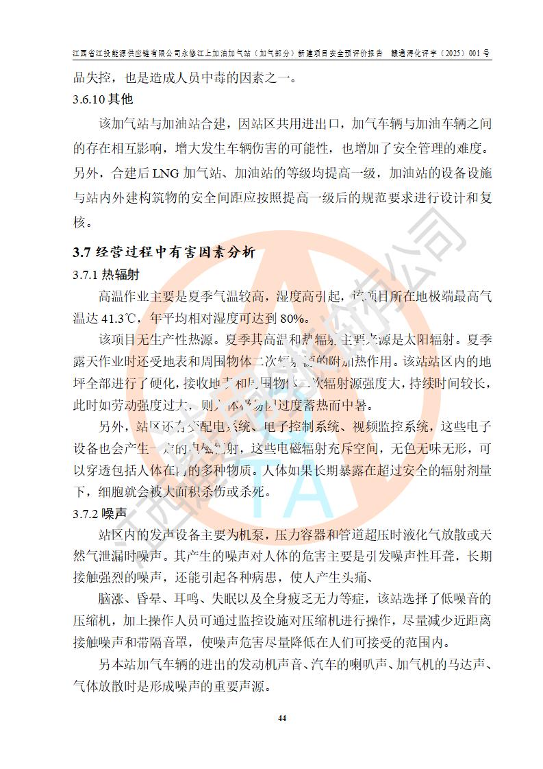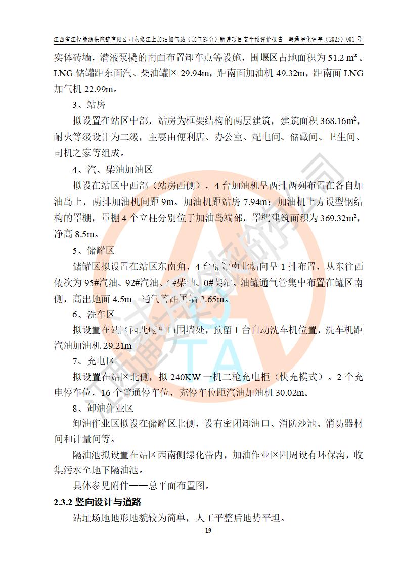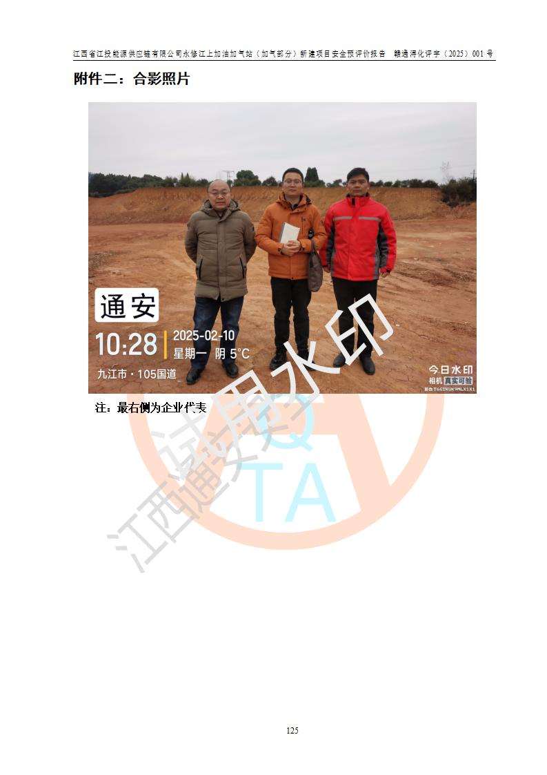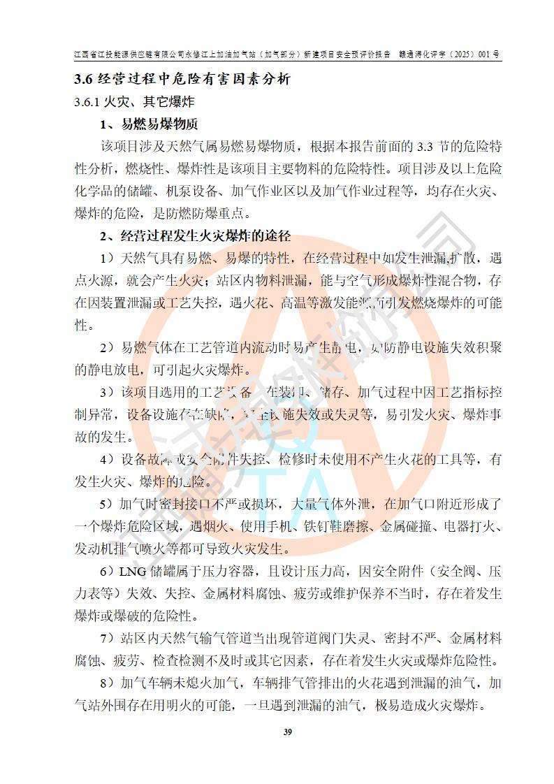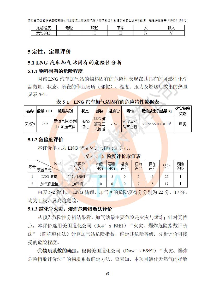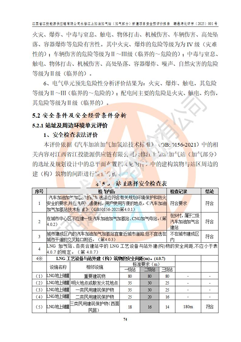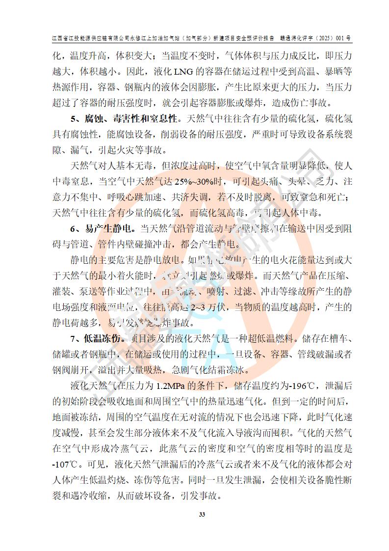 項(xiàng)目簡介 | 江西省江投能源供應(yīng)鏈有限公司是一家專門從事成品油經(jīng)營的有限責(zé)任公司(非自然人投資或控股的法人獨(dú)資),住所在江西省南昌市經(jīng)濟(jì)技術(shù)開發(fā)區(qū)雙港大道中聯(lián)村;現(xiàn)企業(yè)擬投資建設(shè)江西省江投能源供應(yīng)鏈有限公司永修江上加油加氣站新建項(xiàng)目,項(xiàng)目擬建地址在永修縣江上鄉(xiāng)105國道東側(cè),新建項(xiàng)目已取得九江市商務(wù)局網(wǎng)點(diǎn)規(guī)劃確認(rèn)的通知,同時(shí)已取得永修縣行政審批局簽發(fā)的《江西省企業(yè)投資項(xiàng)目備案通知書》,項(xiàng)目統(tǒng)一代碼為2410-360425-04-01-430117,該項(xiàng)目的建設(shè)用地已取得永修縣自然資源局頒發(fā)的不動(dòng)產(chǎn)權(quán)證書:贛(2024)永修縣不動(dòng)產(chǎn)權(quán)第0010955號(hào)。 該項(xiàng)目新建LNG加氣站擬與加油站合并建設(shè),加油站部分不在本次評價(jià)范圍,僅做一般性描述;該項(xiàng)目站房東側(cè)為加氣站罩棚,西側(cè)為加油站罩棚,加氣站罩棚東側(cè)擬設(shè)置LNG撬裝設(shè)備1臺(tái),加油站罐區(qū)擬設(shè)置在站區(qū)東南角,站區(qū)北側(cè)擬設(shè)置停車位,西部2個(gè)停車位擬設(shè)置1臺(tái)**充電樁(2槍),站區(qū)西北角擬設(shè)置一處預(yù)留自動(dòng)洗車機(jī)位置。 該項(xiàng)目新建加油站總用地面積為7160.52m2,屬于加油與LNG加氣合建站。站內(nèi)擬設(shè)60m3LNG臥式儲(chǔ)罐1臺(tái),2臺(tái)LNG單槍加氣機(jī),LNG低溫泵撬1套(2臺(tái)LNG潛液泵、1臺(tái)增壓器、1臺(tái)EAG氣化器),加氣能力為2×104Nm3/d。站內(nèi)加油部分?jǐn)M設(shè)2臺(tái)雙槍潛油泵加油機(jī)、2臺(tái)4槍潛油泵加油機(jī)及配套的工藝管線,擬設(shè)SF油品儲(chǔ)罐4臺(tái),其中30m3的0#柴油儲(chǔ)罐2臺(tái)、30m3的92#汽油儲(chǔ)罐1臺(tái)、30m3的95#汽油儲(chǔ)罐1臺(tái),油罐總?cè)莘e為120m3(折算成汽油容積為90m3),按現(xiàn)行的《汽車加油加氣加氫站技術(shù)標(biāo)準(zhǔn)》表3.0.16的規(guī)定劃分,該站屬二級(jí)加油與LNG加氣合建站。 依據(jù)《中華人民共和國安全生產(chǎn)法》、《燃?xì)饨?jīng)營許可管理辦法》、《城鎮(zhèn)燃?xì)夤芾項(xiàng)l例》等法律和規(guī)定的要求,新建、改建、擴(kuò)建危險(xiǎn)化學(xué)品儲(chǔ)存裝置和設(shè)施的建設(shè)項(xiàng)目安全條件審查(審批、核準(zhǔn)、備案)前,建設(shè)單位應(yīng)當(dāng)選擇有資質(zhì)的安全評價(jià)機(jī)構(gòu)對建設(shè)項(xiàng)目進(jìn)行安全條件評價(jià),以**工程項(xiàng)目的安全設(shè)施與主體工程同時(shí)設(shè)計(jì)、同時(shí)施工、同時(shí)投入使用,為**工程項(xiàng)目在安全生產(chǎn)及安全管理方面符合**及行業(yè)有關(guān)法律法規(guī)及標(biāo)準(zhǔn),江西省江投能源供應(yīng)鏈有限公司委托江西通安安全評價(jià)有限公司承擔(dān)江西省江投能源供應(yīng)鏈有限公司永修江上加油加氣站(加氣部分)新建項(xiàng)目的安全預(yù)評價(jià)。依據(jù)**的相關(guān)法律、法規(guī)及標(biāo)準(zhǔn),該企業(yè)應(yīng)辦理燃?xì)饨?jīng)營許可證。 江西通安安全評價(jià)有限公司接受委托后,成立了評價(jià)組,于2025年2月踏勘了建設(shè)地址。根據(jù)相關(guān)法律、法規(guī)和標(biāo)準(zhǔn)的規(guī)定,按照《安全評價(jià)通則》(AQ8001-2007)、《安全預(yù)評價(jià)導(dǎo)則》(AQ8002-2007)的要求,在資料收集、現(xiàn)場勘探和類比調(diào)查的基礎(chǔ)上,對項(xiàng)目的工程技術(shù)資料進(jìn)行了認(rèn)真分析。建設(shè)項(xiàng)目內(nèi)在的危險(xiǎn)、有害因素對建設(shè)項(xiàng)目周邊單位生產(chǎn)、經(jīng)營活動(dòng)或者居民生活的影響以及建設(shè)項(xiàng)目周邊單位生產(chǎn)、經(jīng)營活動(dòng)或者居民生活對建設(shè)項(xiàng)目的影響等,經(jīng)過定性分析與定量計(jì)算,編制完成了本建設(shè)項(xiàng)目安全預(yù)評價(jià)報(bào)告,為相關(guān)部門實(shí)行安全監(jiān)察、為**相關(guān)部門建設(shè)項(xiàng)目設(shè)立安全審查以及為企業(yè)建設(shè)項(xiàng)目實(shí)施“三同時(shí)”提供安全技術(shù)依據(jù)。 本次安全評價(jià)范圍:江西省江投能源供應(yīng)鏈有限公司永修江上加油加氣站(加氣部分)新建項(xiàng)目的選址、總平面布置、主體裝置和輔助設(shè)施的安全條件,包括經(jīng)營過程中的危險(xiǎn)和危害因素、建設(shè)項(xiàng)目的安全條件以及規(guī)劃設(shè)計(jì)中提出的工藝、設(shè)備設(shè)施的安全可靠性和勞動(dòng)安全管理方面的組織、機(jī)構(gòu)、人員、防護(hù)設(shè)施、作業(yè)環(huán)境及管理制度等。 該項(xiàng)目新建LNG加氣站擬與加油站合并建設(shè),加油站油罐區(qū)、加油區(qū)、充電樁、洗車機(jī)部分不在本次評價(jià)范圍,僅進(jìn)行加油站對LNG加氣站的影響進(jìn)行評價(jià),僅作一般性描述。該新建項(xiàng)目的公用工程、自控系統(tǒng)共用,涉及工程的環(huán)境、消防及職業(yè)衛(wèi)生等問題則應(yīng)執(zhí)行**的有關(guān)規(guī)定及相關(guān)標(biāo)準(zhǔn)。 | ||||||
