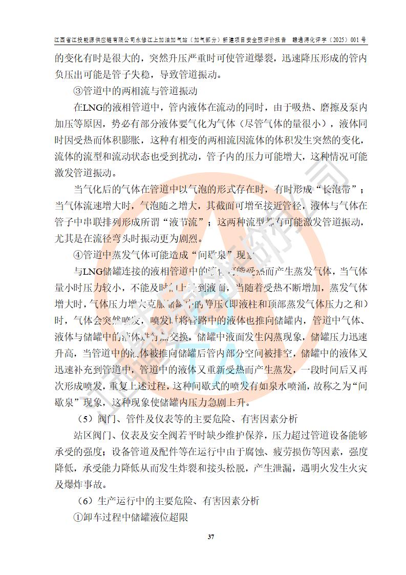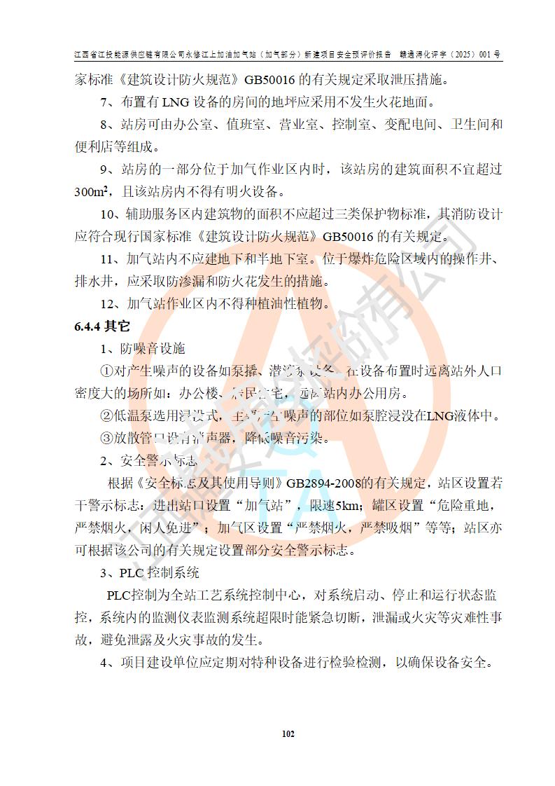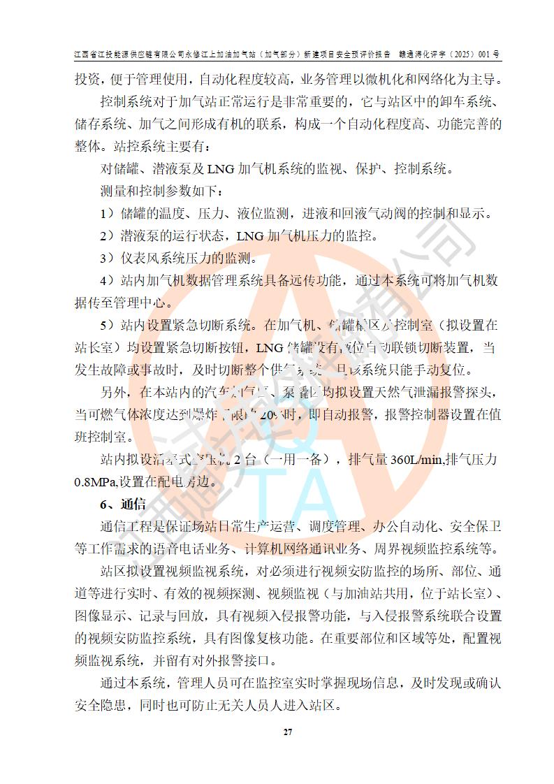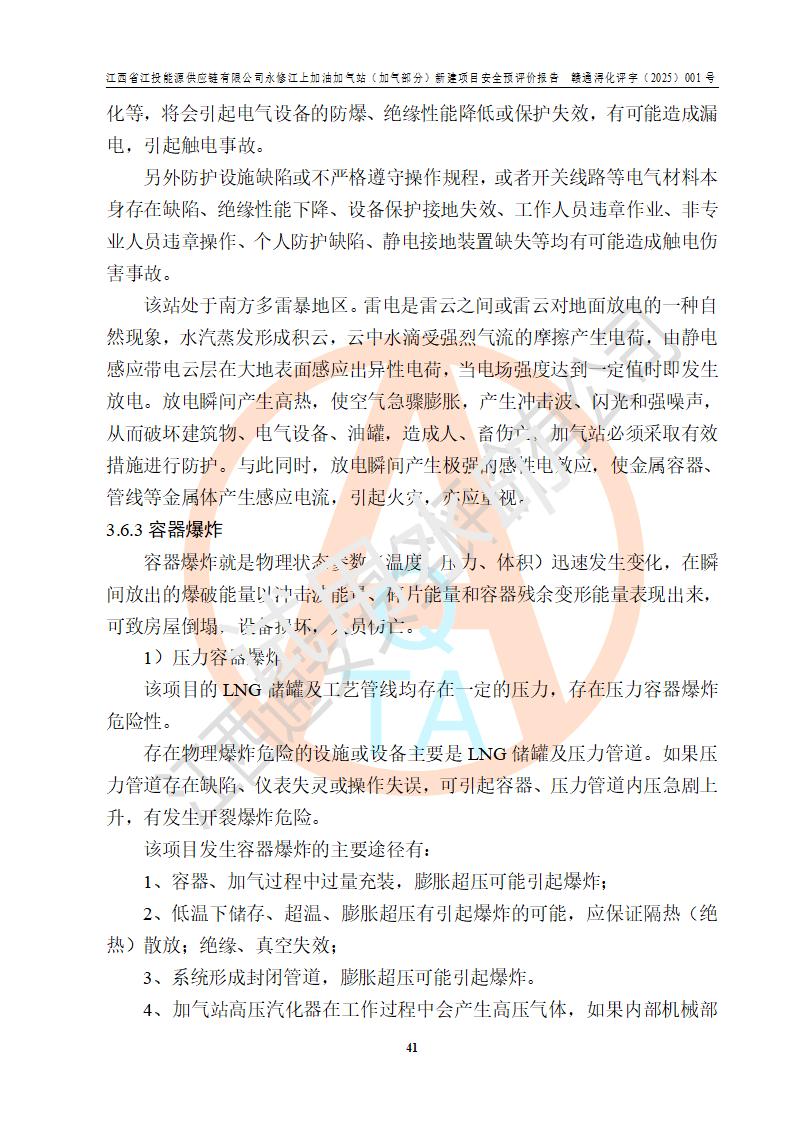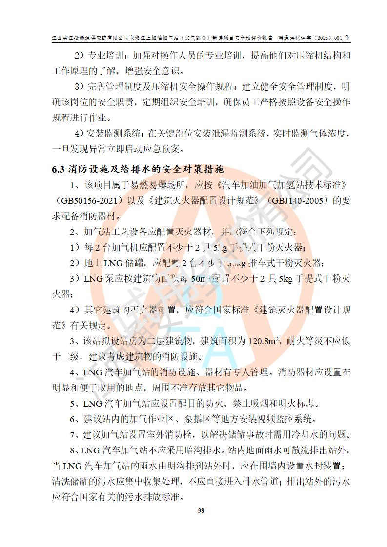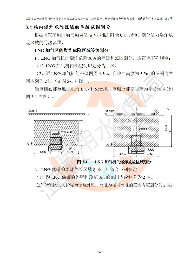 項(xiàng)目簡介 | 江西省江投能源供應(yīng)鏈有限公司是一家專門從事成品油經(jīng)營的有限責(zé)任公司(非自然人投資或控股的法人獨(dú)資),住所在江西省南昌市經(jīng)濟(jì)技術(shù)開發(fā)區(qū)雙港大道中聯(lián)村;現(xiàn)企業(yè)擬投資建設(shè)江西省江投能源供應(yīng)鏈有限公司永修江上加油加氣站新建項(xiàng)目,項(xiàng)目擬建地址在永修縣江上鄉(xiāng)105國道東側(cè),新建項(xiàng)目已取得九江市商務(wù)局網(wǎng)點(diǎn)規(guī)劃確認(rèn)的通知,同時(shí)已取得永修縣行政審批局簽發(fā)的《江西省企業(yè)投資項(xiàng)目備案通知書》,項(xiàng)目統(tǒng)一代碼為2410-360425-04-01-430117,該項(xiàng)目的建設(shè)用地已取得永修縣自然資源局頒發(fā)的不動(dòng)產(chǎn)權(quán)證書:贛(2024)永修縣不動(dòng)產(chǎn)權(quán)第0010955號(hào)。 該項(xiàng)目新建LNG加氣站擬與加油站合并建設(shè),加油站部分不在本次評價(jià)范圍,僅做一般性描述;該項(xiàng)目站房東側(cè)為加氣站罩棚,西側(cè)為加油站罩棚,加氣站罩棚東側(cè)擬設(shè)置LNG撬裝設(shè)備1臺(tái),加油站罐區(qū)擬設(shè)置在站區(qū)東南角,站區(qū)北側(cè)擬設(shè)置停車位,西部2個(gè)停車位擬設(shè)置1臺(tái)**充電樁(2槍),站區(qū)西北角擬設(shè)置一處預(yù)留自動(dòng)洗車機(jī)位置。 該項(xiàng)目新建加油站總用地面積為7160.52m2,屬于加油與LNG加氣合建站。站內(nèi)擬設(shè)60m3LNG臥式儲(chǔ)罐1臺(tái),2臺(tái)LNG單槍加氣機(jī),LNG低溫泵撬1套(2臺(tái)LNG潛液泵、1臺(tái)增壓器、1臺(tái)EAG氣化器),加氣能力為2×104Nm3/d。站內(nèi)加油部分?jǐn)M設(shè)2臺(tái)雙槍潛油泵加油機(jī)、2臺(tái)4槍潛油泵加油機(jī)及配套的工藝管線,擬設(shè)SF油品儲(chǔ)罐4臺(tái),其中30m3的0#柴油儲(chǔ)罐2臺(tái)、30m3的92#汽油儲(chǔ)罐1臺(tái)、30m3的95#汽油儲(chǔ)罐1臺(tái),油罐總?cè)莘e為120m3(折算成汽油容積為90m3),按現(xiàn)行的《汽車加油加氣加氫站技術(shù)標(biāo)準(zhǔn)》表3.0.16的規(guī)定劃分,該站屬二級(jí)加油與LNG加氣合建站。 依據(jù)《中華人民共和國安全生產(chǎn)法》、《燃?xì)饨?jīng)營許可管理辦法》、《城鎮(zhèn)燃?xì)夤芾項(xiàng)l例》等法律和規(guī)定的要求,新建、改建、擴(kuò)建危險(xiǎn)化學(xué)品儲(chǔ)存裝置和設(shè)施的建設(shè)項(xiàng)目安全條件審查(審批、核準(zhǔn)、備案)前,建設(shè)單位應(yīng)當(dāng)選擇有資質(zhì)的安全評價(jià)機(jī)構(gòu)對建設(shè)項(xiàng)目進(jìn)行安全條件評價(jià),以**工程項(xiàng)目的安全設(shè)施與主體工程同時(shí)設(shè)計(jì)、同時(shí)施工、同時(shí)投入使用,為**工程項(xiàng)目在安全生產(chǎn)及安全管理方面符合**及行業(yè)有關(guān)法律法規(guī)及標(biāo)準(zhǔn),江西省江投能源供應(yīng)鏈有限公司委托江西通安安全評價(jià)有限公司承擔(dān)江西省江投能源供應(yīng)鏈有限公司永修江上加油加氣站(加氣部分)新建項(xiàng)目的安全預(yù)評價(jià)。依據(jù)**的相關(guān)法律、法規(guī)及標(biāo)準(zhǔn),該企業(yè)應(yīng)辦理燃?xì)饨?jīng)營許可證。 江西通安安全評價(jià)有限公司接受委托后,成立了評價(jià)組,于2025年2月踏勘了建設(shè)地址。根據(jù)相關(guān)法律、法規(guī)和標(biāo)準(zhǔn)的規(guī)定,按照《安全評價(jià)通則》(AQ8001-2007)、《安全預(yù)評價(jià)導(dǎo)則》(AQ8002-2007)的要求,在資料收集、現(xiàn)場勘探和類比調(diào)查的基礎(chǔ)上,對項(xiàng)目的工程技術(shù)資料進(jìn)行了認(rèn)真分析。建設(shè)項(xiàng)目內(nèi)在的危險(xiǎn)、有害因素對建設(shè)項(xiàng)目周邊單位生產(chǎn)、經(jīng)營活動(dòng)或者居民生活的影響以及建設(shè)項(xiàng)目周邊單位生產(chǎn)、經(jīng)營活動(dòng)或者居民生活對建設(shè)項(xiàng)目的影響等,經(jīng)過定性分析與定量計(jì)算,編制完成了本建設(shè)項(xiàng)目安全預(yù)評價(jià)報(bào)告,為相關(guān)部門實(shí)行安全監(jiān)察、為**相關(guān)部門建設(shè)項(xiàng)目設(shè)立安全審查以及為企業(yè)建設(shè)項(xiàng)目實(shí)施“三同時(shí)”提供安全技術(shù)依據(jù)。 本次安全評價(jià)范圍:江西省江投能源供應(yīng)鏈有限公司永修江上加油加氣站(加氣部分)新建項(xiàng)目的選址、總平面布置、主體裝置和輔助設(shè)施的安全條件,包括經(jīng)營過程中的危險(xiǎn)和危害因素、建設(shè)項(xiàng)目的安全條件以及規(guī)劃設(shè)計(jì)中提出的工藝、設(shè)備設(shè)施的安全可靠性和勞動(dòng)安全管理方面的組織、機(jī)構(gòu)、人員、防護(hù)設(shè)施、作業(yè)環(huán)境及管理制度等。 該項(xiàng)目新建LNG加氣站擬與加油站合并建設(shè),加油站油罐區(qū)、加油區(qū)、充電樁、洗車機(jī)部分不在本次評價(jià)范圍,僅進(jìn)行加油站對LNG加氣站的影響進(jìn)行評價(jià),僅作一般性描述。該新建項(xiàng)目的公用工程、自控系統(tǒng)共用,涉及工程的環(huán)境、消防及職業(yè)衛(wèi)生等問題則應(yīng)執(zhí)行**的有關(guān)規(guī)定及相關(guān)標(biāo)準(zhǔn)。 | ||||||