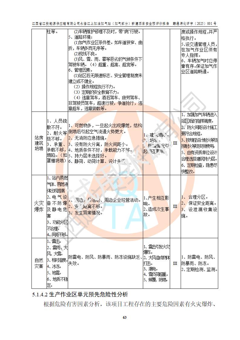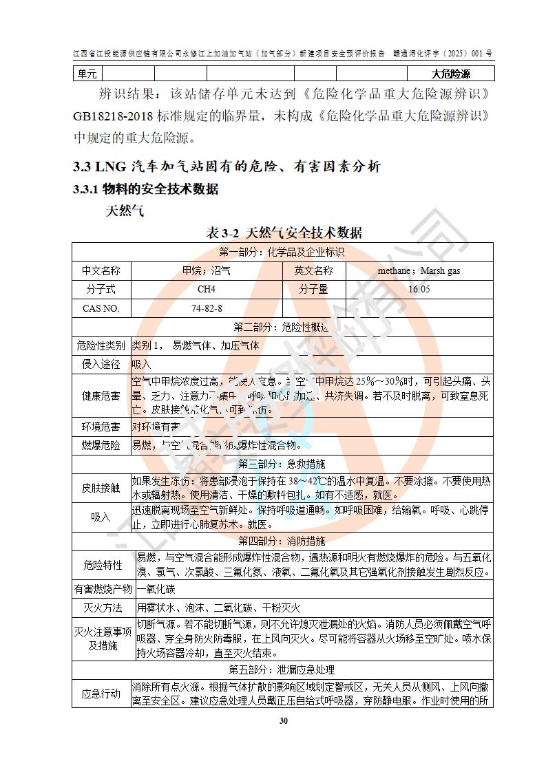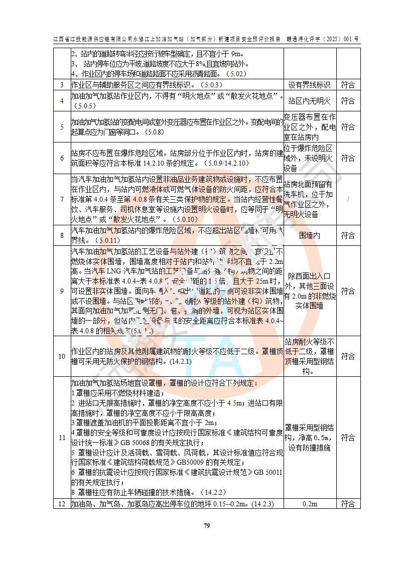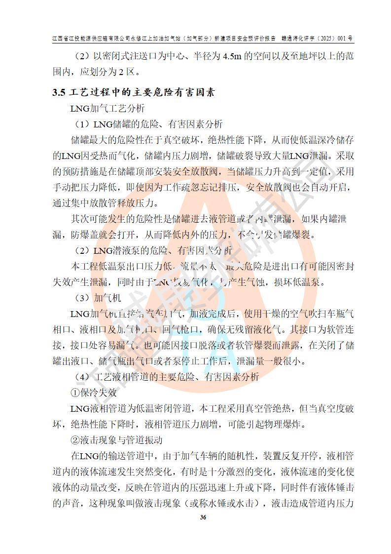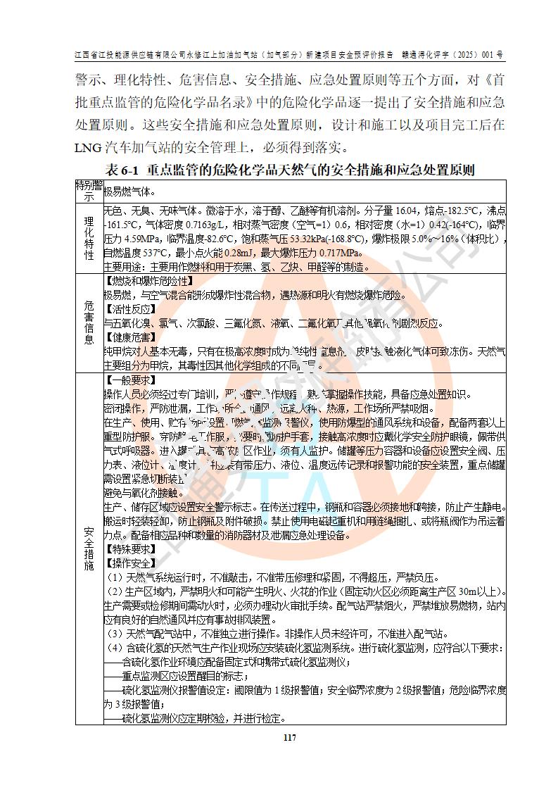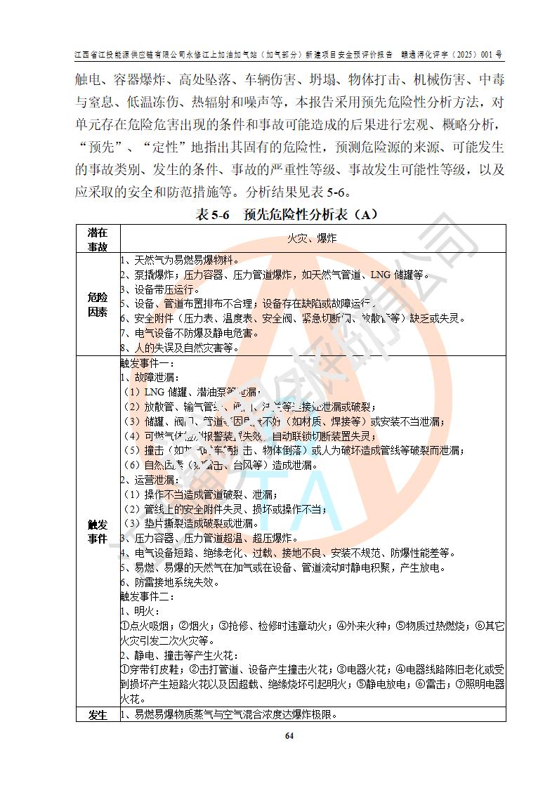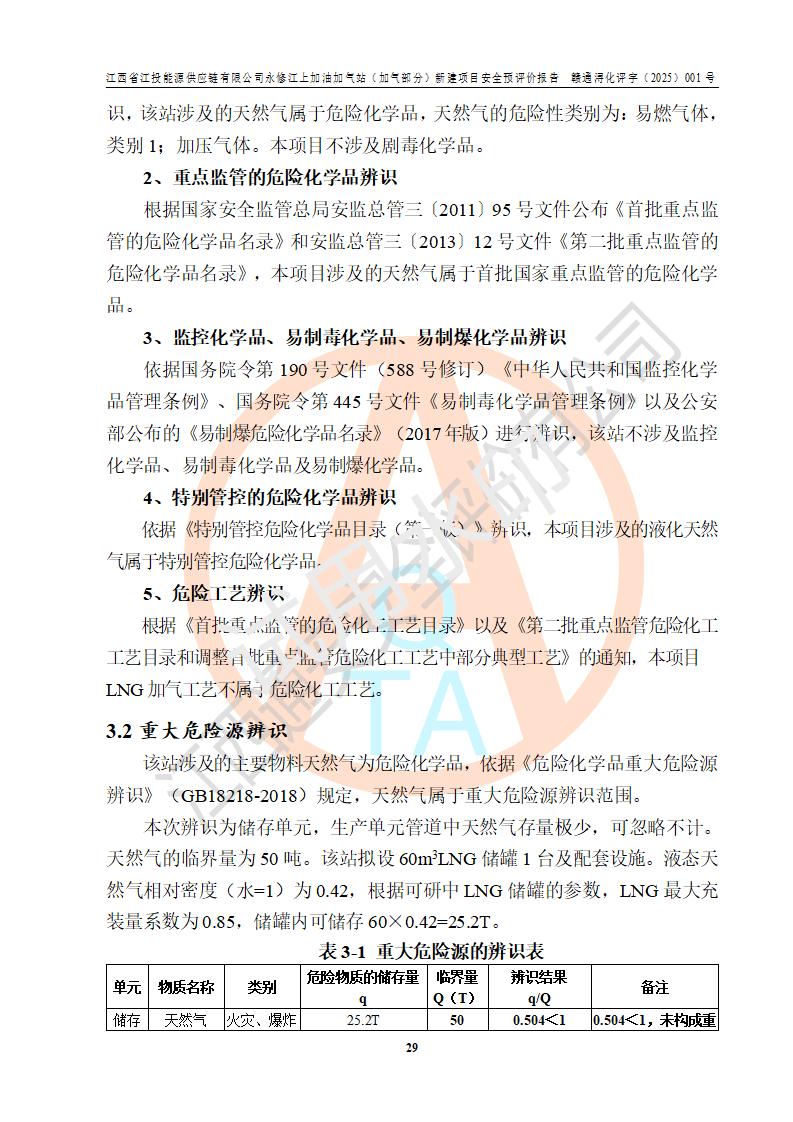 項(xiàng)目簡介 | 江西省江投能源供應(yīng)鏈有限公司是一家專門從事成品油經(jīng)營的有限責(zé)任公司(非自然人投資或控股的法人獨(dú)資),住所在江西省南昌市經(jīng)濟(jì)技術(shù)開發(fā)區(qū)雙港大道中聯(lián)村;現(xiàn)企業(yè)擬投資建設(shè)江西省江投能源供應(yīng)鏈有限公司永修江上加油加氣站新建項(xiàng)目,項(xiàng)目擬建地址在永修縣江上鄉(xiāng)105國道東側(cè),新建項(xiàng)目已取得九江市商務(wù)局網(wǎng)點(diǎn)規(guī)劃確認(rèn)的通知,同時(shí)已取得永修縣行政審批局簽發(fā)的《江西省企業(yè)投資項(xiàng)目備案通知書》,項(xiàng)目統(tǒng)一代碼為2410-360425-04-01-430117,該項(xiàng)目的建設(shè)用地已取得永修縣自然資源局頒發(fā)的不動(dòng)產(chǎn)權(quán)證書:贛(2024)永修縣不動(dòng)產(chǎn)權(quán)第0010955號(hào)。 該項(xiàng)目新建LNG加氣站擬與加油站合并建設(shè),加油站部分不在本次評價(jià)范圍,僅做一般性描述;該項(xiàng)目站房東側(cè)為加氣站罩棚,西側(cè)為加油站罩棚,加氣站罩棚東側(cè)擬設(shè)置LNG撬裝設(shè)備1臺(tái),加油站罐區(qū)擬設(shè)置在站區(qū)東南角,站區(qū)北側(cè)擬設(shè)置停車位,西部2個(gè)停車位擬設(shè)置1臺(tái)**充電樁(2槍),站區(qū)西北角擬設(shè)置一處預(yù)留自動(dòng)洗車機(jī)位置。 該項(xiàng)目新建加油站總用地面積為7160.52m2,屬于加油與LNG加氣合建站。站內(nèi)擬設(shè)60m3LNG臥式儲(chǔ)罐1臺(tái),2臺(tái)LNG單槍加氣機(jī),LNG低溫泵撬1套(2臺(tái)LNG潛液泵、1臺(tái)增壓器、1臺(tái)EAG氣化器),加氣能力為2×104Nm3/d。站內(nèi)加油部分?jǐn)M設(shè)2臺(tái)雙槍潛油泵加油機(jī)、2臺(tái)4槍潛油泵加油機(jī)及配套的工藝管線,擬設(shè)SF油品儲(chǔ)罐4臺(tái),其中30m3的0#柴油儲(chǔ)罐2臺(tái)、30m3的92#汽油儲(chǔ)罐1臺(tái)、30m3的95#汽油儲(chǔ)罐1臺(tái),油罐總?cè)莘e為120m3(折算成汽油容積為90m3),按現(xiàn)行的《汽車加油加氣加氫站技術(shù)標(biāo)準(zhǔn)》表3.0.16的規(guī)定劃分,該站屬二級(jí)加油與LNG加氣合建站。 依據(jù)《中華人民共和國安全生產(chǎn)法》、《燃?xì)饨?jīng)營許可管理辦法》、《城鎮(zhèn)燃?xì)夤芾項(xiàng)l例》等法律和規(guī)定的要求,新建、改建、擴(kuò)建危險(xiǎn)化學(xué)品儲(chǔ)存裝置和設(shè)施的建設(shè)項(xiàng)目安全條件審查(審批、核準(zhǔn)、備案)前,建設(shè)單位應(yīng)當(dāng)選擇有資質(zhì)的安全評價(jià)機(jī)構(gòu)對建設(shè)項(xiàng)目進(jìn)行安全條件評價(jià),以**工程項(xiàng)目的安全設(shè)施與主體工程同時(shí)設(shè)計(jì)、同時(shí)施工、同時(shí)投入使用,為**工程項(xiàng)目在安全生產(chǎn)及安全管理方面符合**及行業(yè)有關(guān)法律法規(guī)及標(biāo)準(zhǔn),江西省江投能源供應(yīng)鏈有限公司委托江西通安安全評價(jià)有限公司承擔(dān)江西省江投能源供應(yīng)鏈有限公司永修江上加油加氣站(加氣部分)新建項(xiàng)目的安全預(yù)評價(jià)。依據(jù)**的相關(guān)法律、法規(guī)及標(biāo)準(zhǔn),該企業(yè)應(yīng)辦理燃?xì)饨?jīng)營許可證。 江西通安安全評價(jià)有限公司接受委托后,成立了評價(jià)組,于2025年2月踏勘了建設(shè)地址。根據(jù)相關(guān)法律、法規(guī)和標(biāo)準(zhǔn)的規(guī)定,按照《安全評價(jià)通則》(AQ8001-2007)、《安全預(yù)評價(jià)導(dǎo)則》(AQ8002-2007)的要求,在資料收集、現(xiàn)場勘探和類比調(diào)查的基礎(chǔ)上,對項(xiàng)目的工程技術(shù)資料進(jìn)行了認(rèn)真分析。建設(shè)項(xiàng)目內(nèi)在的危險(xiǎn)、有害因素對建設(shè)項(xiàng)目周邊單位生產(chǎn)、經(jīng)營活動(dòng)或者居民生活的影響以及建設(shè)項(xiàng)目周邊單位生產(chǎn)、經(jīng)營活動(dòng)或者居民生活對建設(shè)項(xiàng)目的影響等,經(jīng)過定性分析與定量計(jì)算,編制完成了本建設(shè)項(xiàng)目安全預(yù)評價(jià)報(bào)告,為相關(guān)部門實(shí)行安全監(jiān)察、為**相關(guān)部門建設(shè)項(xiàng)目設(shè)立安全審查以及為企業(yè)建設(shè)項(xiàng)目實(shí)施“三同時(shí)”提供安全技術(shù)依據(jù)。 本次安全評價(jià)范圍:江西省江投能源供應(yīng)鏈有限公司永修江上加油加氣站(加氣部分)新建項(xiàng)目的選址、總平面布置、主體裝置和輔助設(shè)施的安全條件,包括經(jīng)營過程中的危險(xiǎn)和危害因素、建設(shè)項(xiàng)目的安全條件以及規(guī)劃設(shè)計(jì)中提出的工藝、設(shè)備設(shè)施的安全可靠性和勞動(dòng)安全管理方面的組織、機(jī)構(gòu)、人員、防護(hù)設(shè)施、作業(yè)環(huán)境及管理制度等。 該項(xiàng)目新建LNG加氣站擬與加油站合并建設(shè),加油站油罐區(qū)、加油區(qū)、充電樁、洗車機(jī)部分不在本次評價(jià)范圍,僅進(jìn)行加油站對LNG加氣站的影響進(jìn)行評價(jià),僅作一般性描述。該新建項(xiàng)目的公用工程、自控系統(tǒng)共用,涉及工程的環(huán)境、消防及職業(yè)衛(wèi)生等問題則應(yīng)執(zhí)行**的有關(guān)規(guī)定及相關(guān)標(biāo)準(zhǔn)。 | ||||||