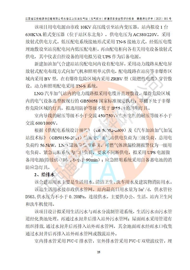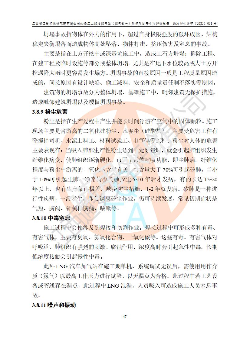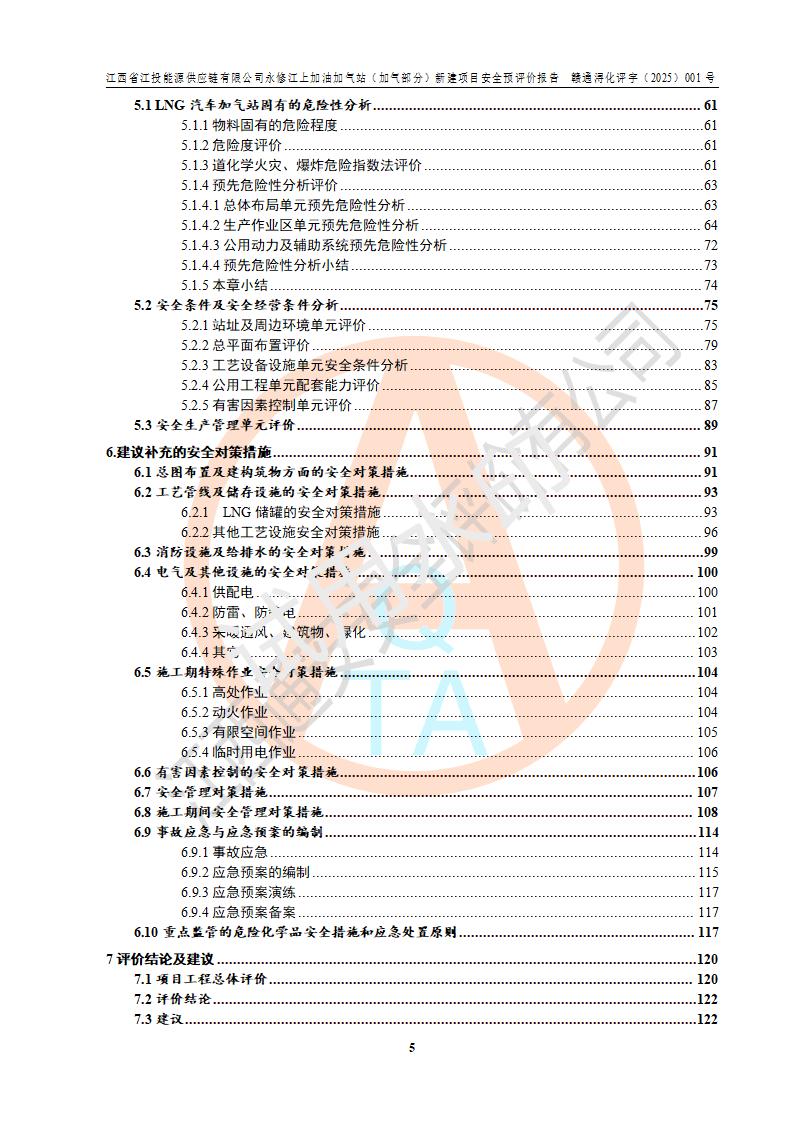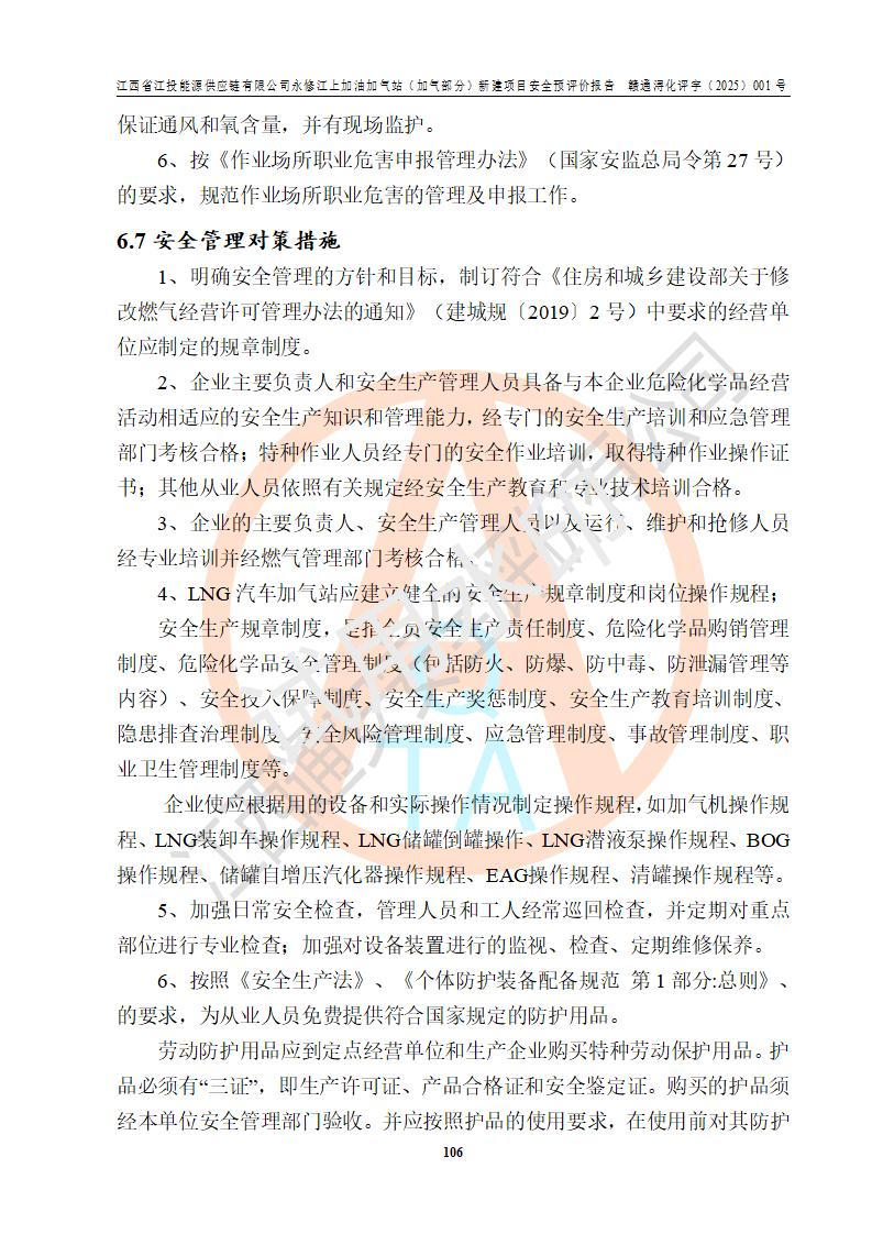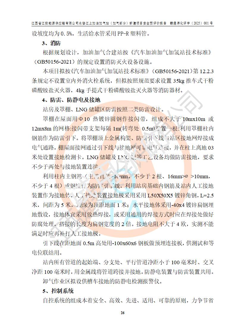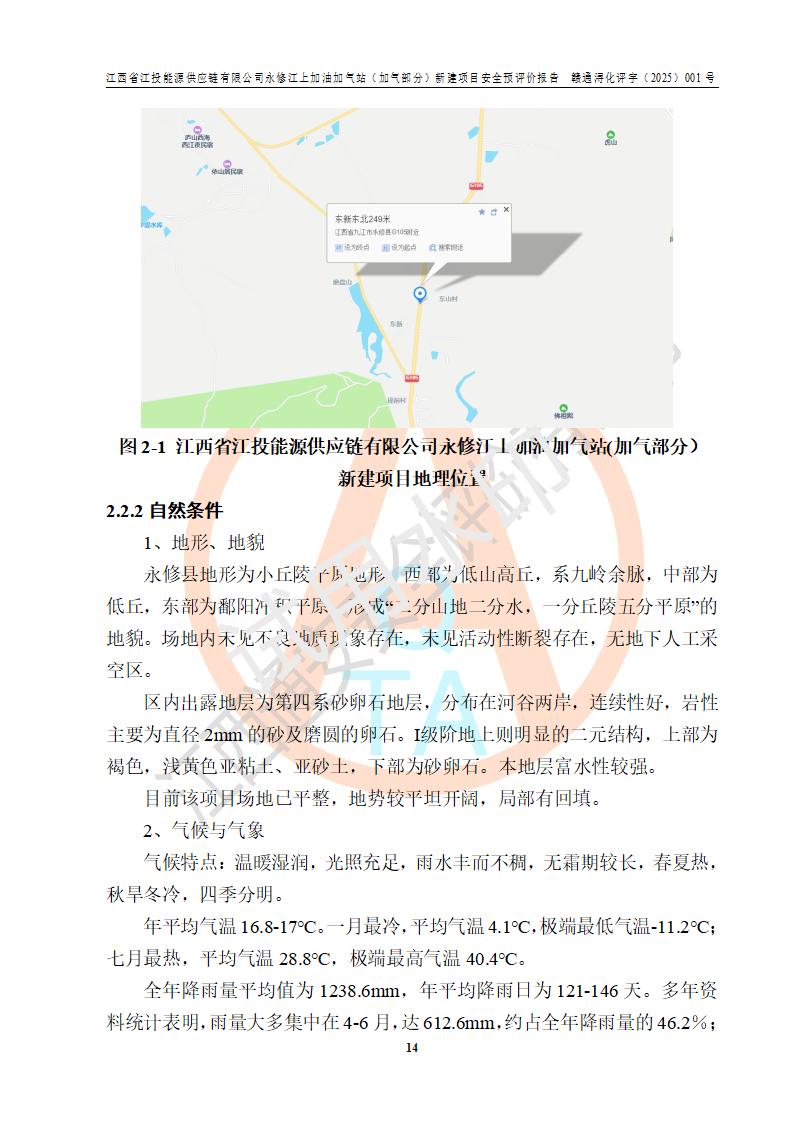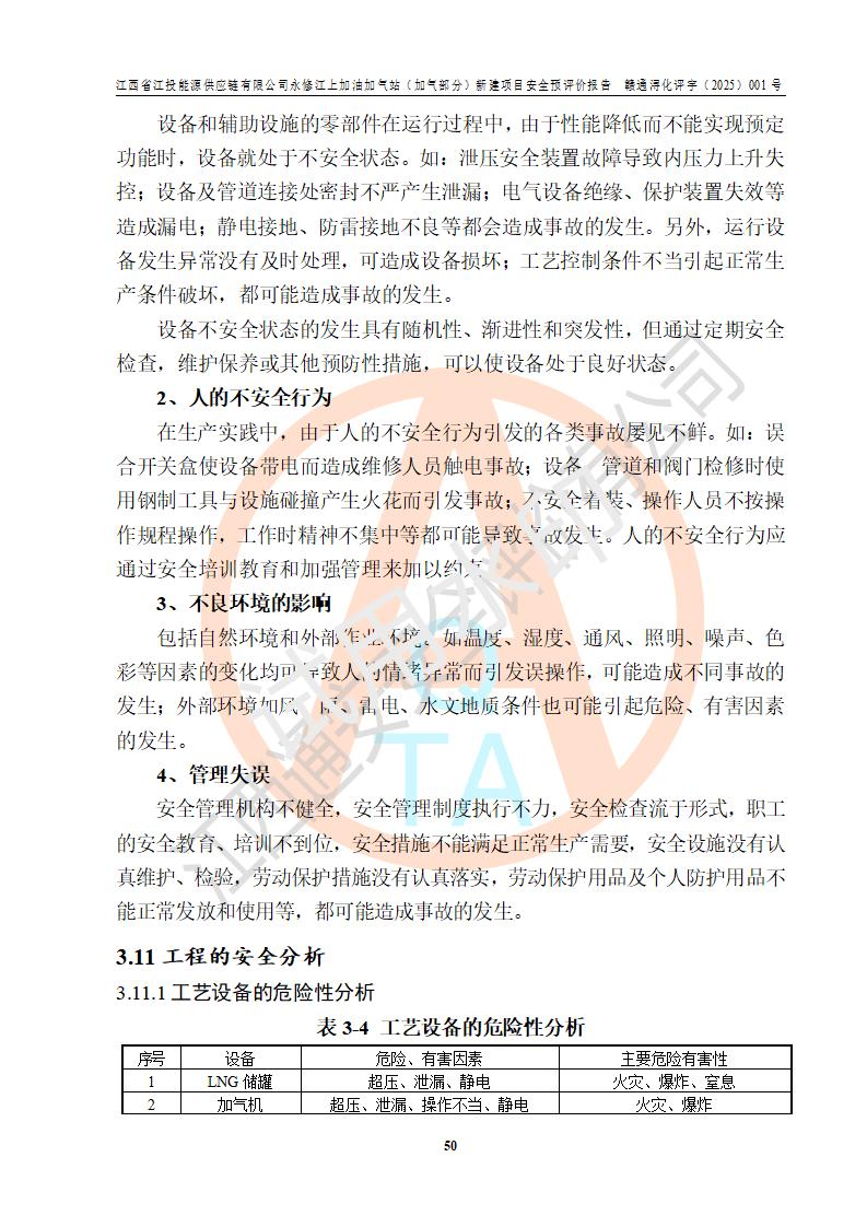 項(xiàng)目簡介 | 江西省江投能源供應(yīng)鏈有限公司是一家專門從事成品油經(jīng)營的有限責(zé)任公司(非自然人投資或控股的法人獨(dú)資),住所在江西省南昌市經(jīng)濟(jì)技術(shù)開發(fā)區(qū)雙港大道中聯(lián)村;現(xiàn)企業(yè)擬投資建設(shè)江西省江投能源供應(yīng)鏈有限公司永修江上加油加氣站新建項(xiàng)目,項(xiàng)目擬建地址在永修縣江上鄉(xiāng)105國道東側(cè),新建項(xiàng)目已取得九江市商務(wù)局網(wǎng)點(diǎn)規(guī)劃確認(rèn)的通知,同時(shí)已取得永修縣行政審批局簽發(fā)的《江西省企業(yè)投資項(xiàng)目備案通知書》,項(xiàng)目統(tǒng)一代碼為2410-360425-04-01-430117,該項(xiàng)目的建設(shè)用地已取得永修縣自然資源局頒發(fā)的不動(dòng)產(chǎn)權(quán)證書:贛(2024)永修縣不動(dòng)產(chǎn)權(quán)第0010955號(hào)。 該項(xiàng)目新建LNG加氣站擬與加油站合并建設(shè),加油站部分不在本次評價(jià)范圍,僅做一般性描述;該項(xiàng)目站房東側(cè)為加氣站罩棚,西側(cè)為加油站罩棚,加氣站罩棚東側(cè)擬設(shè)置LNG撬裝設(shè)備1臺(tái),加油站罐區(qū)擬設(shè)置在站區(qū)東南角,站區(qū)北側(cè)擬設(shè)置停車位,西部2個(gè)停車位擬設(shè)置1臺(tái)**充電樁(2槍),站區(qū)西北角擬設(shè)置一處預(yù)留自動(dòng)洗車機(jī)位置。 該項(xiàng)目新建加油站總用地面積為7160.52m2,屬于加油與LNG加氣合建站。站內(nèi)擬設(shè)60m3LNG臥式儲(chǔ)罐1臺(tái),2臺(tái)LNG單槍加氣機(jī),LNG低溫泵撬1套(2臺(tái)LNG潛液泵、1臺(tái)增壓器、1臺(tái)EAG氣化器),加氣能力為2×104Nm3/d。站內(nèi)加油部分?jǐn)M設(shè)2臺(tái)雙槍潛油泵加油機(jī)、2臺(tái)4槍潛油泵加油機(jī)及配套的工藝管線,擬設(shè)SF油品儲(chǔ)罐4臺(tái),其中30m3的0#柴油儲(chǔ)罐2臺(tái)、30m3的92#汽油儲(chǔ)罐1臺(tái)、30m3的95#汽油儲(chǔ)罐1臺(tái),油罐總?cè)莘e為120m3(折算成汽油容積為90m3),按現(xiàn)行的《汽車加油加氣加氫站技術(shù)標(biāo)準(zhǔn)》表3.0.16的規(guī)定劃分,該站屬二級(jí)加油與LNG加氣合建站。 依據(jù)《中華人民共和國安全生產(chǎn)法》、《燃?xì)饨?jīng)營許可管理辦法》、《城鎮(zhèn)燃?xì)夤芾項(xiàng)l例》等法律和規(guī)定的要求,新建、改建、擴(kuò)建危險(xiǎn)化學(xué)品儲(chǔ)存裝置和設(shè)施的建設(shè)項(xiàng)目安全條件審查(審批、核準(zhǔn)、備案)前,建設(shè)單位應(yīng)當(dāng)選擇有資質(zhì)的安全評價(jià)機(jī)構(gòu)對建設(shè)項(xiàng)目進(jìn)行安全條件評價(jià),以**工程項(xiàng)目的安全設(shè)施與主體工程同時(shí)設(shè)計(jì)、同時(shí)施工、同時(shí)投入使用,為**工程項(xiàng)目在安全生產(chǎn)及安全管理方面符合**及行業(yè)有關(guān)法律法規(guī)及標(biāo)準(zhǔn),江西省江投能源供應(yīng)鏈有限公司委托江西通安安全評價(jià)有限公司承擔(dān)江西省江投能源供應(yīng)鏈有限公司永修江上加油加氣站(加氣部分)新建項(xiàng)目的安全預(yù)評價(jià)。依據(jù)**的相關(guān)法律、法規(guī)及標(biāo)準(zhǔn),該企業(yè)應(yīng)辦理燃?xì)饨?jīng)營許可證。 江西通安安全評價(jià)有限公司接受委托后,成立了評價(jià)組,于2025年2月踏勘了建設(shè)地址。根據(jù)相關(guān)法律、法規(guī)和標(biāo)準(zhǔn)的規(guī)定,按照《安全評價(jià)通則》(AQ8001-2007)、《安全預(yù)評價(jià)導(dǎo)則》(AQ8002-2007)的要求,在資料收集、現(xiàn)場勘探和類比調(diào)查的基礎(chǔ)上,對項(xiàng)目的工程技術(shù)資料進(jìn)行了認(rèn)真分析。建設(shè)項(xiàng)目內(nèi)在的危險(xiǎn)、有害因素對建設(shè)項(xiàng)目周邊單位生產(chǎn)、經(jīng)營活動(dòng)或者居民生活的影響以及建設(shè)項(xiàng)目周邊單位生產(chǎn)、經(jīng)營活動(dòng)或者居民生活對建設(shè)項(xiàng)目的影響等,經(jīng)過定性分析與定量計(jì)算,編制完成了本建設(shè)項(xiàng)目安全預(yù)評價(jià)報(bào)告,為相關(guān)部門實(shí)行安全監(jiān)察、為**相關(guān)部門建設(shè)項(xiàng)目設(shè)立安全審查以及為企業(yè)建設(shè)項(xiàng)目實(shí)施“三同時(shí)”提供安全技術(shù)依據(jù)。 本次安全評價(jià)范圍:江西省江投能源供應(yīng)鏈有限公司永修江上加油加氣站(加氣部分)新建項(xiàng)目的選址、總平面布置、主體裝置和輔助設(shè)施的安全條件,包括經(jīng)營過程中的危險(xiǎn)和危害因素、建設(shè)項(xiàng)目的安全條件以及規(guī)劃設(shè)計(jì)中提出的工藝、設(shè)備設(shè)施的安全可靠性和勞動(dòng)安全管理方面的組織、機(jī)構(gòu)、人員、防護(hù)設(shè)施、作業(yè)環(huán)境及管理制度等。 該項(xiàng)目新建LNG加氣站擬與加油站合并建設(shè),加油站油罐區(qū)、加油區(qū)、充電樁、洗車機(jī)部分不在本次評價(jià)范圍,僅進(jìn)行加油站對LNG加氣站的影響進(jìn)行評價(jià),僅作一般性描述。該新建項(xiàng)目的公用工程、自控系統(tǒng)共用,涉及工程的環(huán)境、消防及職業(yè)衛(wèi)生等問題則應(yīng)執(zhí)行**的有關(guān)規(guī)定及相關(guān)標(biāo)準(zhǔn)。 | ||||||