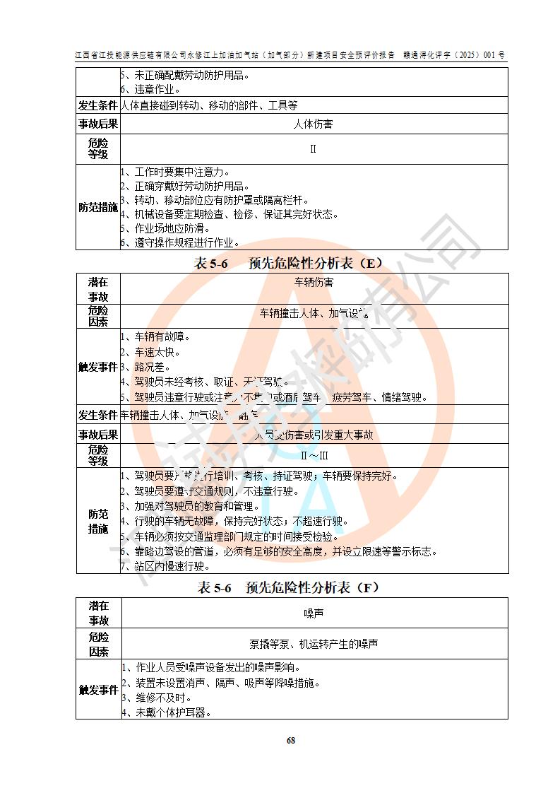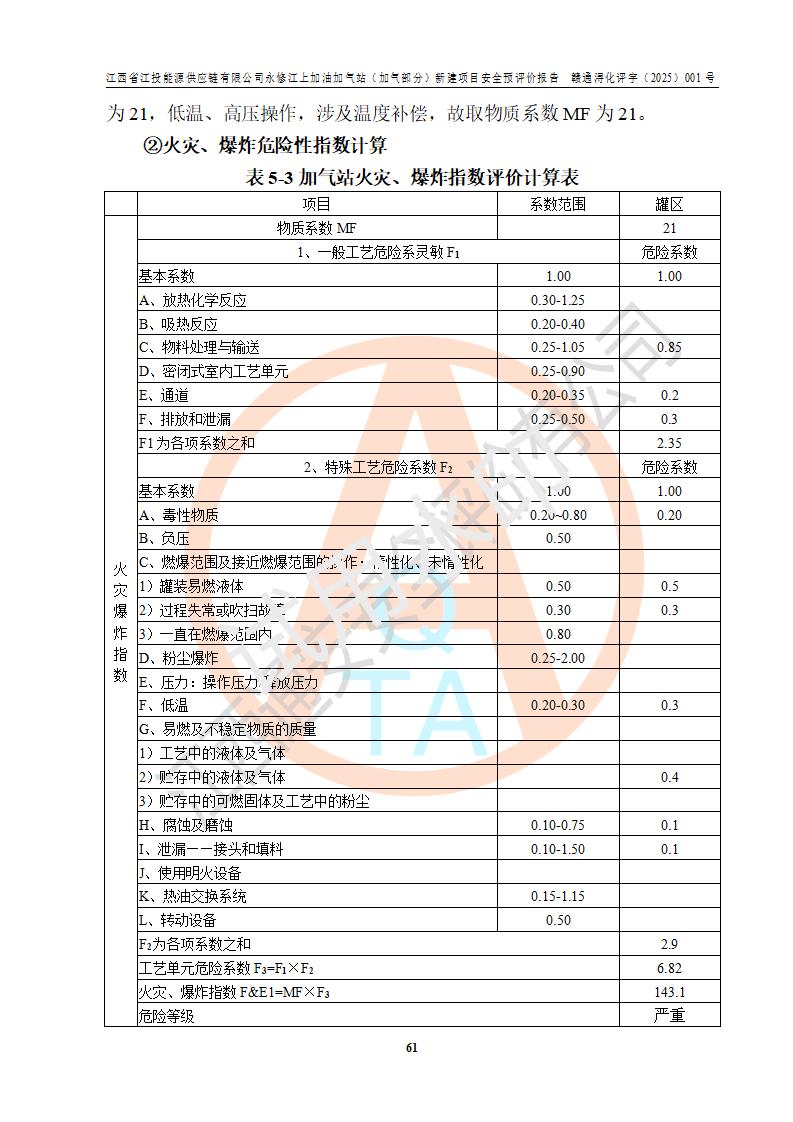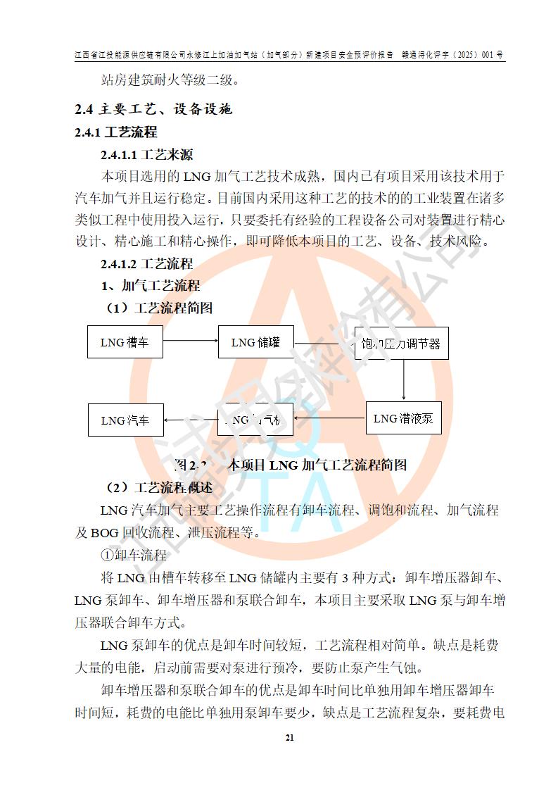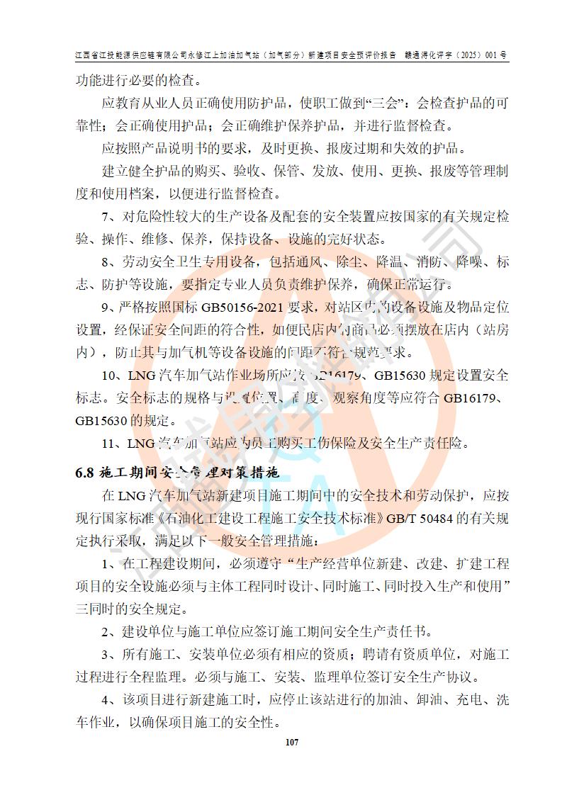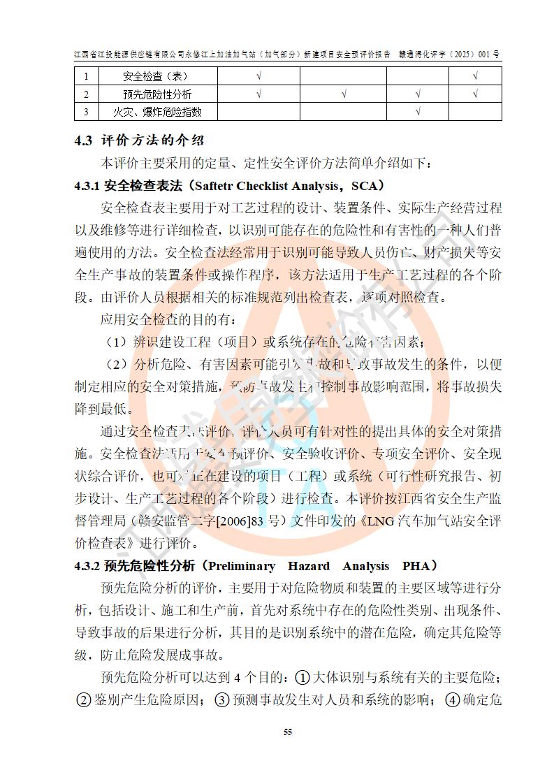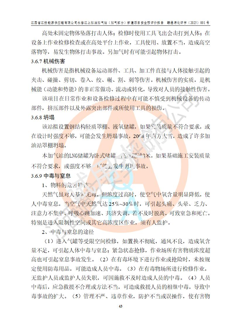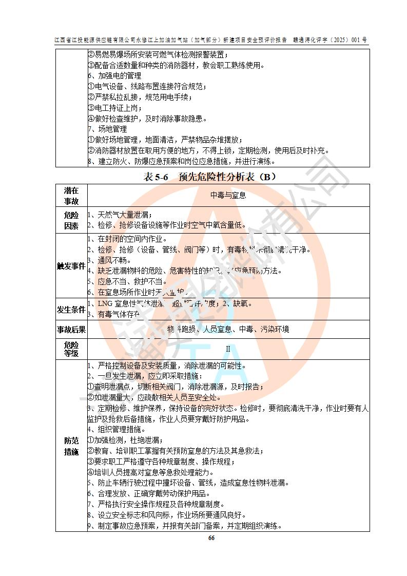 項(xiàng)目簡介 | 江西省江投能源供應(yīng)鏈有限公司是一家專門從事成品油經(jīng)營的有限責(zé)任公司(非自然人投資或控股的法人獨(dú)資),住所在江西省南昌市經(jīng)濟(jì)技術(shù)開發(fā)區(qū)雙港大道中聯(lián)村;現(xiàn)企業(yè)擬投資建設(shè)江西省江投能源供應(yīng)鏈有限公司永修江上加油加氣站新建項(xiàng)目,項(xiàng)目擬建地址在永修縣江上鄉(xiāng)105國道東側(cè),新建項(xiàng)目已取得九江市商務(wù)局網(wǎng)點(diǎn)規(guī)劃確認(rèn)的通知,同時(shí)已取得永修縣行政審批局簽發(fā)的《江西省企業(yè)投資項(xiàng)目備案通知書》,項(xiàng)目統(tǒng)一代碼為2410-360425-04-01-430117,該項(xiàng)目的建設(shè)用地已取得永修縣自然資源局頒發(fā)的不動(dòng)產(chǎn)權(quán)證書:贛(2024)永修縣不動(dòng)產(chǎn)權(quán)第0010955號(hào)。 該項(xiàng)目新建LNG加氣站擬與加油站合并建設(shè),加油站部分不在本次評價(jià)范圍,僅做一般性描述;該項(xiàng)目站房東側(cè)為加氣站罩棚,西側(cè)為加油站罩棚,加氣站罩棚東側(cè)擬設(shè)置LNG撬裝設(shè)備1臺(tái),加油站罐區(qū)擬設(shè)置在站區(qū)東南角,站區(qū)北側(cè)擬設(shè)置停車位,西部2個(gè)停車位擬設(shè)置1臺(tái)**充電樁(2槍),站區(qū)西北角擬設(shè)置一處預(yù)留自動(dòng)洗車機(jī)位置。 該項(xiàng)目新建加油站總用地面積為7160.52m2,屬于加油與LNG加氣合建站。站內(nèi)擬設(shè)60m3LNG臥式儲(chǔ)罐1臺(tái),2臺(tái)LNG單槍加氣機(jī),LNG低溫泵撬1套(2臺(tái)LNG潛液泵、1臺(tái)增壓器、1臺(tái)EAG氣化器),加氣能力為2×104Nm3/d。站內(nèi)加油部分?jǐn)M設(shè)2臺(tái)雙槍潛油泵加油機(jī)、2臺(tái)4槍潛油泵加油機(jī)及配套的工藝管線,擬設(shè)SF油品儲(chǔ)罐4臺(tái),其中30m3的0#柴油儲(chǔ)罐2臺(tái)、30m3的92#汽油儲(chǔ)罐1臺(tái)、30m3的95#汽油儲(chǔ)罐1臺(tái),油罐總?cè)莘e為120m3(折算成汽油容積為90m3),按現(xiàn)行的《汽車加油加氣加氫站技術(shù)標(biāo)準(zhǔn)》表3.0.16的規(guī)定劃分,該站屬二級(jí)加油與LNG加氣合建站。 依據(jù)《中華人民共和國安全生產(chǎn)法》、《燃?xì)饨?jīng)營許可管理辦法》、《城鎮(zhèn)燃?xì)夤芾項(xiàng)l例》等法律和規(guī)定的要求,新建、改建、擴(kuò)建危險(xiǎn)化學(xué)品儲(chǔ)存裝置和設(shè)施的建設(shè)項(xiàng)目安全條件審查(審批、核準(zhǔn)、備案)前,建設(shè)單位應(yīng)當(dāng)選擇有資質(zhì)的安全評價(jià)機(jī)構(gòu)對建設(shè)項(xiàng)目進(jìn)行安全條件評價(jià),以**工程項(xiàng)目的安全設(shè)施與主體工程同時(shí)設(shè)計(jì)、同時(shí)施工、同時(shí)投入使用,為**工程項(xiàng)目在安全生產(chǎn)及安全管理方面符合**及行業(yè)有關(guān)法律法規(guī)及標(biāo)準(zhǔn),江西省江投能源供應(yīng)鏈有限公司委托江西通安安全評價(jià)有限公司承擔(dān)江西省江投能源供應(yīng)鏈有限公司永修江上加油加氣站(加氣部分)新建項(xiàng)目的安全預(yù)評價(jià)。依據(jù)**的相關(guān)法律、法規(guī)及標(biāo)準(zhǔn),該企業(yè)應(yīng)辦理燃?xì)饨?jīng)營許可證。 江西通安安全評價(jià)有限公司接受委托后,成立了評價(jià)組,于2025年2月踏勘了建設(shè)地址。根據(jù)相關(guān)法律、法規(guī)和標(biāo)準(zhǔn)的規(guī)定,按照《安全評價(jià)通則》(AQ8001-2007)、《安全預(yù)評價(jià)導(dǎo)則》(AQ8002-2007)的要求,在資料收集、現(xiàn)場勘探和類比調(diào)查的基礎(chǔ)上,對項(xiàng)目的工程技術(shù)資料進(jìn)行了認(rèn)真分析。建設(shè)項(xiàng)目內(nèi)在的危險(xiǎn)、有害因素對建設(shè)項(xiàng)目周邊單位生產(chǎn)、經(jīng)營活動(dòng)或者居民生活的影響以及建設(shè)項(xiàng)目周邊單位生產(chǎn)、經(jīng)營活動(dòng)或者居民生活對建設(shè)項(xiàng)目的影響等,經(jīng)過定性分析與定量計(jì)算,編制完成了本建設(shè)項(xiàng)目安全預(yù)評價(jià)報(bào)告,為相關(guān)部門實(shí)行安全監(jiān)察、為**相關(guān)部門建設(shè)項(xiàng)目設(shè)立安全審查以及為企業(yè)建設(shè)項(xiàng)目實(shí)施“三同時(shí)”提供安全技術(shù)依據(jù)。 本次安全評價(jià)范圍:江西省江投能源供應(yīng)鏈有限公司永修江上加油加氣站(加氣部分)新建項(xiàng)目的選址、總平面布置、主體裝置和輔助設(shè)施的安全條件,包括經(jīng)營過程中的危險(xiǎn)和危害因素、建設(shè)項(xiàng)目的安全條件以及規(guī)劃設(shè)計(jì)中提出的工藝、設(shè)備設(shè)施的安全可靠性和勞動(dòng)安全管理方面的組織、機(jī)構(gòu)、人員、防護(hù)設(shè)施、作業(yè)環(huán)境及管理制度等。 該項(xiàng)目新建LNG加氣站擬與加油站合并建設(shè),加油站油罐區(qū)、加油區(qū)、充電樁、洗車機(jī)部分不在本次評價(jià)范圍,僅進(jìn)行加油站對LNG加氣站的影響進(jìn)行評價(jià),僅作一般性描述。該新建項(xiàng)目的公用工程、自控系統(tǒng)共用,涉及工程的環(huán)境、消防及職業(yè)衛(wèi)生等問題則應(yīng)執(zhí)行**的有關(guān)規(guī)定及相關(guān)標(biāo)準(zhǔn)。 | ||||||