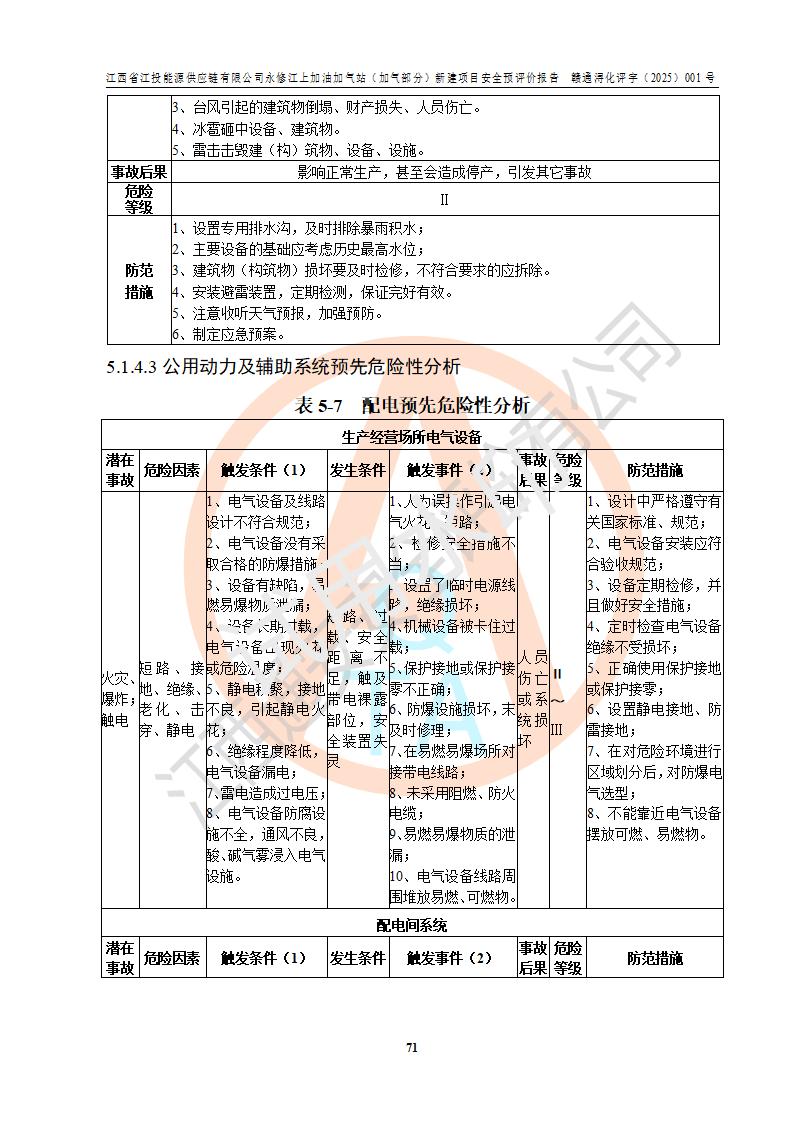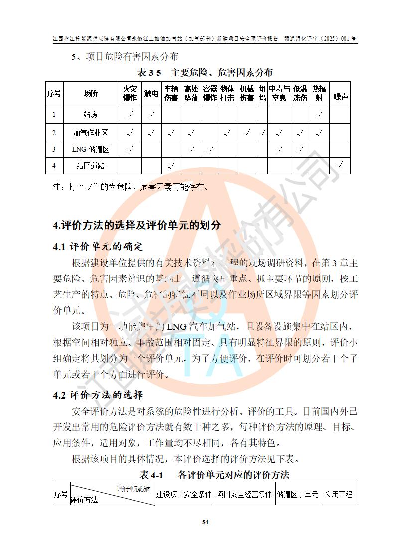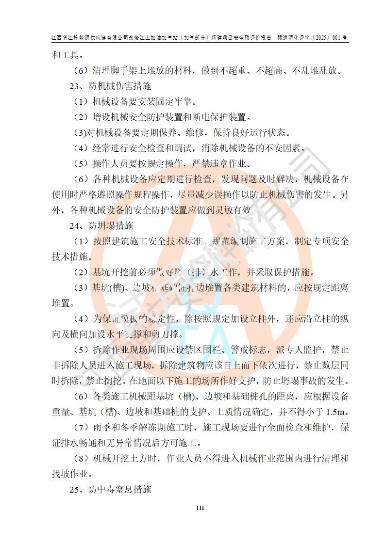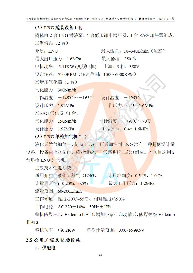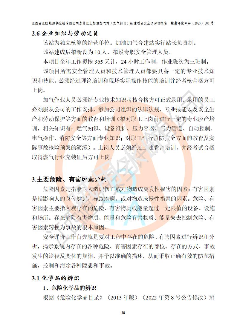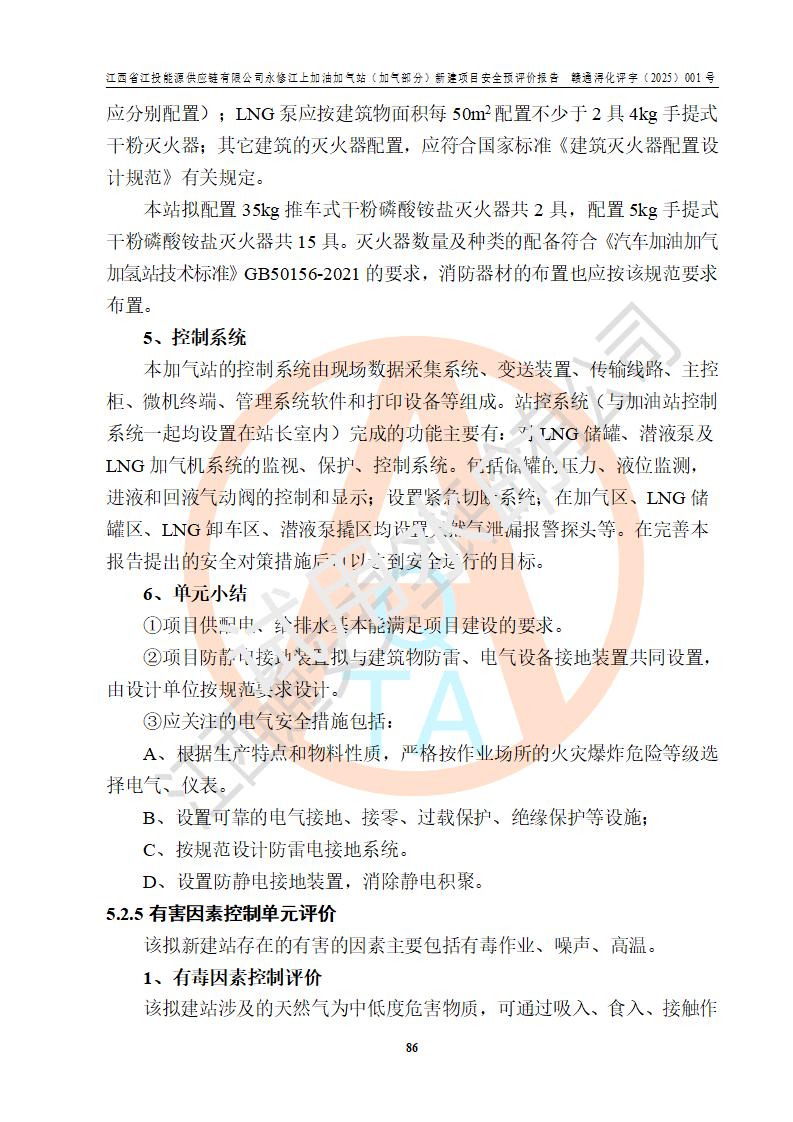 項(xiàng)目簡介 | 江西省江投能源供應(yīng)鏈有限公司是一家專門從事成品油經(jīng)營的有限責(zé)任公司(非自然人投資或控股的法人獨(dú)資),住所在江西省南昌市經(jīng)濟(jì)技術(shù)開發(fā)區(qū)雙港大道中聯(lián)村;現(xiàn)企業(yè)擬投資建設(shè)江西省江投能源供應(yīng)鏈有限公司永修江上加油加氣站新建項(xiàng)目,項(xiàng)目擬建地址在永修縣江上鄉(xiāng)105國道東側(cè),新建項(xiàng)目已取得九江市商務(wù)局網(wǎng)點(diǎn)規(guī)劃確認(rèn)的通知,同時(shí)已取得永修縣行政審批局簽發(fā)的《江西省企業(yè)投資項(xiàng)目備案通知書》,項(xiàng)目統(tǒng)一代碼為2410-360425-04-01-430117,該項(xiàng)目的建設(shè)用地已取得永修縣自然資源局頒發(fā)的不動(dòng)產(chǎn)權(quán)證書:贛(2024)永修縣不動(dòng)產(chǎn)權(quán)第0010955號(hào)。 該項(xiàng)目新建LNG加氣站擬與加油站合并建設(shè),加油站部分不在本次評價(jià)范圍,僅做一般性描述;該項(xiàng)目站房東側(cè)為加氣站罩棚,西側(cè)為加油站罩棚,加氣站罩棚東側(cè)擬設(shè)置LNG撬裝設(shè)備1臺(tái),加油站罐區(qū)擬設(shè)置在站區(qū)東南角,站區(qū)北側(cè)擬設(shè)置停車位,西部2個(gè)停車位擬設(shè)置1臺(tái)**充電樁(2槍),站區(qū)西北角擬設(shè)置一處預(yù)留自動(dòng)洗車機(jī)位置。 該項(xiàng)目新建加油站總用地面積為7160.52m2,屬于加油與LNG加氣合建站。站內(nèi)擬設(shè)60m3LNG臥式儲(chǔ)罐1臺(tái),2臺(tái)LNG單槍加氣機(jī),LNG低溫泵撬1套(2臺(tái)LNG潛液泵、1臺(tái)增壓器、1臺(tái)EAG氣化器),加氣能力為2×104Nm3/d。站內(nèi)加油部分?jǐn)M設(shè)2臺(tái)雙槍潛油泵加油機(jī)、2臺(tái)4槍潛油泵加油機(jī)及配套的工藝管線,擬設(shè)SF油品儲(chǔ)罐4臺(tái),其中30m3的0#柴油儲(chǔ)罐2臺(tái)、30m3的92#汽油儲(chǔ)罐1臺(tái)、30m3的95#汽油儲(chǔ)罐1臺(tái),油罐總?cè)莘e為120m3(折算成汽油容積為90m3),按現(xiàn)行的《汽車加油加氣加氫站技術(shù)標(biāo)準(zhǔn)》表3.0.16的規(guī)定劃分,該站屬二級(jí)加油與LNG加氣合建站。 依據(jù)《中華人民共和國安全生產(chǎn)法》、《燃?xì)饨?jīng)營許可管理辦法》、《城鎮(zhèn)燃?xì)夤芾項(xiàng)l例》等法律和規(guī)定的要求,新建、改建、擴(kuò)建危險(xiǎn)化學(xué)品儲(chǔ)存裝置和設(shè)施的建設(shè)項(xiàng)目安全條件審查(審批、核準(zhǔn)、備案)前,建設(shè)單位應(yīng)當(dāng)選擇有資質(zhì)的安全評價(jià)機(jī)構(gòu)對建設(shè)項(xiàng)目進(jìn)行安全條件評價(jià),以**工程項(xiàng)目的安全設(shè)施與主體工程同時(shí)設(shè)計(jì)、同時(shí)施工、同時(shí)投入使用,為**工程項(xiàng)目在安全生產(chǎn)及安全管理方面符合**及行業(yè)有關(guān)法律法規(guī)及標(biāo)準(zhǔn),江西省江投能源供應(yīng)鏈有限公司委托江西通安安全評價(jià)有限公司承擔(dān)江西省江投能源供應(yīng)鏈有限公司永修江上加油加氣站(加氣部分)新建項(xiàng)目的安全預(yù)評價(jià)。依據(jù)**的相關(guān)法律、法規(guī)及標(biāo)準(zhǔn),該企業(yè)應(yīng)辦理燃?xì)饨?jīng)營許可證。 江西通安安全評價(jià)有限公司接受委托后,成立了評價(jià)組,于2025年2月踏勘了建設(shè)地址。根據(jù)相關(guān)法律、法規(guī)和標(biāo)準(zhǔn)的規(guī)定,按照《安全評價(jià)通則》(AQ8001-2007)、《安全預(yù)評價(jià)導(dǎo)則》(AQ8002-2007)的要求,在資料收集、現(xiàn)場勘探和類比調(diào)查的基礎(chǔ)上,對項(xiàng)目的工程技術(shù)資料進(jìn)行了認(rèn)真分析。建設(shè)項(xiàng)目內(nèi)在的危險(xiǎn)、有害因素對建設(shè)項(xiàng)目周邊單位生產(chǎn)、經(jīng)營活動(dòng)或者居民生活的影響以及建設(shè)項(xiàng)目周邊單位生產(chǎn)、經(jīng)營活動(dòng)或者居民生活對建設(shè)項(xiàng)目的影響等,經(jīng)過定性分析與定量計(jì)算,編制完成了本建設(shè)項(xiàng)目安全預(yù)評價(jià)報(bào)告,為相關(guān)部門實(shí)行安全監(jiān)察、為**相關(guān)部門建設(shè)項(xiàng)目設(shè)立安全審查以及為企業(yè)建設(shè)項(xiàng)目實(shí)施“三同時(shí)”提供安全技術(shù)依據(jù)。 本次安全評價(jià)范圍:江西省江投能源供應(yīng)鏈有限公司永修江上加油加氣站(加氣部分)新建項(xiàng)目的選址、總平面布置、主體裝置和輔助設(shè)施的安全條件,包括經(jīng)營過程中的危險(xiǎn)和危害因素、建設(shè)項(xiàng)目的安全條件以及規(guī)劃設(shè)計(jì)中提出的工藝、設(shè)備設(shè)施的安全可靠性和勞動(dòng)安全管理方面的組織、機(jī)構(gòu)、人員、防護(hù)設(shè)施、作業(yè)環(huán)境及管理制度等。 該項(xiàng)目新建LNG加氣站擬與加油站合并建設(shè),加油站油罐區(qū)、加油區(qū)、充電樁、洗車機(jī)部分不在本次評價(jià)范圍,僅進(jìn)行加油站對LNG加氣站的影響進(jìn)行評價(jià),僅作一般性描述。該新建項(xiàng)目的公用工程、自控系統(tǒng)共用,涉及工程的環(huán)境、消防及職業(yè)衛(wèi)生等問題則應(yīng)執(zhí)行**的有關(guān)規(guī)定及相關(guān)標(biāo)準(zhǔn)。 | ||||||