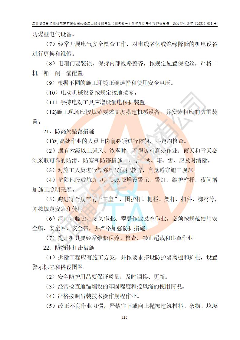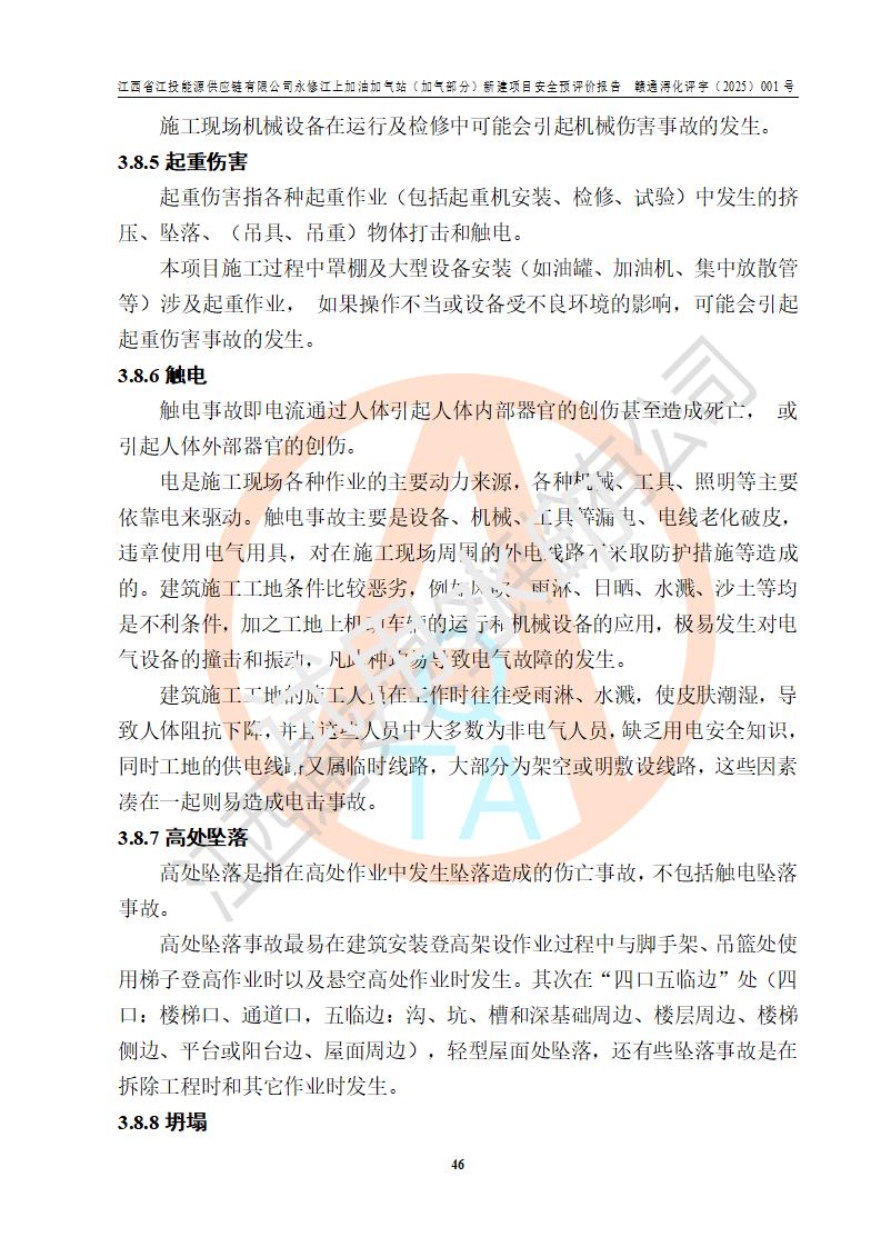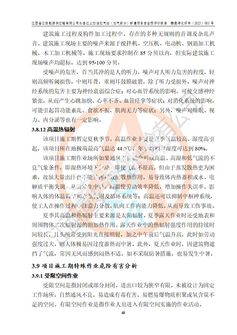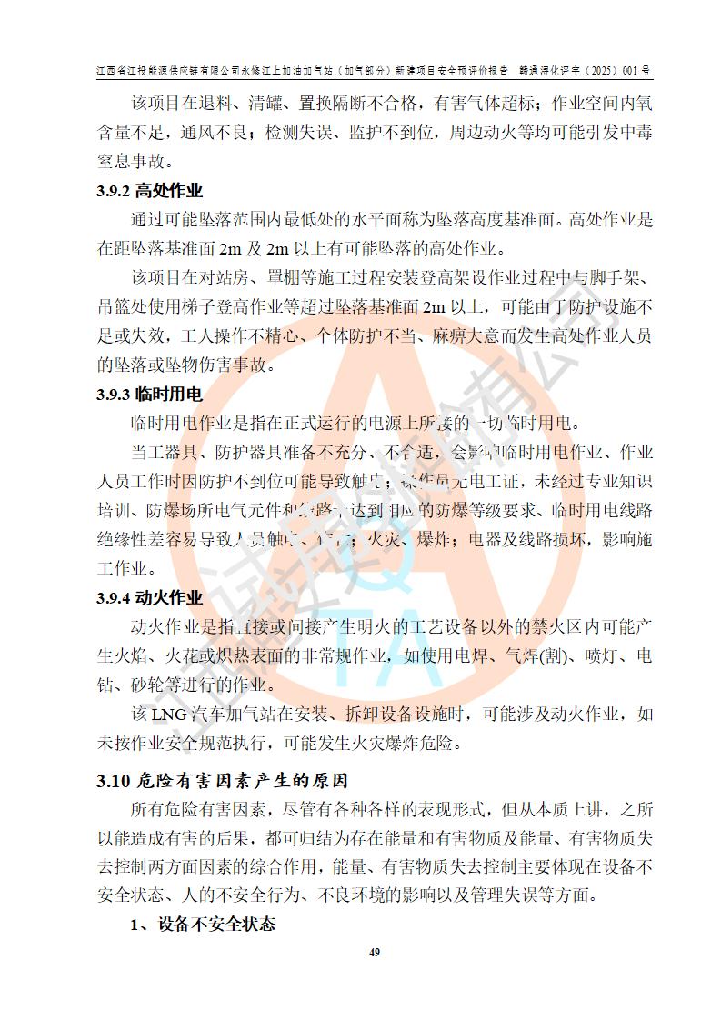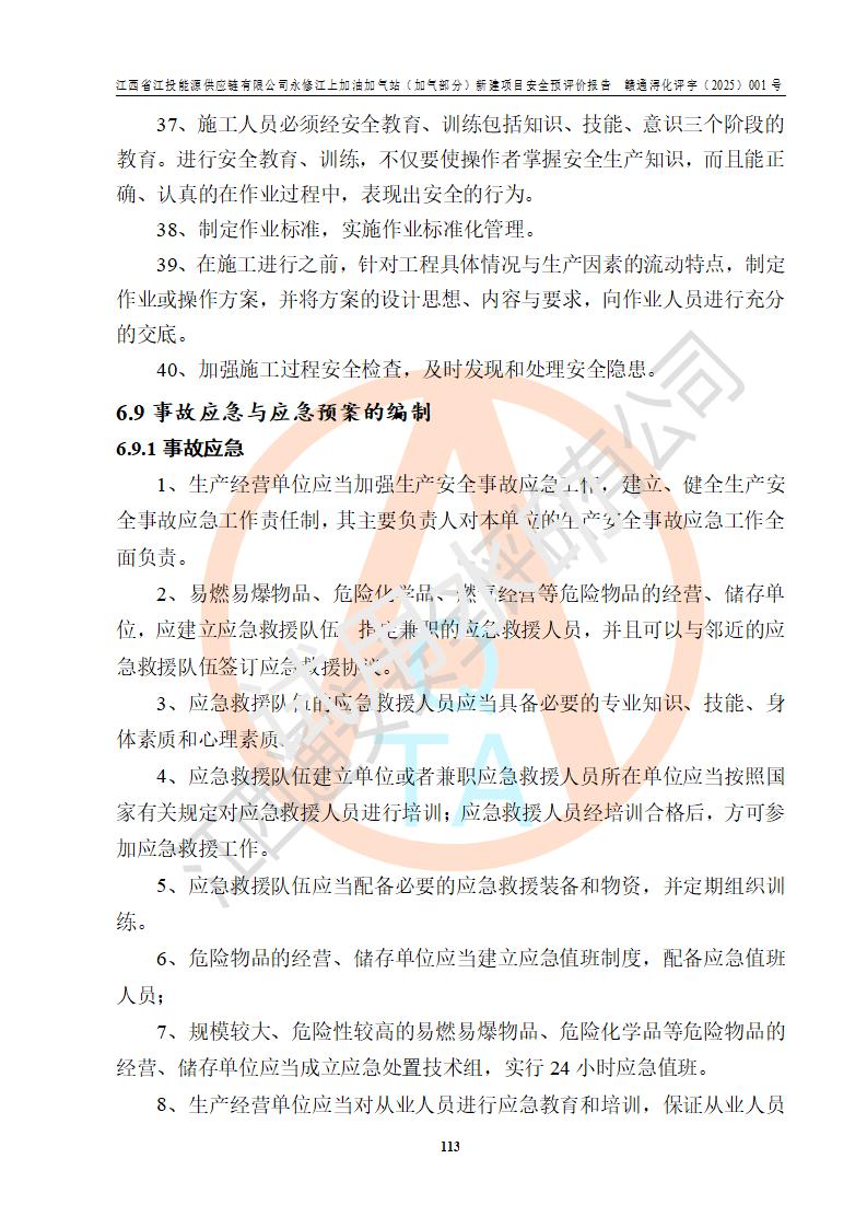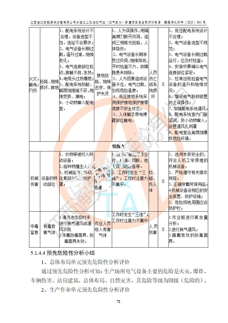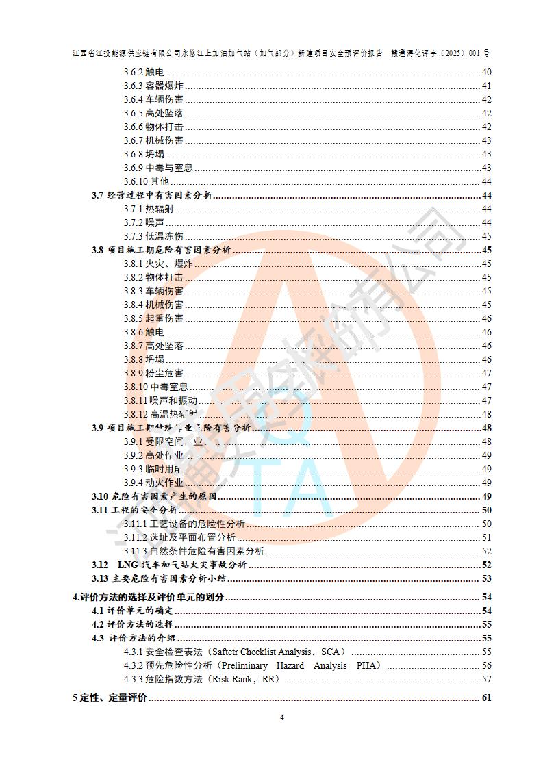 項(xiàng)目簡介 | 江西省江投能源供應(yīng)鏈有限公司是一家專門從事成品油經(jīng)營的有限責(zé)任公司(非自然人投資或控股的法人獨(dú)資),住所在江西省南昌市經(jīng)濟(jì)技術(shù)開發(fā)區(qū)雙港大道中聯(lián)村;現(xiàn)企業(yè)擬投資建設(shè)江西省江投能源供應(yīng)鏈有限公司永修江上加油加氣站新建項(xiàng)目,項(xiàng)目擬建地址在永修縣江上鄉(xiāng)105國道東側(cè),新建項(xiàng)目已取得九江市商務(wù)局網(wǎng)點(diǎn)規(guī)劃確認(rèn)的通知,同時(shí)已取得永修縣行政審批局簽發(fā)的《江西省企業(yè)投資項(xiàng)目備案通知書》,項(xiàng)目統(tǒng)一代碼為2410-360425-04-01-430117,該項(xiàng)目的建設(shè)用地已取得永修縣自然資源局頒發(fā)的不動(dòng)產(chǎn)權(quán)證書:贛(2024)永修縣不動(dòng)產(chǎn)權(quán)第0010955號(hào)。 該項(xiàng)目新建LNG加氣站擬與加油站合并建設(shè),加油站部分不在本次評價(jià)范圍,僅做一般性描述;該項(xiàng)目站房東側(cè)為加氣站罩棚,西側(cè)為加油站罩棚,加氣站罩棚東側(cè)擬設(shè)置LNG撬裝設(shè)備1臺(tái),加油站罐區(qū)擬設(shè)置在站區(qū)東南角,站區(qū)北側(cè)擬設(shè)置停車位,西部2個(gè)停車位擬設(shè)置1臺(tái)**充電樁(2槍),站區(qū)西北角擬設(shè)置一處預(yù)留自動(dòng)洗車機(jī)位置。 該項(xiàng)目新建加油站總用地面積為7160.52m2,屬于加油與LNG加氣合建站。站內(nèi)擬設(shè)60m3LNG臥式儲(chǔ)罐1臺(tái),2臺(tái)LNG單槍加氣機(jī),LNG低溫泵撬1套(2臺(tái)LNG潛液泵、1臺(tái)增壓器、1臺(tái)EAG氣化器),加氣能力為2×104Nm3/d。站內(nèi)加油部分?jǐn)M設(shè)2臺(tái)雙槍潛油泵加油機(jī)、2臺(tái)4槍潛油泵加油機(jī)及配套的工藝管線,擬設(shè)SF油品儲(chǔ)罐4臺(tái),其中30m3的0#柴油儲(chǔ)罐2臺(tái)、30m3的92#汽油儲(chǔ)罐1臺(tái)、30m3的95#汽油儲(chǔ)罐1臺(tái),油罐總?cè)莘e為120m3(折算成汽油容積為90m3),按現(xiàn)行的《汽車加油加氣加氫站技術(shù)標(biāo)準(zhǔn)》表3.0.16的規(guī)定劃分,該站屬二級(jí)加油與LNG加氣合建站。 依據(jù)《中華人民共和國安全生產(chǎn)法》、《燃?xì)饨?jīng)營許可管理辦法》、《城鎮(zhèn)燃?xì)夤芾項(xiàng)l例》等法律和規(guī)定的要求,新建、改建、擴(kuò)建危險(xiǎn)化學(xué)品儲(chǔ)存裝置和設(shè)施的建設(shè)項(xiàng)目安全條件審查(審批、核準(zhǔn)、備案)前,建設(shè)單位應(yīng)當(dāng)選擇有資質(zhì)的安全評價(jià)機(jī)構(gòu)對建設(shè)項(xiàng)目進(jìn)行安全條件評價(jià),以**工程項(xiàng)目的安全設(shè)施與主體工程同時(shí)設(shè)計(jì)、同時(shí)施工、同時(shí)投入使用,為**工程項(xiàng)目在安全生產(chǎn)及安全管理方面符合**及行業(yè)有關(guān)法律法規(guī)及標(biāo)準(zhǔn),江西省江投能源供應(yīng)鏈有限公司委托江西通安安全評價(jià)有限公司承擔(dān)江西省江投能源供應(yīng)鏈有限公司永修江上加油加氣站(加氣部分)新建項(xiàng)目的安全預(yù)評價(jià)。依據(jù)**的相關(guān)法律、法規(guī)及標(biāo)準(zhǔn),該企業(yè)應(yīng)辦理燃?xì)饨?jīng)營許可證。 江西通安安全評價(jià)有限公司接受委托后,成立了評價(jià)組,于2025年2月踏勘了建設(shè)地址。根據(jù)相關(guān)法律、法規(guī)和標(biāo)準(zhǔn)的規(guī)定,按照《安全評價(jià)通則》(AQ8001-2007)、《安全預(yù)評價(jià)導(dǎo)則》(AQ8002-2007)的要求,在資料收集、現(xiàn)場勘探和類比調(diào)查的基礎(chǔ)上,對項(xiàng)目的工程技術(shù)資料進(jìn)行了認(rèn)真分析。建設(shè)項(xiàng)目內(nèi)在的危險(xiǎn)、有害因素對建設(shè)項(xiàng)目周邊單位生產(chǎn)、經(jīng)營活動(dòng)或者居民生活的影響以及建設(shè)項(xiàng)目周邊單位生產(chǎn)、經(jīng)營活動(dòng)或者居民生活對建設(shè)項(xiàng)目的影響等,經(jīng)過定性分析與定量計(jì)算,編制完成了本建設(shè)項(xiàng)目安全預(yù)評價(jià)報(bào)告,為相關(guān)部門實(shí)行安全監(jiān)察、為**相關(guān)部門建設(shè)項(xiàng)目設(shè)立安全審查以及為企業(yè)建設(shè)項(xiàng)目實(shí)施“三同時(shí)”提供安全技術(shù)依據(jù)。 本次安全評價(jià)范圍:江西省江投能源供應(yīng)鏈有限公司永修江上加油加氣站(加氣部分)新建項(xiàng)目的選址、總平面布置、主體裝置和輔助設(shè)施的安全條件,包括經(jīng)營過程中的危險(xiǎn)和危害因素、建設(shè)項(xiàng)目的安全條件以及規(guī)劃設(shè)計(jì)中提出的工藝、設(shè)備設(shè)施的安全可靠性和勞動(dòng)安全管理方面的組織、機(jī)構(gòu)、人員、防護(hù)設(shè)施、作業(yè)環(huán)境及管理制度等。 該項(xiàng)目新建LNG加氣站擬與加油站合并建設(shè),加油站油罐區(qū)、加油區(qū)、充電樁、洗車機(jī)部分不在本次評價(jià)范圍,僅進(jìn)行加油站對LNG加氣站的影響進(jìn)行評價(jià),僅作一般性描述。該新建項(xiàng)目的公用工程、自控系統(tǒng)共用,涉及工程的環(huán)境、消防及職業(yè)衛(wèi)生等問題則應(yīng)執(zhí)行**的有關(guān)規(guī)定及相關(guān)標(biāo)準(zhǔn)。 | ||||||