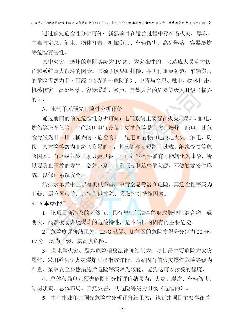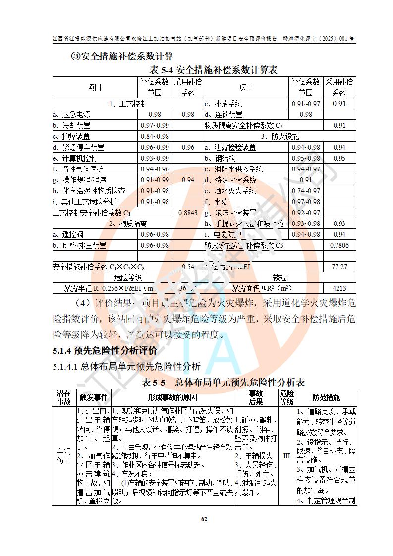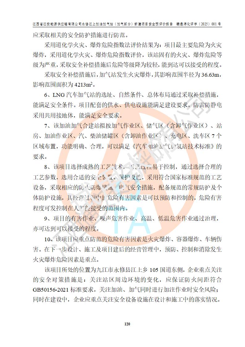 評價(jià)結(jié)論 | 綜上所述:江西省江投能源供應(yīng)鏈有限公司永修江上加油加氣站(加氣部分)的選址、自然條件適宜該項(xiàng)目工程的建設(shè);項(xiàng)目規(guī)劃設(shè)計(jì)中的總體布局方案可行,符合有關(guān)法規(guī)、標(biāo)準(zhǔn)要求;項(xiàng)目選擇的工藝過程及設(shè)備設(shè)施的安全可靠性能達(dá)到**法規(guī)、標(biāo)準(zhǔn)規(guī)定要求;項(xiàng)目存在的危險(xiǎn)有害因素可控,在落實(shí)項(xiàng)目建設(shè)方案及評價(jià)報(bào)告提出的有關(guān)安全對策措施后,其危險(xiǎn)有害程度能達(dá)到可以接受的程度,項(xiàng)目建設(shè)能夠?qū)崿F(xiàn)安全運(yùn)行的目標(biāo)。 | ||||||