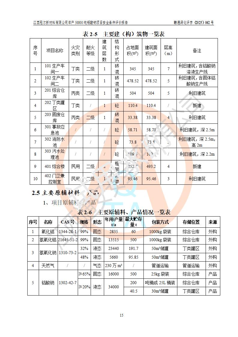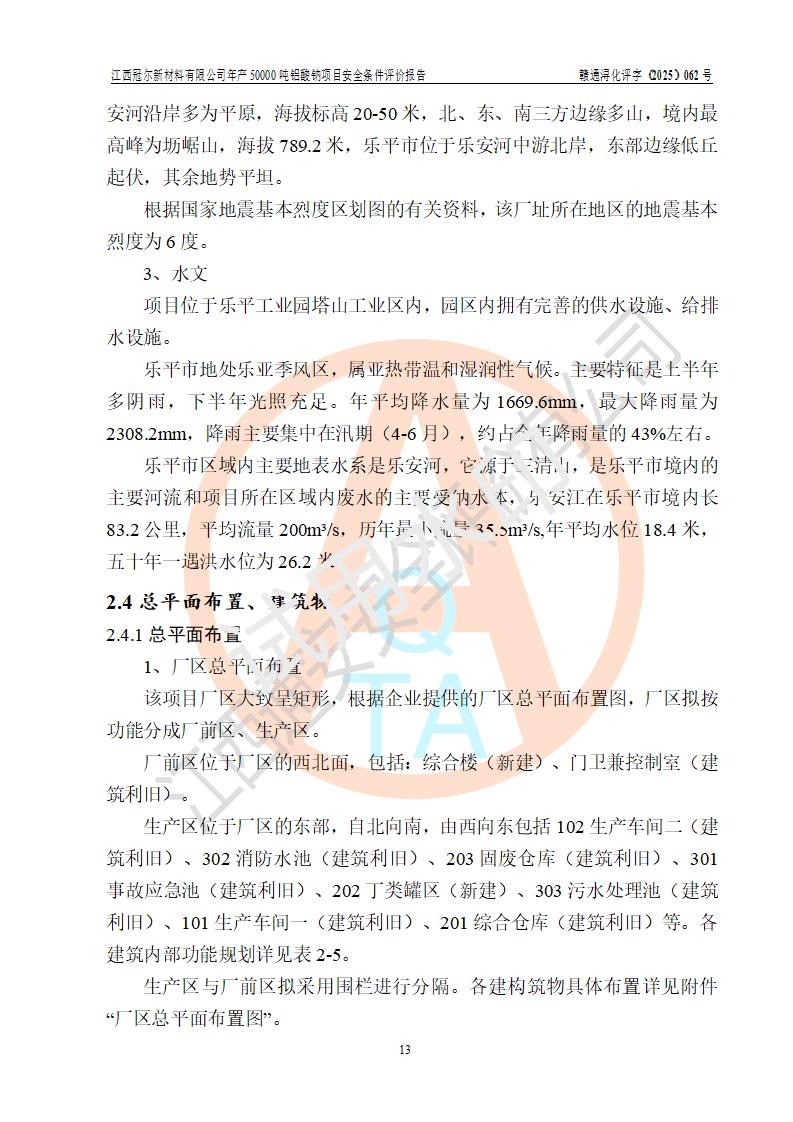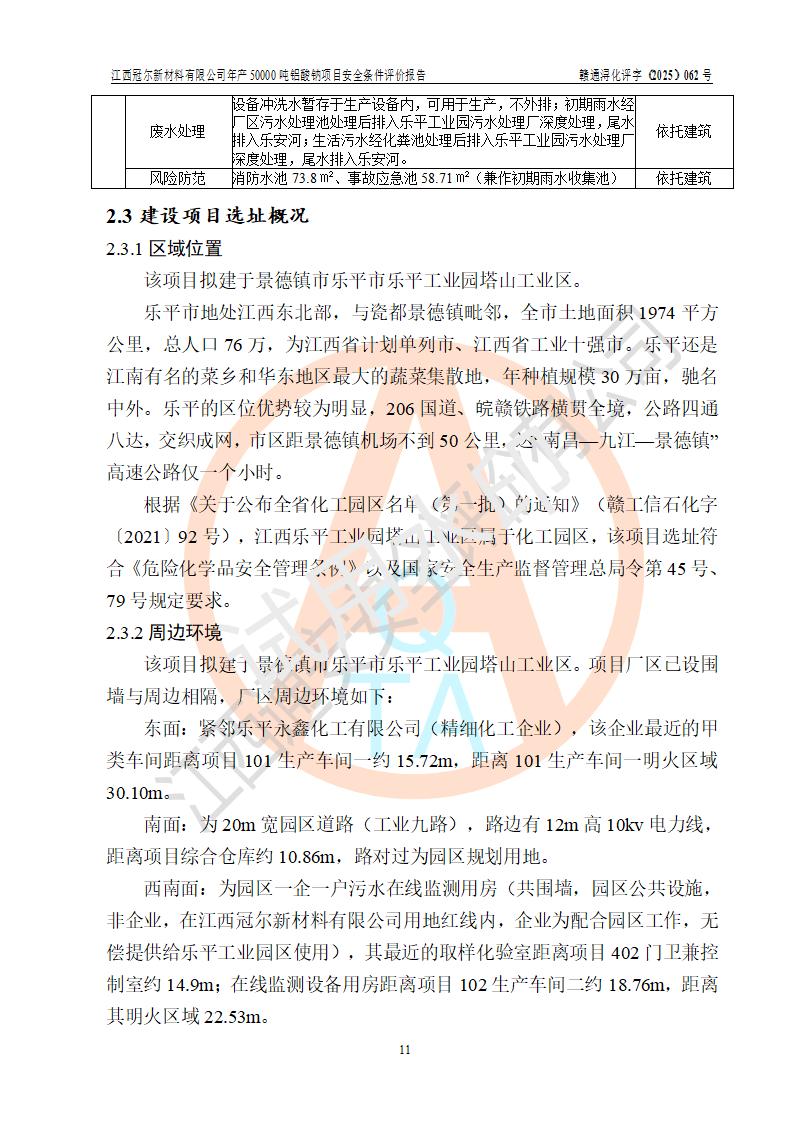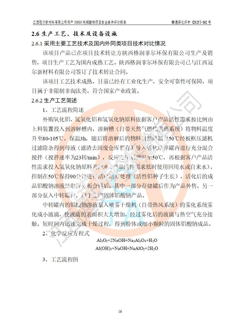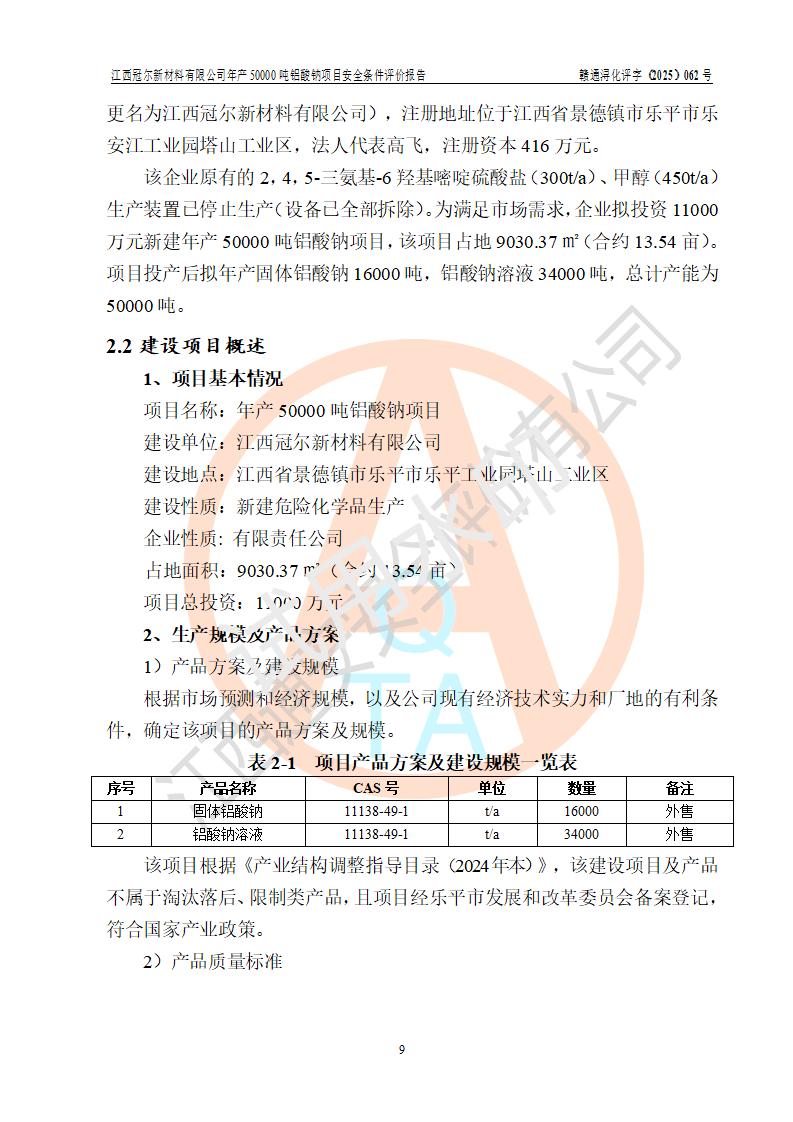 江西冠爾新材料有限公司是一家于2005年6月注冊成立的其他有限責(zé)任公司(前身為江西省江樂精細化工有限公司,因破產(chǎn)重組于2025年5月更名為江西冠爾新材料有限公司),注冊地址位于江西省景德鎮(zhèn)市樂平市樂安江工業(yè)園塔山工業(yè)區(qū),法人**高飛,注冊資本416萬元。 該企業(yè)原有的2,4,5-三氨基-6羥基嘧啶硫酸鹽(300t/a)、甲醇(450t/a)生產(chǎn)裝置已停止生產(chǎn)。為滿足市場需求,企業(yè)擬投資11000萬元新建年產(chǎn)50000噸鋁酸鈉項目,該項目占地9030.37㎡(合約13.54畝)。項目投產(chǎn)后擬年產(chǎn)固體鋁酸鈉16000噸,鋁酸鈉溶液34000噸,總計產(chǎn)能為50000噸。 |