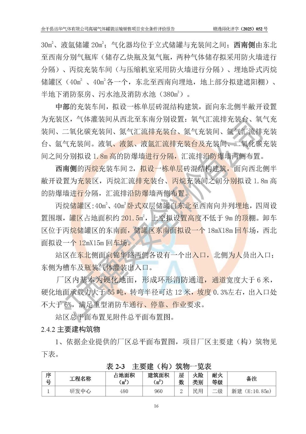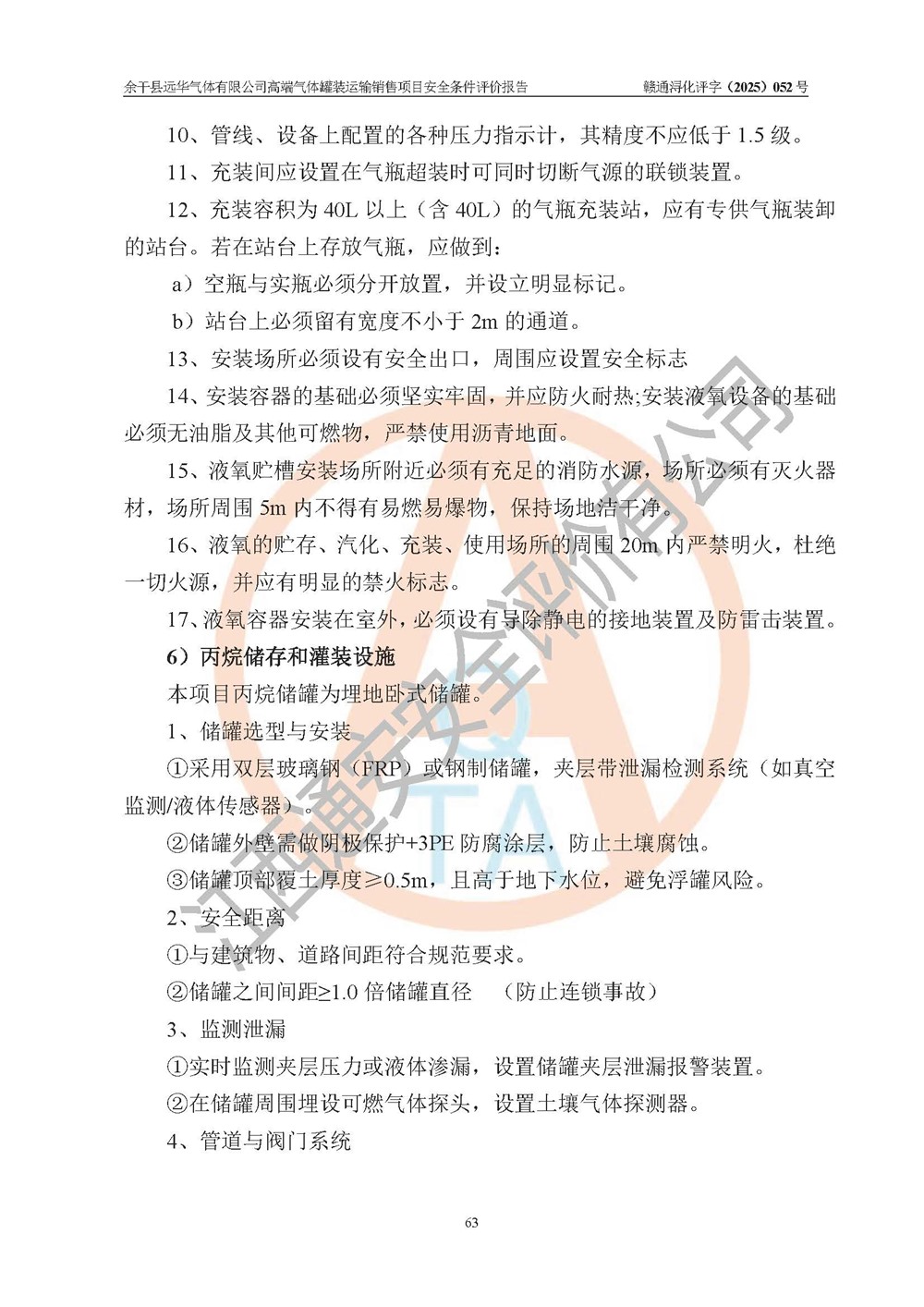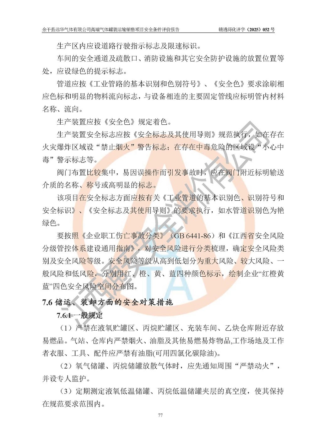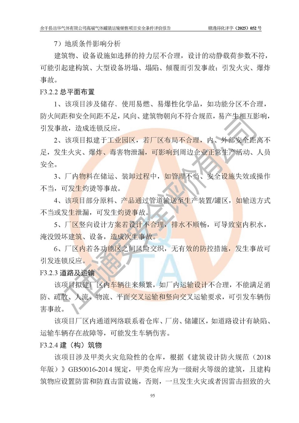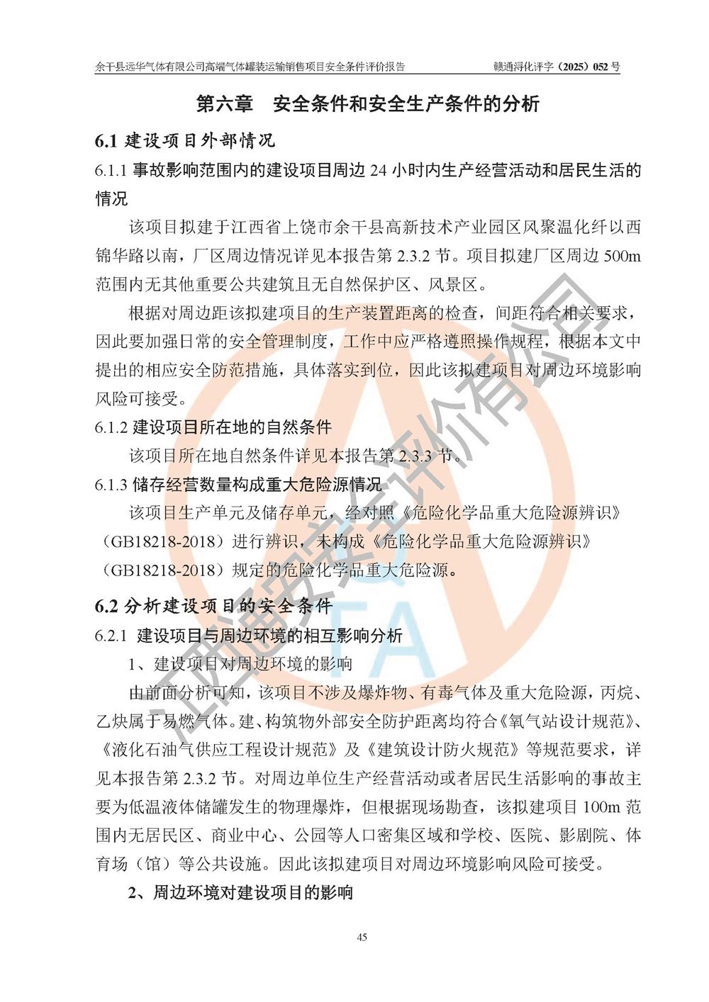 項(xiàng)目簡(jiǎn)介 | 余干縣遠(yuǎn)華氣體有限公司成立于2024年05月10日,公司類型為有限責(zé)任公司(自然人投資或控股),該公司法定**人為張建華,注冊(cè)資本貳佰萬元整,經(jīng)營(yíng)場(chǎng)所位于江西省上饒市余干縣****產(chǎn)業(yè)園區(qū)內(nèi)聚溫化纖以西錦華路以南。經(jīng)營(yíng)范圍:一般項(xiàng)目:氣體、液體分離及純凈設(shè)備銷售(除依法須經(jīng)批準(zhǔn)的項(xiàng)目外,憑營(yíng)業(yè)執(zhí)照依法自主開展經(jīng)營(yíng)活動(dòng))。 余干縣遠(yuǎn)華氣體有限公司于2025年02月11日取得了余干縣發(fā)展和改革委員會(huì)《余干縣遠(yuǎn)華氣體有限公司高端氣體罐裝運(yùn)輸銷售項(xiàng)目》備案文件,備案編號(hào):2502-361127-04-01-434579。 該項(xiàng)目涉及氧、二氧化碳、氮、氬、丙烷、乙炔、氦氣、二元?dú)猓ǘ趸?/span>+氬氣)的儲(chǔ)存經(jīng)營(yíng),貿(mào)易調(diào)撥經(jīng)營(yíng)的氣體氫氣、甲烷、食品二氧化碳。該公司擬建低溫立式儲(chǔ)罐液氧罐30m3 2個(gè)、液態(tài)二氧化碳罐30m3 1個(gè)、液氮罐30m3 1個(gè)、液氬罐30m3 1個(gè),及各工業(yè)氣瓶100瓶、各杜瓦瓶20瓶;全壓力式臥式埋地儲(chǔ)罐丙烷40m3 1個(gè)、40m3 1個(gè)(備用罐)及丙烷工業(yè)氣瓶50瓶;氣瓶庫(kù)內(nèi)乙炔氣瓶及氦氣氣瓶各50瓶。項(xiàng)目?jī)?chǔ)存經(jīng)營(yíng)過程中涉及的氧(液態(tài)的、壓縮的)、二氧化碳(液態(tài)的、壓縮的)、氬(液態(tài)的、壓縮的)、氮(液態(tài)的、壓縮的)、丙烷、乙炔、氦氣、食品級(jí)二氧化碳、二元?dú)猓ǘ趸?/span>+氬氣)均屬于危險(xiǎn)化學(xué)品,貿(mào)易調(diào)撥經(jīng)營(yíng)的氣體氫氣、甲烷、食品二氧化碳屬于危險(xiǎn)化學(xué)品。不涉及易制毒化學(xué)品、劇毒化學(xué)品、監(jiān)控化學(xué)品、易制爆化學(xué)品、特別管控危險(xiǎn)化學(xué)品,乙炔、丙烷、氫氣、甲烷屬于重點(diǎn)監(jiān)管的危險(xiǎn)化學(xué)品。該項(xiàng)目?jī)?chǔ)存經(jīng)營(yíng)場(chǎng)所(生產(chǎn)單元、儲(chǔ)存單元)不構(gòu)成危險(xiǎn)化學(xué)品重大危險(xiǎn)源。 依據(jù)《危險(xiǎn)化學(xué)品經(jīng)營(yíng)許可證管理辦法》(**安全生產(chǎn)監(jiān)督管理總局令第55號(hào),第79號(hào)修改),項(xiàng)目?jī)?chǔ)存經(jīng)營(yíng)的化學(xué)品屬于危險(xiǎn)化學(xué)品,需要辦理《危險(xiǎn)化學(xué)品經(jīng)營(yíng)許可證》。 依據(jù)《中華人民共和國(guó)安全生產(chǎn)法》、《危險(xiǎn)化學(xué)品安全管理?xiàng)l例》等規(guī)定的要求,危險(xiǎn)化學(xué)品新、改、擴(kuò)建的生產(chǎn)性建設(shè)工程**進(jìn)行安全評(píng)價(jià),根據(jù)《危險(xiǎn)化學(xué)品建設(shè)項(xiàng)目安全監(jiān)督管理辦法》(**安全生產(chǎn)監(jiān)督管理總局令第45號(hào),第79號(hào)、89號(hào)令修改)的規(guī)定,危險(xiǎn)化學(xué)品新、改、擴(kuò)建的生產(chǎn)性建設(shè)工程**進(jìn)行建設(shè)項(xiàng)目安全條件評(píng)價(jià),以使工程項(xiàng)目的設(shè)立滿足安全生產(chǎn)條件,項(xiàng)目的安全設(shè)施與主體工程同時(shí)設(shè)計(jì)、同時(shí)施工、同時(shí)投入使用,項(xiàng)目在安全生產(chǎn)及安全管理方面符合**及行業(yè)有關(guān)法律法規(guī)及標(biāo)準(zhǔn)。因此余干縣遠(yuǎn)華氣體有限公司委托江西通安安全評(píng)價(jià)有限公司承擔(dān)該項(xiàng)目的安全條件評(píng)價(jià)。 江西通安安全評(píng)價(jià)有限公司接受委托后,參照現(xiàn)行的法律、法規(guī)和標(biāo)準(zhǔn),按照《安全評(píng)價(jià)通則》、《安全預(yù)評(píng)價(jià)導(dǎo)則》、江西省應(yīng)急管理廳關(guān)于印發(fā)《江西省危險(xiǎn)化學(xué)品建設(shè)項(xiàng)目安全監(jiān)督管理實(shí)施細(xì)則》(試行)的通知等規(guī)范規(guī)定的要求,成立評(píng)價(jià)組。評(píng)價(jià)組完成風(fēng)險(xiǎn)分析、資料收集、現(xiàn)場(chǎng)勘查和類比調(diào)查等前期準(zhǔn)備工作,并制定評(píng)價(jià)實(shí)施計(jì)劃。評(píng)價(jià)組在前期準(zhǔn)備工作的基礎(chǔ)上,根據(jù)企業(yè)提供的資料,分析了該項(xiàng)目中可能存在的主要危險(xiǎn)、有害因素,在危險(xiǎn)、有害因素分析基礎(chǔ)上,根據(jù)該項(xiàng)目的生產(chǎn)工藝、功能區(qū)域特點(diǎn),劃分了評(píng)價(jià)單元,并針對(duì)劃分的評(píng)價(jià)單元選擇了相應(yīng)的安全評(píng)價(jià)方法進(jìn)行了逐項(xiàng)分析、評(píng)價(jià),提出了相應(yīng)的預(yù)防和控制對(duì)策措施。 本報(bào)告可作為余干縣遠(yuǎn)華氣體有限公司高端氣體罐裝運(yùn)輸銷售項(xiàng)目安全生產(chǎn)技術(shù)、安全生產(chǎn)管理決策及辦理相關(guān)安全生產(chǎn)行政許可事項(xiàng)的技術(shù)依據(jù)。 本次安全評(píng)價(jià)范圍:余干縣遠(yuǎn)華氣體有限公司高端氣體罐裝運(yùn)輸銷售項(xiàng)目,主要包括: (1)選址、周邊環(huán)境、總平面布置及建、建構(gòu)筑物(主要包括罐區(qū)、氣體灌裝間、氣瓶庫(kù)、杜瓦瓶充裝棚、變配電室、制冰車間、研發(fā)中心); (2)項(xiàng)目的生產(chǎn)工藝及裝置;相關(guān)的公用工程、輔助工程設(shè)施(配電房、消防泵房、消防水池/事