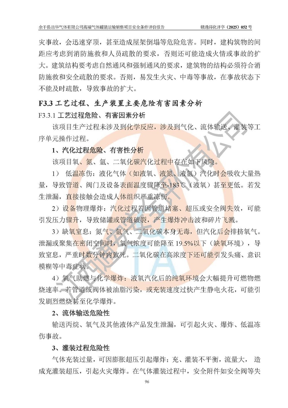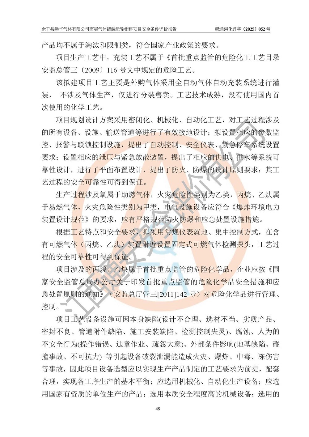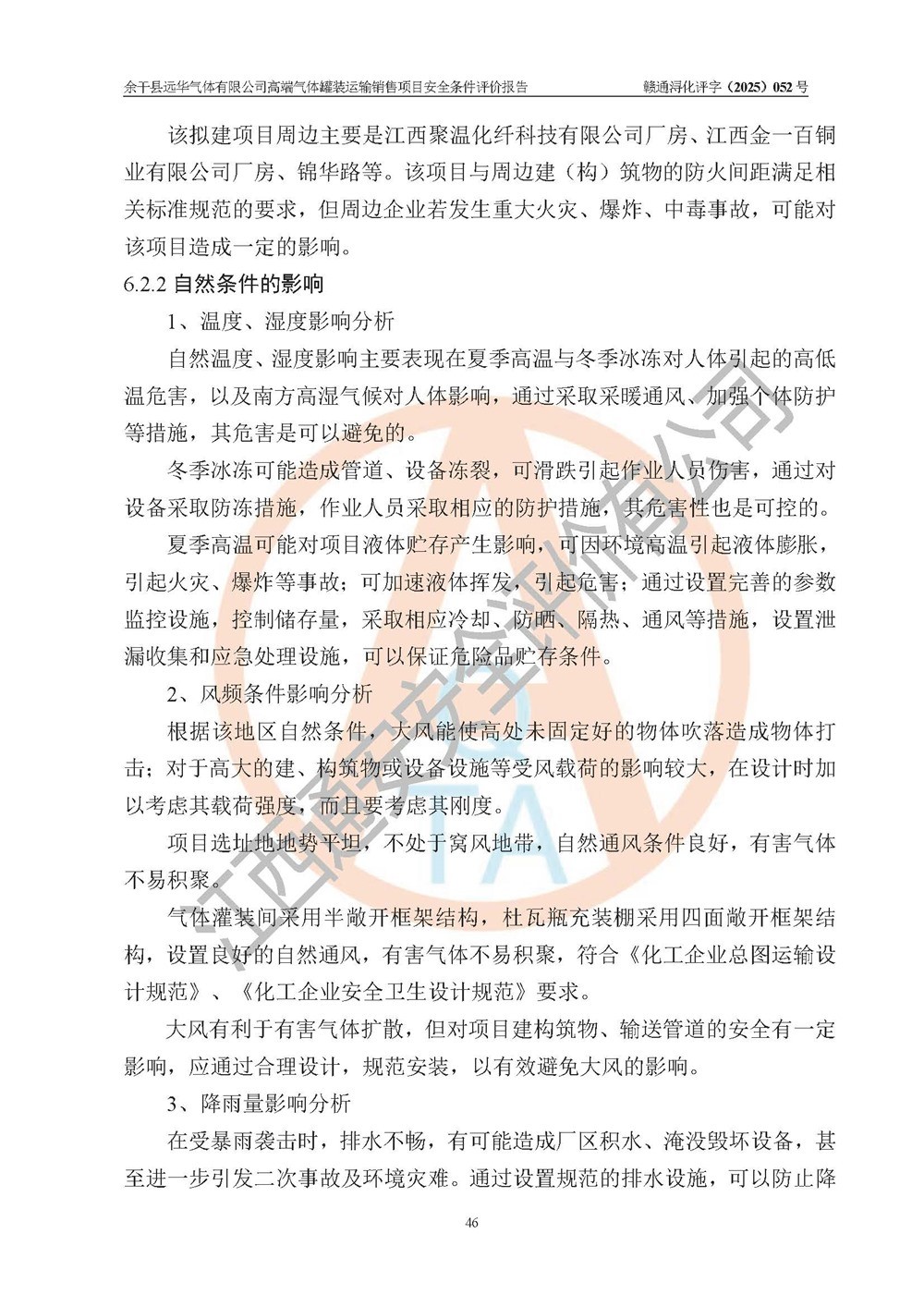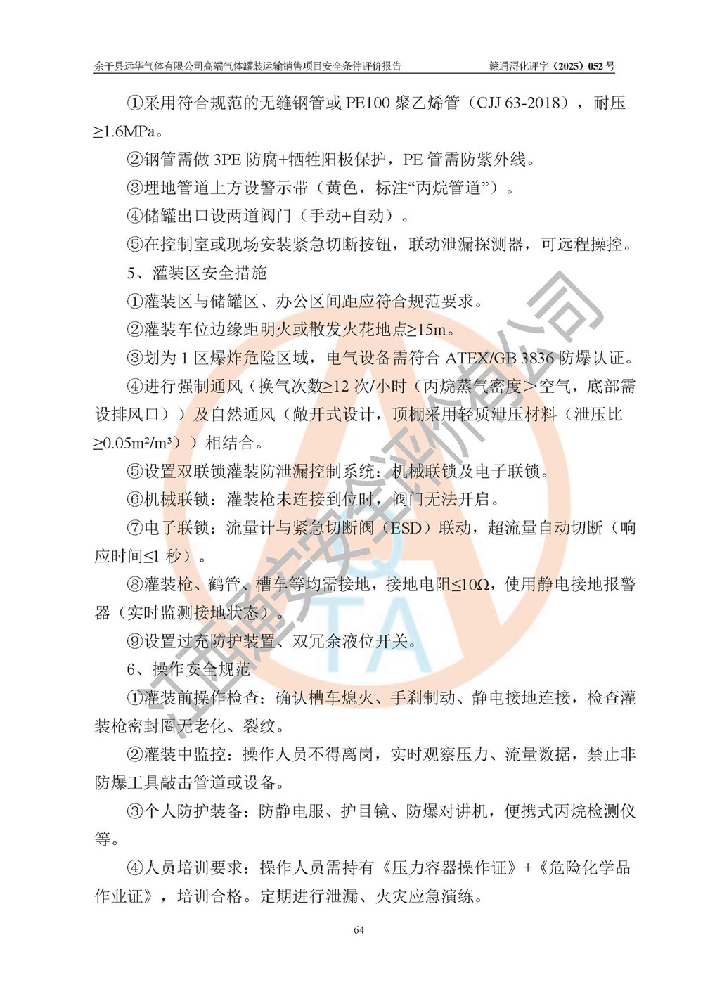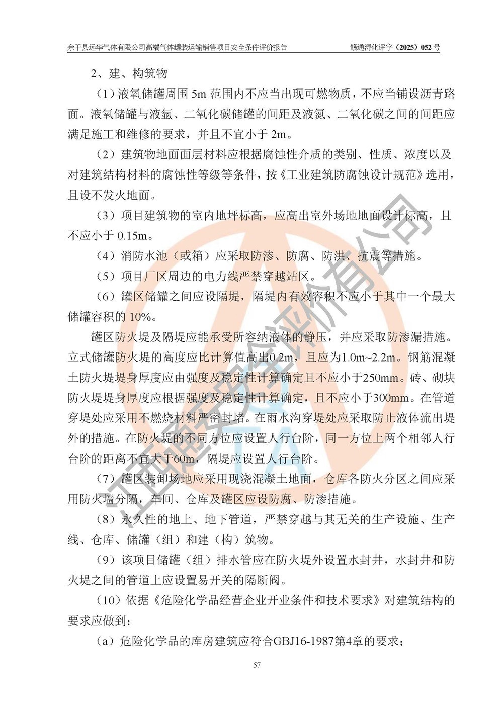 項(xiàng)目簡(jiǎn)介 | 余干縣遠(yuǎn)華氣體有限公司成立于2024年05月10日,公司類型為有限責(zé)任公司(自然人投資或控股),該公司法定**人為張建華,注冊(cè)資本貳佰萬元整,經(jīng)營(yíng)場(chǎng)所位于江西省上饒市余干縣****產(chǎn)業(yè)園區(qū)內(nèi)聚溫化纖以西錦華路以南。經(jīng)營(yíng)范圍:一般項(xiàng)目:氣體、液體分離及純凈設(shè)備銷售(除依法須經(jīng)批準(zhǔn)的項(xiàng)目外,憑營(yíng)業(yè)執(zhí)照依法自主開展經(jīng)營(yíng)活動(dòng))。 余干縣遠(yuǎn)華氣體有限公司于2025年02月11日取得了余干縣發(fā)展和改革委員會(huì)《余干縣遠(yuǎn)華氣體有限公司高端氣體罐裝運(yùn)輸銷售項(xiàng)目》備案文件,備案編號(hào):2502-361127-04-01-434579。 該項(xiàng)目涉及氧、二氧化碳、氮、氬、丙烷、乙炔、氦氣、二元?dú)猓ǘ趸?/span>+氬氣)的儲(chǔ)存經(jīng)營(yíng),貿(mào)易調(diào)撥經(jīng)營(yíng)的氣體氫氣、甲烷、食品二氧化碳。該公司擬建低溫立式儲(chǔ)罐液氧罐30m3 2個(gè)、液態(tài)二氧化碳罐30m3 1個(gè)、液氮罐30m3 1個(gè)、液氬罐30m3 1個(gè),及各工業(yè)氣瓶100瓶、各杜瓦瓶20瓶;全壓力式臥式埋地儲(chǔ)罐丙烷40m3 1個(gè)、40m3 1個(gè)(備用罐)及丙烷工業(yè)氣瓶50瓶;氣瓶庫(kù)內(nèi)乙炔氣瓶及氦氣氣瓶各50瓶。項(xiàng)目?jī)?chǔ)存經(jīng)營(yíng)過程中涉及的氧(液態(tài)的、壓縮的)、二氧化碳(液態(tài)的、壓縮的)、氬(液態(tài)的、壓縮的)、氮(液態(tài)的、壓縮的)、丙烷、乙炔、氦氣、食品級(jí)二氧化碳、二元?dú)猓ǘ趸?/span>+氬氣)均屬于危險(xiǎn)化學(xué)品,貿(mào)易調(diào)撥經(jīng)營(yíng)的氣體氫氣、甲烷、食品二氧化碳屬于危險(xiǎn)化學(xué)品。不涉及易制毒化學(xué)品、劇毒化學(xué)品、監(jiān)控化學(xué)品、易制爆化學(xué)品、特別管控危險(xiǎn)化學(xué)品,乙炔、丙烷、氫氣、甲烷屬于重點(diǎn)監(jiān)管的危險(xiǎn)化學(xué)品。該項(xiàng)目?jī)?chǔ)存經(jīng)營(yíng)場(chǎng)所(生產(chǎn)單元、儲(chǔ)存單元)不構(gòu)成危險(xiǎn)化學(xué)品重大危險(xiǎn)源。 依據(jù)《危險(xiǎn)化學(xué)品經(jīng)營(yíng)許可證管理辦法》(**安全生產(chǎn)監(jiān)督管理總局令第55號(hào),第79號(hào)修改),項(xiàng)目?jī)?chǔ)存經(jīng)營(yíng)的化學(xué)品屬于危險(xiǎn)化學(xué)品,需要辦理《危險(xiǎn)化學(xué)品經(jīng)營(yíng)許可證》。 依據(jù)《中華人民共和國(guó)安全生產(chǎn)法》、《危險(xiǎn)化學(xué)品安全管理?xiàng)l例》等規(guī)定的要求,危險(xiǎn)化學(xué)品新、改、擴(kuò)建的生產(chǎn)性建設(shè)工程**進(jìn)行安全評(píng)價(jià),根據(jù)《危險(xiǎn)化學(xué)品建設(shè)項(xiàng)目安全監(jiān)督管理辦法》(**安全生產(chǎn)監(jiān)督管理總局令第45號(hào),第79號(hào)、89號(hào)令修改)的規(guī)定,危險(xiǎn)化學(xué)品新、改、擴(kuò)建的生產(chǎn)性建設(shè)工程**進(jìn)行建設(shè)項(xiàng)目安全條件評(píng)價(jià),以使工程項(xiàng)目的設(shè)立滿足安全生產(chǎn)條件,項(xiàng)目的安全設(shè)施與主體工程同時(shí)設(shè)計(jì)、同時(shí)施工、同時(shí)投入使用,項(xiàng)目在安全生產(chǎn)及安全管理方面符合**及行業(yè)有關(guān)法律法規(guī)及標(biāo)準(zhǔn)。因此余干縣遠(yuǎn)華氣體有限公司委托江西通安安全評(píng)價(jià)有限公司承擔(dān)該項(xiàng)目的安全條件評(píng)價(jià)。 江西通安安全評(píng)價(jià)有限公司接受委托后,參照現(xiàn)行的法律、法規(guī)和標(biāo)準(zhǔn),按照《安全評(píng)價(jià)通則》、《安全預(yù)評(píng)價(jià)導(dǎo)則》、江西省應(yīng)急管理廳關(guān)于印發(fā)《江西省危險(xiǎn)化學(xué)品建設(shè)項(xiàng)目安全監(jiān)督管理實(shí)施細(xì)則》(試行)的通知等規(guī)范規(guī)定的要求,成立評(píng)價(jià)組。評(píng)價(jià)組完成風(fēng)險(xiǎn)分析、資料收集、現(xiàn)場(chǎng)勘查和類比調(diào)查等前期準(zhǔn)備工作,并制定評(píng)價(jià)實(shí)施計(jì)劃。評(píng)價(jià)組在前期準(zhǔn)備工作的基礎(chǔ)上,根據(jù)企業(yè)提供的資料,分析了該項(xiàng)目中可能存在的主要危險(xiǎn)、有害因素,在危險(xiǎn)、有害因素分析基礎(chǔ)上,根據(jù)該項(xiàng)目的生產(chǎn)工藝、功能區(qū)域特點(diǎn),劃分了評(píng)價(jià)單元,并針對(duì)劃分的評(píng)價(jià)單元選擇了相應(yīng)的安全評(píng)價(jià)方法進(jìn)行了逐項(xiàng)分析、評(píng)價(jià),提出了相應(yīng)的預(yù)防和控制對(duì)策措施。 本報(bào)告可作為余干縣遠(yuǎn)華氣體有限公司高端氣體罐裝運(yùn)輸銷售項(xiàng)目安全生產(chǎn)技術(shù)、安全生產(chǎn)管理決策及辦理相關(guān)安全生產(chǎn)行政許可事項(xiàng)的技術(shù)依據(jù)。 本次安全評(píng)價(jià)范圍:余干縣遠(yuǎn)華氣體有限公司高端氣體罐裝運(yùn)輸銷售項(xiàng)目,主要包括: (1)選址、周邊環(huán)境、總平面布置及建、建構(gòu)筑物(主要包括罐區(qū)、氣體灌裝間、氣瓶庫(kù)、杜瓦瓶充裝棚、變配電室、制冰車間、研發(fā)中心); (2)項(xiàng)目的生產(chǎn)工藝及裝置;相關(guān)的公用工程、輔助工程設(shè)施(配電房、消防泵房、消防水池/事
