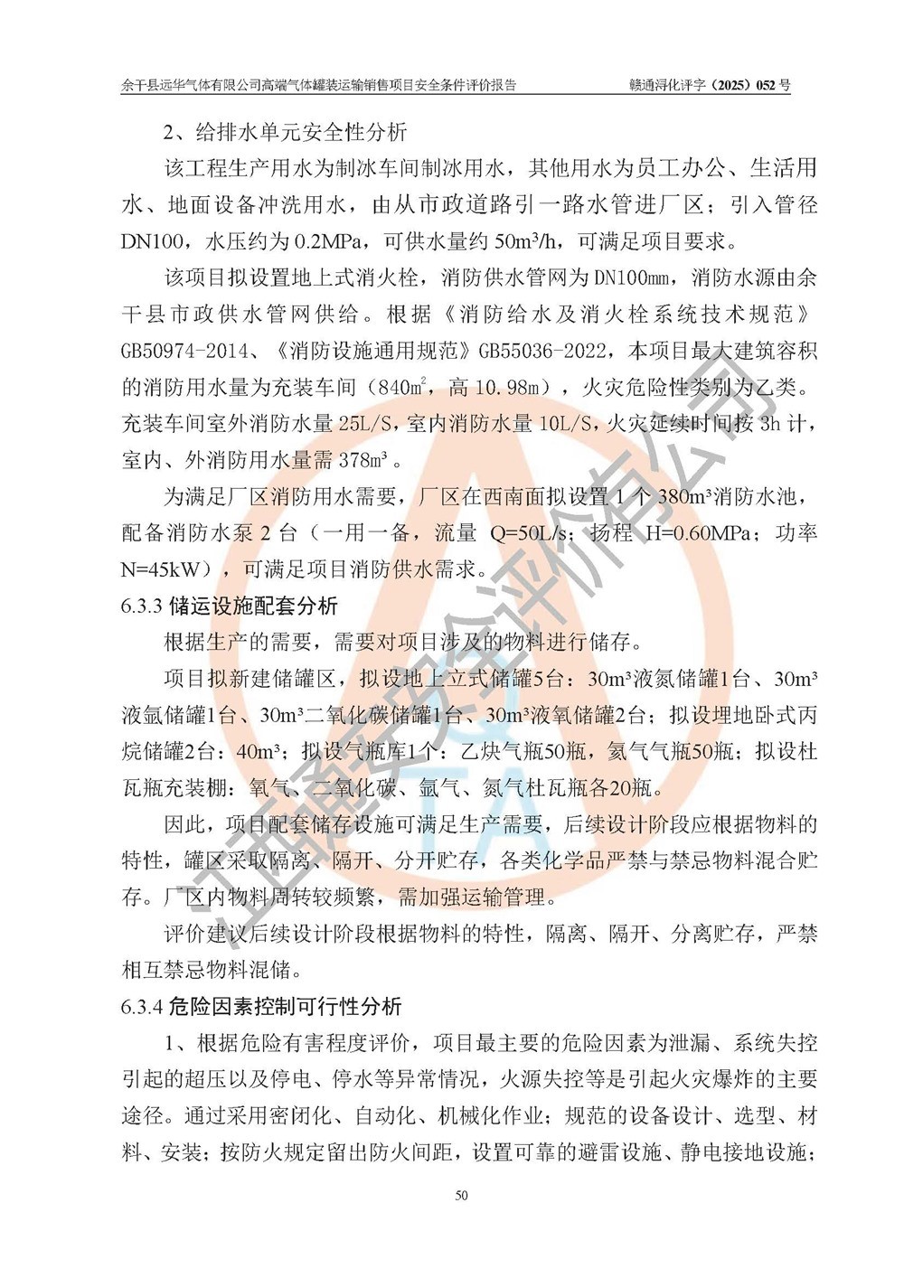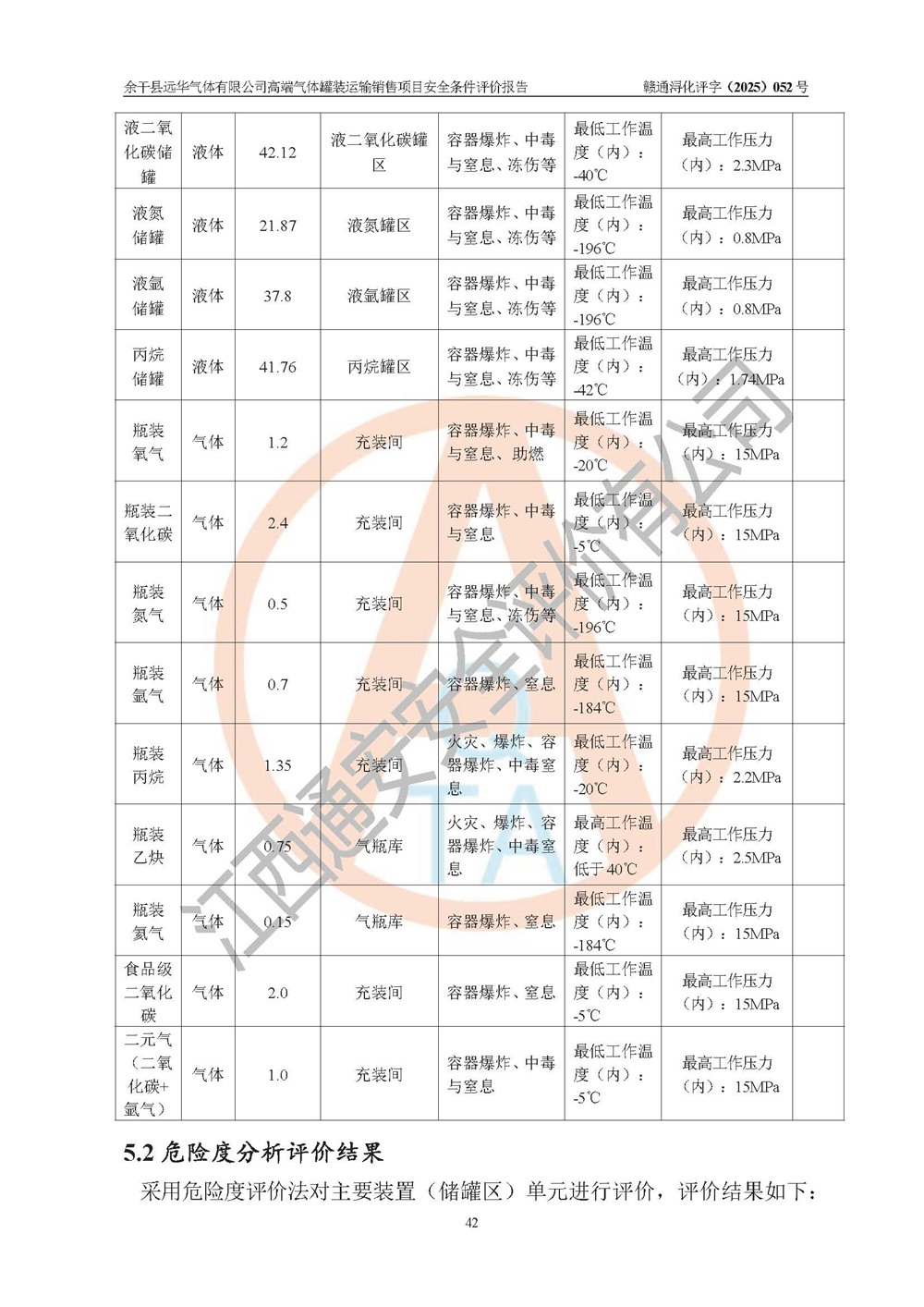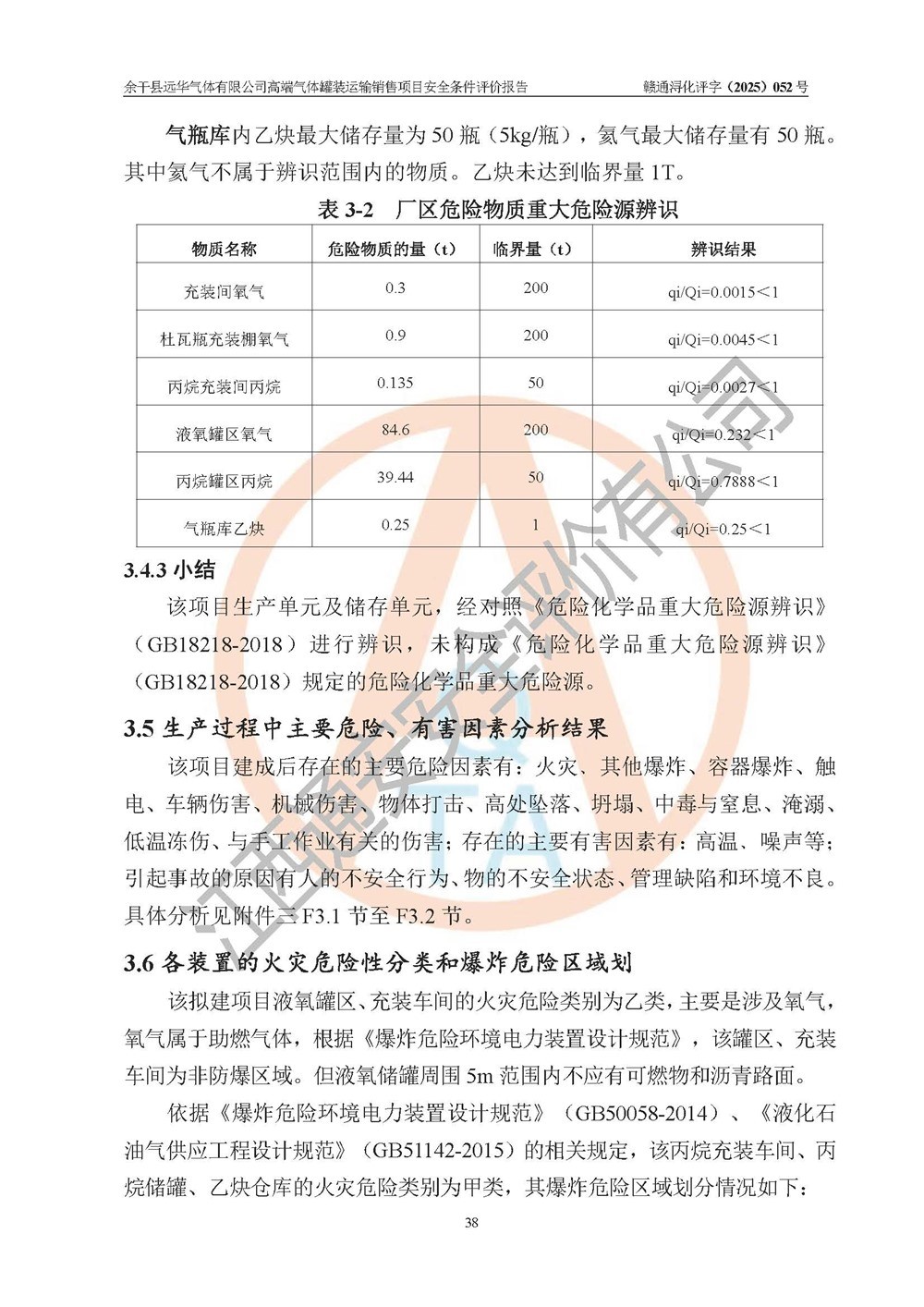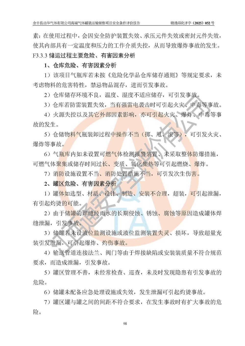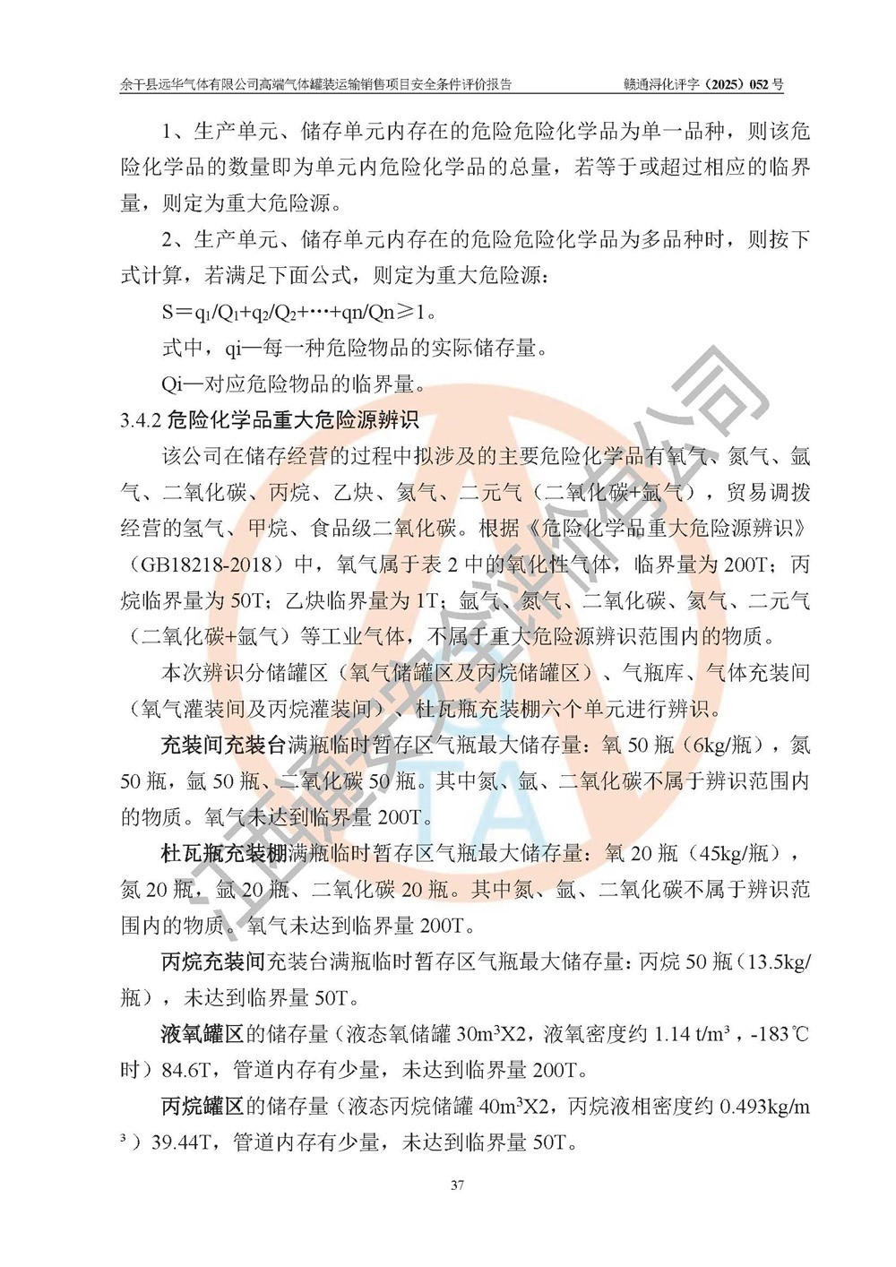 項(xiàng)目簡(jiǎn)介 | 余干縣遠(yuǎn)華氣體有限公司成立于2024年05月10日,公司類型為有限責(zé)任公司(自然人投資或控股),該公司法定**人為張建華,注冊(cè)資本貳佰萬元整,經(jīng)營(yíng)場(chǎng)所位于江西省上饒市余干縣****產(chǎn)業(yè)園區(qū)內(nèi)聚溫化纖以西錦華路以南。經(jīng)營(yíng)范圍:一般項(xiàng)目:氣體、液體分離及純凈設(shè)備銷售(除依法須經(jīng)批準(zhǔn)的項(xiàng)目外,憑營(yíng)業(yè)執(zhí)照依法自主開展經(jīng)營(yíng)活動(dòng))。 余干縣遠(yuǎn)華氣體有限公司于2025年02月11日取得了余干縣發(fā)展和改革委員會(huì)《余干縣遠(yuǎn)華氣體有限公司高端氣體罐裝運(yùn)輸銷售項(xiàng)目》備案文件,備案編號(hào):2502-361127-04-01-434579。 該項(xiàng)目涉及氧、二氧化碳、氮、氬、丙烷、乙炔、氦氣、二元?dú)猓ǘ趸?/span>+氬氣)的儲(chǔ)存經(jīng)營(yíng),貿(mào)易調(diào)撥經(jīng)營(yíng)的氣體氫氣、甲烷、食品二氧化碳。該公司擬建低溫立式儲(chǔ)罐液氧罐30m3 2個(gè)、液態(tài)二氧化碳罐30m3 1個(gè)、液氮罐30m3 1個(gè)、液氬罐30m3 1個(gè),及各工業(yè)氣瓶100瓶、各杜瓦瓶20瓶;全壓力式臥式埋地儲(chǔ)罐丙烷40m3 1個(gè)、40m3 1個(gè)(備用罐)及丙烷工業(yè)氣瓶50瓶;氣瓶庫(kù)內(nèi)乙炔氣瓶及氦氣氣瓶各50瓶。項(xiàng)目?jī)?chǔ)存經(jīng)營(yíng)過程中涉及的氧(液態(tài)的、壓縮的)、二氧化碳(液態(tài)的、壓縮的)、氬(液態(tài)的、壓縮的)、氮(液態(tài)的、壓縮的)、丙烷、乙炔、氦氣、食品級(jí)二氧化碳、二元?dú)猓ǘ趸?/span>+氬氣)均屬于危險(xiǎn)化學(xué)品,貿(mào)易調(diào)撥經(jīng)營(yíng)的氣體氫氣、甲烷、食品二氧化碳屬于危險(xiǎn)化學(xué)品。不涉及易制毒化學(xué)品、劇毒化學(xué)品、監(jiān)控化學(xué)品、易制爆化學(xué)品、特別管控危險(xiǎn)化學(xué)品,乙炔、丙烷、氫氣、甲烷屬于重點(diǎn)監(jiān)管的危險(xiǎn)化學(xué)品。該項(xiàng)目?jī)?chǔ)存經(jīng)營(yíng)場(chǎng)所(生產(chǎn)單元、儲(chǔ)存單元)不構(gòu)成危險(xiǎn)化學(xué)品重大危險(xiǎn)源。 依據(jù)《危險(xiǎn)化學(xué)品經(jīng)營(yíng)許可證管理辦法》(**安全生產(chǎn)監(jiān)督管理總局令第55號(hào),第79號(hào)修改),項(xiàng)目?jī)?chǔ)存經(jīng)營(yíng)的化學(xué)品屬于危險(xiǎn)化學(xué)品,需要辦理《危險(xiǎn)化學(xué)品經(jīng)營(yíng)許可證》。 依據(jù)《中華人民共和國(guó)安全生產(chǎn)法》、《危險(xiǎn)化學(xué)品安全管理?xiàng)l例》等規(guī)定的要求,危險(xiǎn)化學(xué)品新、改、擴(kuò)建的生產(chǎn)性建設(shè)工程**進(jìn)行安全評(píng)價(jià),根據(jù)《危險(xiǎn)化學(xué)品建設(shè)項(xiàng)目安全監(jiān)督管理辦法》(**安全生產(chǎn)監(jiān)督管理總局令第45號(hào),第79號(hào)、89號(hào)令修改)的規(guī)定,危險(xiǎn)化學(xué)品新、改、擴(kuò)建的生產(chǎn)性建設(shè)工程**進(jìn)行建設(shè)項(xiàng)目安全條件評(píng)價(jià),以使工程項(xiàng)目的設(shè)立滿足安全生產(chǎn)條件,項(xiàng)目的安全設(shè)施與主體工程同時(shí)設(shè)計(jì)、同時(shí)施工、同時(shí)投入使用,項(xiàng)目在安全生產(chǎn)及安全管理方面符合**及行業(yè)有關(guān)法律法規(guī)及標(biāo)準(zhǔn)。因此余干縣遠(yuǎn)華氣體有限公司委托江西通安安全評(píng)價(jià)有限公司承擔(dān)該項(xiàng)目的安全條件評(píng)價(jià)。 江西通安安全評(píng)價(jià)有限公司接受委托后,參照現(xiàn)行的法律、法規(guī)和標(biāo)準(zhǔn),按照《安全評(píng)價(jià)通則》、《安全預(yù)評(píng)價(jià)導(dǎo)則》、江西省應(yīng)急管理廳關(guān)于印發(fā)《江西省危險(xiǎn)化學(xué)品建設(shè)項(xiàng)目安全監(jiān)督管理實(shí)施細(xì)則》(試行)的通知等規(guī)范規(guī)定的要求,成立評(píng)價(jià)組。評(píng)價(jià)組完成風(fēng)險(xiǎn)分析、資料收集、現(xiàn)場(chǎng)勘查和類比調(diào)查等前期準(zhǔn)備工作,并制定評(píng)價(jià)實(shí)施計(jì)劃。評(píng)價(jià)組在前期準(zhǔn)備工作的基礎(chǔ)上,根據(jù)企業(yè)提供的資料,分析了該項(xiàng)目中可能存在的主要危險(xiǎn)、有害因素,在危險(xiǎn)、有害因素分析基礎(chǔ)上,根據(jù)該項(xiàng)目的生產(chǎn)工藝、功能區(qū)域特點(diǎn),劃分了評(píng)價(jià)單元,并針對(duì)劃分的評(píng)價(jià)單元選擇了相應(yīng)的安全評(píng)價(jià)方法進(jìn)行了逐項(xiàng)分析、評(píng)價(jià),提出了相應(yīng)的預(yù)防和控制對(duì)策措施。 本報(bào)告可作為余干縣遠(yuǎn)華氣體有限公司高端氣體罐裝運(yùn)輸銷售項(xiàng)目安全生產(chǎn)技術(shù)、安全生產(chǎn)管理決策及辦理相關(guān)安全生產(chǎn)行政許可事項(xiàng)的技術(shù)依據(jù)。 本次安全評(píng)價(jià)范圍:余干縣遠(yuǎn)華氣體有限公司高端氣體罐裝運(yùn)輸銷售項(xiàng)目,主要包括: (1)選址、周邊環(huán)境、總平面布置及建、建構(gòu)筑物(主要包括罐區(qū)、氣體灌裝間、氣瓶庫(kù)、杜瓦瓶充裝棚、變配電室、制冰車間、研發(fā)中心); (2)項(xiàng)目的生產(chǎn)工藝及裝置;相關(guān)的公用工程、輔助工程設(shè)施(配電房、消防泵房、消防水池/事