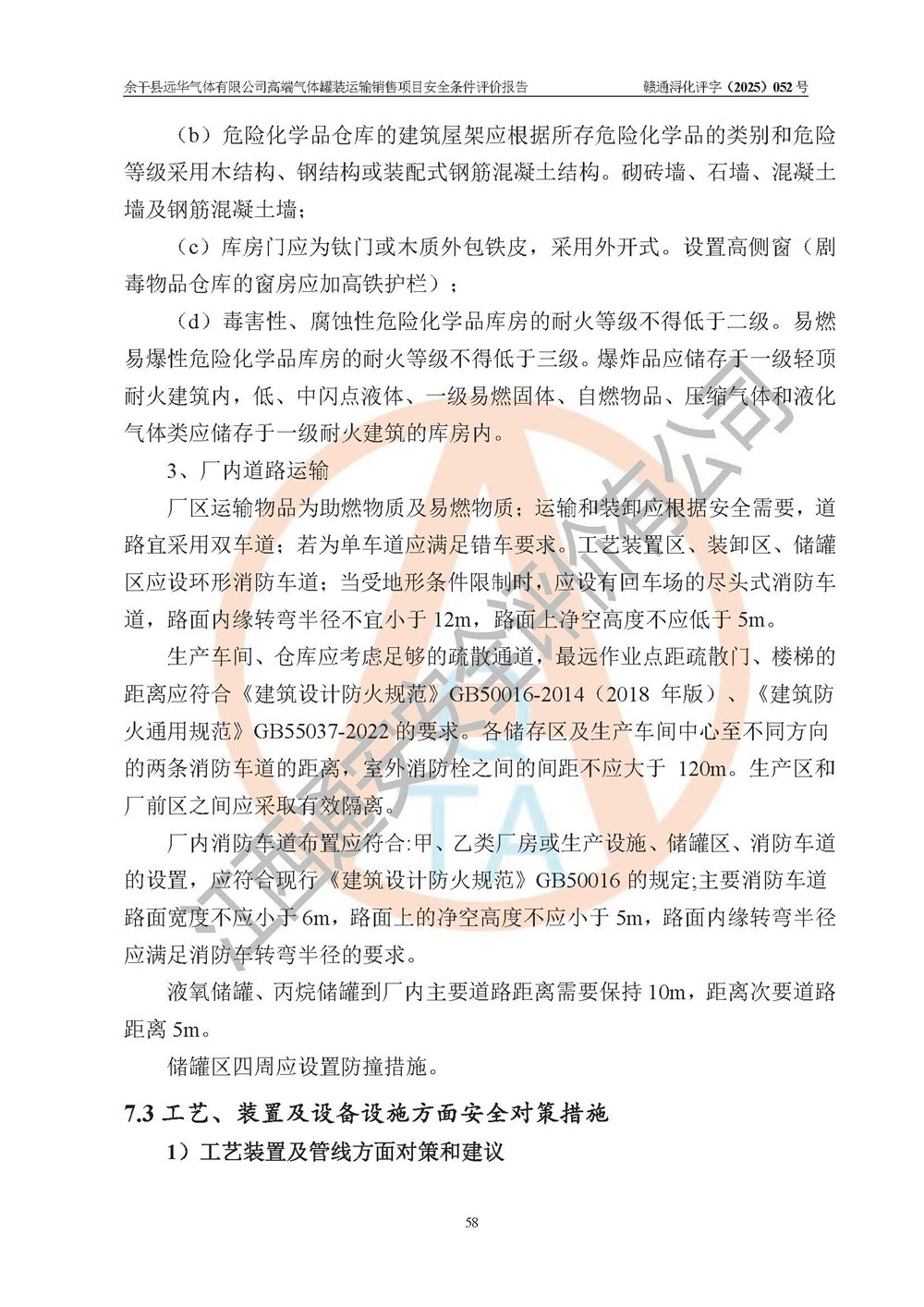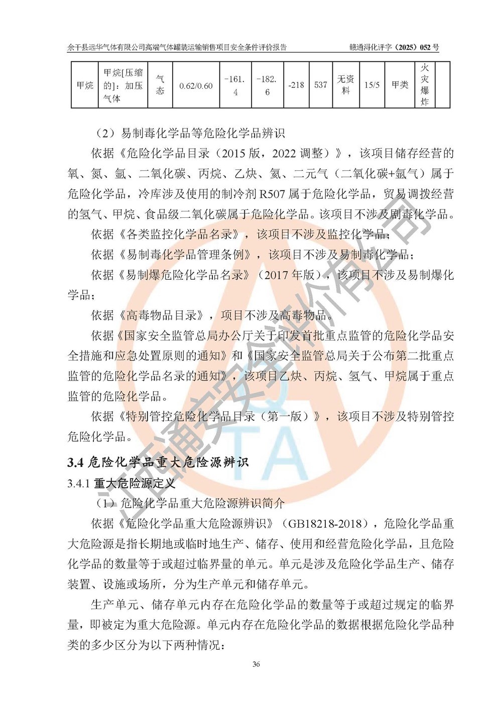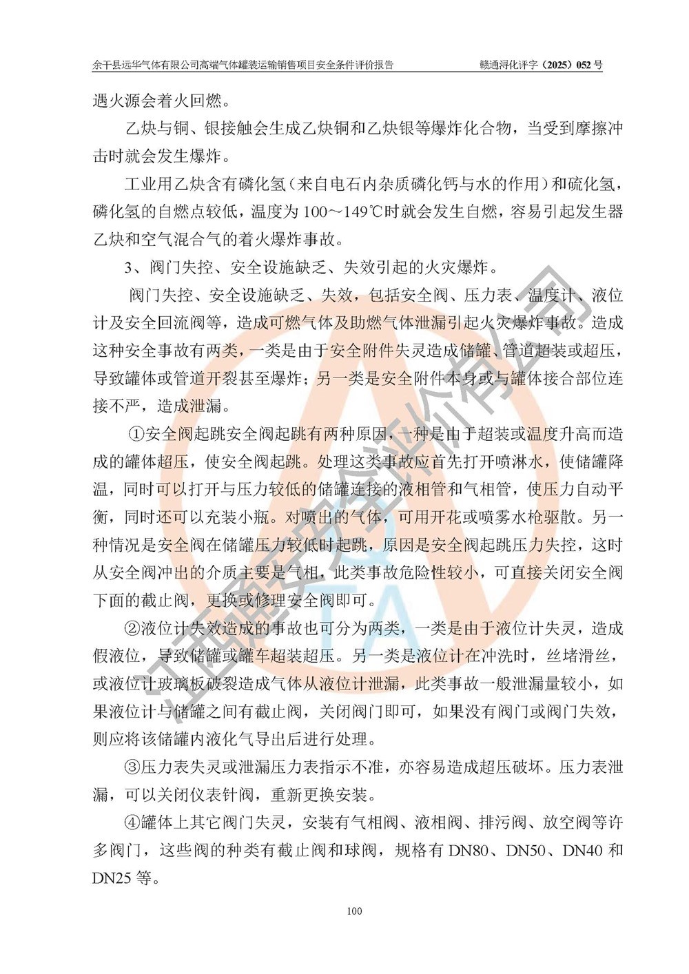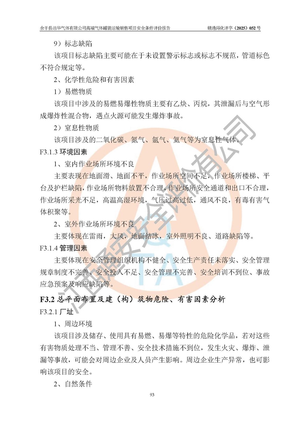 項(xiàng)目簡(jiǎn)介 | 余干縣遠(yuǎn)華氣體有限公司成立于2024年05月10日,公司類型為有限責(zé)任公司(自然人投資或控股),該公司法定**人為張建華,注冊(cè)資本貳佰萬元整,經(jīng)營(yíng)場(chǎng)所位于江西省上饒市余干縣****產(chǎn)業(yè)園區(qū)內(nèi)聚溫化纖以西錦華路以南。經(jīng)營(yíng)范圍:一般項(xiàng)目:氣體、液體分離及純凈設(shè)備銷售(除依法須經(jīng)批準(zhǔn)的項(xiàng)目外,憑營(yíng)業(yè)執(zhí)照依法自主開展經(jīng)營(yíng)活動(dòng))。 余干縣遠(yuǎn)華氣體有限公司于2025年02月11日取得了余干縣發(fā)展和改革委員會(huì)《余干縣遠(yuǎn)華氣體有限公司高端氣體罐裝運(yùn)輸銷售項(xiàng)目》備案文件,備案編號(hào):2502-361127-04-01-434579。 該項(xiàng)目涉及氧、二氧化碳、氮、氬、丙烷、乙炔、氦氣、二元?dú)猓ǘ趸?/span>+氬氣)的儲(chǔ)存經(jīng)營(yíng),貿(mào)易調(diào)撥經(jīng)營(yíng)的氣體氫氣、甲烷、食品二氧化碳。該公司擬建低溫立式儲(chǔ)罐液氧罐30m3 2個(gè)、液態(tài)二氧化碳罐30m3 1個(gè)、液氮罐30m3 1個(gè)、液氬罐30m3 1個(gè),及各工業(yè)氣瓶100瓶、各杜瓦瓶20瓶;全壓力式臥式埋地儲(chǔ)罐丙烷40m3 1個(gè)、40m3 1個(gè)(備用罐)及丙烷工業(yè)氣瓶50瓶;氣瓶庫(kù)內(nèi)乙炔氣瓶及氦氣氣瓶各50瓶。項(xiàng)目?jī)?chǔ)存經(jīng)營(yíng)過程中涉及的氧(液態(tài)的、壓縮的)、二氧化碳(液態(tài)的、壓縮的)、氬(液態(tài)的、壓縮的)、氮(液態(tài)的、壓縮的)、丙烷、乙炔、氦氣、食品級(jí)二氧化碳、二元?dú)猓ǘ趸?/span>+氬氣)均屬于危險(xiǎn)化學(xué)品,貿(mào)易調(diào)撥經(jīng)營(yíng)的氣體氫氣、甲烷、食品二氧化碳屬于危險(xiǎn)化學(xué)品。不涉及易制毒化學(xué)品、劇毒化學(xué)品、監(jiān)控化學(xué)品、易制爆化學(xué)品、特別管控危險(xiǎn)化學(xué)品,乙炔、丙烷、氫氣、甲烷屬于重點(diǎn)監(jiān)管的危險(xiǎn)化學(xué)品。該項(xiàng)目?jī)?chǔ)存經(jīng)營(yíng)場(chǎng)所(生產(chǎn)單元、儲(chǔ)存單元)不構(gòu)成危險(xiǎn)化學(xué)品重大危險(xiǎn)源。 依據(jù)《危險(xiǎn)化學(xué)品經(jīng)營(yíng)許可證管理辦法》(**安全生產(chǎn)監(jiān)督管理總局令第55號(hào),第79號(hào)修改),項(xiàng)目?jī)?chǔ)存經(jīng)營(yíng)的化學(xué)品屬于危險(xiǎn)化學(xué)品,需要辦理《危險(xiǎn)化學(xué)品經(jīng)營(yíng)許可證》。 依據(jù)《中華人民共和國(guó)安全生產(chǎn)法》、《危險(xiǎn)化學(xué)品安全管理?xiàng)l例》等規(guī)定的要求,危險(xiǎn)化學(xué)品新、改、擴(kuò)建的生產(chǎn)性建設(shè)工程**進(jìn)行安全評(píng)價(jià),根據(jù)《危險(xiǎn)化學(xué)品建設(shè)項(xiàng)目安全監(jiān)督管理辦法》(**安全生產(chǎn)監(jiān)督管理總局令第45號(hào),第79號(hào)、89號(hào)令修改)的規(guī)定,危險(xiǎn)化學(xué)品新、改、擴(kuò)建的生產(chǎn)性建設(shè)工程**進(jìn)行建設(shè)項(xiàng)目安全條件評(píng)價(jià),以使工程項(xiàng)目的設(shè)立滿足安全生產(chǎn)條件,項(xiàng)目的安全設(shè)施與主體工程同時(shí)設(shè)計(jì)、同時(shí)施工、同時(shí)投入使用,項(xiàng)目在安全生產(chǎn)及安全管理方面符合**及行業(yè)有關(guān)法律法規(guī)及標(biāo)準(zhǔn)。因此余干縣遠(yuǎn)華氣體有限公司委托江西通安安全評(píng)價(jià)有限公司承擔(dān)該項(xiàng)目的安全條件評(píng)價(jià)。 江西通安安全評(píng)價(jià)有限公司接受委托后,參照現(xiàn)行的法律、法規(guī)和標(biāo)準(zhǔn),按照《安全評(píng)價(jià)通則》、《安全預(yù)評(píng)價(jià)導(dǎo)則》、江西省應(yīng)急管理廳關(guān)于印發(fā)《江西省危險(xiǎn)化學(xué)品建設(shè)項(xiàng)目安全監(jiān)督管理實(shí)施細(xì)則》(試行)的通知等規(guī)范規(guī)定的要求,成立評(píng)價(jià)組。評(píng)價(jià)組完成風(fēng)險(xiǎn)分析、資料收集、現(xiàn)場(chǎng)勘查和類比調(diào)查等前期準(zhǔn)備工作,并制定評(píng)價(jià)實(shí)施計(jì)劃。評(píng)價(jià)組在前期準(zhǔn)備工作的基礎(chǔ)上,根據(jù)企業(yè)提供的資料,分析了該項(xiàng)目中可能存在的主要危險(xiǎn)、有害因素,在危險(xiǎn)、有害因素分析基礎(chǔ)上,根據(jù)該項(xiàng)目的生產(chǎn)工藝、功能區(qū)域特點(diǎn),劃分了評(píng)價(jià)單元,并針對(duì)劃分的評(píng)價(jià)單元選擇了相應(yīng)的安全評(píng)價(jià)方法進(jìn)行了逐項(xiàng)分析、評(píng)價(jià),提出了相應(yīng)的預(yù)防和控制對(duì)策措施。 本報(bào)告可作為余干縣遠(yuǎn)華氣體有限公司高端氣體罐裝運(yùn)輸銷售項(xiàng)目安全生產(chǎn)技術(shù)、安全生產(chǎn)管理決策及辦理相關(guān)安全生產(chǎn)行政許可事項(xiàng)的技術(shù)依據(jù)。 本次安全評(píng)價(jià)范圍:余干縣遠(yuǎn)華氣體有限公司高端氣體罐裝運(yùn)輸銷售項(xiàng)目,主要包括: (1)選址、周邊環(huán)境、總平面布置及建、建構(gòu)筑物(主要包括罐區(qū)、氣體灌裝間、氣瓶庫(kù)、杜瓦瓶充裝棚、變配電室、制冰車間、研發(fā)中心); (2)項(xiàng)目的生產(chǎn)工藝及裝置;相關(guān)的公用工程、輔助工程設(shè)施(配電房、消防泵房、消防水池/事