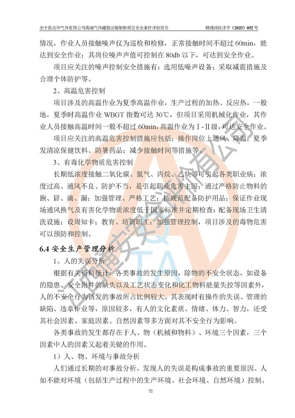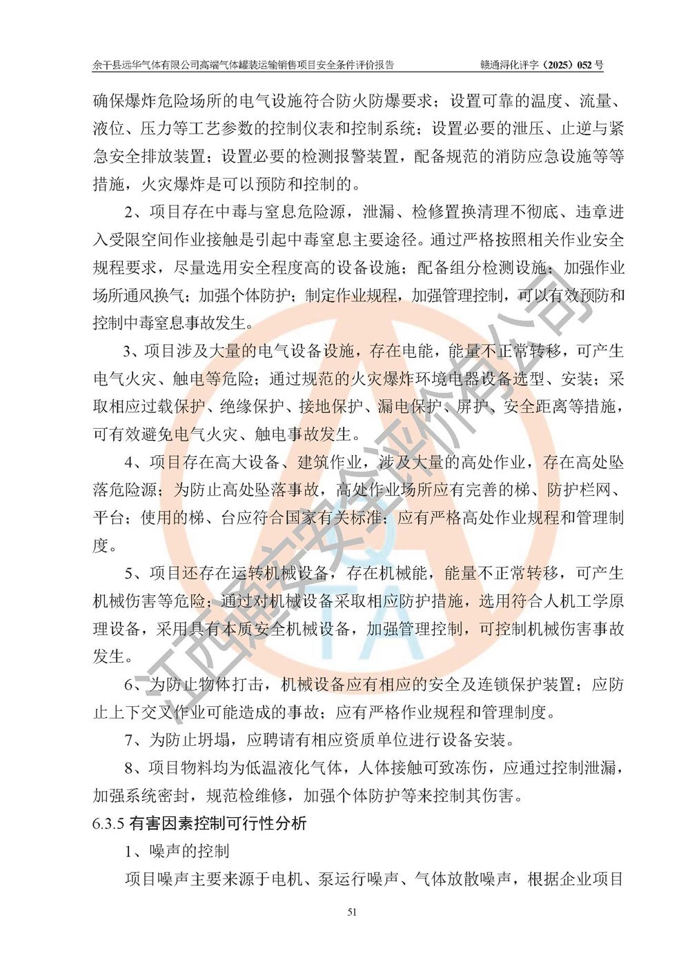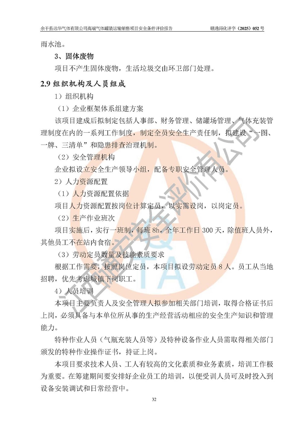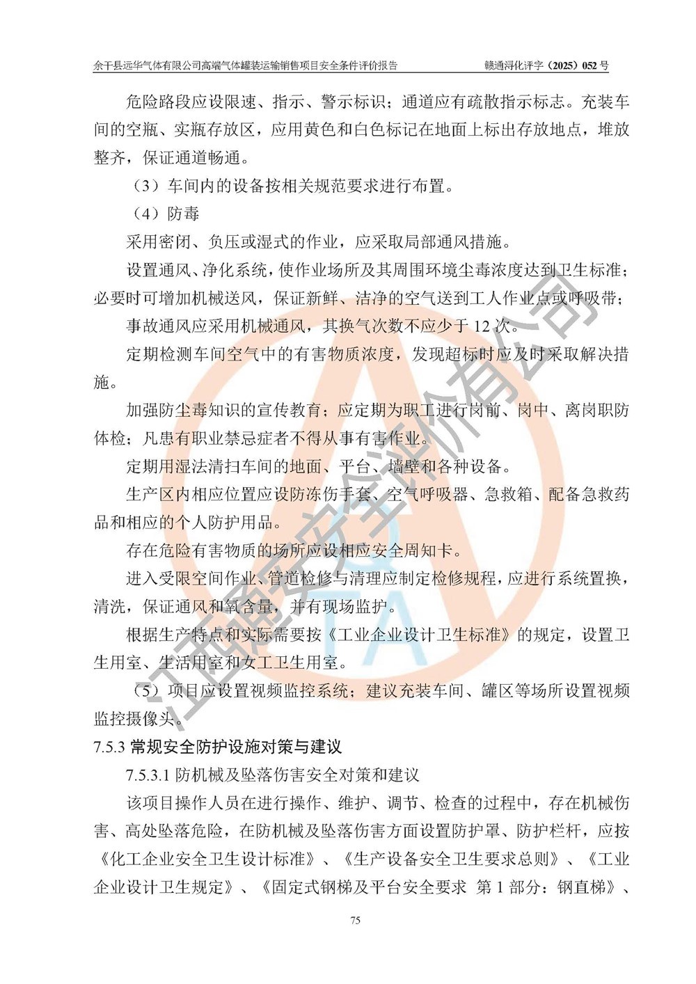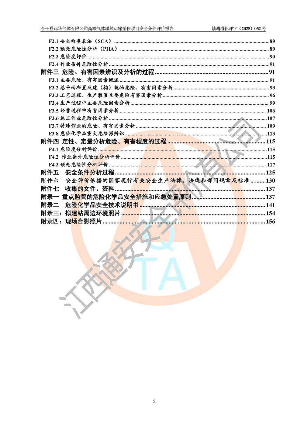 項(xiàng)目簡(jiǎn)介 | 余干縣遠(yuǎn)華氣體有限公司成立于2024年05月10日,公司類型為有限責(zé)任公司(自然人投資或控股),該公司法定**人為張建華,注冊(cè)資本貳佰萬元整,經(jīng)營(yíng)場(chǎng)所位于江西省上饒市余干縣****產(chǎn)業(yè)園區(qū)內(nèi)聚溫化纖以西錦華路以南。經(jīng)營(yíng)范圍:一般項(xiàng)目:氣體、液體分離及純凈設(shè)備銷售(除依法須經(jīng)批準(zhǔn)的項(xiàng)目外,憑營(yíng)業(yè)執(zhí)照依法自主開展經(jīng)營(yíng)活動(dòng))。 余干縣遠(yuǎn)華氣體有限公司于2025年02月11日取得了余干縣發(fā)展和改革委員會(huì)《余干縣遠(yuǎn)華氣體有限公司高端氣體罐裝運(yùn)輸銷售項(xiàng)目》備案文件,備案編號(hào):2502-361127-04-01-434579。 該項(xiàng)目涉及氧、二氧化碳、氮、氬、丙烷、乙炔、氦氣、二元?dú)猓ǘ趸?/span>+氬氣)的儲(chǔ)存經(jīng)營(yíng),貿(mào)易調(diào)撥經(jīng)營(yíng)的氣體氫氣、甲烷、食品二氧化碳。該公司擬建低溫立式儲(chǔ)罐液氧罐30m3 2個(gè)、液態(tài)二氧化碳罐30m3 1個(gè)、液氮罐30m3 1個(gè)、液氬罐30m3 1個(gè),及各工業(yè)氣瓶100瓶、各杜瓦瓶20瓶;全壓力式臥式埋地儲(chǔ)罐丙烷40m3 1個(gè)、40m3 1個(gè)(備用罐)及丙烷工業(yè)氣瓶50瓶;氣瓶庫(kù)內(nèi)乙炔氣瓶及氦氣氣瓶各50瓶。項(xiàng)目?jī)?chǔ)存經(jīng)營(yíng)過程中涉及的氧(液態(tài)的、壓縮的)、二氧化碳(液態(tài)的、壓縮的)、氬(液態(tài)的、壓縮的)、氮(液態(tài)的、壓縮的)、丙烷、乙炔、氦氣、食品級(jí)二氧化碳、二元?dú)猓ǘ趸?/span>+氬氣)均屬于危險(xiǎn)化學(xué)品,貿(mào)易調(diào)撥經(jīng)營(yíng)的氣體氫氣、甲烷、食品二氧化碳屬于危險(xiǎn)化學(xué)品。不涉及易制毒化學(xué)品、劇毒化學(xué)品、監(jiān)控化學(xué)品、易制爆化學(xué)品、特別管控危險(xiǎn)化學(xué)品,乙炔、丙烷、氫氣、甲烷屬于重點(diǎn)監(jiān)管的危險(xiǎn)化學(xué)品。該項(xiàng)目?jī)?chǔ)存經(jīng)營(yíng)場(chǎng)所(生產(chǎn)單元、儲(chǔ)存單元)不構(gòu)成危險(xiǎn)化學(xué)品重大危險(xiǎn)源。 依據(jù)《危險(xiǎn)化學(xué)品經(jīng)營(yíng)許可證管理辦法》(**安全生產(chǎn)監(jiān)督管理總局令第55號(hào),第79號(hào)修改),項(xiàng)目?jī)?chǔ)存經(jīng)營(yíng)的化學(xué)品屬于危險(xiǎn)化學(xué)品,需要辦理《危險(xiǎn)化學(xué)品經(jīng)營(yíng)許可證》。 依據(jù)《中華人民共和國(guó)安全生產(chǎn)法》、《危險(xiǎn)化學(xué)品安全管理?xiàng)l例》等規(guī)定的要求,危險(xiǎn)化學(xué)品新、改、擴(kuò)建的生產(chǎn)性建設(shè)工程**進(jìn)行安全評(píng)價(jià),根據(jù)《危險(xiǎn)化學(xué)品建設(shè)項(xiàng)目安全監(jiān)督管理辦法》(**安全生產(chǎn)監(jiān)督管理總局令第45號(hào),第79號(hào)、89號(hào)令修改)的規(guī)定,危險(xiǎn)化學(xué)品新、改、擴(kuò)建的生產(chǎn)性建設(shè)工程**進(jìn)行建設(shè)項(xiàng)目安全條件評(píng)價(jià),以使工程項(xiàng)目的設(shè)立滿足安全生產(chǎn)條件,項(xiàng)目的安全設(shè)施與主體工程同時(shí)設(shè)計(jì)、同時(shí)施工、同時(shí)投入使用,項(xiàng)目在安全生產(chǎn)及安全管理方面符合**及行業(yè)有關(guān)法律法規(guī)及標(biāo)準(zhǔn)。因此余干縣遠(yuǎn)華氣體有限公司委托江西通安安全評(píng)價(jià)有限公司承擔(dān)該項(xiàng)目的安全條件評(píng)價(jià)。 江西通安安全評(píng)價(jià)有限公司接受委托后,參照現(xiàn)行的法律、法規(guī)和標(biāo)準(zhǔn),按照《安全評(píng)價(jià)通則》、《安全預(yù)評(píng)價(jià)導(dǎo)則》、江西省應(yīng)急管理廳關(guān)于印發(fā)《江西省危險(xiǎn)化學(xué)品建設(shè)項(xiàng)目安全監(jiān)督管理實(shí)施細(xì)則》(試行)的通知等規(guī)范規(guī)定的要求,成立評(píng)價(jià)組。評(píng)價(jià)組完成風(fēng)險(xiǎn)分析、資料收集、現(xiàn)場(chǎng)勘查和類比調(diào)查等前期準(zhǔn)備工作,并制定評(píng)價(jià)實(shí)施計(jì)劃。評(píng)價(jià)組在前期準(zhǔn)備工作的基礎(chǔ)上,根據(jù)企業(yè)提供的資料,分析了該項(xiàng)目中可能存在的主要危險(xiǎn)、有害因素,在危險(xiǎn)、有害因素分析基礎(chǔ)上,根據(jù)該項(xiàng)目的生產(chǎn)工藝、功能區(qū)域特點(diǎn),劃分了評(píng)價(jià)單元,并針對(duì)劃分的評(píng)價(jià)單元選擇了相應(yīng)的安全評(píng)價(jià)方法進(jìn)行了逐項(xiàng)分析、評(píng)價(jià),提出了相應(yīng)的預(yù)防和控制對(duì)策措施。 本報(bào)告可作為余干縣遠(yuǎn)華氣體有限公司高端氣體罐裝運(yùn)輸銷售項(xiàng)目安全生產(chǎn)技術(shù)、安全生產(chǎn)管理決策及辦理相關(guān)安全生產(chǎn)行政許可事項(xiàng)的技術(shù)依據(jù)。 本次安全評(píng)價(jià)范圍:余干縣遠(yuǎn)華氣體有限公司高端氣體罐裝運(yùn)輸銷售項(xiàng)目,主要包括: (1)選址、周邊環(huán)境、總平面布置及建、建構(gòu)筑物(主要包括罐區(qū)、氣體灌裝間、氣瓶庫(kù)、杜瓦瓶充裝棚、變配電室、制冰車間、研發(fā)中心); (2)項(xiàng)目的生產(chǎn)工藝及裝置;相關(guān)的公用工程、輔助工程設(shè)施(配電房、消防泵房、消防水池/事