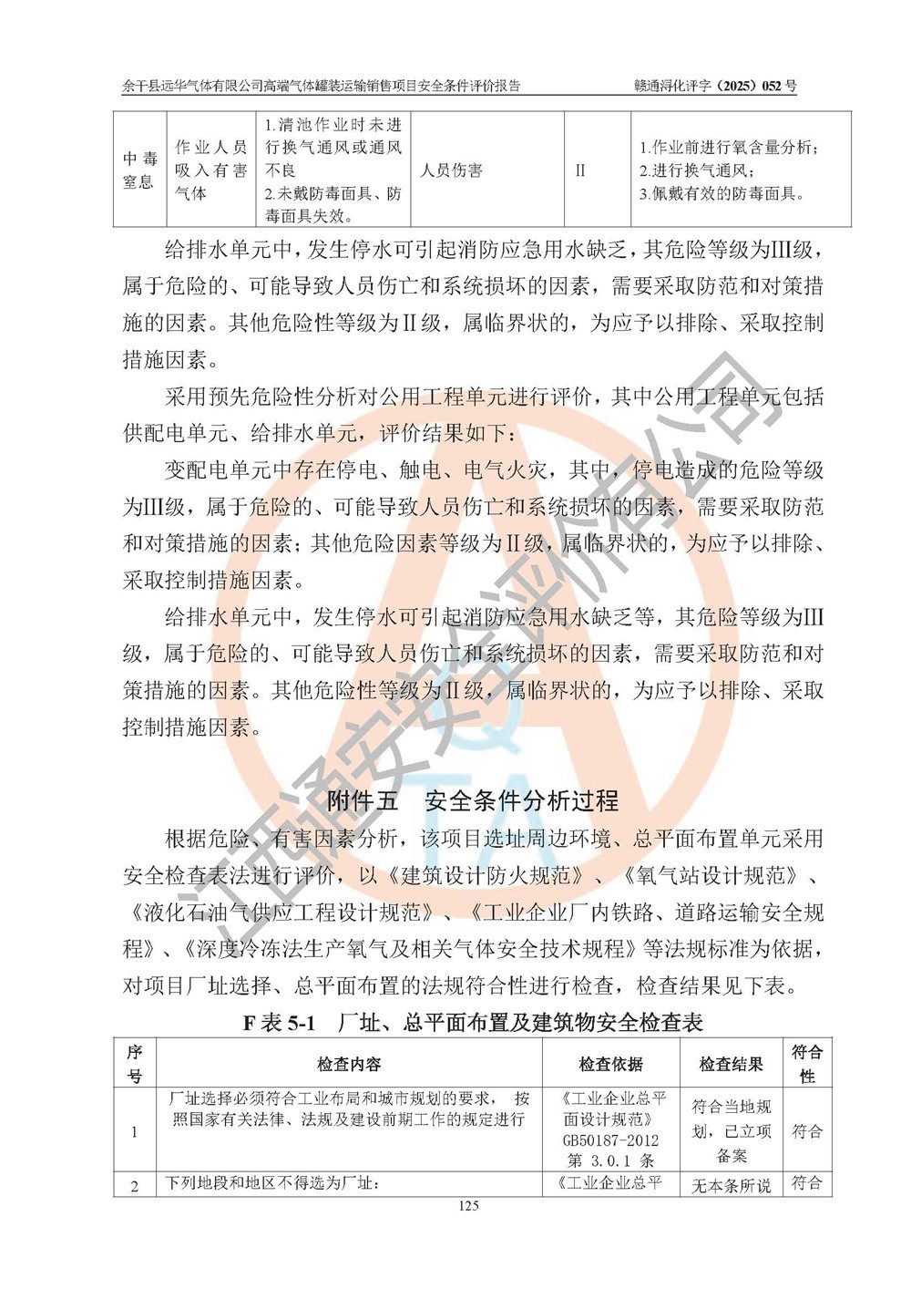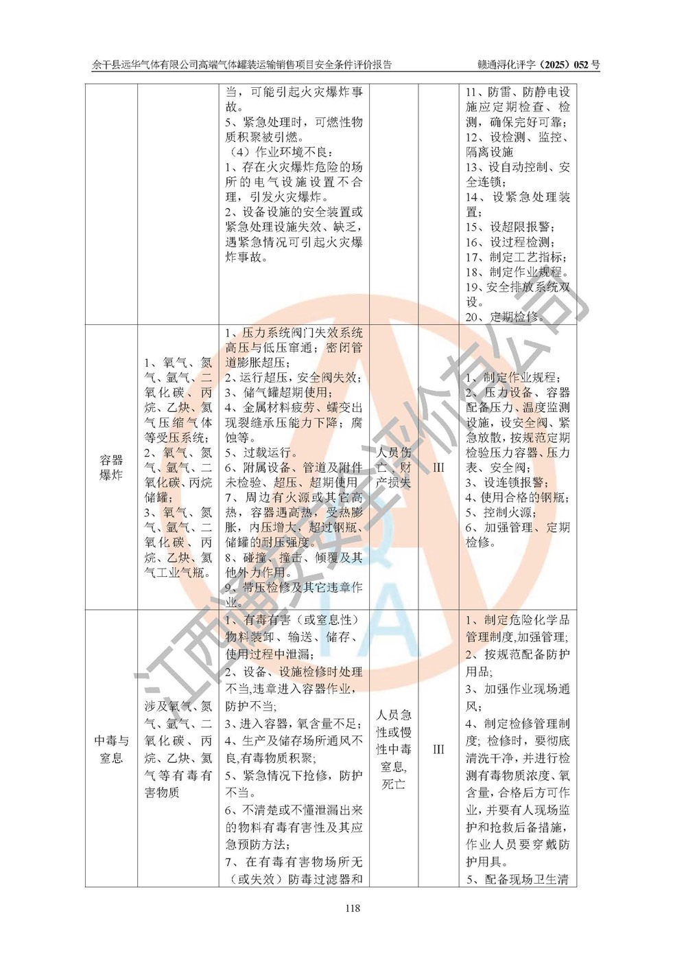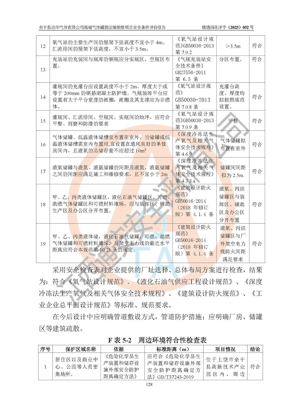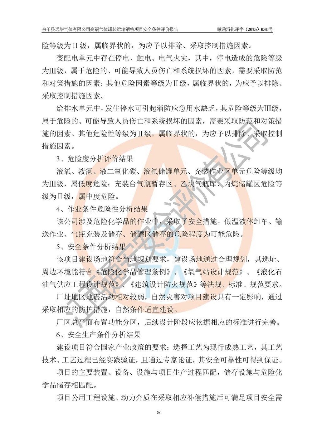 評(píng)價(jià)結(jié)論 | 綜上所述:余干縣遠(yuǎn)華氣體有限公司高端氣體罐裝運(yùn)輸銷售項(xiàng)目的選址、總平面布局、總體運(yùn)輸、周邊環(huán)境、自然環(huán)境能滿足建設(shè)安全條件;項(xiàng)目選擇的工藝過程及設(shè)備設(shè)施的安全可靠性能達(dá)到**法規(guī)、標(biāo)準(zhǔn)規(guī)定要求;項(xiàng)目存在的危險(xiǎn)有害因素可控,在落實(shí)本評(píng)價(jià)報(bào)告提出的有關(guān)安全對(duì)策措施后,其危險(xiǎn)有害程度能達(dá)到可以接受的程度,項(xiàng)目建設(shè)能夠?qū)崿F(xiàn)安全運(yùn)行目標(biāo)。 | ||||||