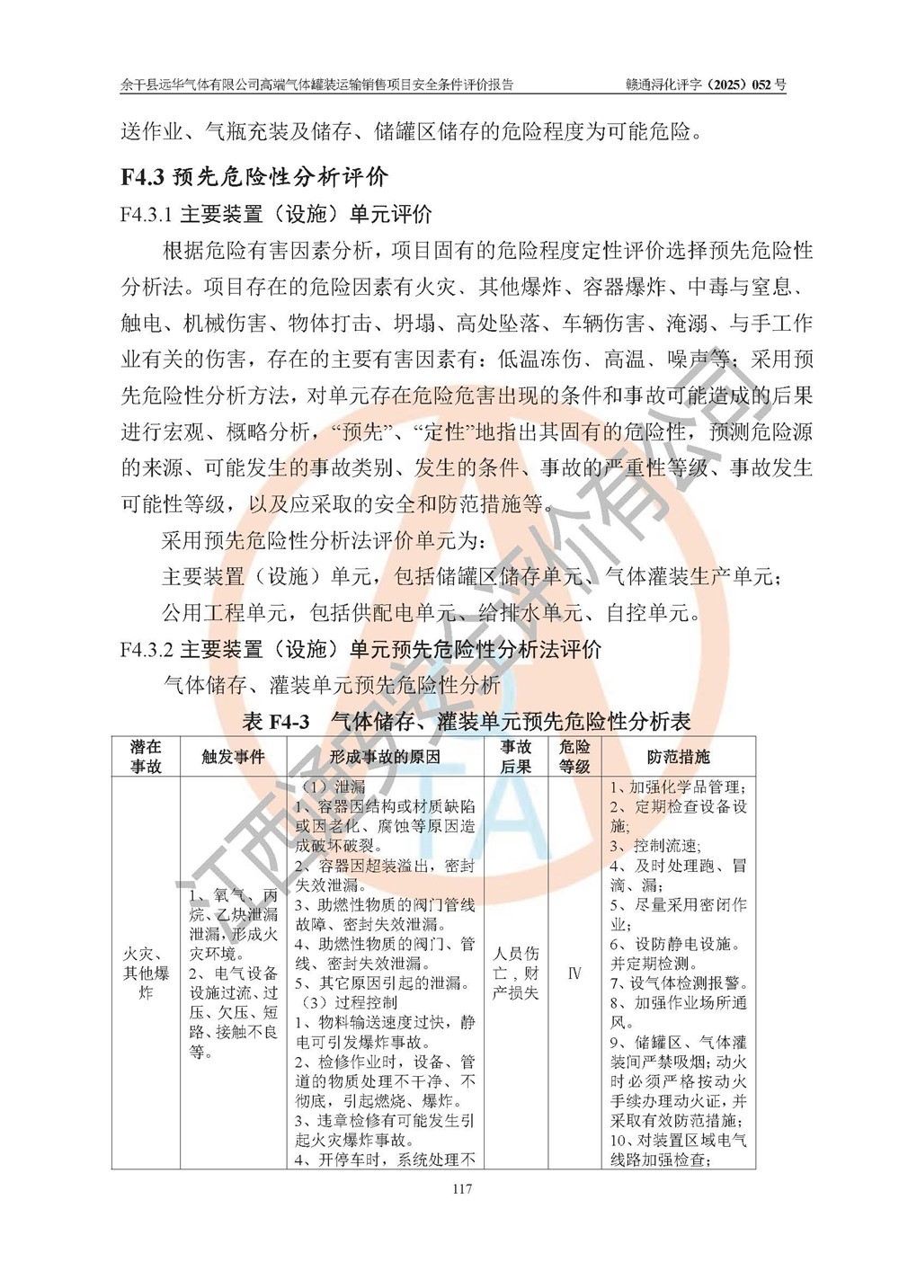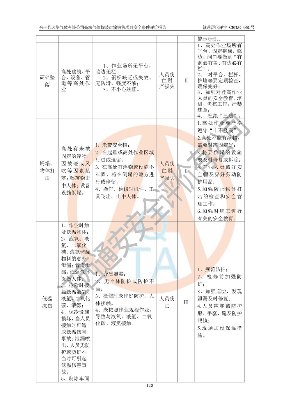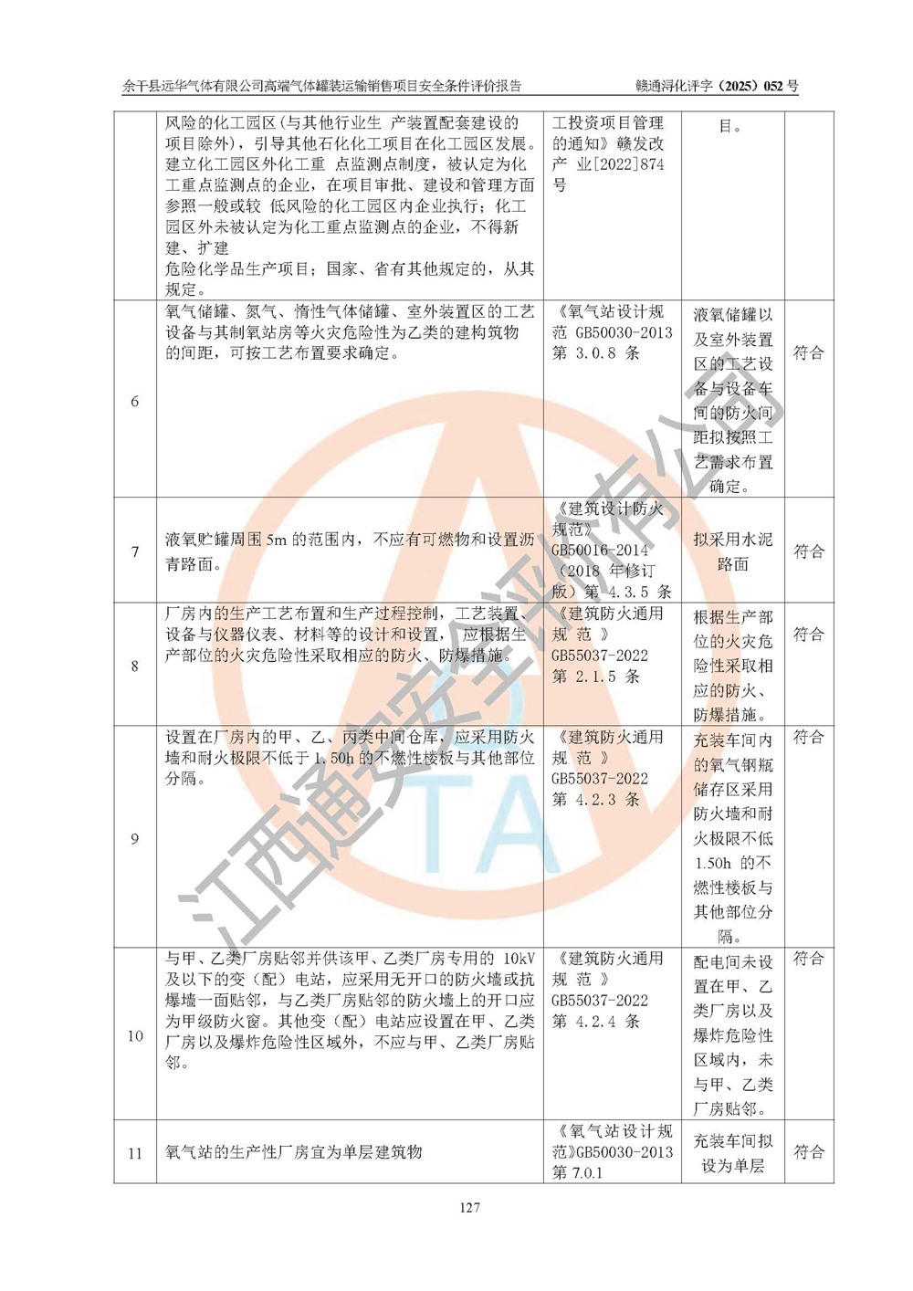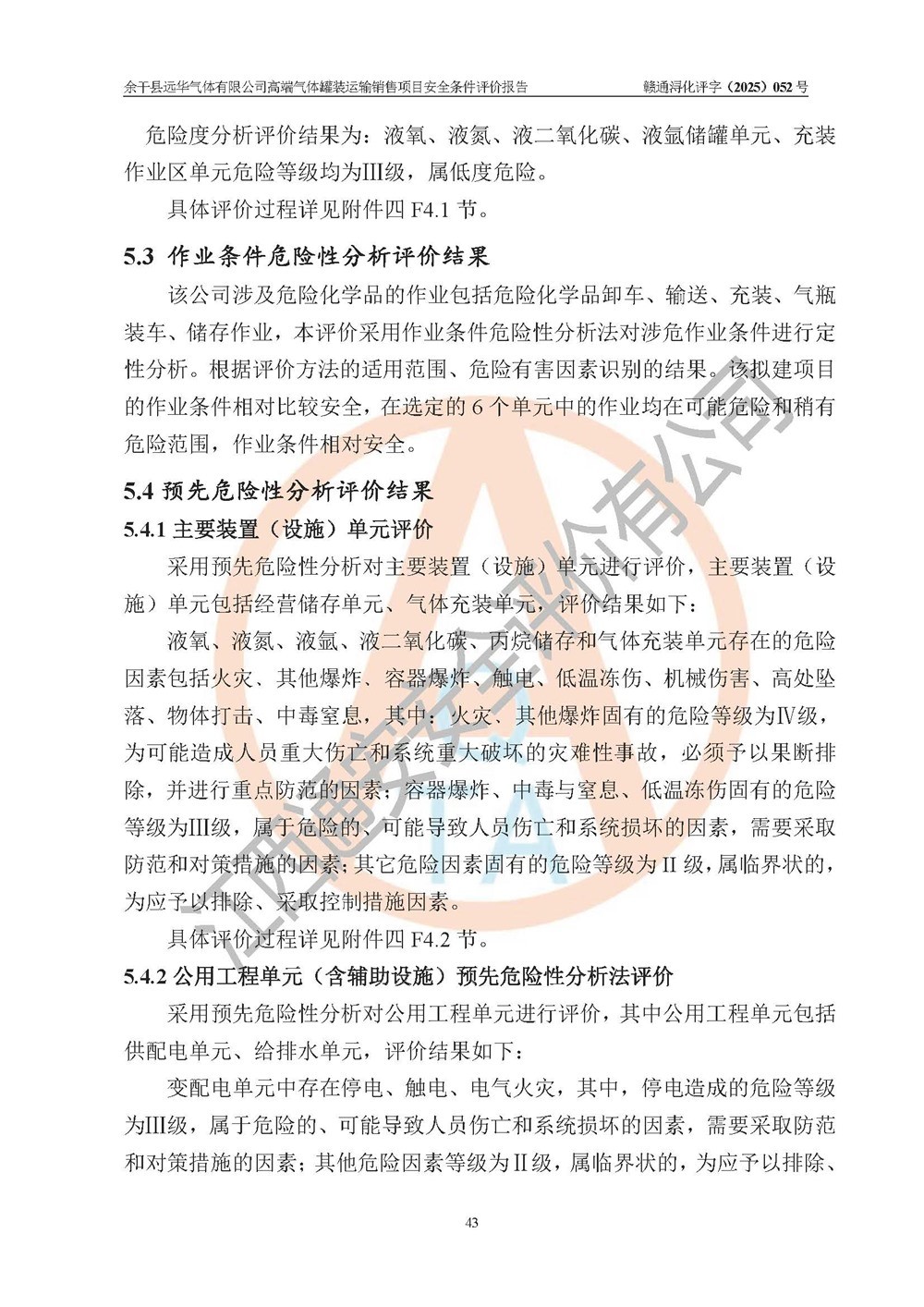 評(píng)價(jià)結(jié)論 | 綜上所述:余干縣遠(yuǎn)華氣體有限公司高端氣體罐裝運(yùn)輸銷售項(xiàng)目的選址、總平面布局、總體運(yùn)輸、周邊環(huán)境、自然環(huán)境能滿足建設(shè)安全條件;項(xiàng)目選擇的工藝過程及設(shè)備設(shè)施的安全可靠性能達(dá)到**法規(guī)、標(biāo)準(zhǔn)規(guī)定要求;項(xiàng)目存在的危險(xiǎn)有害因素可控,在落實(shí)本評(píng)價(jià)報(bào)告提出的有關(guān)安全對(duì)策措施后,其危險(xiǎn)有害程度能達(dá)到可以接受的程度,項(xiàng)目建設(shè)能夠?qū)崿F(xiàn)安全運(yùn)行目標(biāo)。 | ||||||