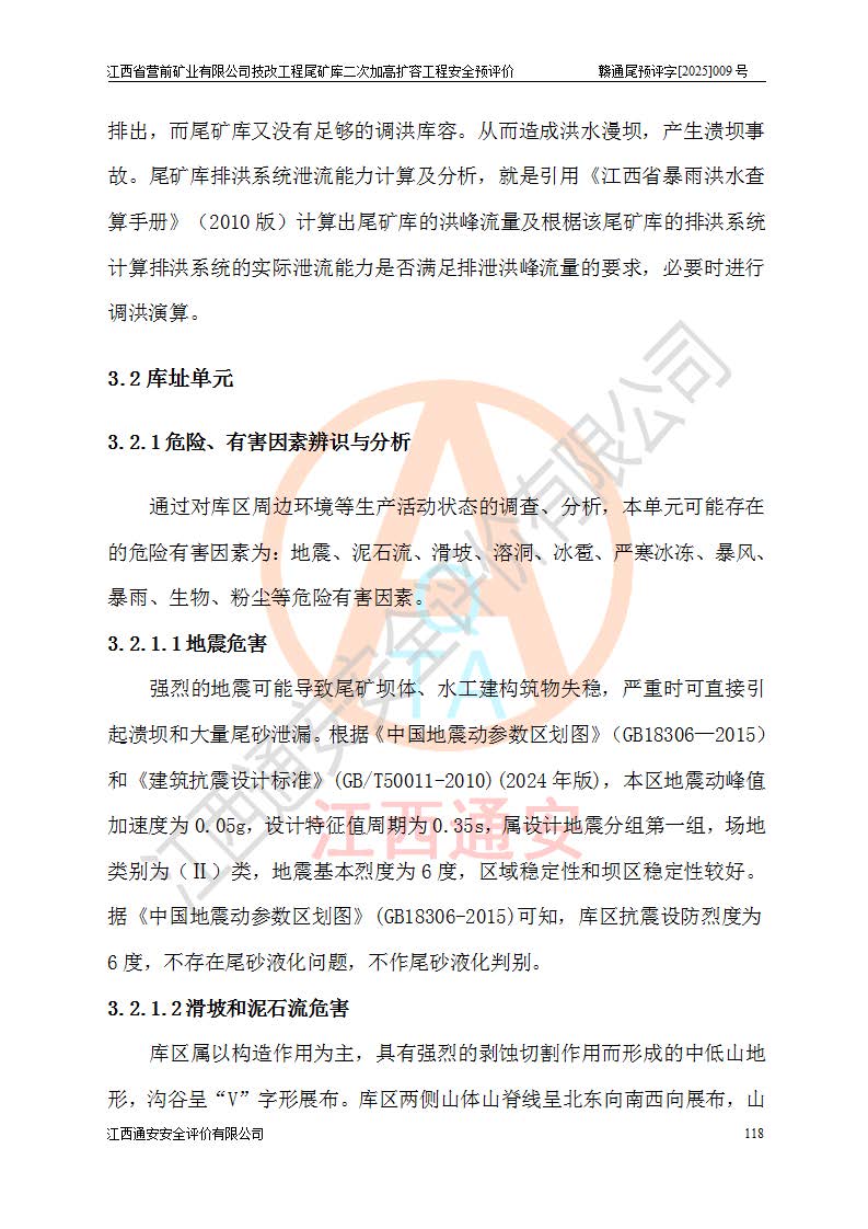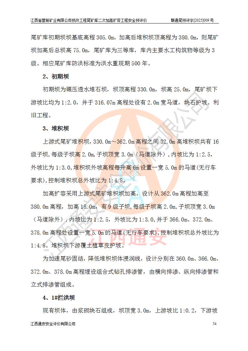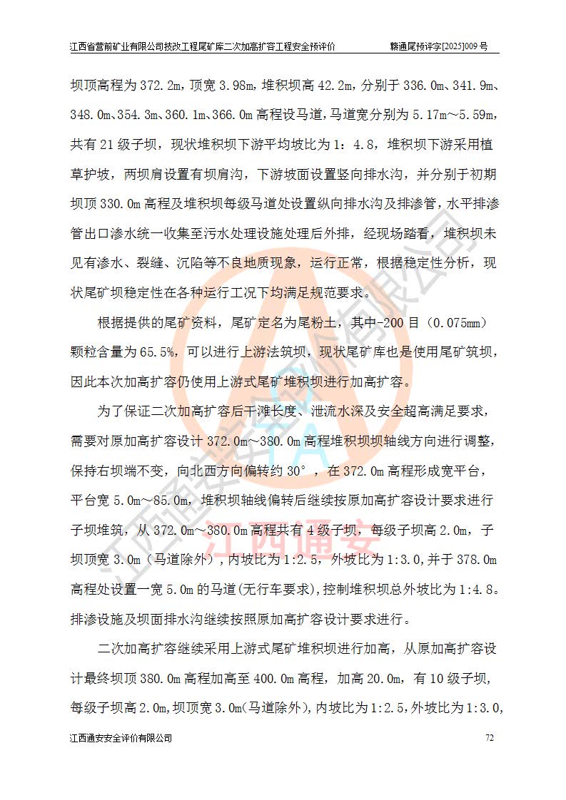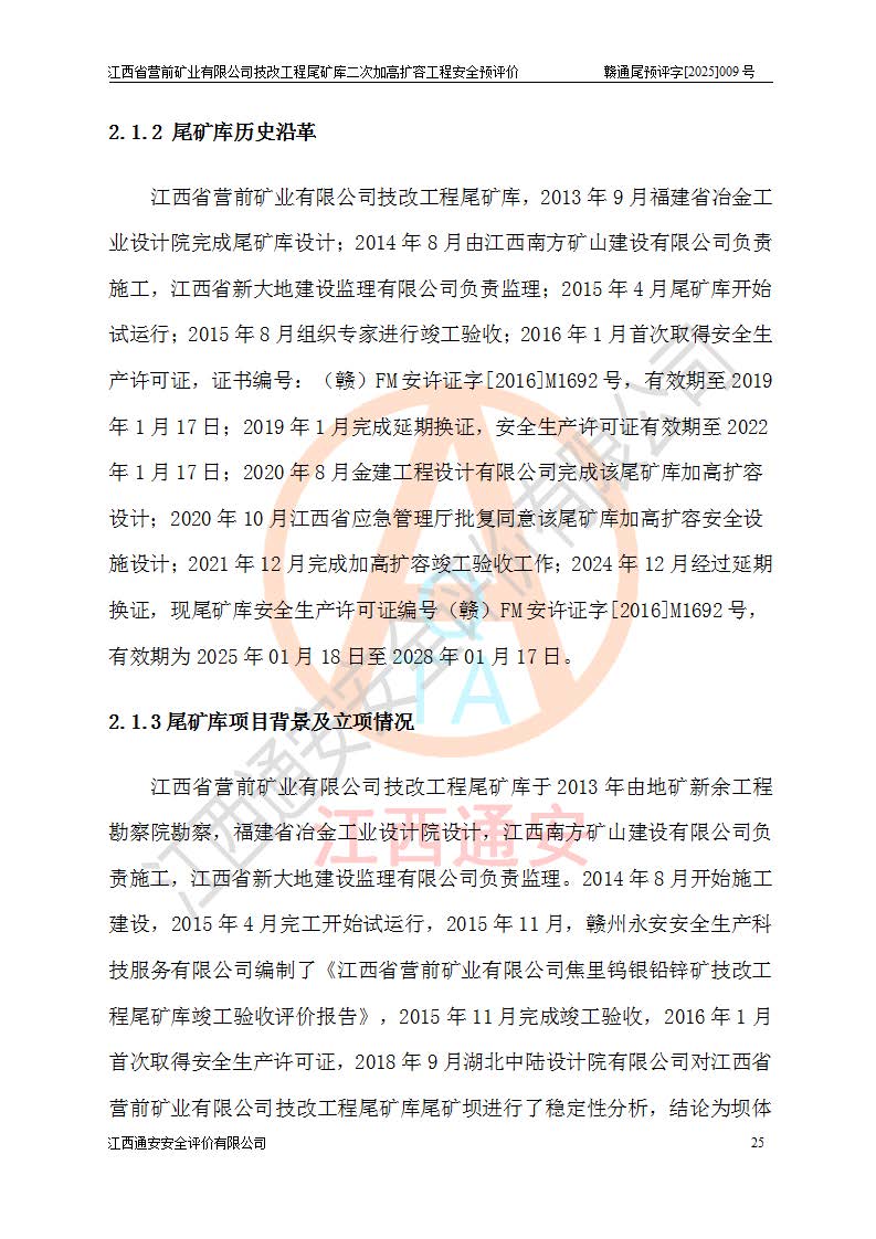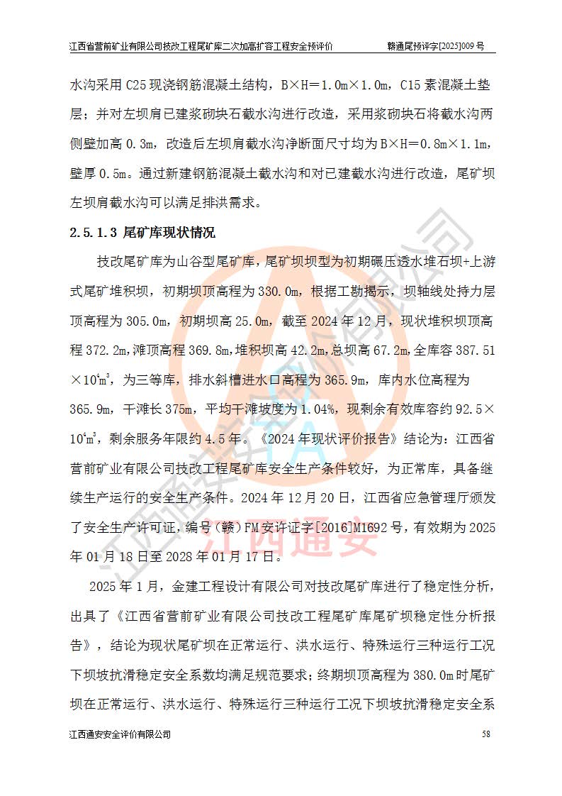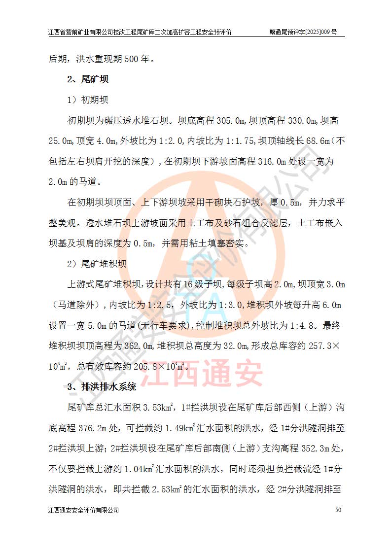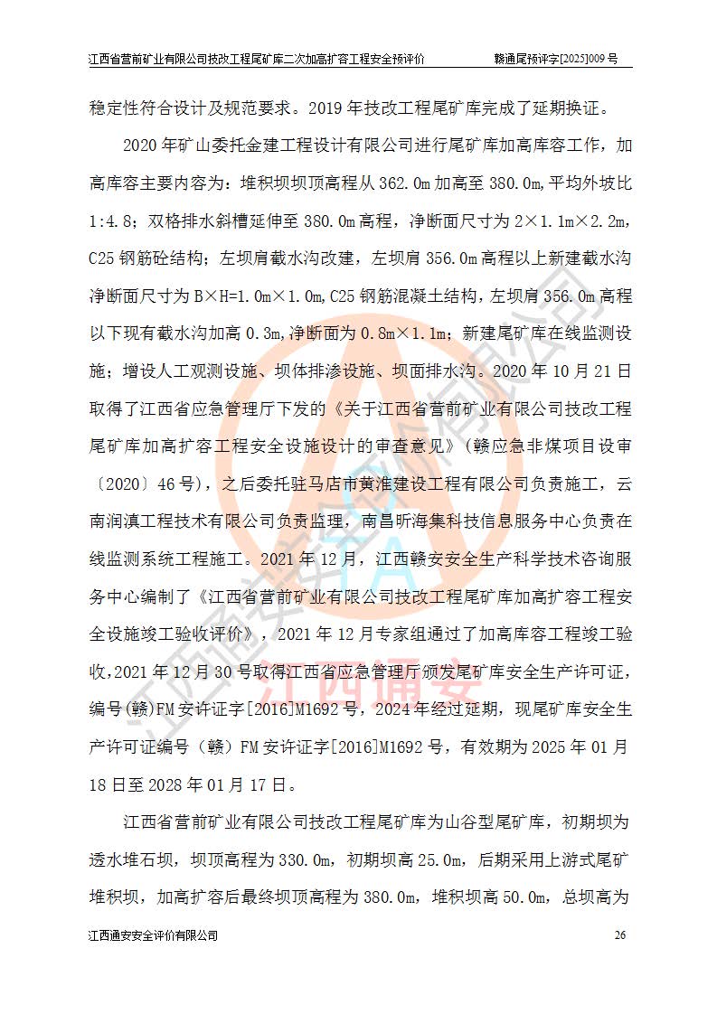 江西省營前礦業(yè)有限公司于2003年12月16日成立,位于贛州市上猶縣營前鎮(zhèn)焦里村境內(nèi),公司注冊資本10000萬元,法定**人陳雅博,礦區(qū)地理坐標(biāo):東經(jīng)114°18′30″~114°19′00″,北緯25°52′35″~25°53′47″。公司經(jīng)營范圍包括:鉛礦、鋅、鎢、銀地下開采、銷售。 江西省營前礦業(yè)有限公司技改工程尾礦庫位于焦里鎢銀鉛鋅礦區(qū),處于上猶縣水巖鄉(xiāng)井子村坑尾自然村境內(nèi),為山谷型尾礦庫。 江西省營前礦業(yè)有限公司技改工程尾礦庫于2013年由福建省冶金工業(yè)設(shè)計院設(shè)計,2014年8月開始施工建設(shè),2015年4月竣工開始試運(yùn)行,2015年11月完成竣工驗收,2016年1月首次取得安全生產(chǎn)許可證,2019年1月完成延期換證,2020年8月委托金建工程設(shè)計有限公司進(jìn)行尾礦庫加高擴(kuò)容工作,2020年10月21日取得了江西省應(yīng)急管理廳下發(fā)的《關(guān)于江西省營前礦業(yè)有限公司技改工程尾礦庫加高擴(kuò)容工程安全設(shè)施設(shè)計的審查意見》(贛應(yīng)急非煤項目設(shè)審〔2020〕46號),之后委托駐馬店市黃淮建設(shè)工程有限公司負(fù)責(zé)施工,云南潤滇工程技術(shù)有限公司負(fù)責(zé)監(jiān)理,2021年12月完成加高擴(kuò)容竣工驗收工作,經(jīng)過延期,現(xiàn)尾礦庫安全生產(chǎn)許可證編號(贛)FM安許證字[2016]M1692號,**期為2025年01月18日至2028年01月17日。 江西省營前礦業(yè)有限公司技改工程尾礦庫為山谷型尾礦庫,初期壩為透水堆石壩,壩頂高程為330.0m,初期壩高25.0m,后期采用上游式尾礦堆積壩,加高擴(kuò)容后*終壩頂高程為380.0m,堆積壩高50.0m,總壩高為75.0m,總庫容為為503.14×104m3,尾礦庫為三等庫。尾礦庫初期壩以上總匯水面積3.53km2,防洪標(biāo)準(zhǔn)取500年一遇。 目前尾礦庫由初期壩、堆積壩、庫內(nèi)排洪系統(tǒng)(雙格排水斜槽+連接井+排水涵洞+排洪隧洞+排水陡槽+消力池)、1#攔洪壩、1#分洪隧洞、2#攔洪壩、2#分洪隧洞和安全監(jiān)測設(shè)施組成。根據(jù)建設(shè)單位提供的尾礦庫平面布置圖,截至2024年12月,現(xiàn)狀尾礦庫堆積壩頂高程為372.2m,現(xiàn)狀總壩高67.2m,灘頂高程為369.8m,現(xiàn)狀全庫容387.51×104m3,現(xiàn)狀尾礦庫為三等庫,原加高擴(kuò)容設(shè)計*終堆積壩頂高程為380.0m,現(xiàn)剩余庫容115.63×104m3,剩余**庫容約92.5×104m3,剩余服務(wù)年限約4.5年;礦山現(xiàn)有儲量較大,剩余庫容及服務(wù)年限不滿足礦山后期生產(chǎn)需要。 技改工程尾礦庫尾礦壩下游1**范圍無居民,不存在工礦企業(yè)等建構(gòu)筑物,不屬于“頭頂庫”;尾礦庫不壓礦;距贛江直線距離60**;不涉及保護(hù)區(qū)及生態(tài)紅線;尾礦庫所在溝谷較長,谷底平均縱坡9%,上游周邊山體地形有利于尾礦庫二次加高擴(kuò)容工程的實(shí)施,因此為了增加尾礦庫庫容,延長服務(wù)年限,充分利用尾礦庫所在溝谷地形,江西省營前礦業(yè)有限公司對技改尾礦庫進(jìn)行二次加高擴(kuò)容。 2024年12月,江西省營前礦業(yè)有限公司委托地礦贛西地質(zhì)工程勘察院編制了《江西省營前礦業(yè)有限公司技改工程尾礦庫二次擴(kuò)容工程(水文)地質(zhì)勘察報告》,2025年4月,江西省營前礦業(yè)有限公司委托金建工程設(shè)計有限公司編制了《江西省營前礦業(yè)有限公司技改工程尾礦庫二次加高擴(kuò)容工程可行性研究報告》。 按照非煤礦山建設(shè)項目安全設(shè)施“三同時”的規(guī)定要求,技改工程尾礦庫為二次加高擴(kuò)容工程,**進(jìn)行安全預(yù)評價;江西省營前礦業(yè)有限公司委托我公司承擔(dān)技改工程尾礦庫二次加高擴(kuò)容工程建設(shè)項目的安全預(yù)評價工作。 |