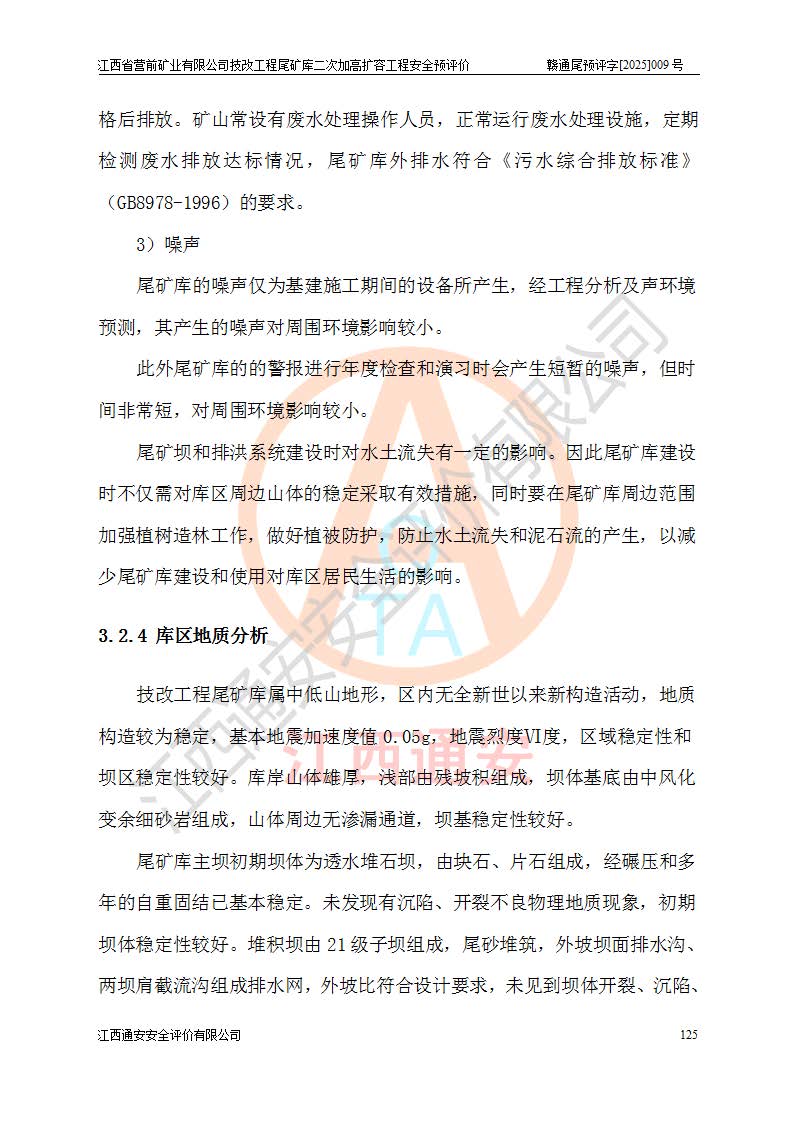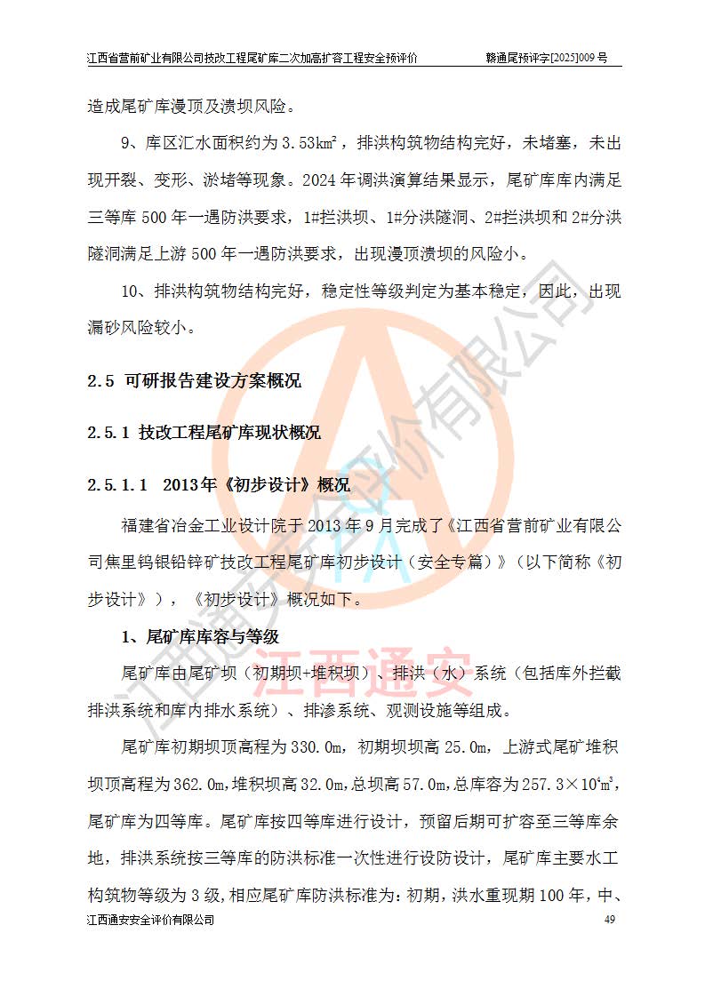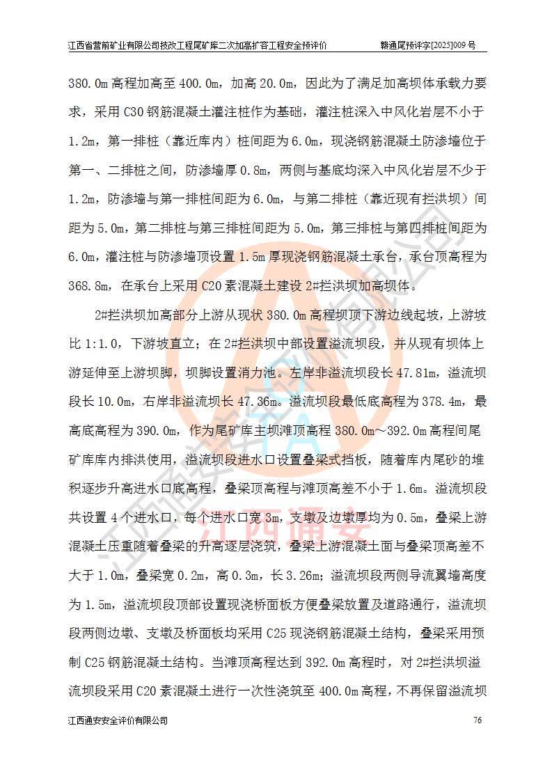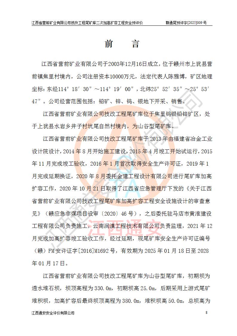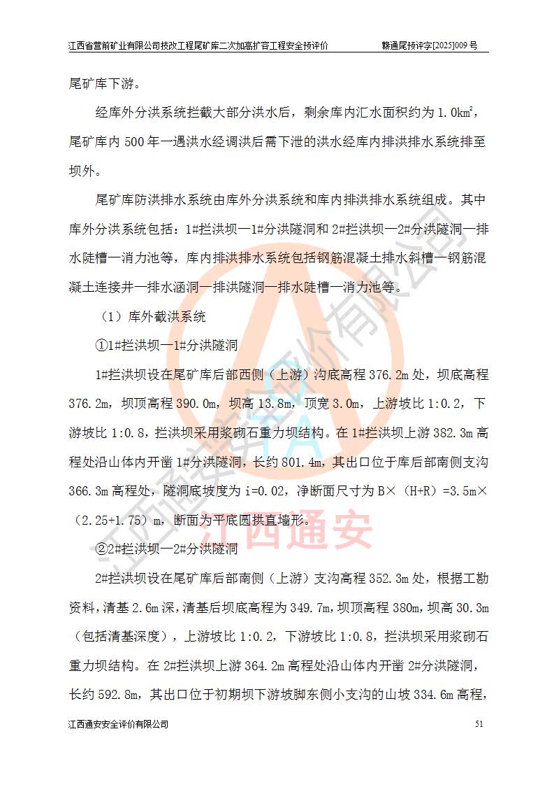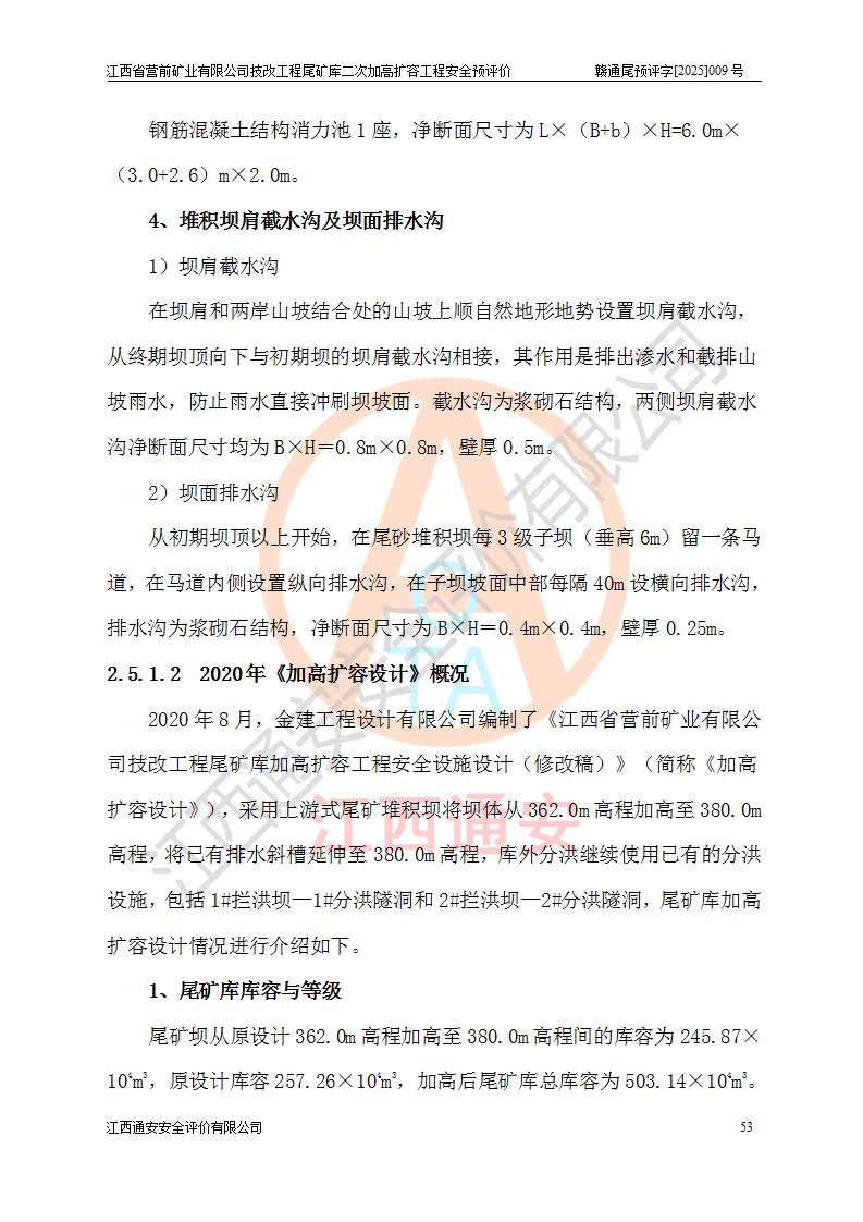 江西省營前礦業(yè)有限公司于2003年12月16日成立,位于贛州市上猶縣營前鎮(zhèn)焦里村境內(nèi),公司注冊資本10000萬元,法定**人陳雅博,礦區(qū)地理坐標(biāo):東經(jīng)114°18′30″~114°19′00″,北緯25°52′35″~25°53′47″。公司經(jīng)營范圍包括:鉛礦、鋅、鎢、銀地下開采、銷售。 江西省營前礦業(yè)有限公司技改工程尾礦庫位于焦里鎢銀鉛鋅礦區(qū),處于上猶縣水巖鄉(xiāng)井子村坑尾自然村境內(nèi),為山谷型尾礦庫。 江西省營前礦業(yè)有限公司技改工程尾礦庫于2013年由福建省冶金工業(yè)設(shè)計院設(shè)計,2014年8月開始施工建設(shè),2015年4月竣工開始試運(yùn)行,2015年11月完成竣工驗收,2016年1月首次取得安全生產(chǎn)許可證,2019年1月完成延期換證,2020年8月委托金建工程設(shè)計有限公司進(jìn)行尾礦庫加高擴(kuò)容工作,2020年10月21日取得了江西省應(yīng)急管理廳下發(fā)的《關(guān)于江西省營前礦業(yè)有限公司技改工程尾礦庫加高擴(kuò)容工程安全設(shè)施設(shè)計的審查意見》(贛應(yīng)急非煤項目設(shè)審〔2020〕46號),之后委托駐馬店市黃淮建設(shè)工程有限公司負(fù)責(zé)施工,云南潤滇工程技術(shù)有限公司負(fù)責(zé)監(jiān)理,2021年12月完成加高擴(kuò)容竣工驗收工作,經(jīng)過延期,現(xiàn)尾礦庫安全生產(chǎn)許可證編號(贛)FM安許證字[2016]M1692號,**期為2025年01月18日至2028年01月17日。 江西省營前礦業(yè)有限公司技改工程尾礦庫為山谷型尾礦庫,初期壩為透水堆石壩,壩頂高程為330.0m,初期壩高25.0m,后期采用上游式尾礦堆積壩,加高擴(kuò)容后*終壩頂高程為380.0m,堆積壩高50.0m,總壩高為75.0m,總庫容為為503.14×104m3,尾礦庫為三等庫。尾礦庫初期壩以上總匯水面積3.53km2,防洪標(biāo)準(zhǔn)取500年一遇。 目前尾礦庫由初期壩、堆積壩、庫內(nèi)排洪系統(tǒng)(雙格排水斜槽+連接井+排水涵洞+排洪隧洞+排水陡槽+消力池)、1#攔洪壩、1#分洪隧洞、2#攔洪壩、2#分洪隧洞和安全監(jiān)測設(shè)施組成。根據(jù)建設(shè)單位提供的尾礦庫平面布置圖,截至2024年12月,現(xiàn)狀尾礦庫堆積壩頂高程為372.2m,現(xiàn)狀總壩高67.2m,灘頂高程為369.8m,現(xiàn)狀全庫容387.51×104m3,現(xiàn)狀尾礦庫為三等庫,原加高擴(kuò)容設(shè)計*終堆積壩頂高程為380.0m,現(xiàn)剩余庫容115.63×104m3,剩余**庫容約92.5×104m3,剩余服務(wù)年限約4.5年;礦山現(xiàn)有儲量較大,剩余庫容及服務(wù)年限不滿足礦山后期生產(chǎn)需要。 技改工程尾礦庫尾礦壩下游1**范圍無居民,不存在工礦企業(yè)等建構(gòu)筑物,不屬于“頭頂庫”;尾礦庫不壓礦;距贛江直線距離60**;不涉及保護(hù)區(qū)及生態(tài)紅線;尾礦庫所在溝谷較長,谷底平均縱坡9%,上游周邊山體地形有利于尾礦庫二次加高擴(kuò)容工程的實(shí)施,因此為了增加尾礦庫庫容,延長服務(wù)年限,充分利用尾礦庫所在溝谷地形,江西省營前礦業(yè)有限公司對技改尾礦庫進(jìn)行二次加高擴(kuò)容。 2024年12月,江西省營前礦業(yè)有限公司委托地礦贛西地質(zhì)工程勘察院編制了《江西省營前礦業(yè)有限公司技改工程尾礦庫二次擴(kuò)容工程(水文)地質(zhì)勘察報告》,2025年4月,江西省營前礦業(yè)有限公司委托金建工程設(shè)計有限公司編制了《江西省營前礦業(yè)有限公司技改工程尾礦庫二次加高擴(kuò)容工程可行性研究報告》。 按照非煤礦山建設(shè)項目安全設(shè)施“三同時”的規(guī)定要求,技改工程尾礦庫為二次加高擴(kuò)容工程,**進(jìn)行安全預(yù)評價;江西省營前礦業(yè)有限公司委托我公司承擔(dān)技改工程尾礦庫二次加高擴(kuò)容工程建設(shè)項目的安全預(yù)評價工作。 |