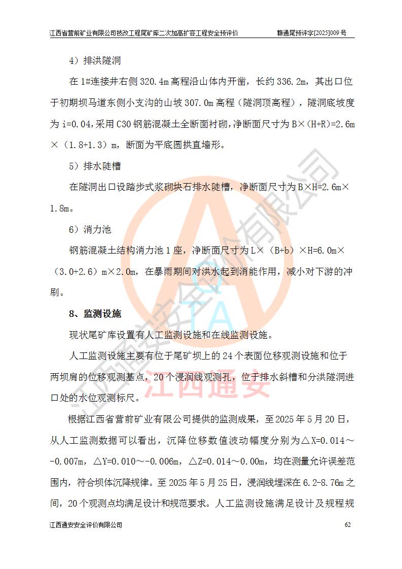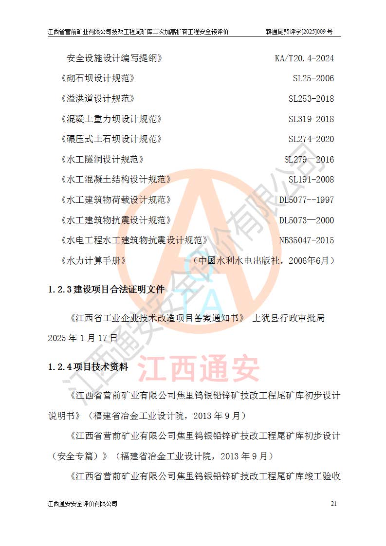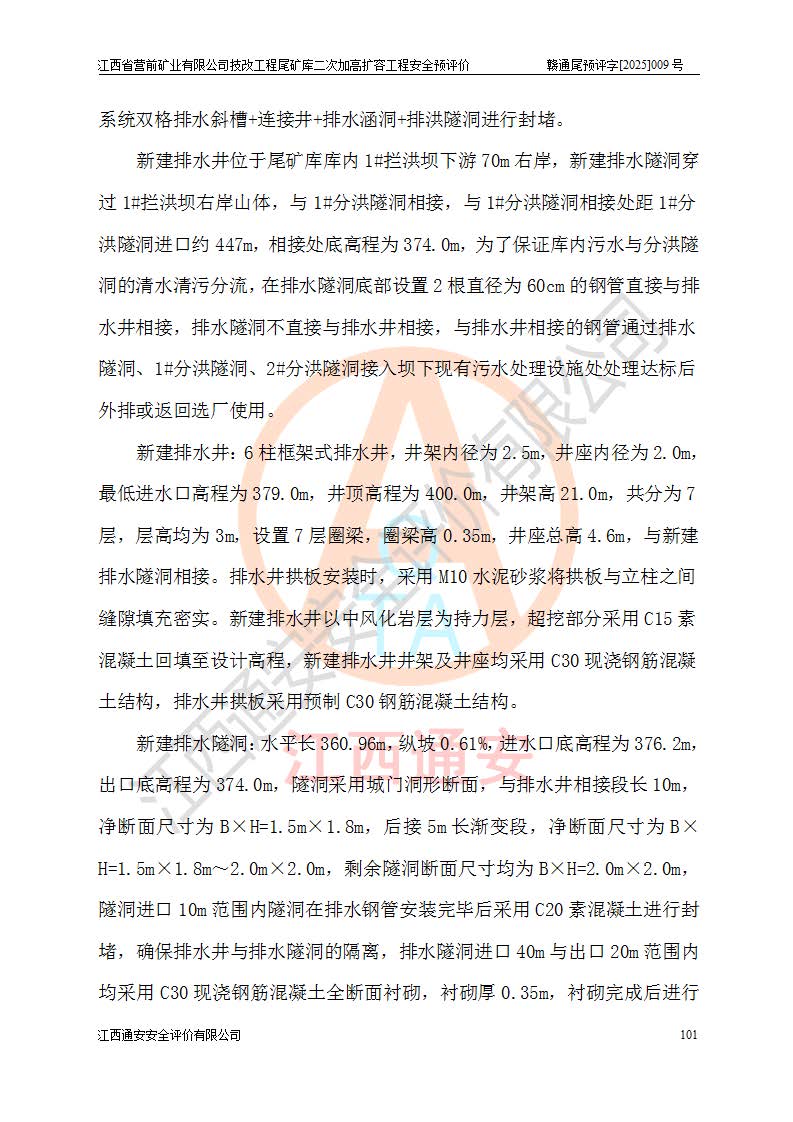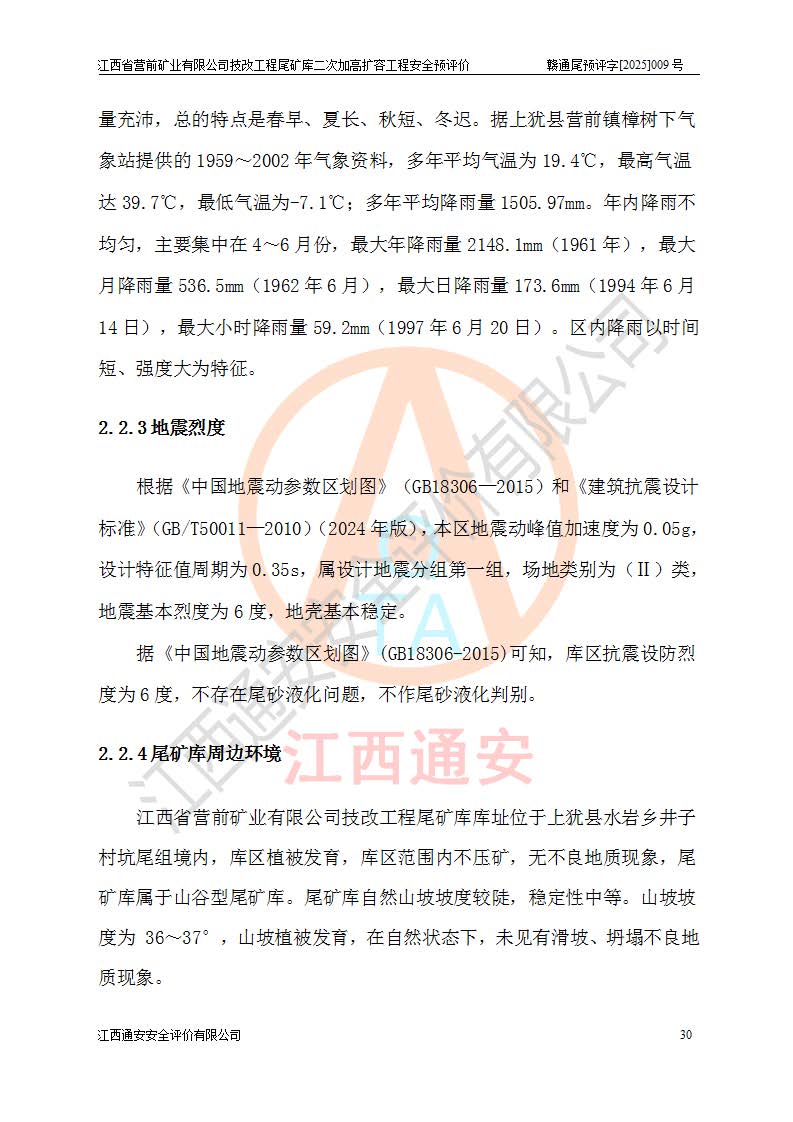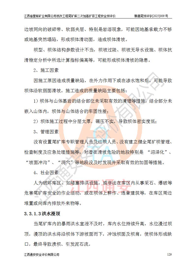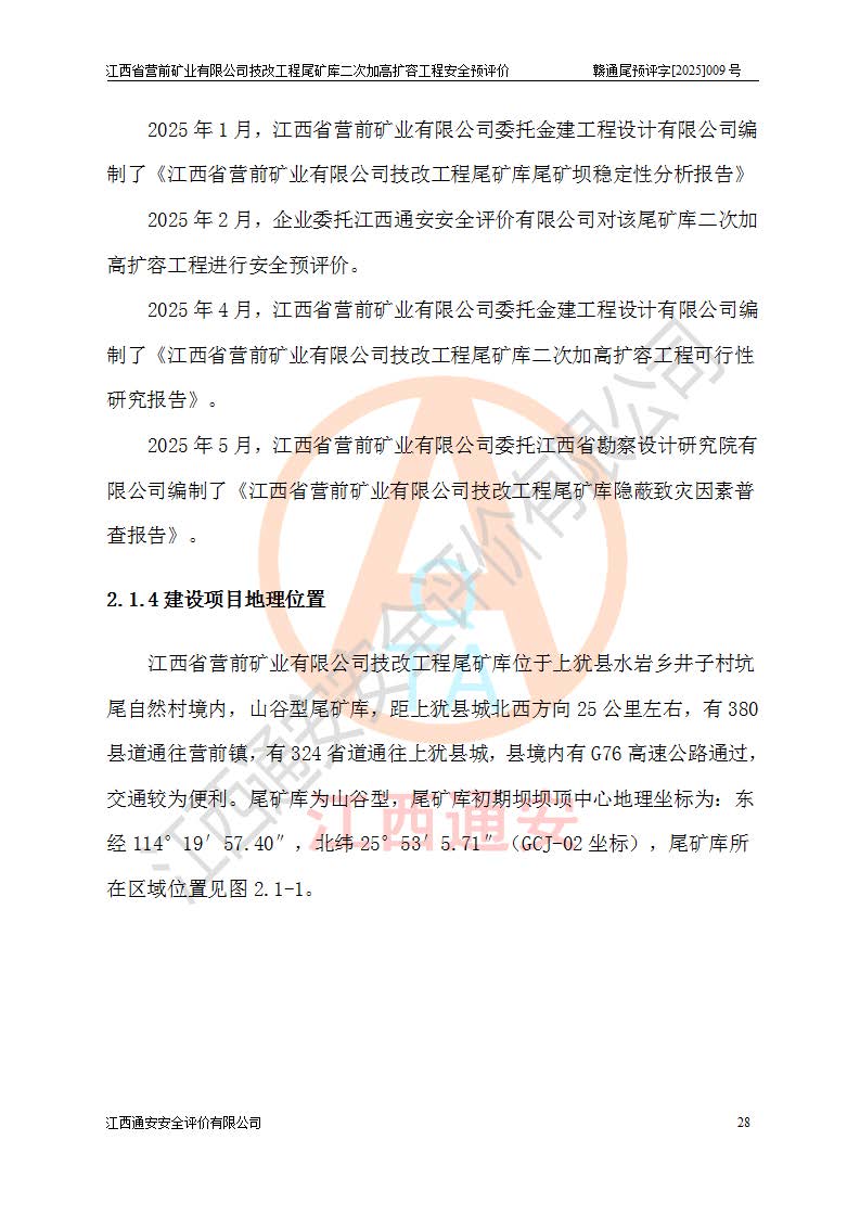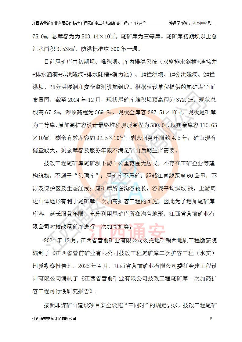 江西省營前礦業(yè)有限公司于2003年12月16日成立,位于贛州市上猶縣營前鎮(zhèn)焦里村境內(nèi),公司注冊資本10000萬元,法定**人陳雅博,礦區(qū)地理坐標(biāo):東經(jīng)114°18′30″~114°19′00″,北緯25°52′35″~25°53′47″。公司經(jīng)營范圍包括:鉛礦、鋅、鎢、銀地下開采、銷售。 江西省營前礦業(yè)有限公司技改工程尾礦庫位于焦里鎢銀鉛鋅礦區(qū),處于上猶縣水巖鄉(xiāng)井子村坑尾自然村境內(nèi),為山谷型尾礦庫。 江西省營前礦業(yè)有限公司技改工程尾礦庫于2013年由福建省冶金工業(yè)設(shè)計院設(shè)計,2014年8月開始施工建設(shè),2015年4月竣工開始試運(yùn)行,2015年11月完成竣工驗收,2016年1月首次取得安全生產(chǎn)許可證,2019年1月完成延期換證,2020年8月委托金建工程設(shè)計有限公司進(jìn)行尾礦庫加高擴(kuò)容工作,2020年10月21日取得了江西省應(yīng)急管理廳下發(fā)的《關(guān)于江西省營前礦業(yè)有限公司技改工程尾礦庫加高擴(kuò)容工程安全設(shè)施設(shè)計的審查意見》(贛應(yīng)急非煤項目設(shè)審〔2020〕46號),之后委托駐馬店市黃淮建設(shè)工程有限公司負(fù)責(zé)施工,云南潤滇工程技術(shù)有限公司負(fù)責(zé)監(jiān)理,2021年12月完成加高擴(kuò)容竣工驗收工作,經(jīng)過延期,現(xiàn)尾礦庫安全生產(chǎn)許可證編號(贛)FM安許證字[2016]M1692號,**期為2025年01月18日至2028年01月17日。 江西省營前礦業(yè)有限公司技改工程尾礦庫為山谷型尾礦庫,初期壩為透水堆石壩,壩頂高程為330.0m,初期壩高25.0m,后期采用上游式尾礦堆積壩,加高擴(kuò)容后*終壩頂高程為380.0m,堆積壩高50.0m,總壩高為75.0m,總庫容為為503.14×104m3,尾礦庫為三等庫。尾礦庫初期壩以上總匯水面積3.53km2,防洪標(biāo)準(zhǔn)取500年一遇。 目前尾礦庫由初期壩、堆積壩、庫內(nèi)排洪系統(tǒng)(雙格排水斜槽+連接井+排水涵洞+排洪隧洞+排水陡槽+消力池)、1#攔洪壩、1#分洪隧洞、2#攔洪壩、2#分洪隧洞和安全監(jiān)測設(shè)施組成。根據(jù)建設(shè)單位提供的尾礦庫平面布置圖,截至2024年12月,現(xiàn)狀尾礦庫堆積壩頂高程為372.2m,現(xiàn)狀總壩高67.2m,灘頂高程為369.8m,現(xiàn)狀全庫容387.51×104m3,現(xiàn)狀尾礦庫為三等庫,原加高擴(kuò)容設(shè)計*終堆積壩頂高程為380.0m,現(xiàn)剩余庫容115.63×104m3,剩余**庫容約92.5×104m3,剩余服務(wù)年限約4.5年;礦山現(xiàn)有儲量較大,剩余庫容及服務(wù)年限不滿足礦山后期生產(chǎn)需要。 技改工程尾礦庫尾礦壩下游1**范圍無居民,不存在工礦企業(yè)等建構(gòu)筑物,不屬于“頭頂庫”;尾礦庫不壓礦;距贛江直線距離60**;不涉及保護(hù)區(qū)及生態(tài)紅線;尾礦庫所在溝谷較長,谷底平均縱坡9%,上游周邊山體地形有利于尾礦庫二次加高擴(kuò)容工程的實(shí)施,因此為了增加尾礦庫庫容,延長服務(wù)年限,充分利用尾礦庫所在溝谷地形,江西省營前礦業(yè)有限公司對技改尾礦庫進(jìn)行二次加高擴(kuò)容。 2024年12月,江西省營前礦業(yè)有限公司委托地礦贛西地質(zhì)工程勘察院編制了《江西省營前礦業(yè)有限公司技改工程尾礦庫二次擴(kuò)容工程(水文)地質(zhì)勘察報告》,2025年4月,江西省營前礦業(yè)有限公司委托金建工程設(shè)計有限公司編制了《江西省營前礦業(yè)有限公司技改工程尾礦庫二次加高擴(kuò)容工程可行性研究報告》。 按照非煤礦山建設(shè)項目安全設(shè)施“三同時”的規(guī)定要求,技改工程尾礦庫為二次加高擴(kuò)容工程,**進(jìn)行安全預(yù)評價;江西省營前礦業(yè)有限公司委托我公司承擔(dān)技改工程尾礦庫二次加高擴(kuò)容工程建設(shè)項目的安全預(yù)評價工作。 |