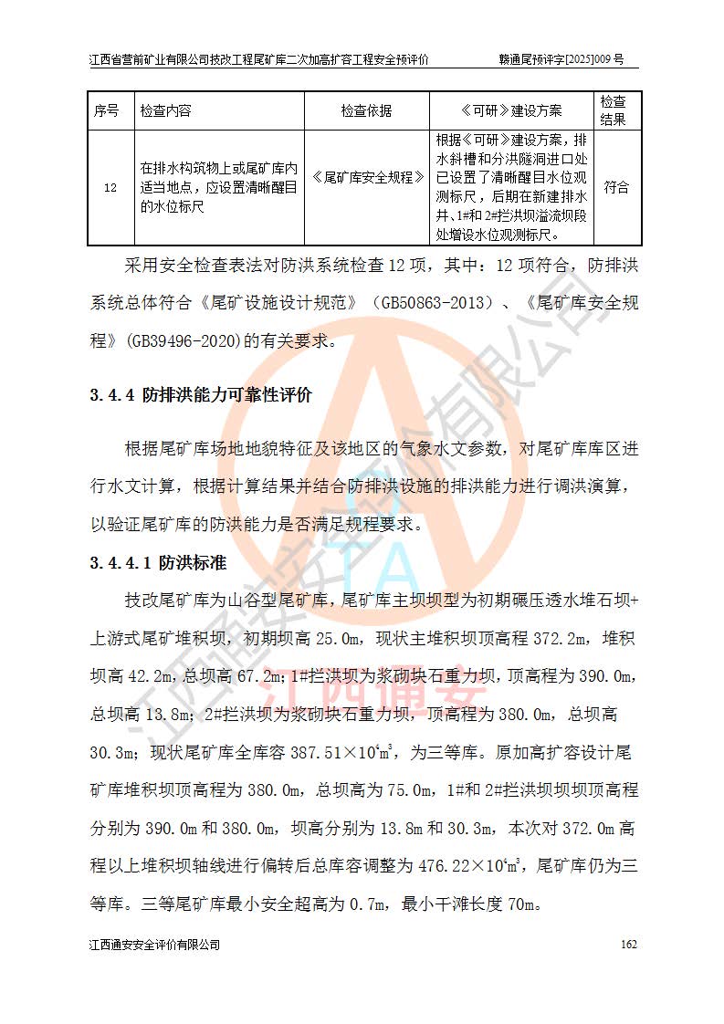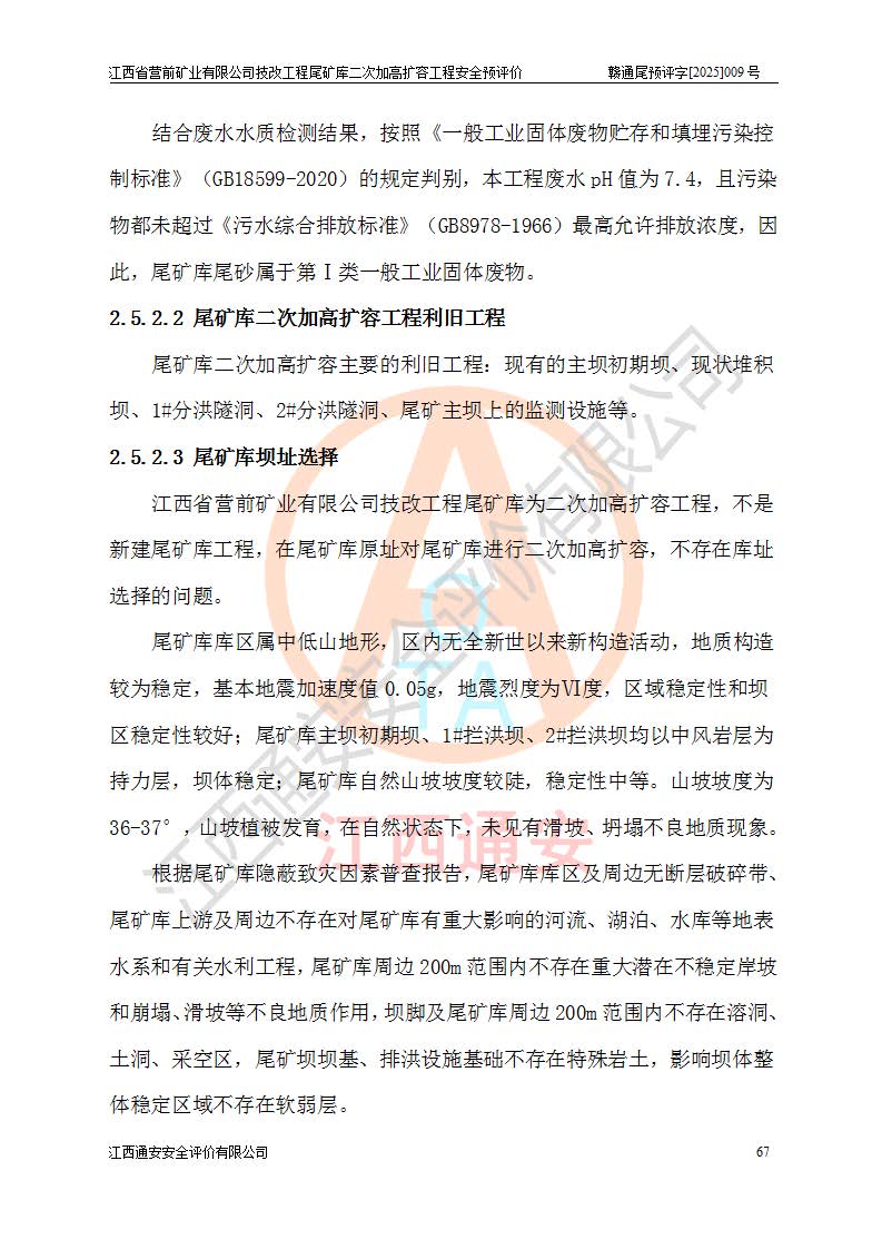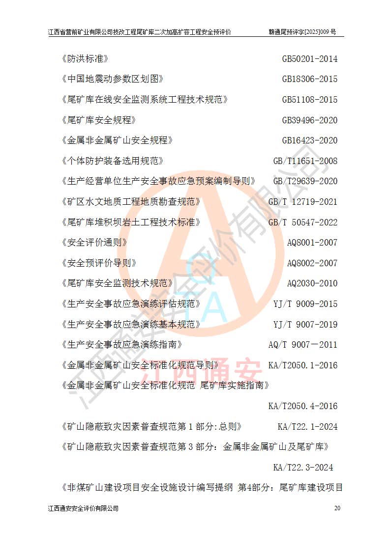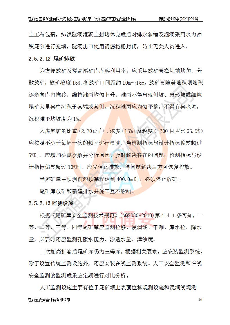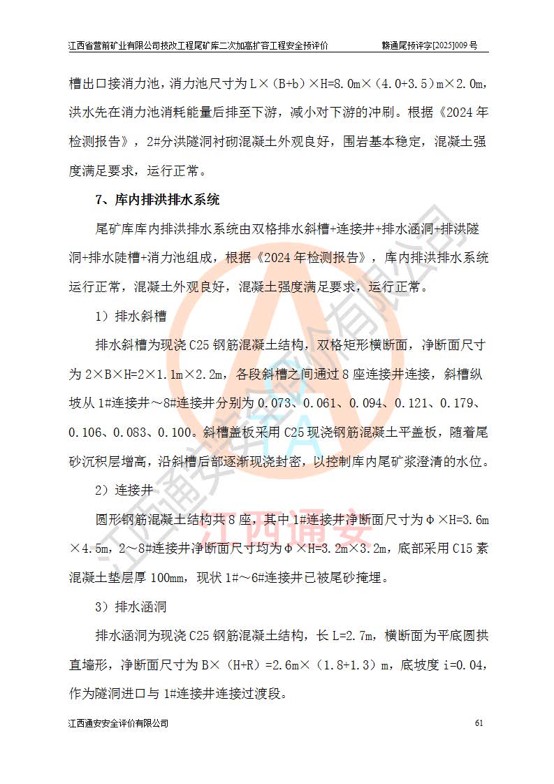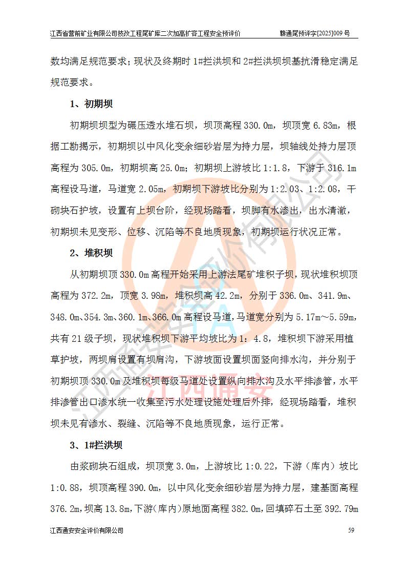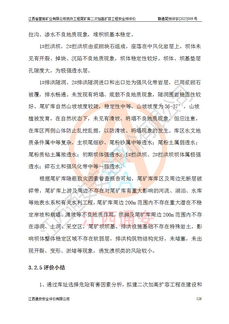 江西省營前礦業(yè)有限公司于2003年12月16日成立,位于贛州市上猶縣營前鎮(zhèn)焦里村境內(nèi),公司注冊資本10000萬元,法定**人陳雅博,礦區(qū)地理坐標(biāo):東經(jīng)114°18′30″~114°19′00″,北緯25°52′35″~25°53′47″。公司經(jīng)營范圍包括:鉛礦、鋅、鎢、銀地下開采、銷售。 江西省營前礦業(yè)有限公司技改工程尾礦庫位于焦里鎢銀鉛鋅礦區(qū),處于上猶縣水巖鄉(xiāng)井子村坑尾自然村境內(nèi),為山谷型尾礦庫。 江西省營前礦業(yè)有限公司技改工程尾礦庫于2013年由福建省冶金工業(yè)設(shè)計院設(shè)計,2014年8月開始施工建設(shè),2015年4月竣工開始試運(yùn)行,2015年11月完成竣工驗收,2016年1月首次取得安全生產(chǎn)許可證,2019年1月完成延期換證,2020年8月委托金建工程設(shè)計有限公司進(jìn)行尾礦庫加高擴(kuò)容工作,2020年10月21日取得了江西省應(yīng)急管理廳下發(fā)的《關(guān)于江西省營前礦業(yè)有限公司技改工程尾礦庫加高擴(kuò)容工程安全設(shè)施設(shè)計的審查意見》(贛應(yīng)急非煤項目設(shè)審〔2020〕46號),之后委托駐馬店市黃淮建設(shè)工程有限公司負(fù)責(zé)施工,云南潤滇工程技術(shù)有限公司負(fù)責(zé)監(jiān)理,2021年12月完成加高擴(kuò)容竣工驗收工作,經(jīng)過延期,現(xiàn)尾礦庫安全生產(chǎn)許可證編號(贛)FM安許證字[2016]M1692號,**期為2025年01月18日至2028年01月17日。 江西省營前礦業(yè)有限公司技改工程尾礦庫為山谷型尾礦庫,初期壩為透水堆石壩,壩頂高程為330.0m,初期壩高25.0m,后期采用上游式尾礦堆積壩,加高擴(kuò)容后*終壩頂高程為380.0m,堆積壩高50.0m,總壩高為75.0m,總庫容為為503.14×104m3,尾礦庫為三等庫。尾礦庫初期壩以上總匯水面積3.53km2,防洪標(biāo)準(zhǔn)取500年一遇。 目前尾礦庫由初期壩、堆積壩、庫內(nèi)排洪系統(tǒng)(雙格排水斜槽+連接井+排水涵洞+排洪隧洞+排水陡槽+消力池)、1#攔洪壩、1#分洪隧洞、2#攔洪壩、2#分洪隧洞和安全監(jiān)測設(shè)施組成。根據(jù)建設(shè)單位提供的尾礦庫平面布置圖,截至2024年12月,現(xiàn)狀尾礦庫堆積壩頂高程為372.2m,現(xiàn)狀總壩高67.2m,灘頂高程為369.8m,現(xiàn)狀全庫容387.51×104m3,現(xiàn)狀尾礦庫為三等庫,原加高擴(kuò)容設(shè)計*終堆積壩頂高程為380.0m,現(xiàn)剩余庫容115.63×104m3,剩余**庫容約92.5×104m3,剩余服務(wù)年限約4.5年;礦山現(xiàn)有儲量較大,剩余庫容及服務(wù)年限不滿足礦山后期生產(chǎn)需要。 技改工程尾礦庫尾礦壩下游1**范圍無居民,不存在工礦企業(yè)等建構(gòu)筑物,不屬于“頭頂庫”;尾礦庫不壓礦;距贛江直線距離60**;不涉及保護(hù)區(qū)及生態(tài)紅線;尾礦庫所在溝谷較長,谷底平均縱坡9%,上游周邊山體地形有利于尾礦庫二次加高擴(kuò)容工程的實(shí)施,因此為了增加尾礦庫庫容,延長服務(wù)年限,充分利用尾礦庫所在溝谷地形,江西省營前礦業(yè)有限公司對技改尾礦庫進(jìn)行二次加高擴(kuò)容。 2024年12月,江西省營前礦業(yè)有限公司委托地礦贛西地質(zhì)工程勘察院編制了《江西省營前礦業(yè)有限公司技改工程尾礦庫二次擴(kuò)容工程(水文)地質(zhì)勘察報告》,2025年4月,江西省營前礦業(yè)有限公司委托金建工程設(shè)計有限公司編制了《江西省營前礦業(yè)有限公司技改工程尾礦庫二次加高擴(kuò)容工程可行性研究報告》。 按照非煤礦山建設(shè)項目安全設(shè)施“三同時”的規(guī)定要求,技改工程尾礦庫為二次加高擴(kuò)容工程,**進(jìn)行安全預(yù)評價;江西省營前礦業(yè)有限公司委托我公司承擔(dān)技改工程尾礦庫二次加高擴(kuò)容工程建設(shè)項目的安全預(yù)評價工作。 |