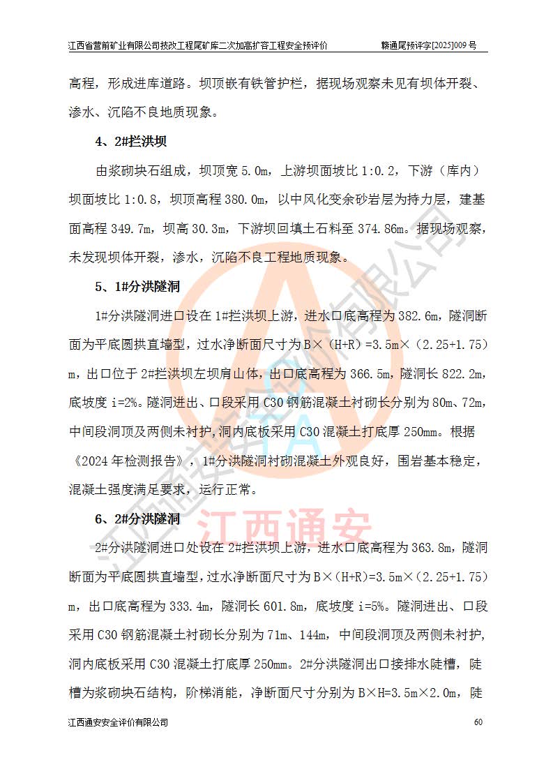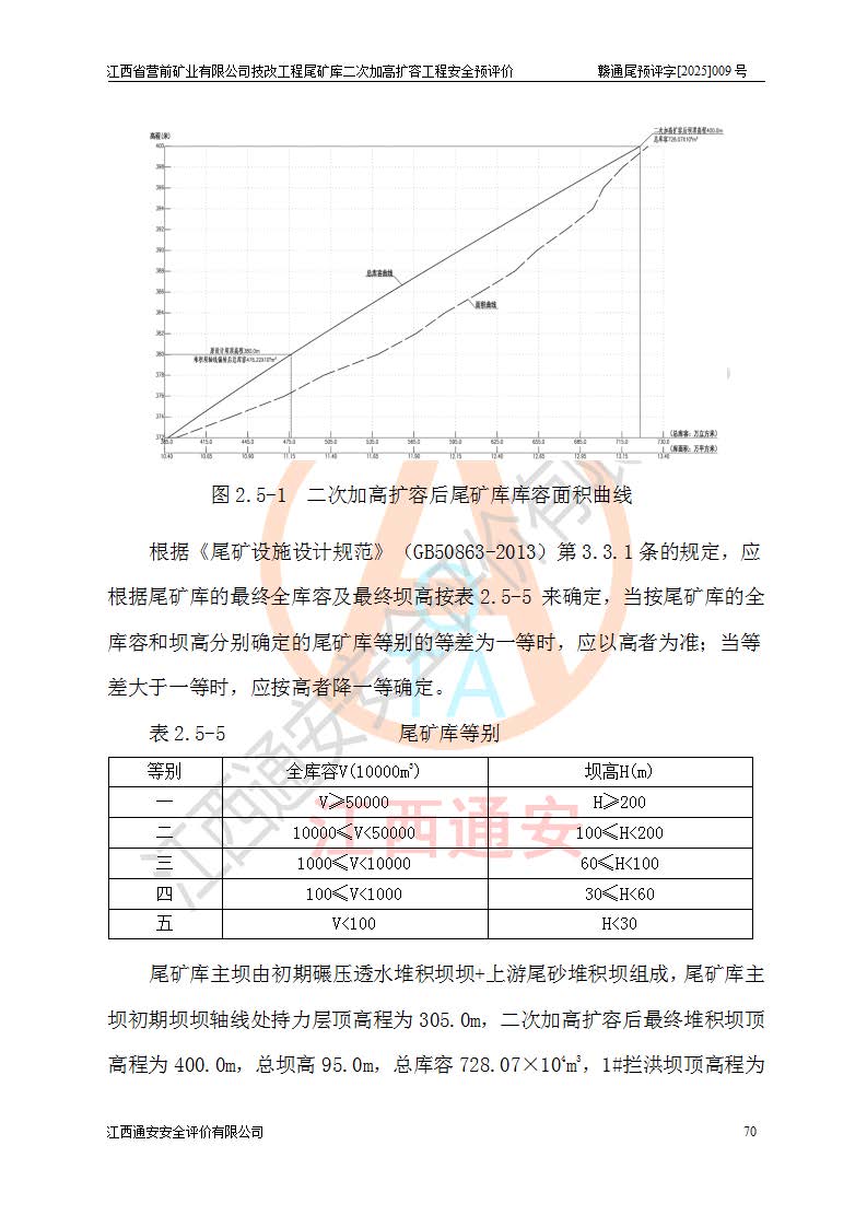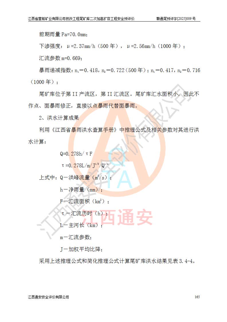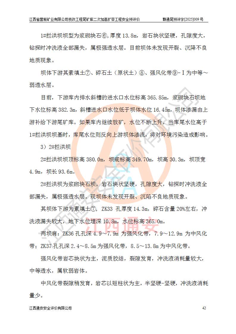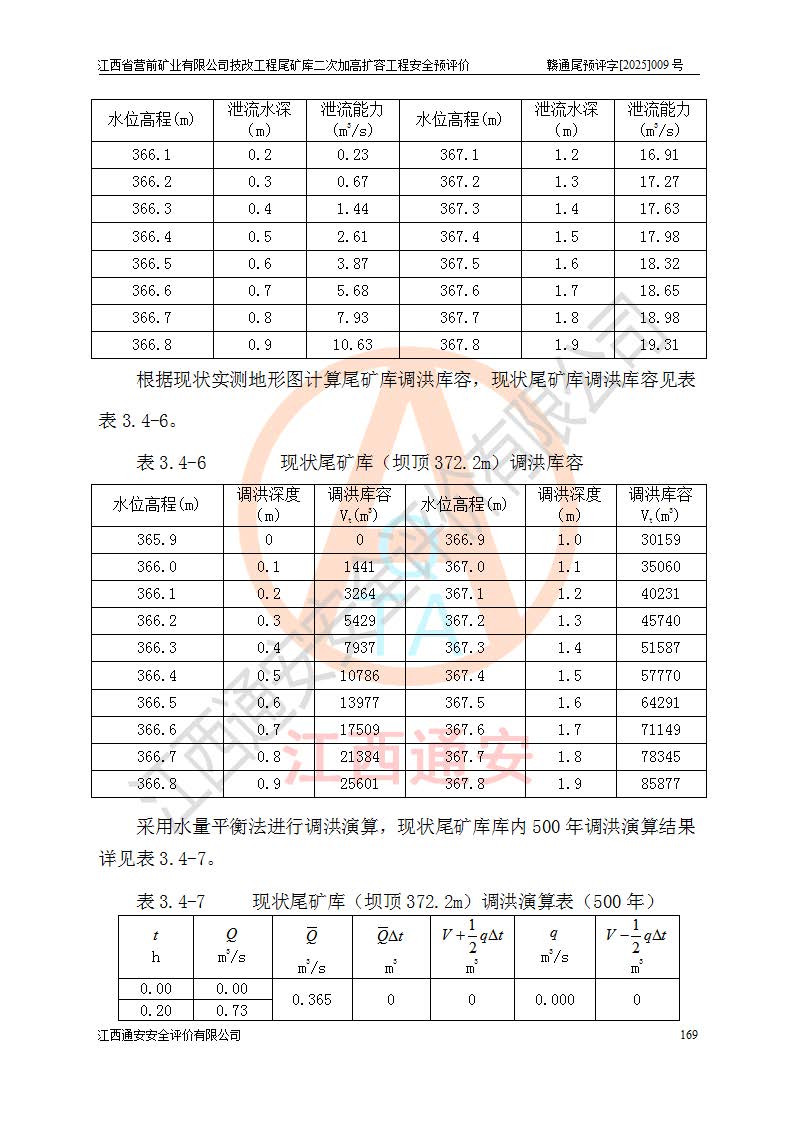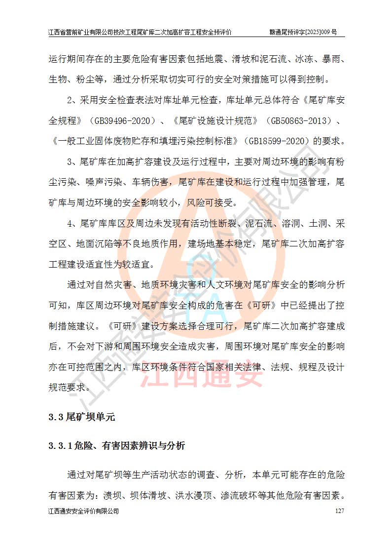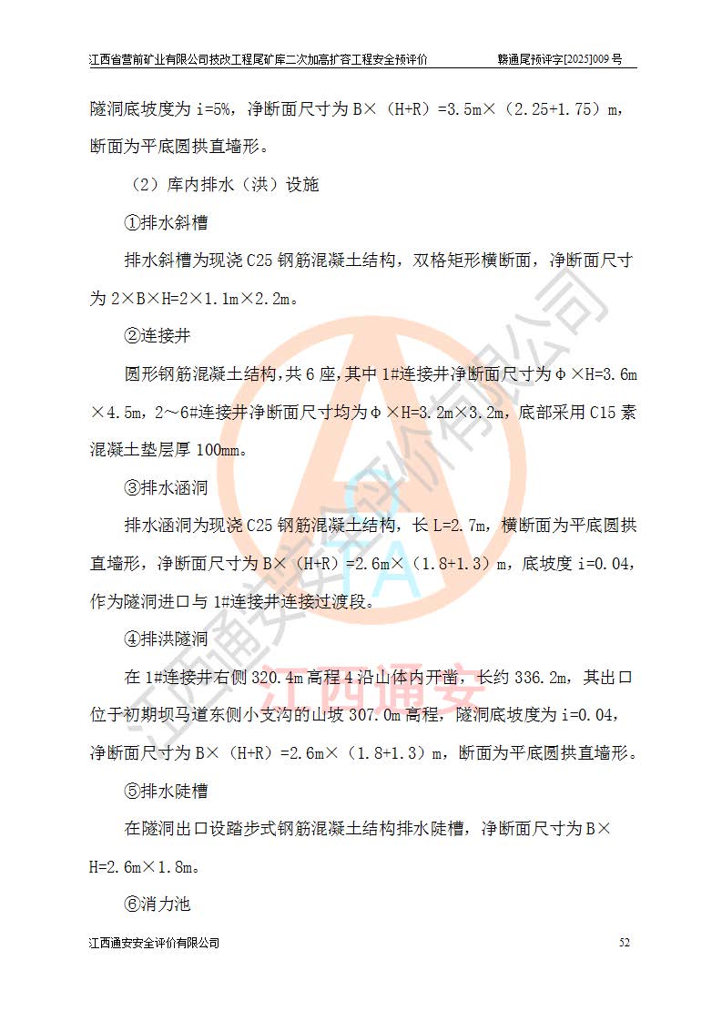 江西省營前礦業(yè)有限公司于2003年12月16日成立,位于贛州市上猶縣營前鎮(zhèn)焦里村境內(nèi),公司注冊資本10000萬元,法定**人陳雅博,礦區(qū)地理坐標(biāo):東經(jīng)114°18′30″~114°19′00″,北緯25°52′35″~25°53′47″。公司經(jīng)營范圍包括:鉛礦、鋅、鎢、銀地下開采、銷售。 江西省營前礦業(yè)有限公司技改工程尾礦庫位于焦里鎢銀鉛鋅礦區(qū),處于上猶縣水巖鄉(xiāng)井子村坑尾自然村境內(nèi),為山谷型尾礦庫。 江西省營前礦業(yè)有限公司技改工程尾礦庫于2013年由福建省冶金工業(yè)設(shè)計院設(shè)計,2014年8月開始施工建設(shè),2015年4月竣工開始試運(yùn)行,2015年11月完成竣工驗收,2016年1月首次取得安全生產(chǎn)許可證,2019年1月完成延期換證,2020年8月委托金建工程設(shè)計有限公司進(jìn)行尾礦庫加高擴(kuò)容工作,2020年10月21日取得了江西省應(yīng)急管理廳下發(fā)的《關(guān)于江西省營前礦業(yè)有限公司技改工程尾礦庫加高擴(kuò)容工程安全設(shè)施設(shè)計的審查意見》(贛應(yīng)急非煤項目設(shè)審〔2020〕46號),之后委托駐馬店市黃淮建設(shè)工程有限公司負(fù)責(zé)施工,云南潤滇工程技術(shù)有限公司負(fù)責(zé)監(jiān)理,2021年12月完成加高擴(kuò)容竣工驗收工作,經(jīng)過延期,現(xiàn)尾礦庫安全生產(chǎn)許可證編號(贛)FM安許證字[2016]M1692號,**期為2025年01月18日至2028年01月17日。 江西省營前礦業(yè)有限公司技改工程尾礦庫為山谷型尾礦庫,初期壩為透水堆石壩,壩頂高程為330.0m,初期壩高25.0m,后期采用上游式尾礦堆積壩,加高擴(kuò)容后*終壩頂高程為380.0m,堆積壩高50.0m,總壩高為75.0m,總庫容為為503.14×104m3,尾礦庫為三等庫。尾礦庫初期壩以上總匯水面積3.53km2,防洪標(biāo)準(zhǔn)取500年一遇。 目前尾礦庫由初期壩、堆積壩、庫內(nèi)排洪系統(tǒng)(雙格排水斜槽+連接井+排水涵洞+排洪隧洞+排水陡槽+消力池)、1#攔洪壩、1#分洪隧洞、2#攔洪壩、2#分洪隧洞和安全監(jiān)測設(shè)施組成。根據(jù)建設(shè)單位提供的尾礦庫平面布置圖,截至2024年12月,現(xiàn)狀尾礦庫堆積壩頂高程為372.2m,現(xiàn)狀總壩高67.2m,灘頂高程為369.8m,現(xiàn)狀全庫容387.51×104m3,現(xiàn)狀尾礦庫為三等庫,原加高擴(kuò)容設(shè)計*終堆積壩頂高程為380.0m,現(xiàn)剩余庫容115.63×104m3,剩余**庫容約92.5×104m3,剩余服務(wù)年限約4.5年;礦山現(xiàn)有儲量較大,剩余庫容及服務(wù)年限不滿足礦山后期生產(chǎn)需要。 技改工程尾礦庫尾礦壩下游1**范圍無居民,不存在工礦企業(yè)等建構(gòu)筑物,不屬于“頭頂庫”;尾礦庫不壓礦;距贛江直線距離60**;不涉及保護(hù)區(qū)及生態(tài)紅線;尾礦庫所在溝谷較長,谷底平均縱坡9%,上游周邊山體地形有利于尾礦庫二次加高擴(kuò)容工程的實(shí)施,因此為了增加尾礦庫庫容,延長服務(wù)年限,充分利用尾礦庫所在溝谷地形,江西省營前礦業(yè)有限公司對技改尾礦庫進(jìn)行二次加高擴(kuò)容。 2024年12月,江西省營前礦業(yè)有限公司委托地礦贛西地質(zhì)工程勘察院編制了《江西省營前礦業(yè)有限公司技改工程尾礦庫二次擴(kuò)容工程(水文)地質(zhì)勘察報告》,2025年4月,江西省營前礦業(yè)有限公司委托金建工程設(shè)計有限公司編制了《江西省營前礦業(yè)有限公司技改工程尾礦庫二次加高擴(kuò)容工程可行性研究報告》。 按照非煤礦山建設(shè)項目安全設(shè)施“三同時”的規(guī)定要求,技改工程尾礦庫為二次加高擴(kuò)容工程,**進(jìn)行安全預(yù)評價;江西省營前礦業(yè)有限公司委托我公司承擔(dān)技改工程尾礦庫二次加高擴(kuò)容工程建設(shè)項目的安全預(yù)評價工作。 |