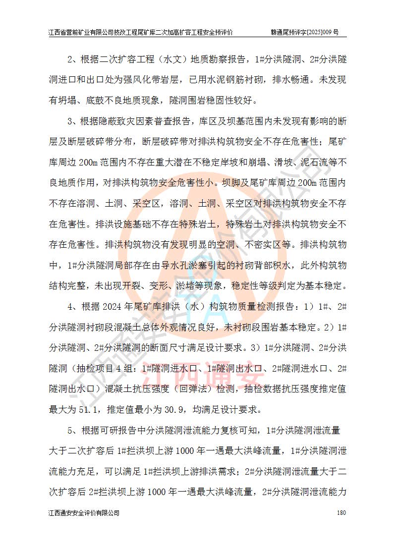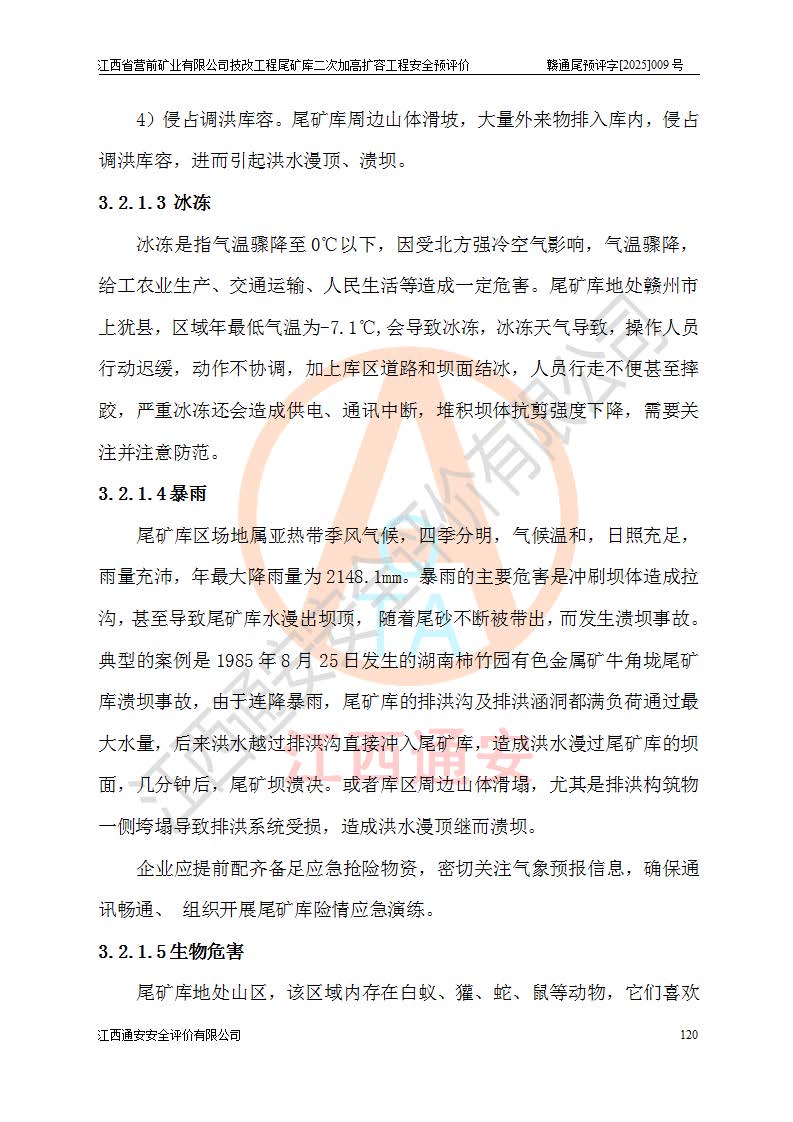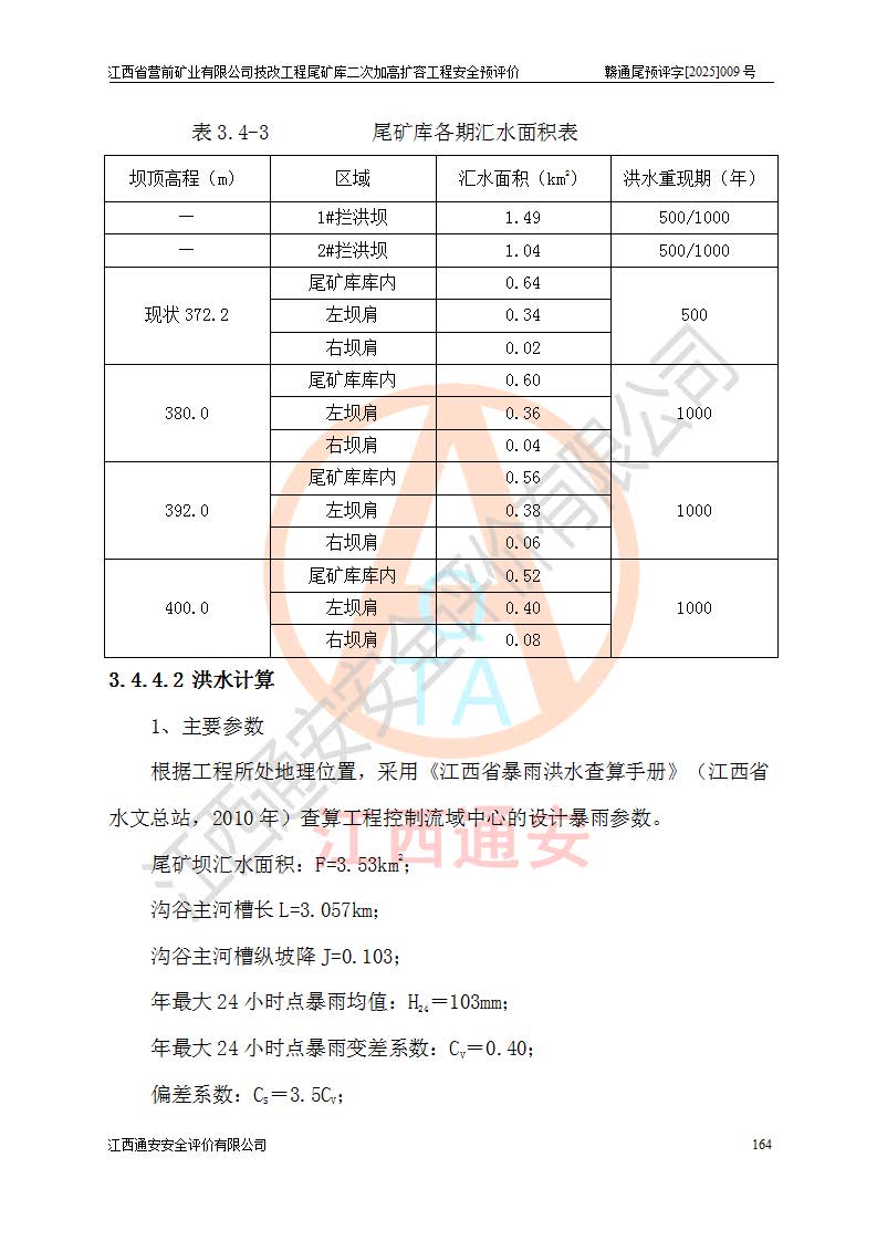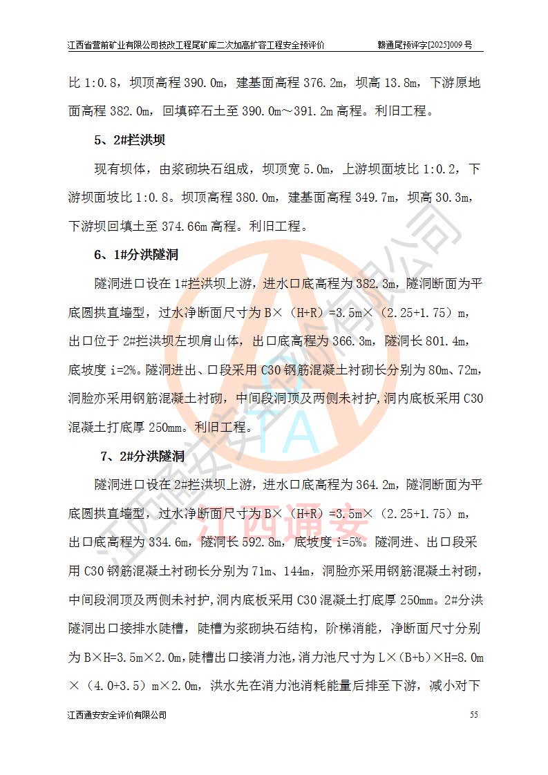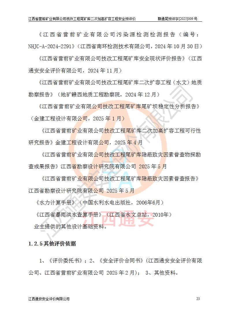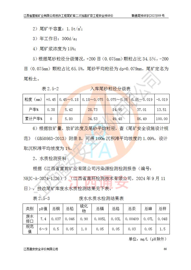江西省營前礦業(yè)有限公司于2003年12月16日成立,位于贛州市上猶縣營前鎮(zhèn)焦里村境內(nèi),公司注冊資本10000萬元,法定**人陳雅博,礦區(qū)地理坐標(biāo):東經(jīng)114°18′30″~114°19′00″,北緯25°52′35″~25°53′47″。公司經(jīng)營范圍包括:鉛礦、鋅、鎢、銀地下開采、銷售。 江西省營前礦業(yè)有限公司技改工程尾礦庫位于焦里鎢銀鉛鋅礦區(qū),處于上猶縣水巖鄉(xiāng)井子村坑尾自然村境內(nèi),為山谷型尾礦庫。 江西省營前礦業(yè)有限公司技改工程尾礦庫于2013年由福建省冶金工業(yè)設(shè)計院設(shè)計,2014年8月開始施工建設(shè),2015年4月竣工開始試運(yùn)行,2015年11月完成竣工驗收,2016年1月首次取得安全生產(chǎn)許可證,2019年1月完成延期換證,2020年8月委托金建工程設(shè)計有限公司進(jìn)行尾礦庫加高擴(kuò)容工作,2020年10月21日取得了江西省應(yīng)急管理廳下發(fā)的《關(guān)于江西省營前礦業(yè)有限公司技改工程尾礦庫加高擴(kuò)容工程安全設(shè)施設(shè)計的審查意見》(贛應(yīng)急非煤項目設(shè)審〔2020〕46號),之后委托駐馬店市黃淮建設(shè)工程有限公司負(fù)責(zé)施工,云南潤滇工程技術(shù)有限公司負(fù)責(zé)監(jiān)理,2021年12月完成加高擴(kuò)容竣工驗收工作,經(jīng)過延期,現(xiàn)尾礦庫安全生產(chǎn)許可證編號(贛)FM安許證字[2016]M1692號,**期為2025年01月18日至2028年01月17日。 江西省營前礦業(yè)有限公司技改工程尾礦庫為山谷型尾礦庫,初期壩為透水堆石壩,壩頂高程為330.0m,初期壩高25.0m,后期采用上游式尾礦堆積壩,加高擴(kuò)容后*終壩頂高程為380.0m,堆積壩高50.0m,總壩高為75.0m,總庫容為為503.14×104m3,尾礦庫為三等庫。尾礦庫初期壩以上總匯水面積3.53km2,防洪標(biāo)準(zhǔn)取500年一遇。 目前尾礦庫由初期壩、堆積壩、庫內(nèi)排洪系統(tǒng)(雙格排水斜槽+連接井+排水涵洞+排洪隧洞+排水陡槽+消力池)、1#攔洪壩、1#分洪隧洞、2#攔洪壩、2#分洪隧洞和安全監(jiān)測設(shè)施組成。根據(jù)建設(shè)單位提供的尾礦庫平面布置圖,截至2024年12月,現(xiàn)狀尾礦庫堆積壩頂高程為372.2m,現(xiàn)狀總壩高67.2m,灘頂高程為369.8m,現(xiàn)狀全庫容387.51×104m3,現(xiàn)狀尾礦庫為三等庫,原加高擴(kuò)容設(shè)計*終堆積壩頂高程為380.0m,現(xiàn)剩余庫容115.63×104m3,剩余**庫容約92.5×104m3,剩余服務(wù)年限約4.5年;礦山現(xiàn)有儲量較大,剩余庫容及服務(wù)年限不滿足礦山后期生產(chǎn)需要。 技改工程尾礦庫尾礦壩下游1**范圍無居民,不存在工礦企業(yè)等建構(gòu)筑物,不屬于“頭頂庫”;尾礦庫不壓礦;距贛江直線距離60**;不涉及保護(hù)區(qū)及生態(tài)紅線;尾礦庫所在溝谷較長,谷底平均縱坡9%,上游周邊山體地形有利于尾礦庫二次加高擴(kuò)容工程的實(shí)施,因此為了增加尾礦庫庫容,延長服務(wù)年限,充分利用尾礦庫所在溝谷地形,江西省營前礦業(yè)有限公司對技改尾礦庫進(jìn)行二次加高擴(kuò)容。 2024年12月,江西省營前礦業(yè)有限公司委托地礦贛西地質(zhì)工程勘察院編制了《江西省營前礦業(yè)有限公司技改工程尾礦庫二次擴(kuò)容工程(水文)地質(zhì)勘察報告》,2025年4月,江西省營前礦業(yè)有限公司委托金建工程設(shè)計有限公司編制了《江西省營前礦業(yè)有限公司技改工程尾礦庫二次加高擴(kuò)容工程可行性研究報告》。 按照非煤礦山建設(shè)項目安全設(shè)施“三同時”的規(guī)定要求,技改工程尾礦庫為二次加高擴(kuò)容工程,**進(jìn)行安全預(yù)評價;江西省營前礦業(yè)有限公司委托我公司承擔(dān)技改工程尾礦庫二次加高擴(kuò)容工程建設(shè)項目的安全預(yù)評價工作。 |