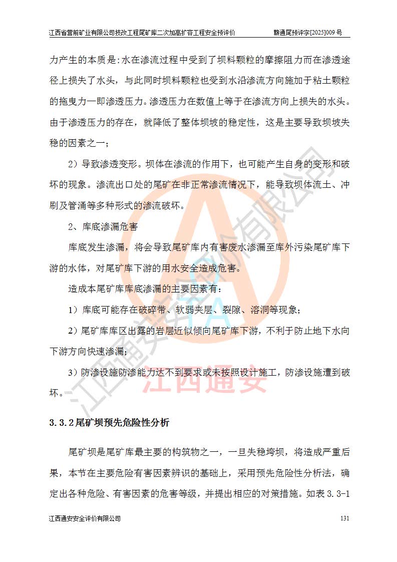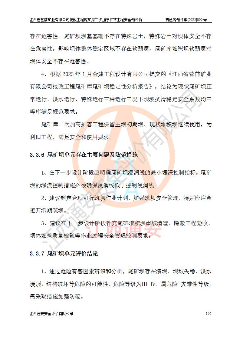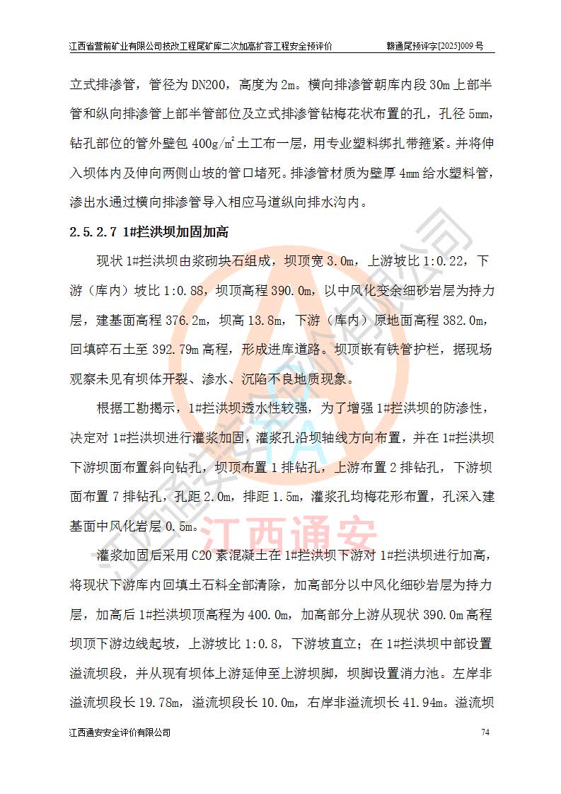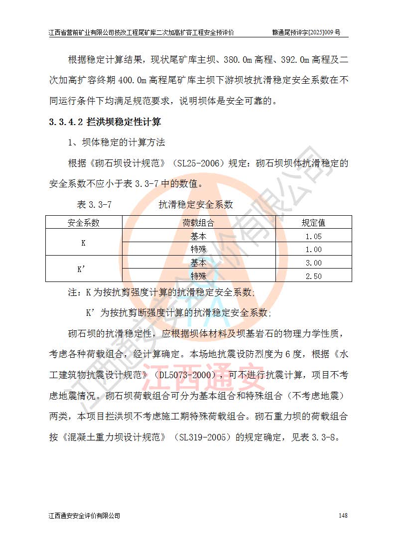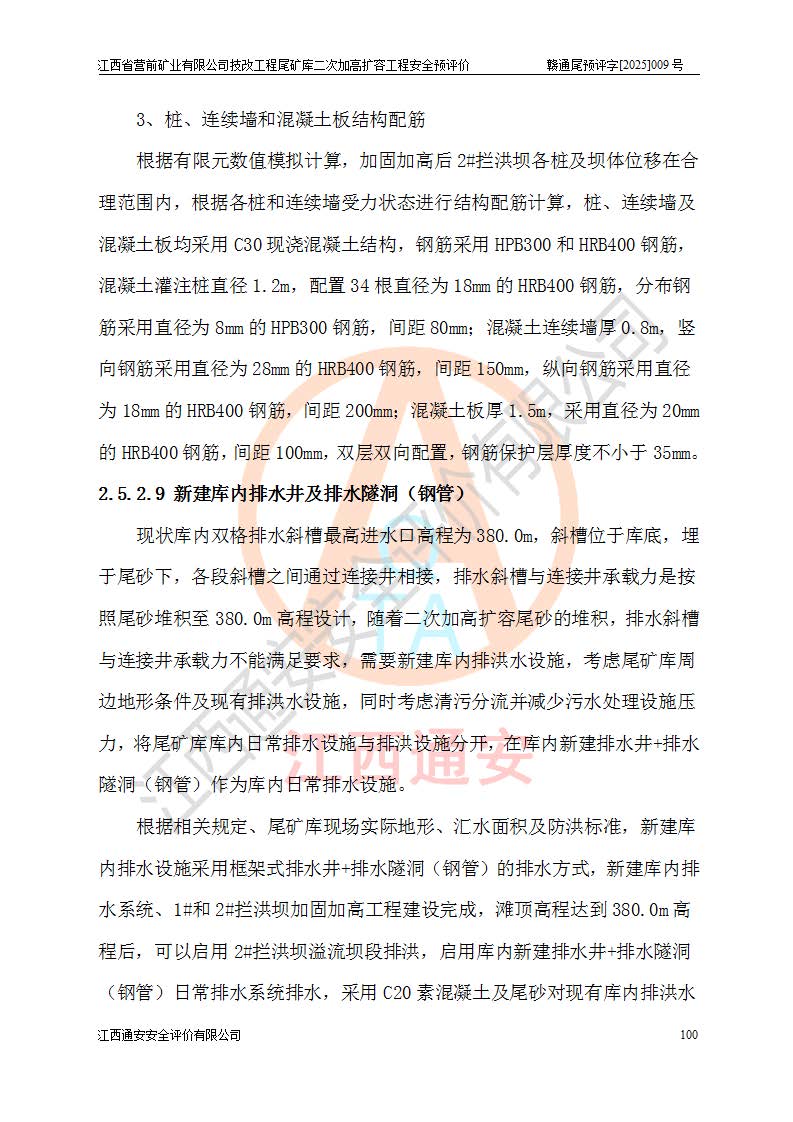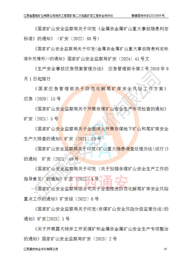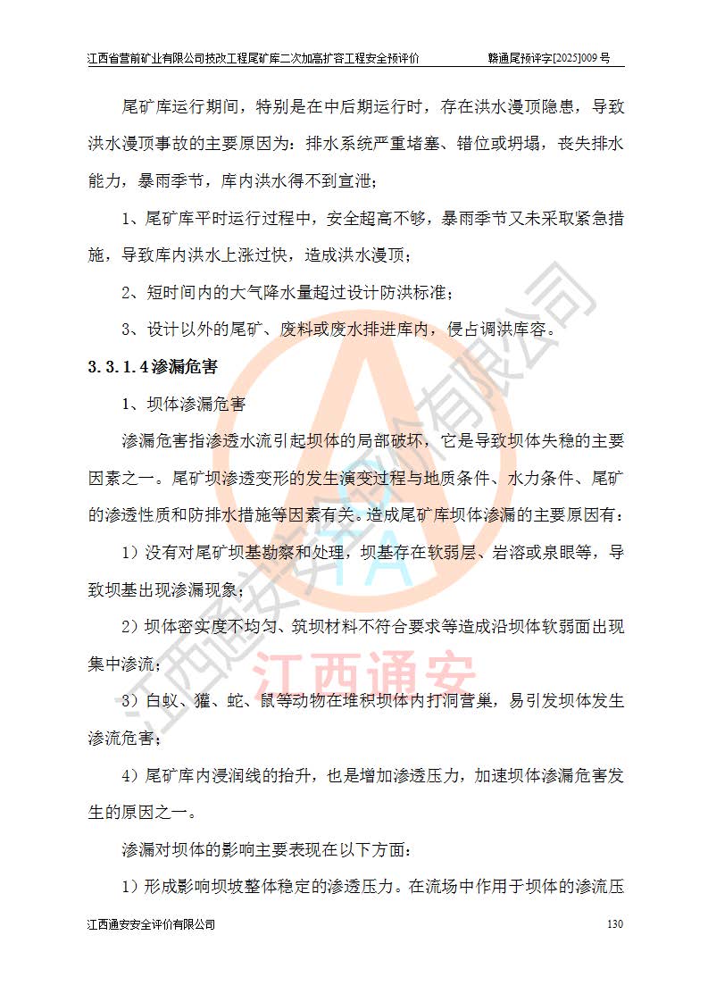 江西省營前礦業(yè)有限公司于2003年12月16日成立,位于贛州市上猶縣營前鎮(zhèn)焦里村境內(nèi),公司注冊資本10000萬元,法定**人陳雅博,礦區(qū)地理坐標(biāo):東經(jīng)114°18′30″~114°19′00″,北緯25°52′35″~25°53′47″。公司經(jīng)營范圍包括:鉛礦、鋅、鎢、銀地下開采、銷售。 江西省營前礦業(yè)有限公司技改工程尾礦庫位于焦里鎢銀鉛鋅礦區(qū),處于上猶縣水巖鄉(xiāng)井子村坑尾自然村境內(nèi),為山谷型尾礦庫。 江西省營前礦業(yè)有限公司技改工程尾礦庫于2013年由福建省冶金工業(yè)設(shè)計院設(shè)計,2014年8月開始施工建設(shè),2015年4月竣工開始試運(yùn)行,2015年11月完成竣工驗收,2016年1月首次取得安全生產(chǎn)許可證,2019年1月完成延期換證,2020年8月委托金建工程設(shè)計有限公司進(jìn)行尾礦庫加高擴(kuò)容工作,2020年10月21日取得了江西省應(yīng)急管理廳下發(fā)的《關(guān)于江西省營前礦業(yè)有限公司技改工程尾礦庫加高擴(kuò)容工程安全設(shè)施設(shè)計的審查意見》(贛應(yīng)急非煤項目設(shè)審〔2020〕46號),之后委托駐馬店市黃淮建設(shè)工程有限公司負(fù)責(zé)施工,云南潤滇工程技術(shù)有限公司負(fù)責(zé)監(jiān)理,2021年12月完成加高擴(kuò)容竣工驗收工作,經(jīng)過延期,現(xiàn)尾礦庫安全生產(chǎn)許可證編號(贛)FM安許證字[2016]M1692號,**期為2025年01月18日至2028年01月17日。 江西省營前礦業(yè)有限公司技改工程尾礦庫為山谷型尾礦庫,初期壩為透水堆石壩,壩頂高程為330.0m,初期壩高25.0m,后期采用上游式尾礦堆積壩,加高擴(kuò)容后*終壩頂高程為380.0m,堆積壩高50.0m,總壩高為75.0m,總庫容為為503.14×104m3,尾礦庫為三等庫。尾礦庫初期壩以上總匯水面積3.53km2,防洪標(biāo)準(zhǔn)取500年一遇。 目前尾礦庫由初期壩、堆積壩、庫內(nèi)排洪系統(tǒng)(雙格排水斜槽+連接井+排水涵洞+排洪隧洞+排水陡槽+消力池)、1#攔洪壩、1#分洪隧洞、2#攔洪壩、2#分洪隧洞和安全監(jiān)測設(shè)施組成。根據(jù)建設(shè)單位提供的尾礦庫平面布置圖,截至2024年12月,現(xiàn)狀尾礦庫堆積壩頂高程為372.2m,現(xiàn)狀總壩高67.2m,灘頂高程為369.8m,現(xiàn)狀全庫容387.51×104m3,現(xiàn)狀尾礦庫為三等庫,原加高擴(kuò)容設(shè)計*終堆積壩頂高程為380.0m,現(xiàn)剩余庫容115.63×104m3,剩余**庫容約92.5×104m3,剩余服務(wù)年限約4.5年;礦山現(xiàn)有儲量較大,剩余庫容及服務(wù)年限不滿足礦山后期生產(chǎn)需要。 技改工程尾礦庫尾礦壩下游1**范圍無居民,不存在工礦企業(yè)等建構(gòu)筑物,不屬于“頭頂庫”;尾礦庫不壓礦;距贛江直線距離60**;不涉及保護(hù)區(qū)及生態(tài)紅線;尾礦庫所在溝谷較長,谷底平均縱坡9%,上游周邊山體地形有利于尾礦庫二次加高擴(kuò)容工程的實(shí)施,因此為了增加尾礦庫庫容,延長服務(wù)年限,充分利用尾礦庫所在溝谷地形,江西省營前礦業(yè)有限公司對技改尾礦庫進(jìn)行二次加高擴(kuò)容。 2024年12月,江西省營前礦業(yè)有限公司委托地礦贛西地質(zhì)工程勘察院編制了《江西省營前礦業(yè)有限公司技改工程尾礦庫二次擴(kuò)容工程(水文)地質(zhì)勘察報告》,2025年4月,江西省營前礦業(yè)有限公司委托金建工程設(shè)計有限公司編制了《江西省營前礦業(yè)有限公司技改工程尾礦庫二次加高擴(kuò)容工程可行性研究報告》。 按照非煤礦山建設(shè)項目安全設(shè)施“三同時”的規(guī)定要求,技改工程尾礦庫為二次加高擴(kuò)容工程,**進(jìn)行安全預(yù)評價;江西省營前礦業(yè)有限公司委托我公司承擔(dān)技改工程尾礦庫二次加高擴(kuò)容工程建設(shè)項目的安全預(yù)評價工作。 |