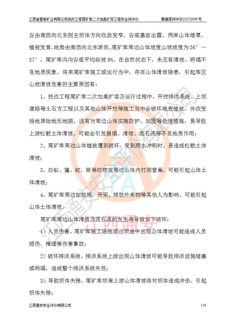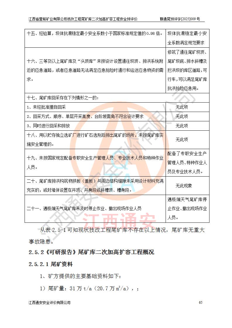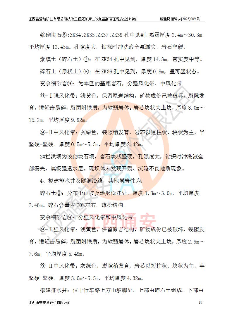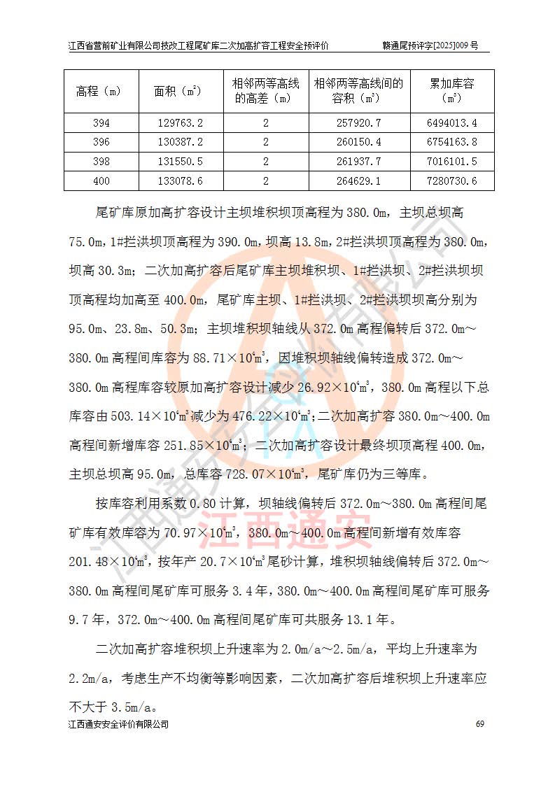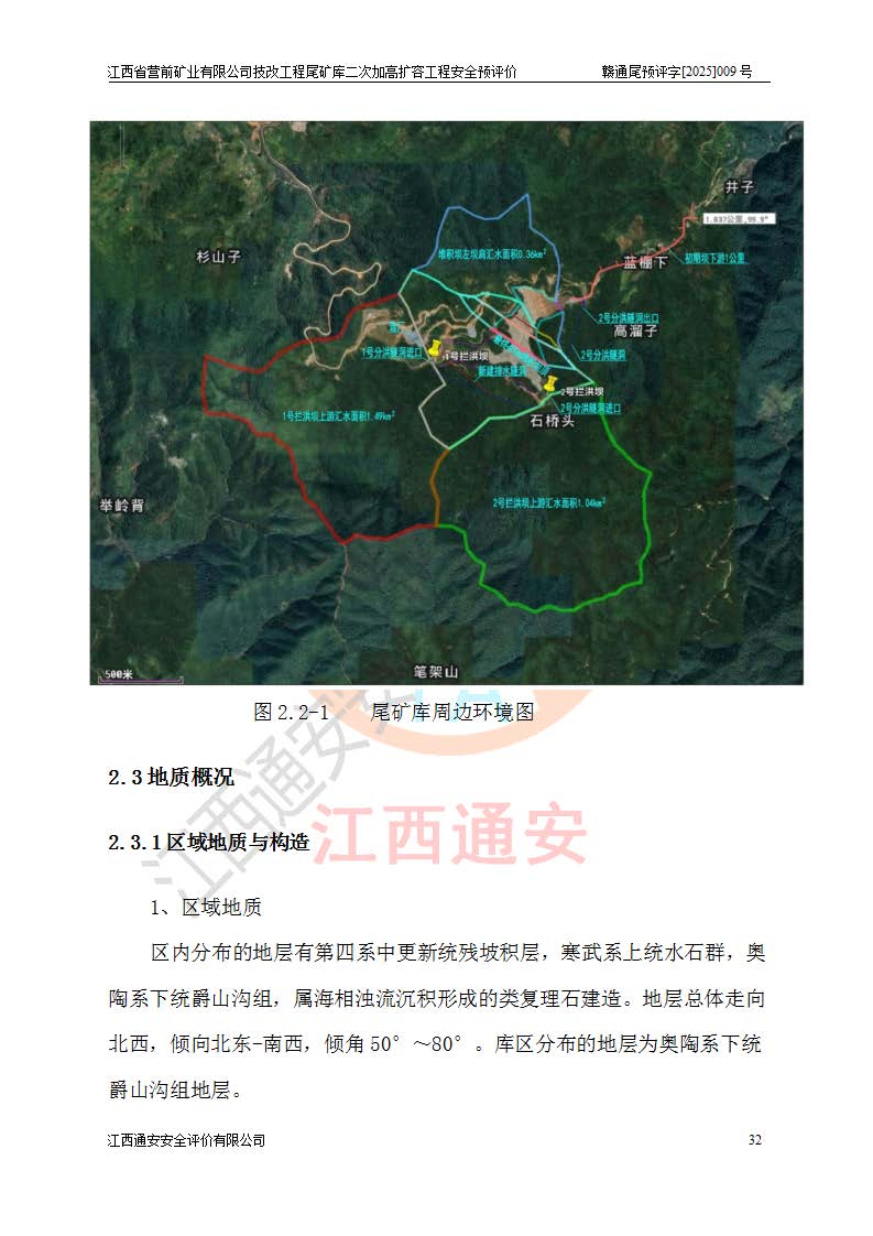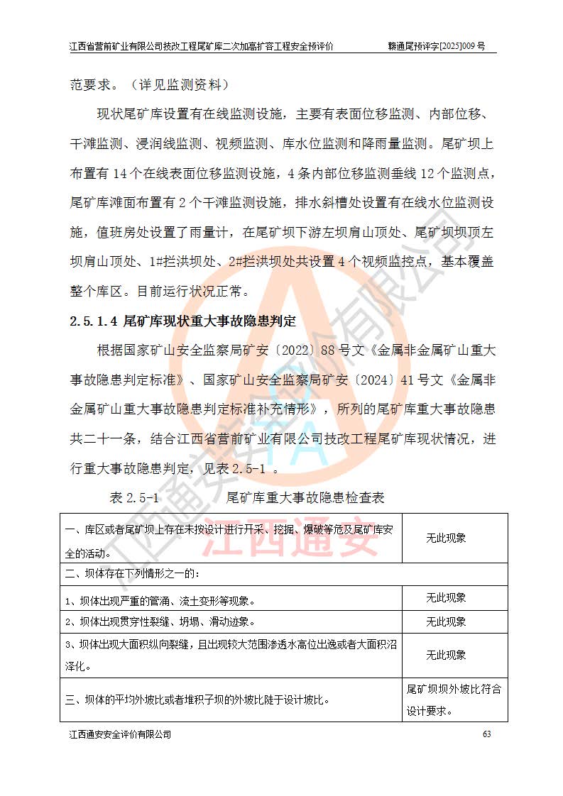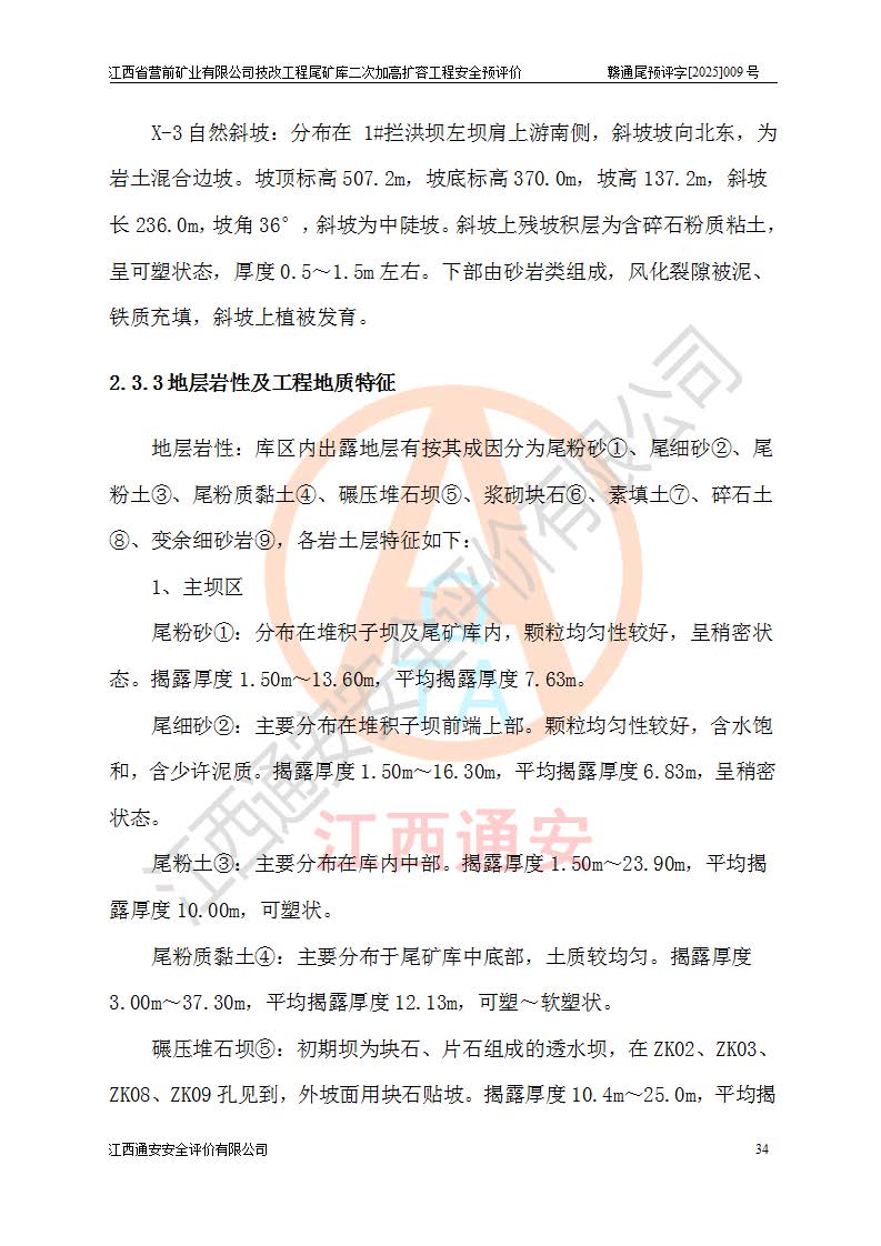江西省營前礦業(yè)有限公司于2003年12月16日成立,位于贛州市上猶縣營前鎮(zhèn)焦里村境內(nèi),公司注冊資本10000萬元,法定**人陳雅博,礦區(qū)地理坐標(biāo):東經(jīng)114°18′30″~114°19′00″,北緯25°52′35″~25°53′47″。公司經(jīng)營范圍包括:鉛礦、鋅、鎢、銀地下開采、銷售。 江西省營前礦業(yè)有限公司技改工程尾礦庫位于焦里鎢銀鉛鋅礦區(qū),處于上猶縣水巖鄉(xiāng)井子村坑尾自然村境內(nèi),為山谷型尾礦庫。 江西省營前礦業(yè)有限公司技改工程尾礦庫于2013年由福建省冶金工業(yè)設(shè)計院設(shè)計,2014年8月開始施工建設(shè),2015年4月竣工開始試運(yùn)行,2015年11月完成竣工驗收,2016年1月首次取得安全生產(chǎn)許可證,2019年1月完成延期換證,2020年8月委托金建工程設(shè)計有限公司進(jìn)行尾礦庫加高擴(kuò)容工作,2020年10月21日取得了江西省應(yīng)急管理廳下發(fā)的《關(guān)于江西省營前礦業(yè)有限公司技改工程尾礦庫加高擴(kuò)容工程安全設(shè)施設(shè)計的審查意見》(贛應(yīng)急非煤項目設(shè)審〔2020〕46號),之后委托駐馬店市黃淮建設(shè)工程有限公司負(fù)責(zé)施工,云南潤滇工程技術(shù)有限公司負(fù)責(zé)監(jiān)理,2021年12月完成加高擴(kuò)容竣工驗收工作,經(jīng)過延期,現(xiàn)尾礦庫安全生產(chǎn)許可證編號(贛)FM安許證字[2016]M1692號,**期為2025年01月18日至2028年01月17日。 江西省營前礦業(yè)有限公司技改工程尾礦庫為山谷型尾礦庫,初期壩為透水堆石壩,壩頂高程為330.0m,初期壩高25.0m,后期采用上游式尾礦堆積壩,加高擴(kuò)容后*終壩頂高程為380.0m,堆積壩高50.0m,總壩高為75.0m,總庫容為為503.14×104m3,尾礦庫為三等庫。尾礦庫初期壩以上總匯水面積3.53km2,防洪標(biāo)準(zhǔn)取500年一遇。 目前尾礦庫由初期壩、堆積壩、庫內(nèi)排洪系統(tǒng)(雙格排水斜槽+連接井+排水涵洞+排洪隧洞+排水陡槽+消力池)、1#攔洪壩、1#分洪隧洞、2#攔洪壩、2#分洪隧洞和安全監(jiān)測設(shè)施組成。根據(jù)建設(shè)單位提供的尾礦庫平面布置圖,截至2024年12月,現(xiàn)狀尾礦庫堆積壩頂高程為372.2m,現(xiàn)狀總壩高67.2m,灘頂高程為369.8m,現(xiàn)狀全庫容387.51×104m3,現(xiàn)狀尾礦庫為三等庫,原加高擴(kuò)容設(shè)計*終堆積壩頂高程為380.0m,現(xiàn)剩余庫容115.63×104m3,剩余**庫容約92.5×104m3,剩余服務(wù)年限約4.5年;礦山現(xiàn)有儲量較大,剩余庫容及服務(wù)年限不滿足礦山后期生產(chǎn)需要。 技改工程尾礦庫尾礦壩下游1**范圍無居民,不存在工礦企業(yè)等建構(gòu)筑物,不屬于“頭頂庫”;尾礦庫不壓礦;距贛江直線距離60**;不涉及保護(hù)區(qū)及生態(tài)紅線;尾礦庫所在溝谷較長,谷底平均縱坡9%,上游周邊山體地形有利于尾礦庫二次加高擴(kuò)容工程的實(shí)施,因此為了增加尾礦庫庫容,延長服務(wù)年限,充分利用尾礦庫所在溝谷地形,江西省營前礦業(yè)有限公司對技改尾礦庫進(jìn)行二次加高擴(kuò)容。 2024年12月,江西省營前礦業(yè)有限公司委托地礦贛西地質(zhì)工程勘察院編制了《江西省營前礦業(yè)有限公司技改工程尾礦庫二次擴(kuò)容工程(水文)地質(zhì)勘察報告》,2025年4月,江西省營前礦業(yè)有限公司委托金建工程設(shè)計有限公司編制了《江西省營前礦業(yè)有限公司技改工程尾礦庫二次加高擴(kuò)容工程可行性研究報告》。 按照非煤礦山建設(shè)項目安全設(shè)施“三同時”的規(guī)定要求,技改工程尾礦庫為二次加高擴(kuò)容工程,**進(jìn)行安全預(yù)評價;江西省營前礦業(yè)有限公司委托我公司承擔(dān)技改工程尾礦庫二次加高擴(kuò)容工程建設(shè)項目的安全預(yù)評價工作。 |