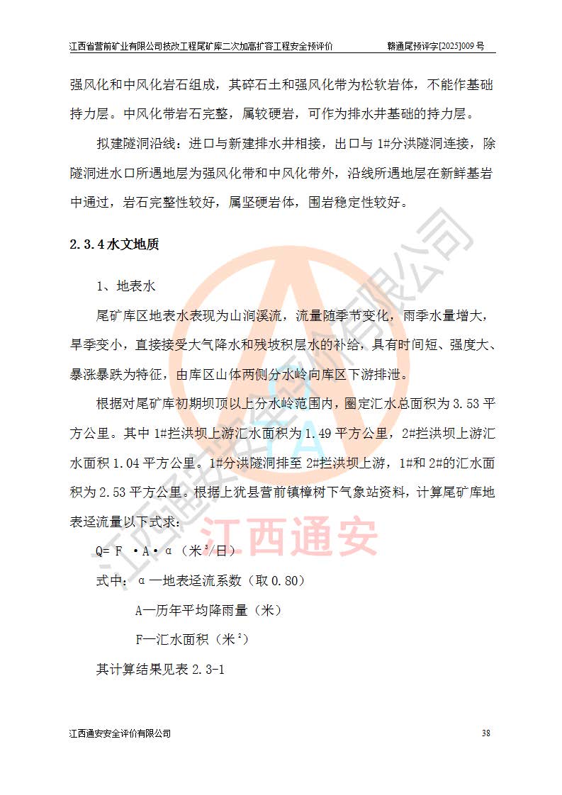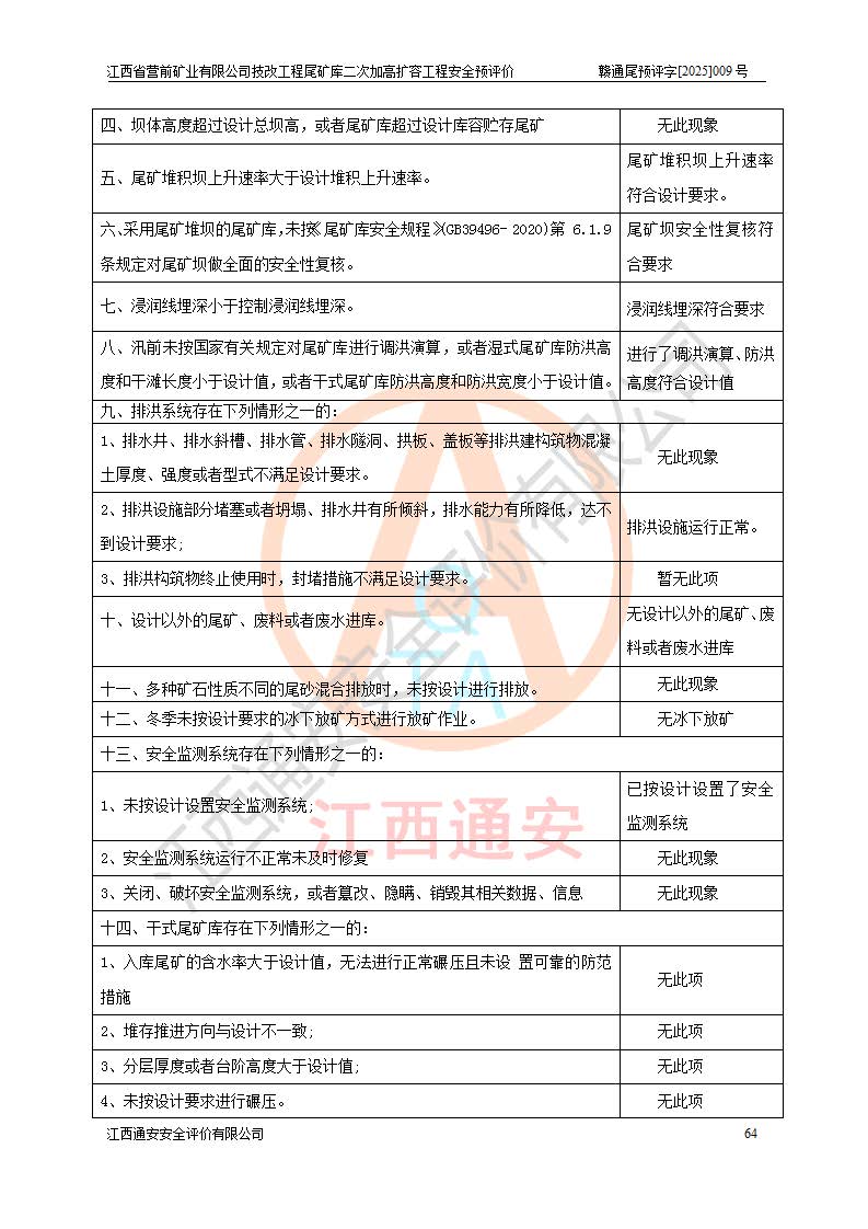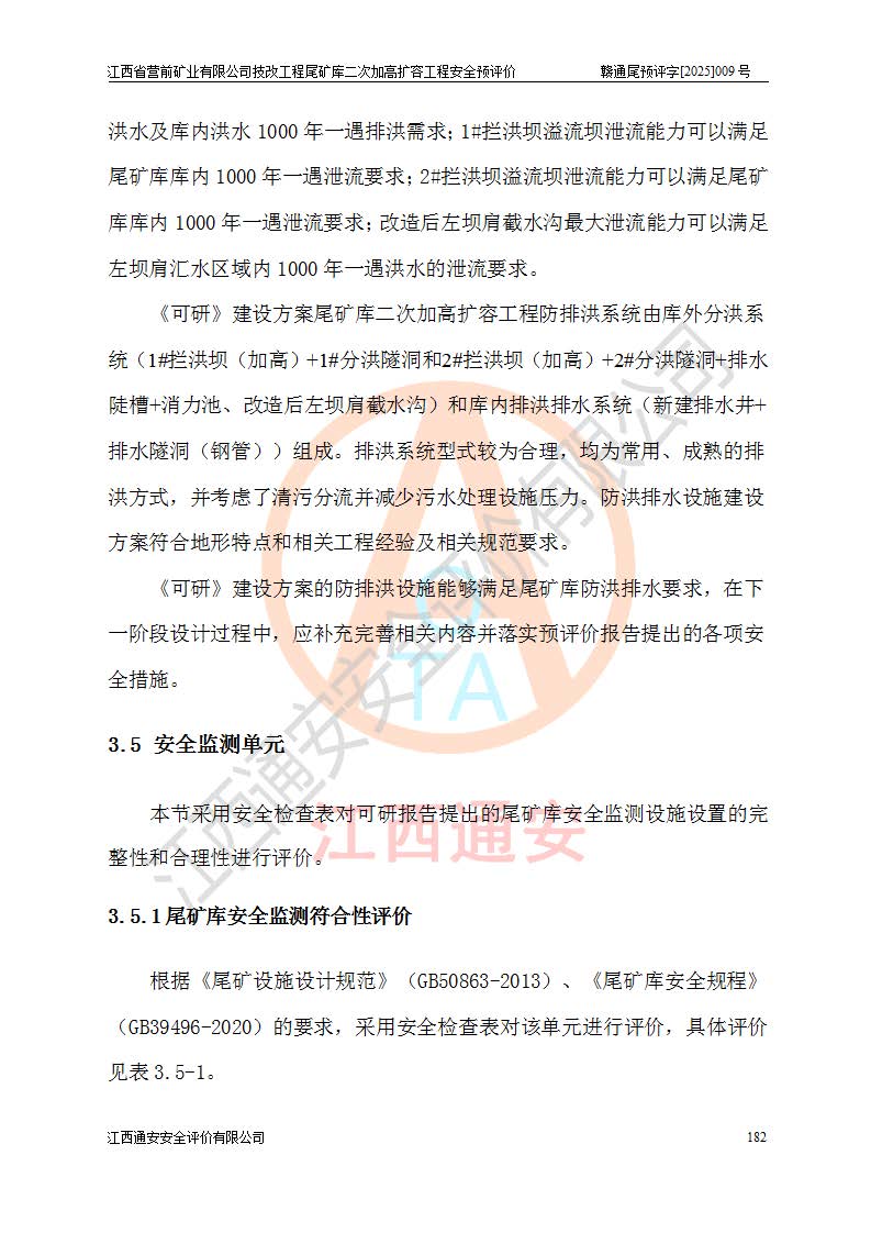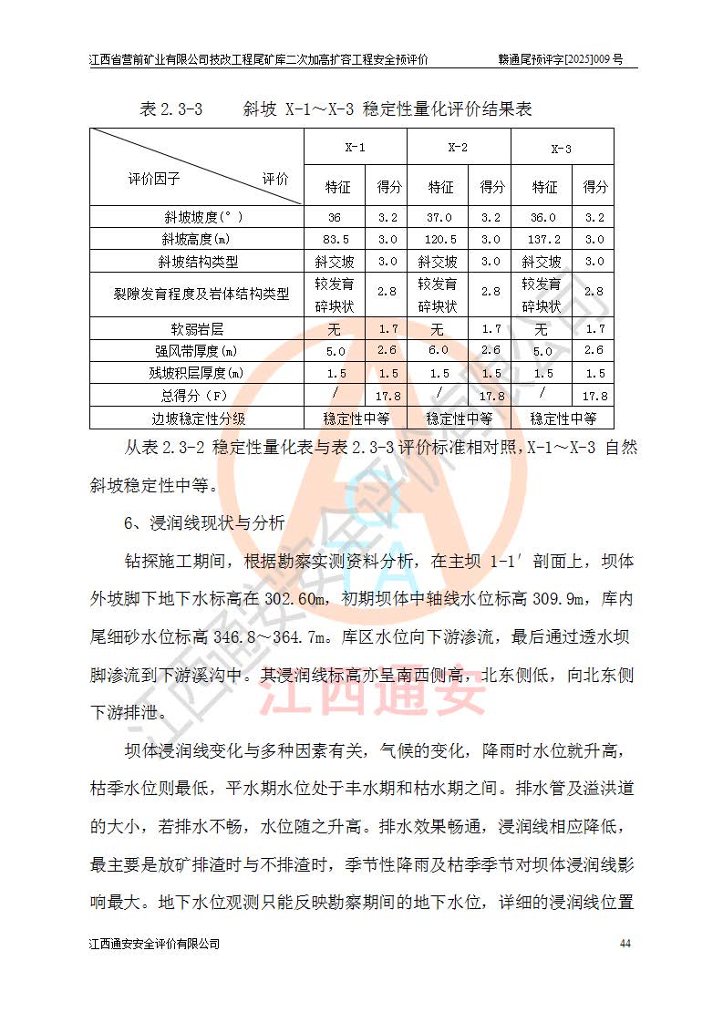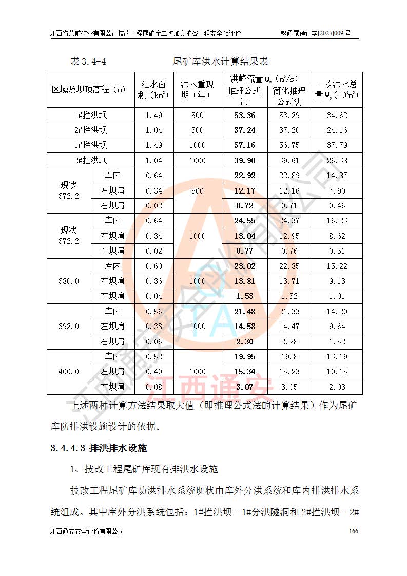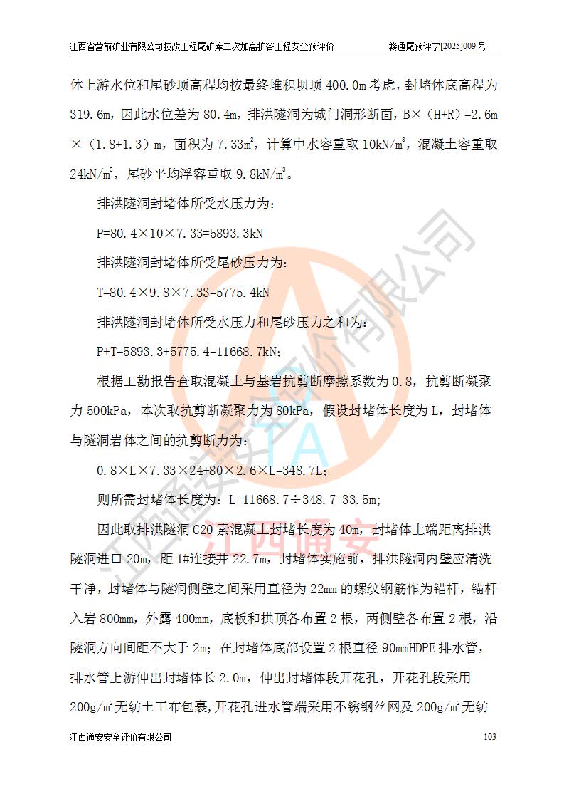 江西省營前礦業(yè)有限公司于2003年12月16日成立,位于贛州市上猶縣營前鎮(zhèn)焦里村境內(nèi),公司注冊資本10000萬元,法定**人陳雅博,礦區(qū)地理坐標(biāo):東經(jīng)114°18′30″~114°19′00″,北緯25°52′35″~25°53′47″。公司經(jīng)營范圍包括:鉛礦、鋅、鎢、銀地下開采、銷售。 江西省營前礦業(yè)有限公司技改工程尾礦庫位于焦里鎢銀鉛鋅礦區(qū),處于上猶縣水巖鄉(xiāng)井子村坑尾自然村境內(nèi),為山谷型尾礦庫。 江西省營前礦業(yè)有限公司技改工程尾礦庫于2013年由福建省冶金工業(yè)設(shè)計院設(shè)計,2014年8月開始施工建設(shè),2015年4月竣工開始試運(yùn)行,2015年11月完成竣工驗收,2016年1月首次取得安全生產(chǎn)許可證,2019年1月完成延期換證,2020年8月委托金建工程設(shè)計有限公司進(jìn)行尾礦庫加高擴(kuò)容工作,2020年10月21日取得了江西省應(yīng)急管理廳下發(fā)的《關(guān)于江西省營前礦業(yè)有限公司技改工程尾礦庫加高擴(kuò)容工程安全設(shè)施設(shè)計的審查意見》(贛應(yīng)急非煤項目設(shè)審〔2020〕46號),之后委托駐馬店市黃淮建設(shè)工程有限公司負(fù)責(zé)施工,云南潤滇工程技術(shù)有限公司負(fù)責(zé)監(jiān)理,2021年12月完成加高擴(kuò)容竣工驗收工作,經(jīng)過延期,現(xiàn)尾礦庫安全生產(chǎn)許可證編號(贛)FM安許證字[2016]M1692號,**期為2025年01月18日至2028年01月17日。 江西省營前礦業(yè)有限公司技改工程尾礦庫為山谷型尾礦庫,初期壩為透水堆石壩,壩頂高程為330.0m,初期壩高25.0m,后期采用上游式尾礦堆積壩,加高擴(kuò)容后*終壩頂高程為380.0m,堆積壩高50.0m,總壩高為75.0m,總庫容為為503.14×104m3,尾礦庫為三等庫。尾礦庫初期壩以上總匯水面積3.53km2,防洪標(biāo)準(zhǔn)取500年一遇。 目前尾礦庫由初期壩、堆積壩、庫內(nèi)排洪系統(tǒng)(雙格排水斜槽+連接井+排水涵洞+排洪隧洞+排水陡槽+消力池)、1#攔洪壩、1#分洪隧洞、2#攔洪壩、2#分洪隧洞和安全監(jiān)測設(shè)施組成。根據(jù)建設(shè)單位提供的尾礦庫平面布置圖,截至2024年12月,現(xiàn)狀尾礦庫堆積壩頂高程為372.2m,現(xiàn)狀總壩高67.2m,灘頂高程為369.8m,現(xiàn)狀全庫容387.51×104m3,現(xiàn)狀尾礦庫為三等庫,原加高擴(kuò)容設(shè)計*終堆積壩頂高程為380.0m,現(xiàn)剩余庫容115.63×104m3,剩余**庫容約92.5×104m3,剩余服務(wù)年限約4.5年;礦山現(xiàn)有儲量較大,剩余庫容及服務(wù)年限不滿足礦山后期生產(chǎn)需要。 技改工程尾礦庫尾礦壩下游1**范圍無居民,不存在工礦企業(yè)等建構(gòu)筑物,不屬于“頭頂庫”;尾礦庫不壓礦;距贛江直線距離60**;不涉及保護(hù)區(qū)及生態(tài)紅線;尾礦庫所在溝谷較長,谷底平均縱坡9%,上游周邊山體地形有利于尾礦庫二次加高擴(kuò)容工程的實(shí)施,因此為了增加尾礦庫庫容,延長服務(wù)年限,充分利用尾礦庫所在溝谷地形,江西省營前礦業(yè)有限公司對技改尾礦庫進(jìn)行二次加高擴(kuò)容。 2024年12月,江西省營前礦業(yè)有限公司委托地礦贛西地質(zhì)工程勘察院編制了《江西省營前礦業(yè)有限公司技改工程尾礦庫二次擴(kuò)容工程(水文)地質(zhì)勘察報告》,2025年4月,江西省營前礦業(yè)有限公司委托金建工程設(shè)計有限公司編制了《江西省營前礦業(yè)有限公司技改工程尾礦庫二次加高擴(kuò)容工程可行性研究報告》。 按照非煤礦山建設(shè)項目安全設(shè)施“三同時”的規(guī)定要求,技改工程尾礦庫為二次加高擴(kuò)容工程,**進(jìn)行安全預(yù)評價;江西省營前礦業(yè)有限公司委托我公司承擔(dān)技改工程尾礦庫二次加高擴(kuò)容工程建設(shè)項目的安全預(yù)評價工作。 |