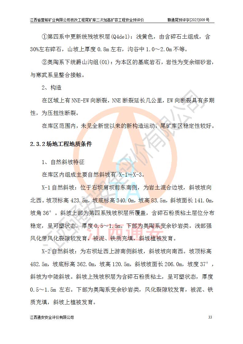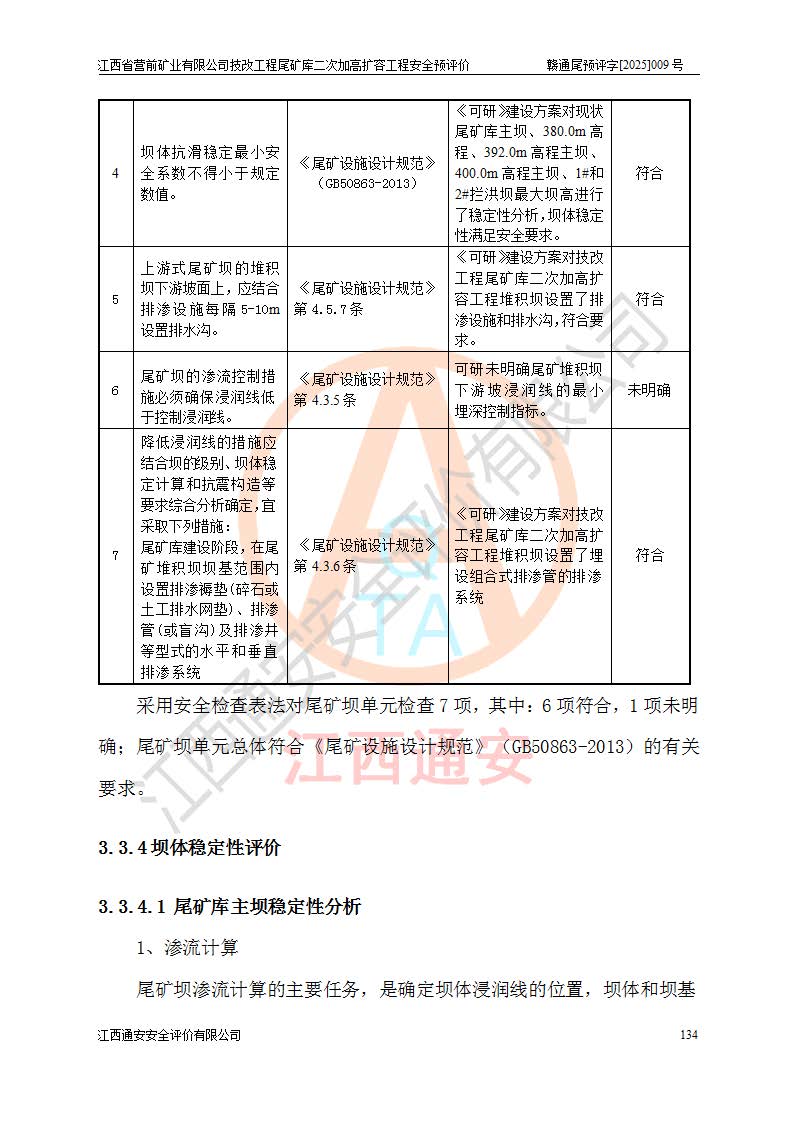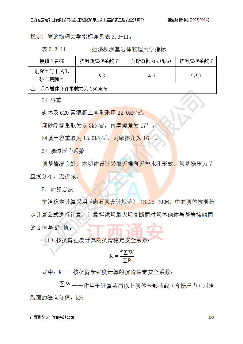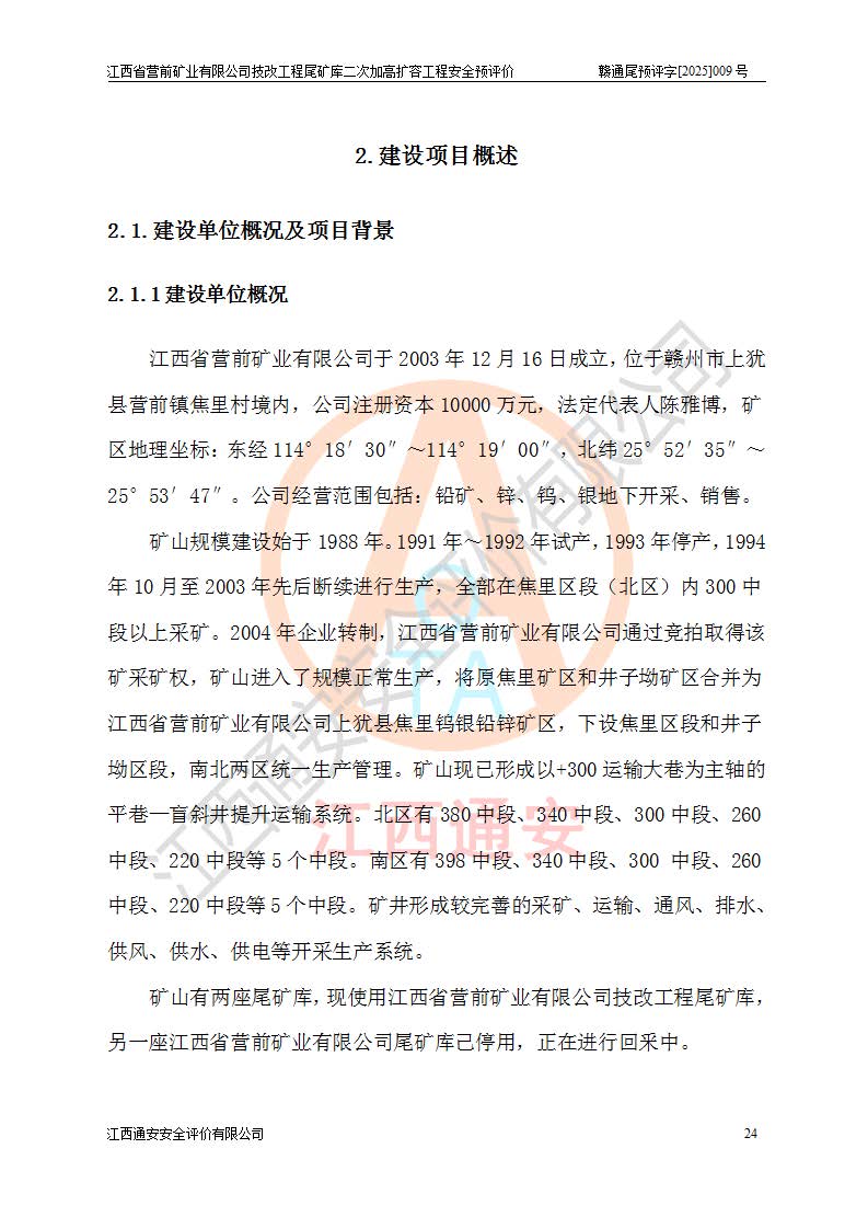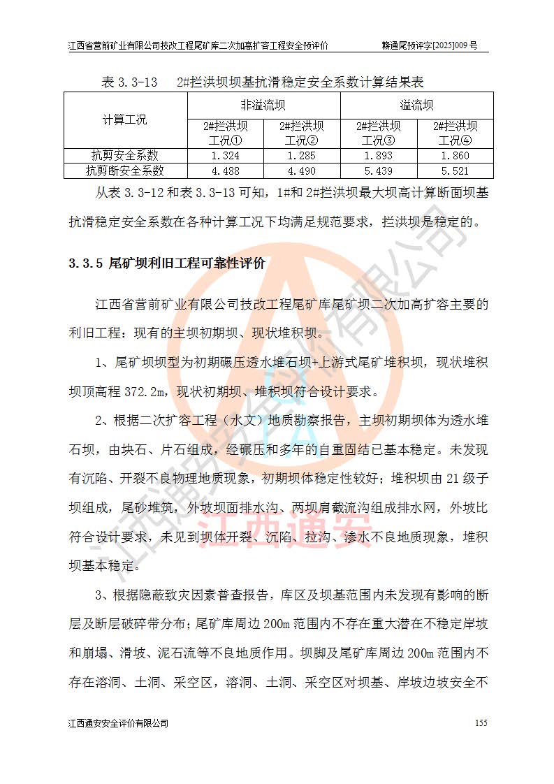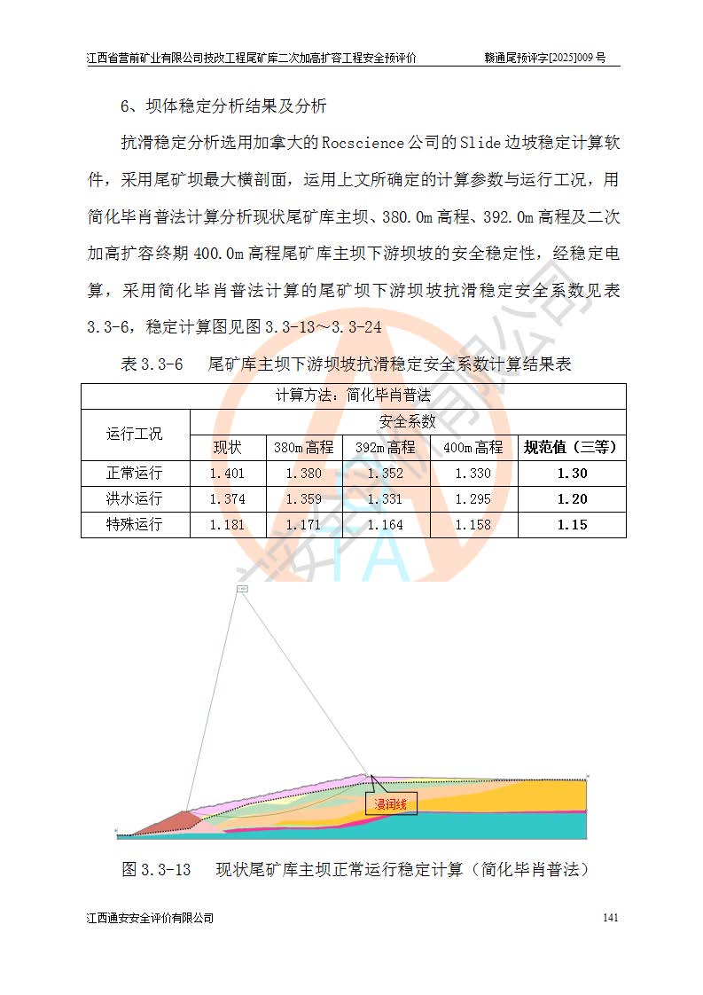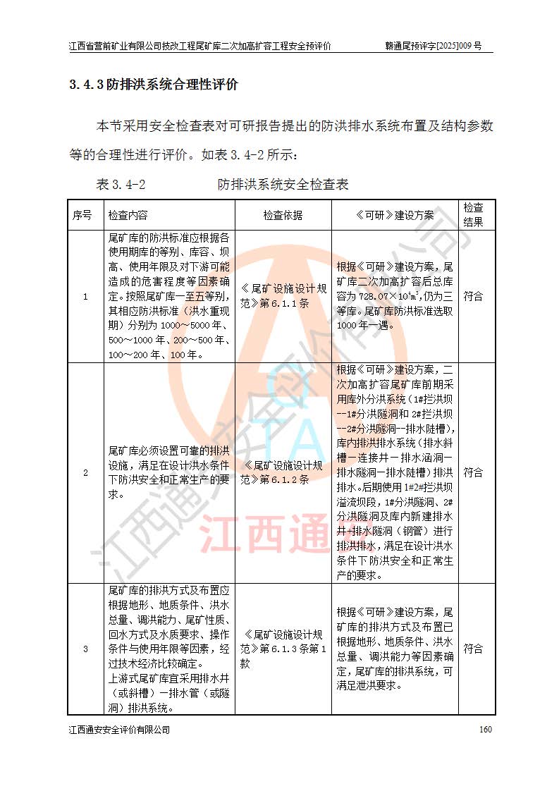 江西省營前礦業(yè)有限公司于2003年12月16日成立,位于贛州市上猶縣營前鎮(zhèn)焦里村境內(nèi),公司注冊資本10000萬元,法定**人陳雅博,礦區(qū)地理坐標(biāo):東經(jīng)114°18′30″~114°19′00″,北緯25°52′35″~25°53′47″。公司經(jīng)營范圍包括:鉛礦、鋅、鎢、銀地下開采、銷售。 江西省營前礦業(yè)有限公司技改工程尾礦庫位于焦里鎢銀鉛鋅礦區(qū),處于上猶縣水巖鄉(xiāng)井子村坑尾自然村境內(nèi),為山谷型尾礦庫。 江西省營前礦業(yè)有限公司技改工程尾礦庫于2013年由福建省冶金工業(yè)設(shè)計院設(shè)計,2014年8月開始施工建設(shè),2015年4月竣工開始試運(yùn)行,2015年11月完成竣工驗收,2016年1月首次取得安全生產(chǎn)許可證,2019年1月完成延期換證,2020年8月委托金建工程設(shè)計有限公司進(jìn)行尾礦庫加高擴(kuò)容工作,2020年10月21日取得了江西省應(yīng)急管理廳下發(fā)的《關(guān)于江西省營前礦業(yè)有限公司技改工程尾礦庫加高擴(kuò)容工程安全設(shè)施設(shè)計的審查意見》(贛應(yīng)急非煤項目設(shè)審〔2020〕46號),之后委托駐馬店市黃淮建設(shè)工程有限公司負(fù)責(zé)施工,云南潤滇工程技術(shù)有限公司負(fù)責(zé)監(jiān)理,2021年12月完成加高擴(kuò)容竣工驗收工作,經(jīng)過延期,現(xiàn)尾礦庫安全生產(chǎn)許可證編號(贛)FM安許證字[2016]M1692號,**期為2025年01月18日至2028年01月17日。 江西省營前礦業(yè)有限公司技改工程尾礦庫為山谷型尾礦庫,初期壩為透水堆石壩,壩頂高程為330.0m,初期壩高25.0m,后期采用上游式尾礦堆積壩,加高擴(kuò)容后*終壩頂高程為380.0m,堆積壩高50.0m,總壩高為75.0m,總庫容為為503.14×104m3,尾礦庫為三等庫。尾礦庫初期壩以上總匯水面積3.53km2,防洪標(biāo)準(zhǔn)取500年一遇。 目前尾礦庫由初期壩、堆積壩、庫內(nèi)排洪系統(tǒng)(雙格排水斜槽+連接井+排水涵洞+排洪隧洞+排水陡槽+消力池)、1#攔洪壩、1#分洪隧洞、2#攔洪壩、2#分洪隧洞和安全監(jiān)測設(shè)施組成。根據(jù)建設(shè)單位提供的尾礦庫平面布置圖,截至2024年12月,現(xiàn)狀尾礦庫堆積壩頂高程為372.2m,現(xiàn)狀總壩高67.2m,灘頂高程為369.8m,現(xiàn)狀全庫容387.51×104m3,現(xiàn)狀尾礦庫為三等庫,原加高擴(kuò)容設(shè)計*終堆積壩頂高程為380.0m,現(xiàn)剩余庫容115.63×104m3,剩余**庫容約92.5×104m3,剩余服務(wù)年限約4.5年;礦山現(xiàn)有儲量較大,剩余庫容及服務(wù)年限不滿足礦山后期生產(chǎn)需要。 技改工程尾礦庫尾礦壩下游1**范圍無居民,不存在工礦企業(yè)等建構(gòu)筑物,不屬于“頭頂庫”;尾礦庫不壓礦;距贛江直線距離60**;不涉及保護(hù)區(qū)及生態(tài)紅線;尾礦庫所在溝谷較長,谷底平均縱坡9%,上游周邊山體地形有利于尾礦庫二次加高擴(kuò)容工程的實(shí)施,因此為了增加尾礦庫庫容,延長服務(wù)年限,充分利用尾礦庫所在溝谷地形,江西省營前礦業(yè)有限公司對技改尾礦庫進(jìn)行二次加高擴(kuò)容。 2024年12月,江西省營前礦業(yè)有限公司委托地礦贛西地質(zhì)工程勘察院編制了《江西省營前礦業(yè)有限公司技改工程尾礦庫二次擴(kuò)容工程(水文)地質(zhì)勘察報告》,2025年4月,江西省營前礦業(yè)有限公司委托金建工程設(shè)計有限公司編制了《江西省營前礦業(yè)有限公司技改工程尾礦庫二次加高擴(kuò)容工程可行性研究報告》。 按照非煤礦山建設(shè)項目安全設(shè)施“三同時”的規(guī)定要求,技改工程尾礦庫為二次加高擴(kuò)容工程,**進(jìn)行安全預(yù)評價;江西省營前礦業(yè)有限公司委托我公司承擔(dān)技改工程尾礦庫二次加高擴(kuò)容工程建設(shè)項目的安全預(yù)評價工作。 |