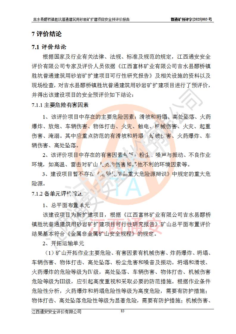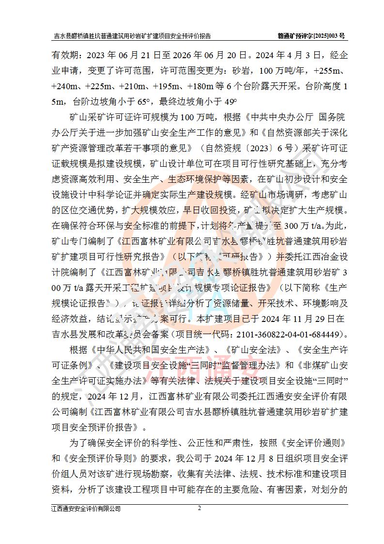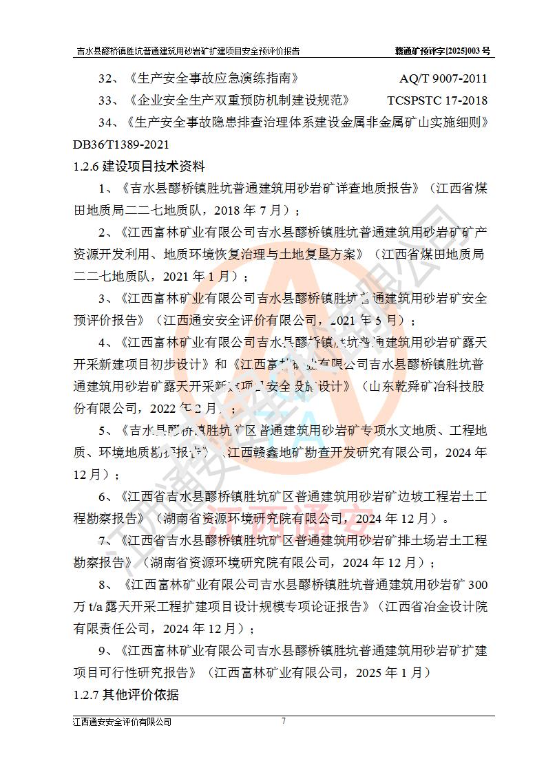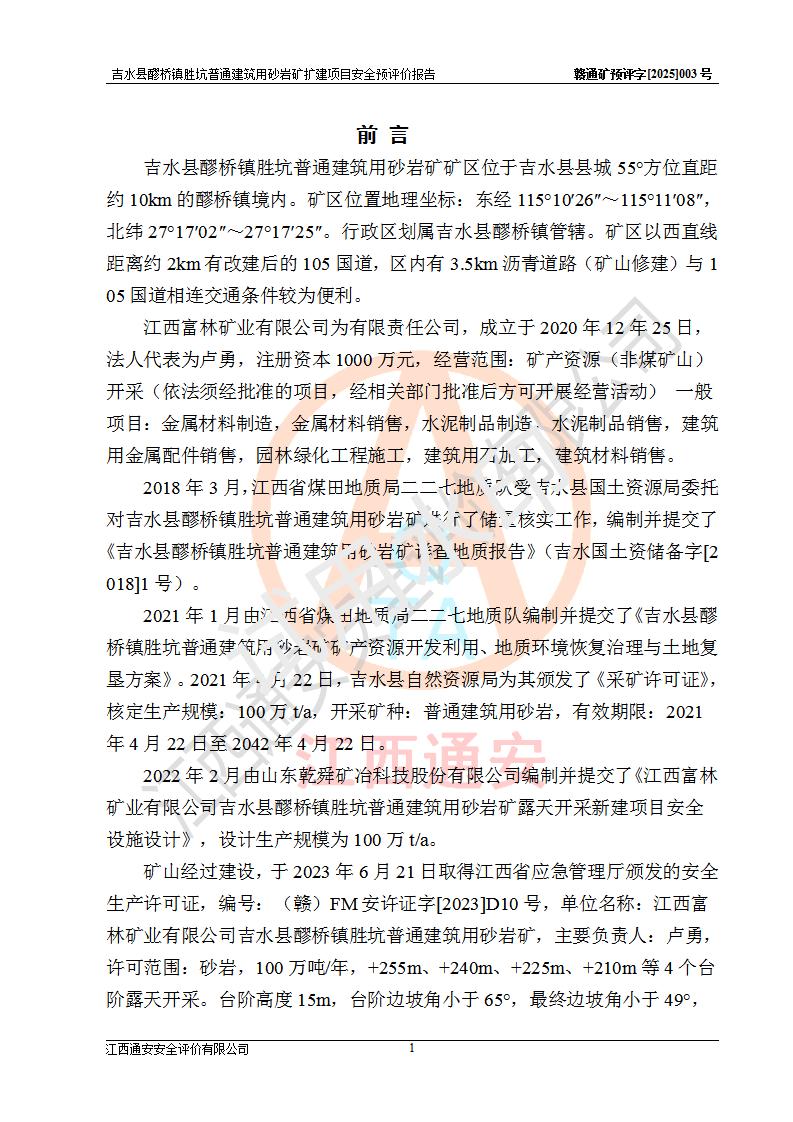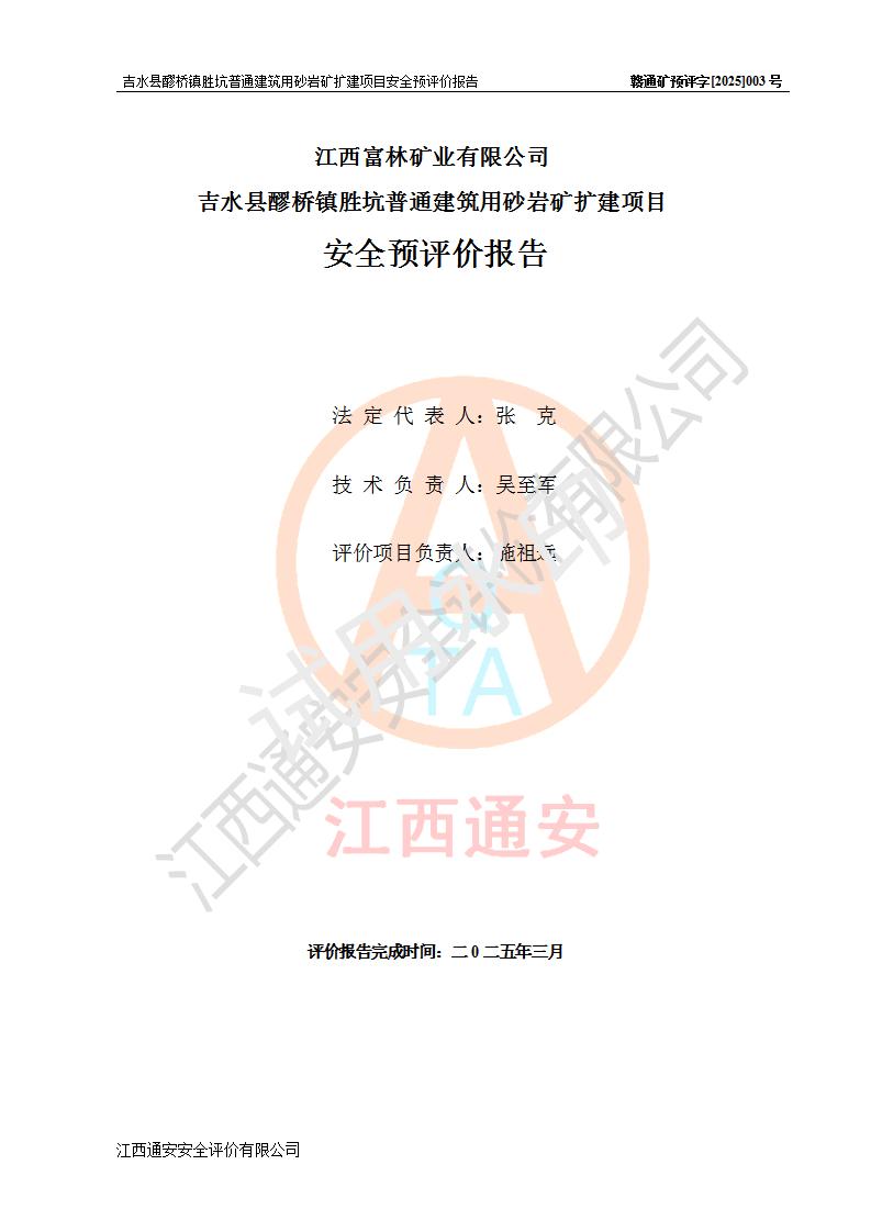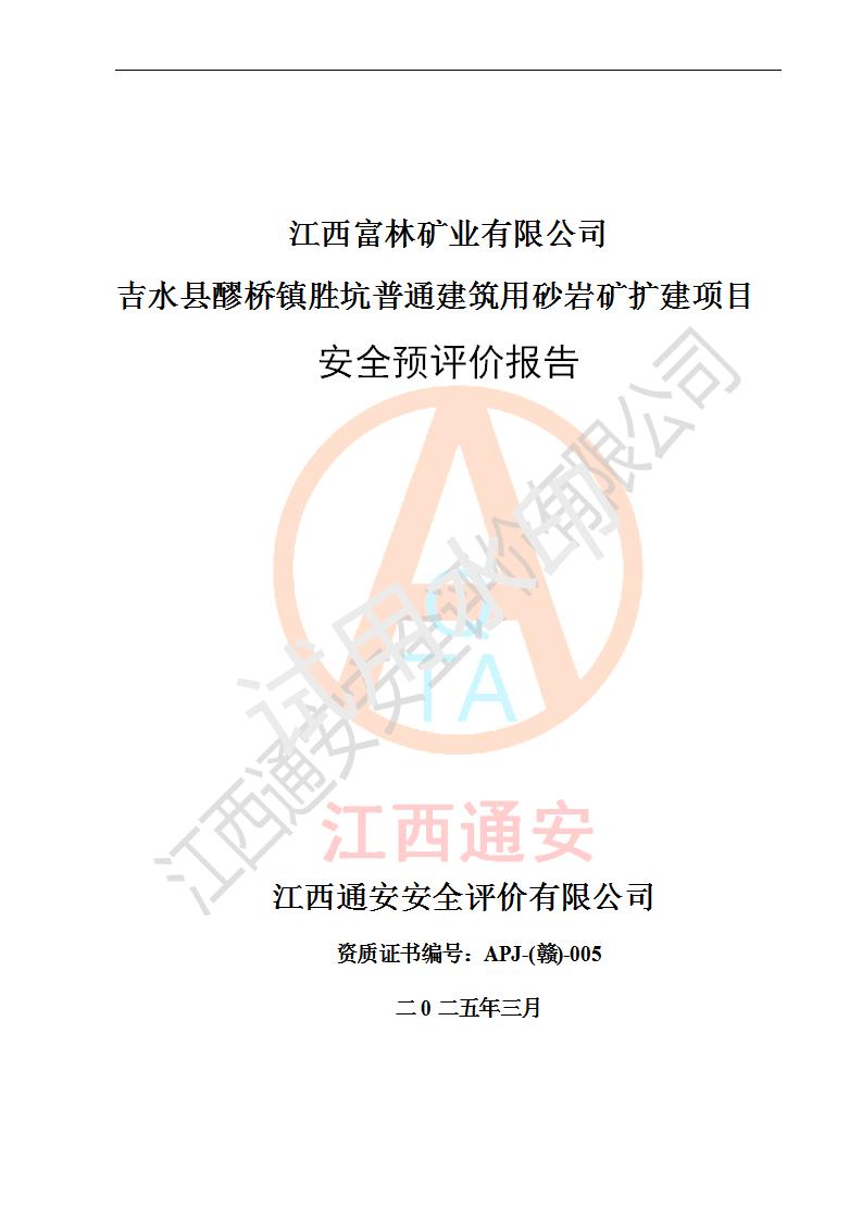 項目名稱 | 江西富林礦業(yè)有限公司吉水縣醪橋鎮(zhèn)勝坑普通建筑用砂巖礦擴建項目安全預(yù)評價報告 | ||||