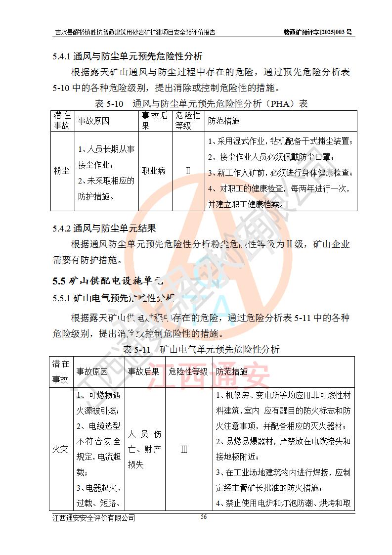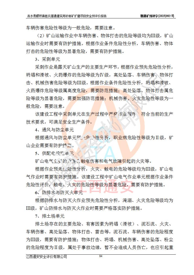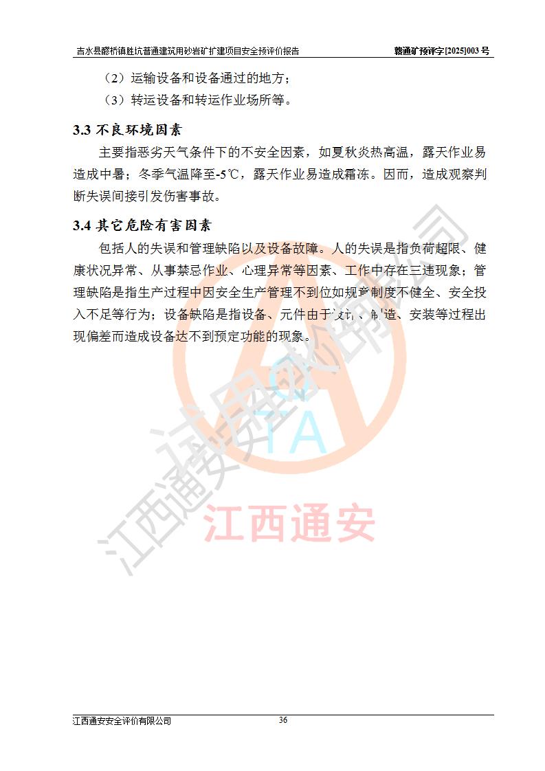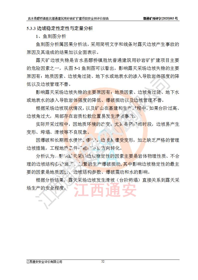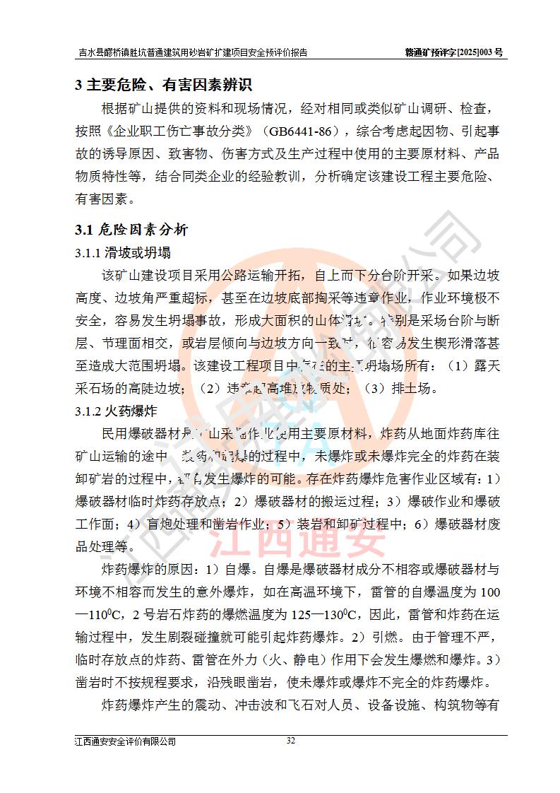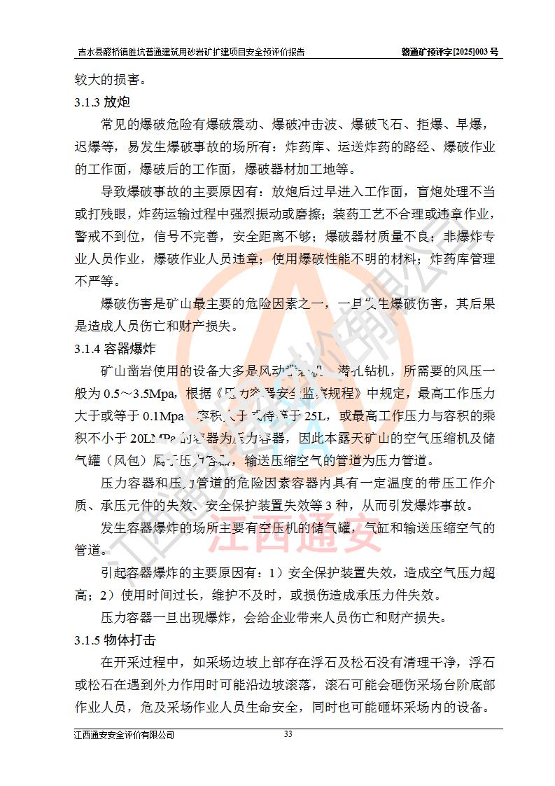 其它 | 吉水縣醪橋鎮(zhèn)勝坑普通建筑用砂巖礦露天開采擴建項目存在的主要危險因素有:滑坡和坍塌、火藥爆炸、放炮、**傷害、高處墜落、物體打擊、觸電、機械傷害、火災(zāi)、水災(zāi)、淹溺。該擴建建設(shè)項目中存在的有害因素有:粉塵、不良作業(yè)環(huán)境,如高溫、雷擊對礦山人員的傷害和其他不利的環(huán)境因素等。上述主要危險、有害因素在采取本報告第六章中提出的安全對策措施后,能得到**控制。該露天開采擴建建設(shè)項目從安全生產(chǎn)角度符合**有關(guān)安全生產(chǎn)法律、法規(guī)、規(guī)章和技術(shù)標(biāo)準(zhǔn)的要求。 | ||||