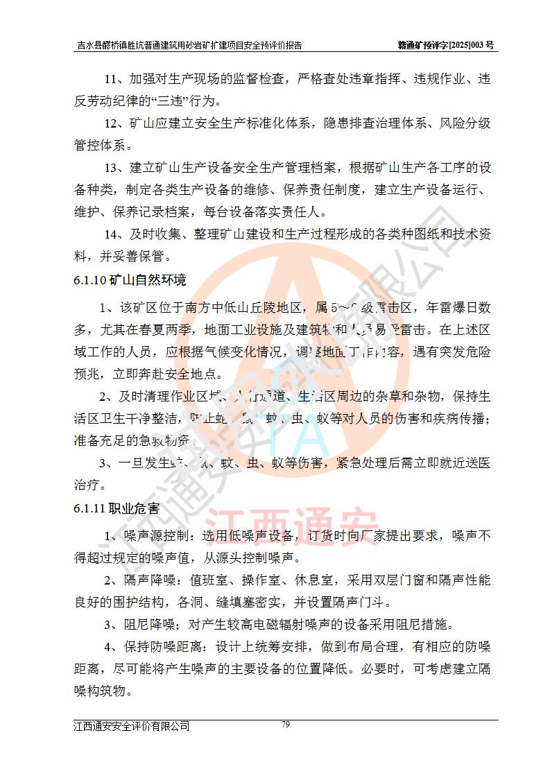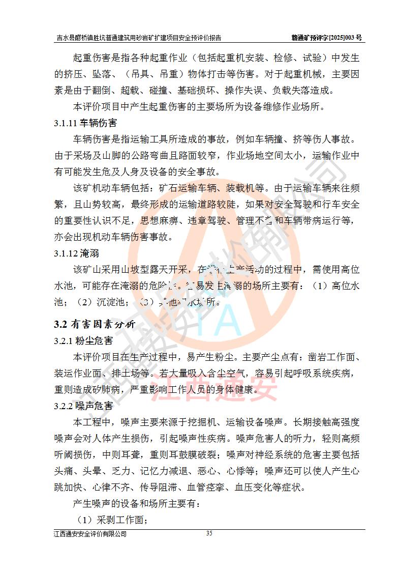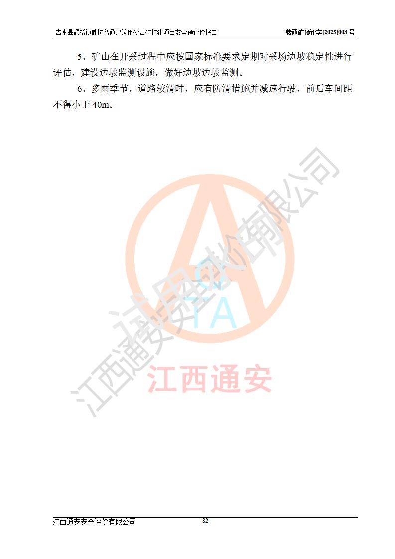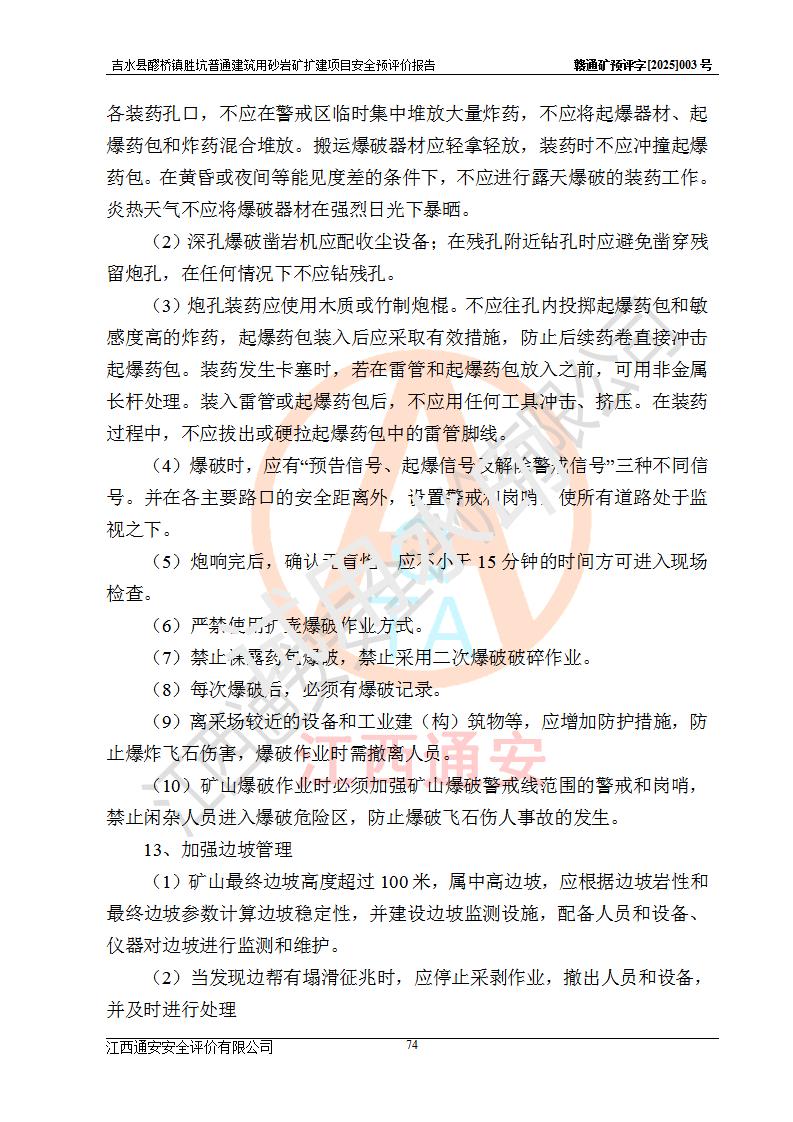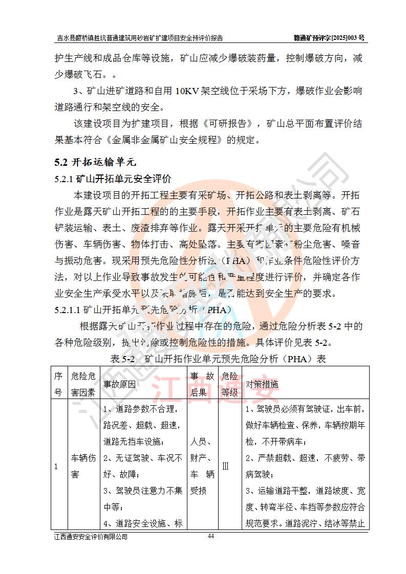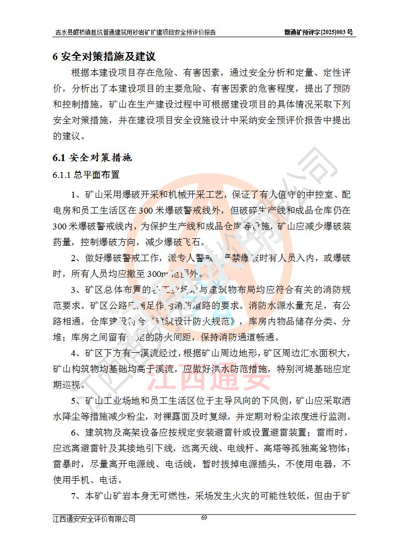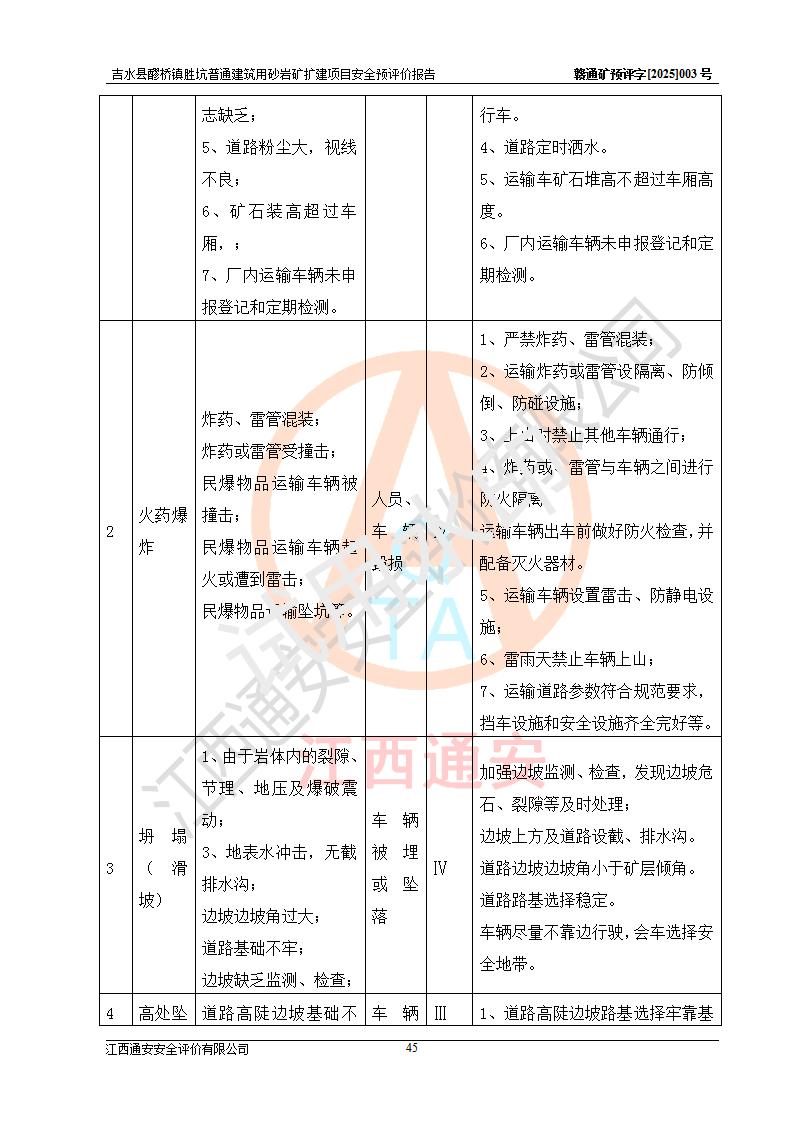 其它 | 吉水縣醪橋鎮(zhèn)勝坑普通建筑用砂巖礦露天開采擴建項目存在的主要危險因素有:滑坡和坍塌、火藥爆炸、放炮、**傷害、高處墜落、物體打擊、觸電、機械傷害、火災(zāi)、水災(zāi)、淹溺。該擴建建設(shè)項目中存在的有害因素有:粉塵、不良作業(yè)環(huán)境,如高溫、雷擊對礦山人員的傷害和其他不利的環(huán)境因素等。上述主要危險、有害因素在采取本報告第六章中提出的安全對策措施后,能得到**控制。該露天開采擴建建設(shè)項目從安全生產(chǎn)角度符合**有關(guān)安全生產(chǎn)法律、法規(guī)、規(guī)章和技術(shù)標(biāo)準(zhǔn)的要求。 | ||||