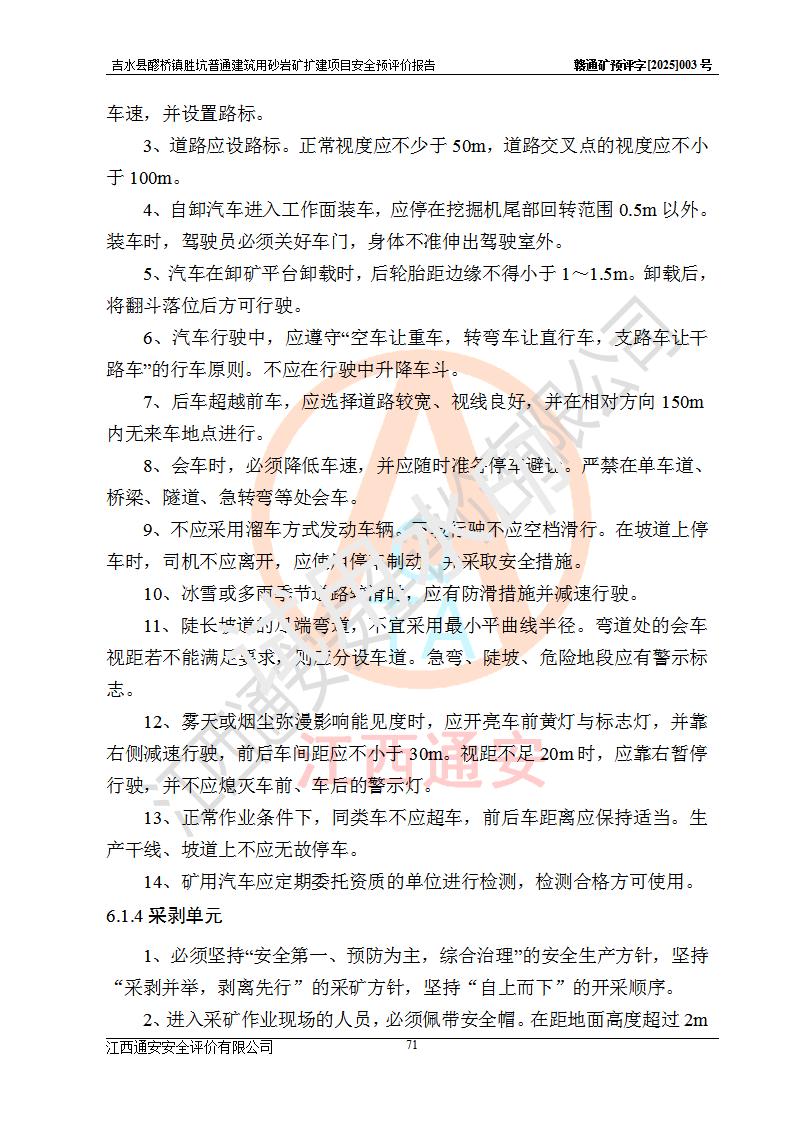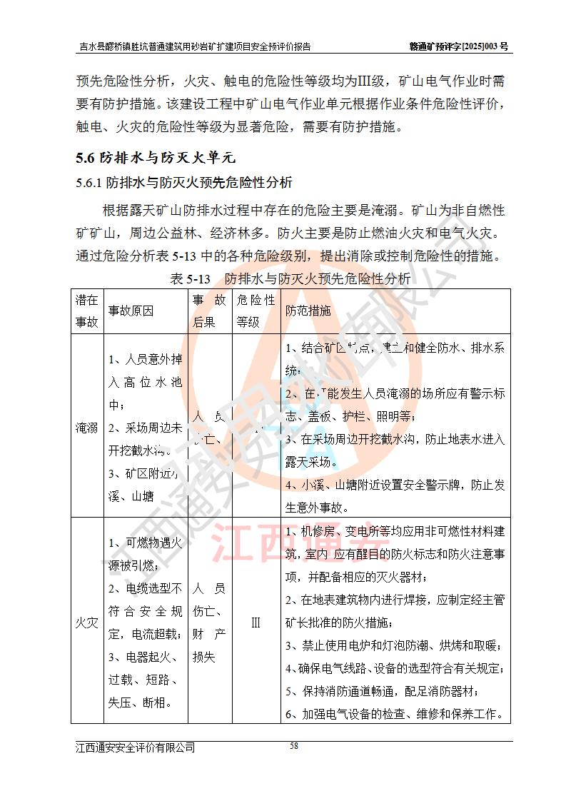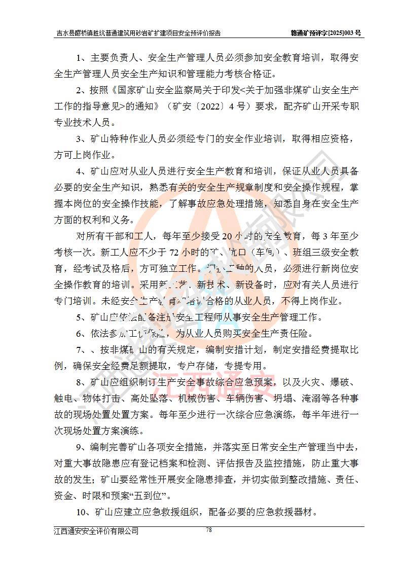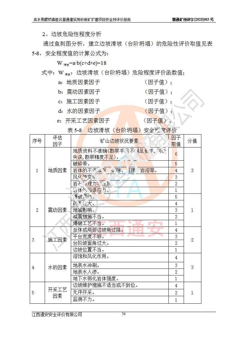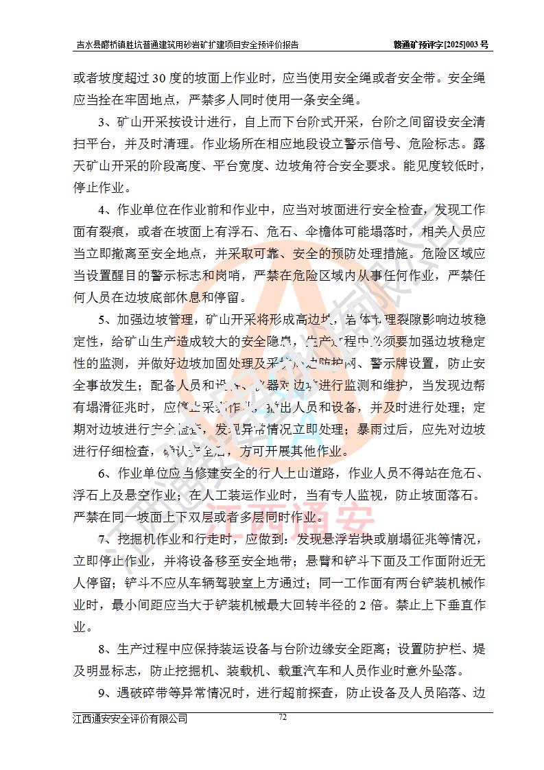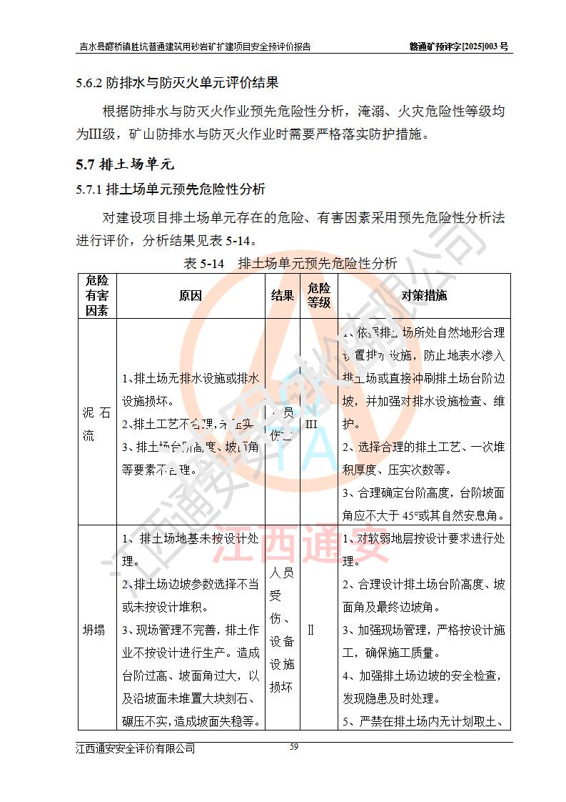其它 | 吉水縣醪橋鎮(zhèn)勝坑普通建筑用砂巖礦露天開采擴建項目存在的主要危險因素有:滑坡和坍塌、火藥爆炸、放炮、**傷害、高處墜落、物體打擊、觸電、機械傷害、火災(zāi)、水災(zāi)、淹溺。該擴建建設(shè)項目中存在的有害因素有:粉塵、不良作業(yè)環(huán)境,如高溫、雷擊對礦山人員的傷害和其他不利的環(huán)境因素等。上述主要危險、有害因素在采取本報告第六章中提出的安全對策措施后,能得到**控制。該露天開采擴建建設(shè)項目從安全生產(chǎn)角度符合**有關(guān)安全生產(chǎn)法律、法規(guī)、規(guī)章和技術(shù)標(biāo)準(zhǔn)的要求。 | ||||